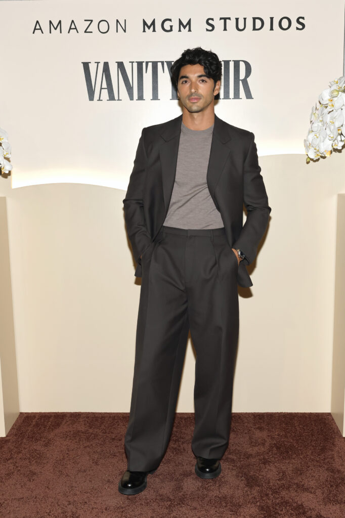 Taylor Zakhar Perez wore a ZEGNA FW23 dark grey pure wool, one and a half breasted jacket with pleated trousers, to theVanity Fair and Amazon MGM Studios awards season celebration at Bar Marmont yesterday evening on January 6, 2024.
