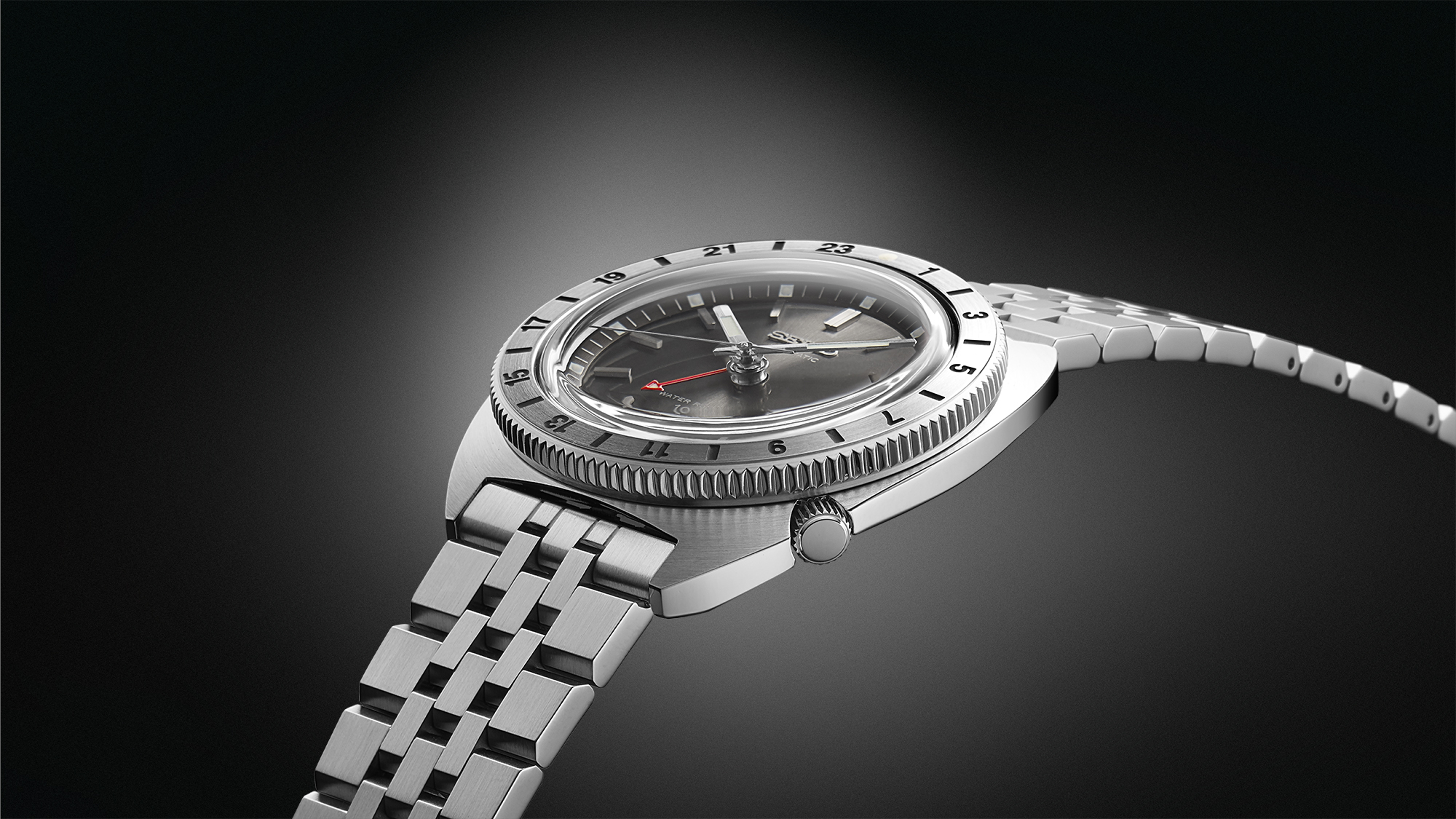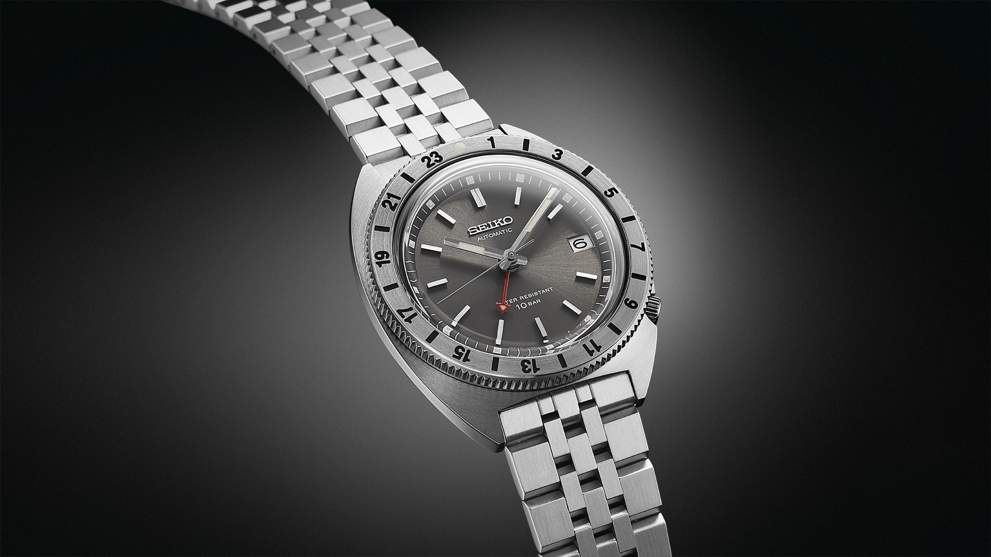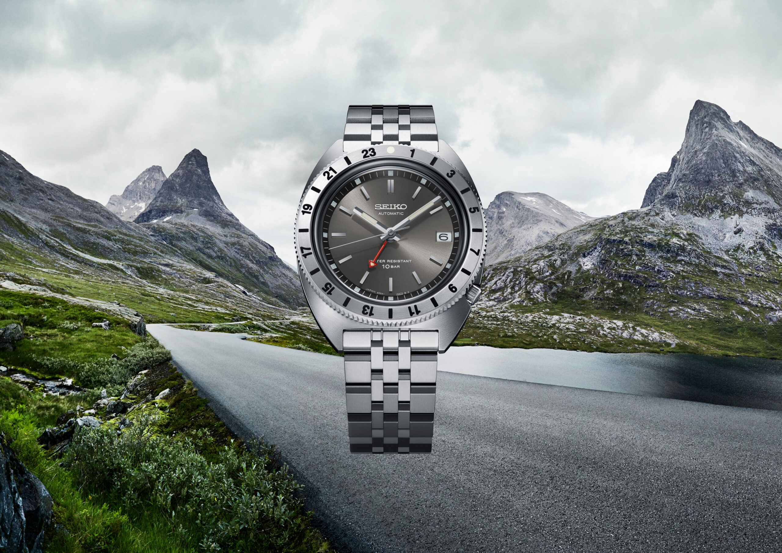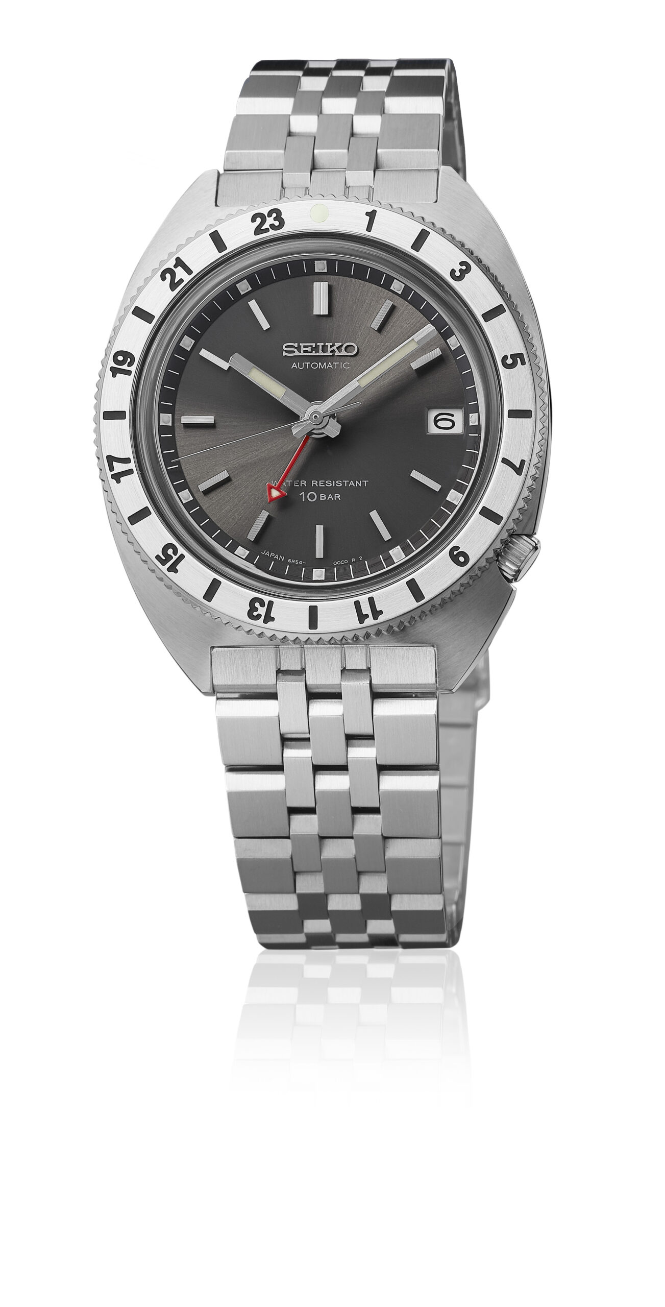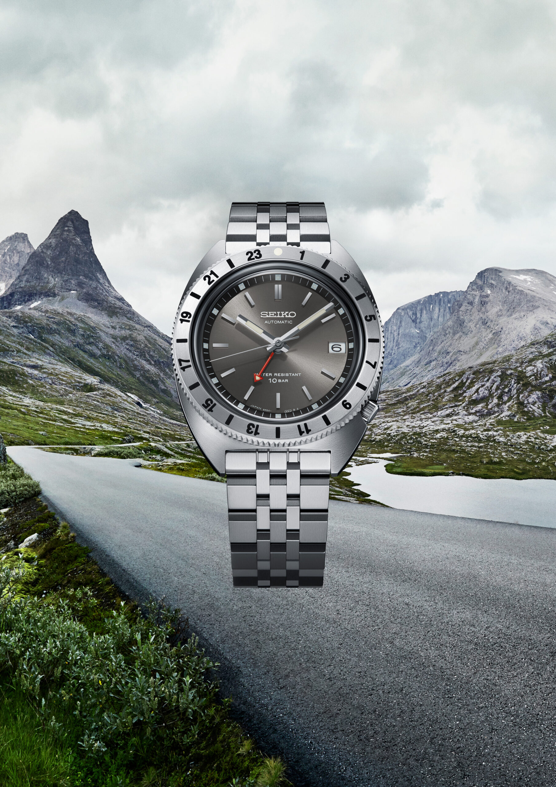 La sphère de la montre s’illumine de l’héritage de Seiko. Chaque élément du cadran, des aiguilles GMT, des heures, des minutes, jusqu’aux index, est une réplique exacte de la montre de 1968. Le logo Seiko lui-même est un hommage visuel, reprenant le graphisme d’origine. La fonctionnalité n’est pas en reste : avec son aiguille GMT rouge, ajustable de manière indépendante et sa lunette tournante gravée d’une échelle de 24 heures, cette montre ne se contente pas de suivre le temps, elle le défie, affichant simultanément les heures de trois fuseaux différents.