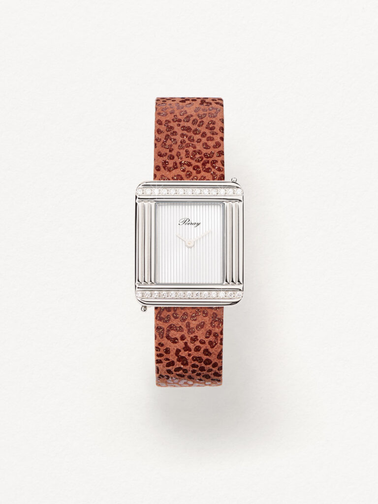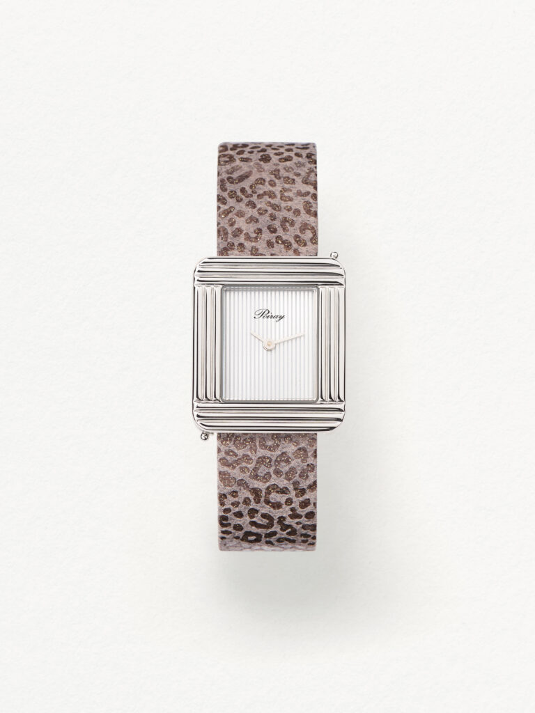 Le motif léopard, intemporel et traversant les époques sans jamais perdre de son attrait, est réinterprété par Poiray sur un cuir de chèvre d’une flexibilité et d’une brillance remarquables. Les trois nuances automnales proposées – olive, bordeaux et gris – apportent une touche de sophistication discrète et un esprit de saisonnalité à ces pièces d’horlogerie déjà iconiques.