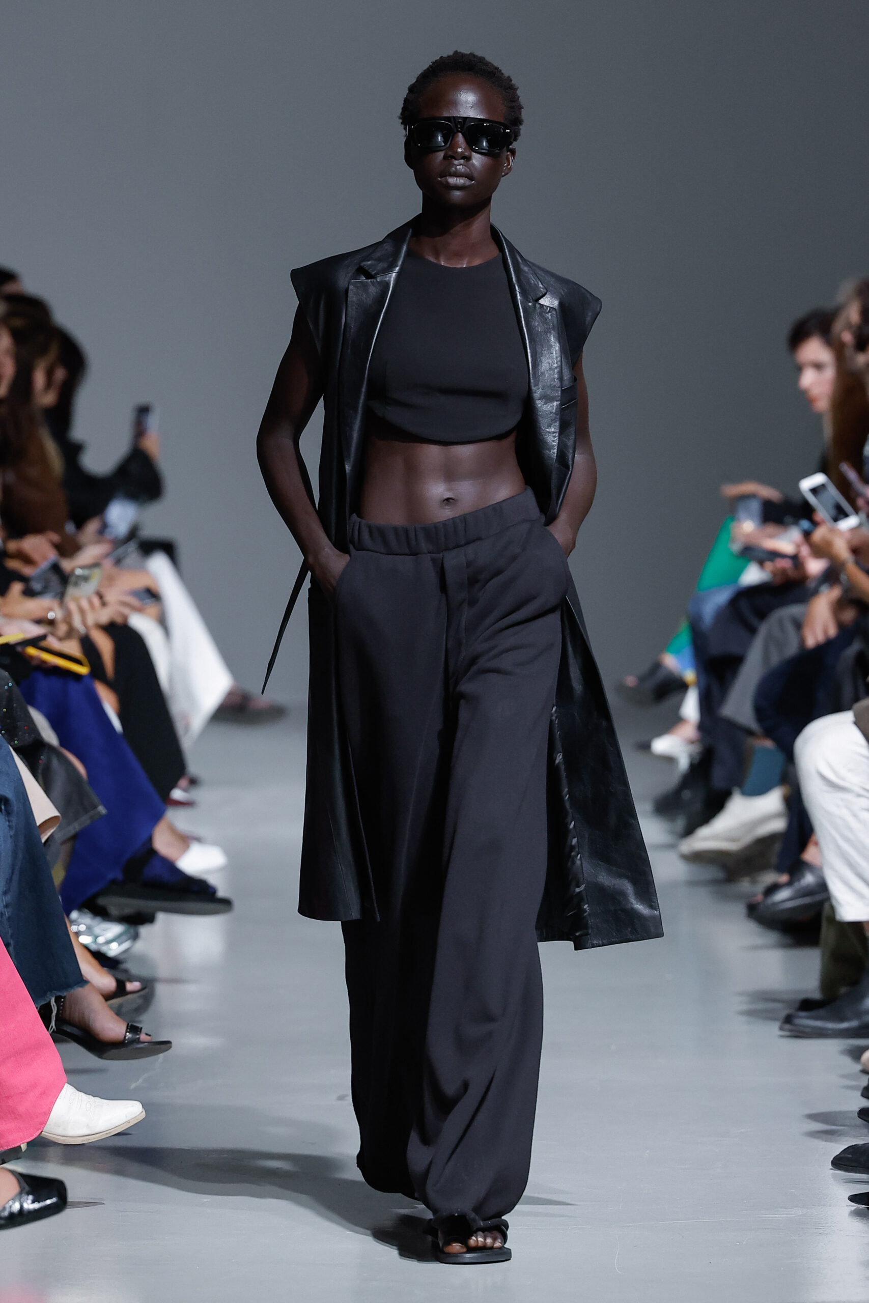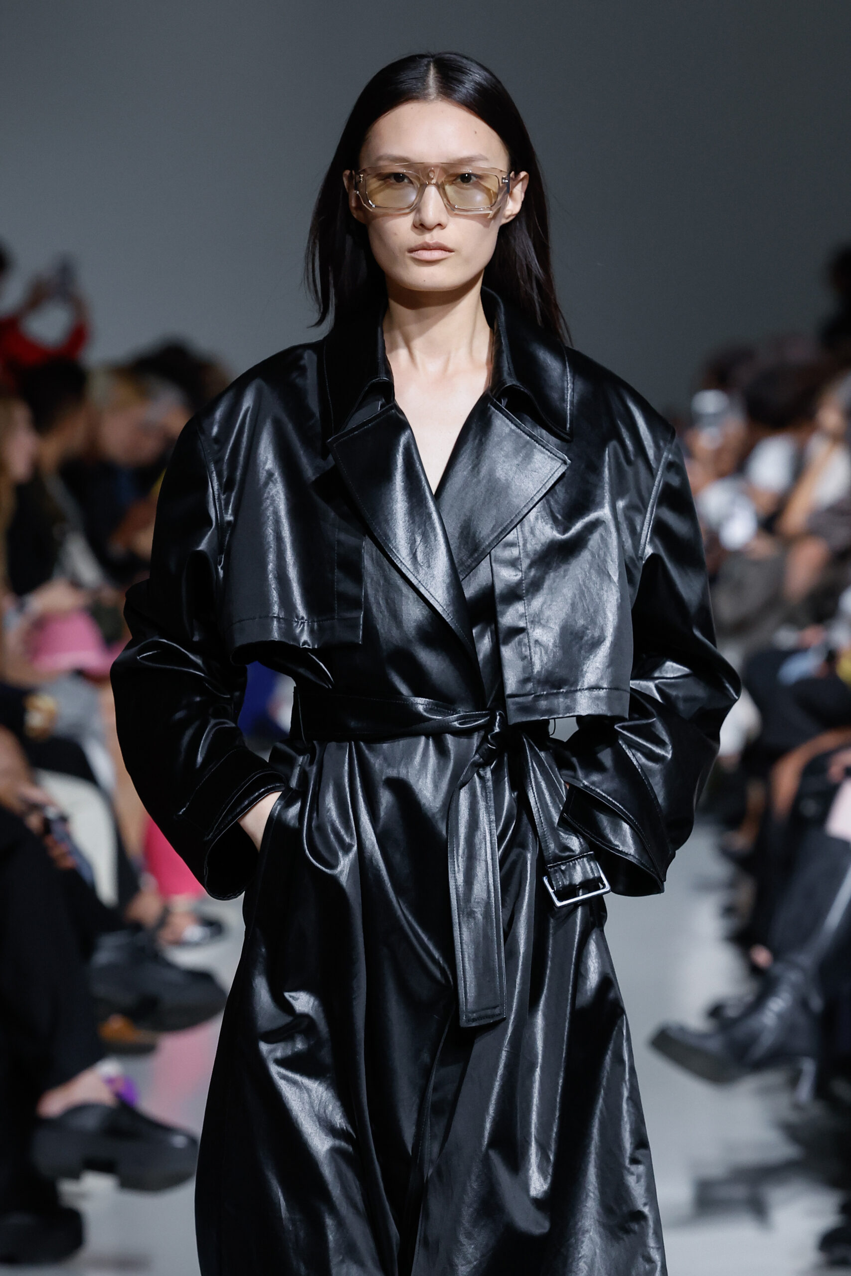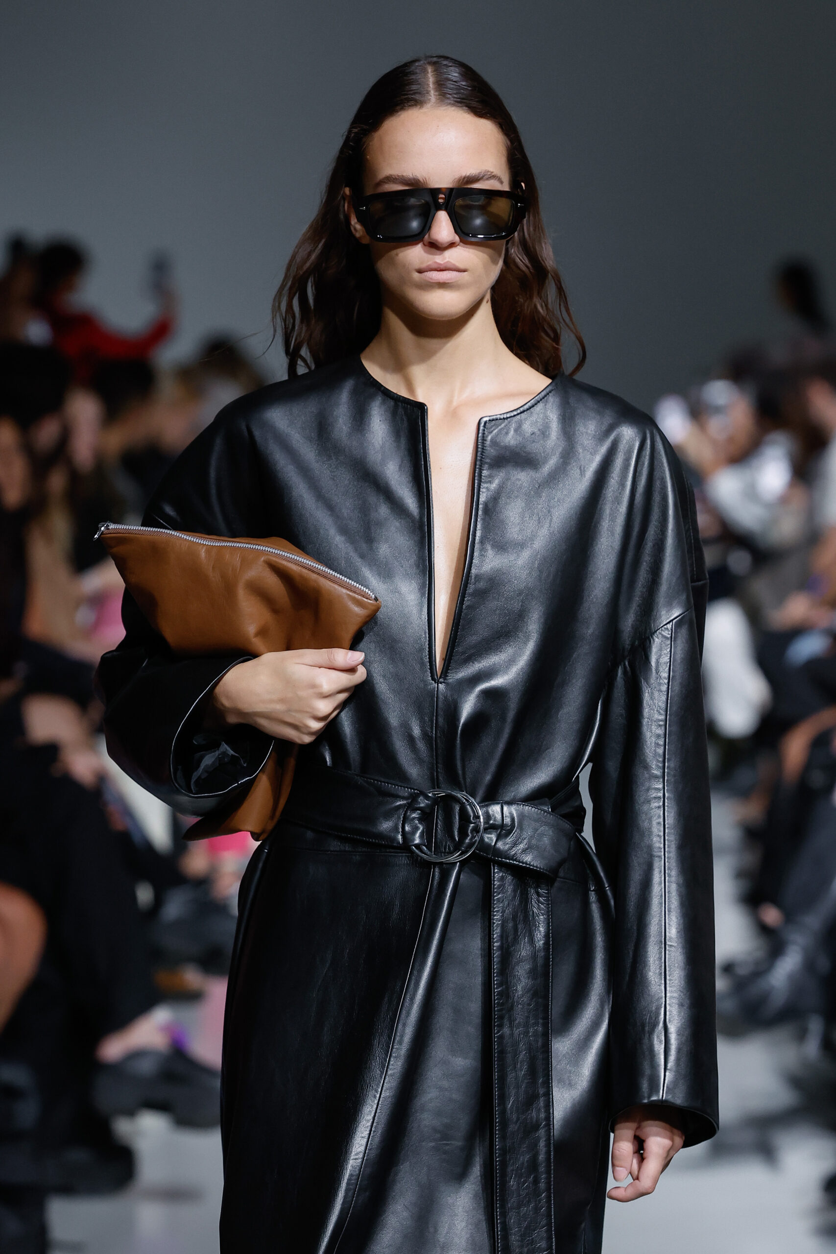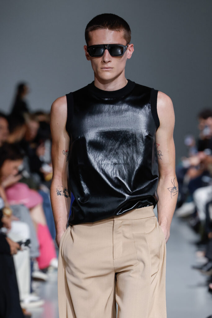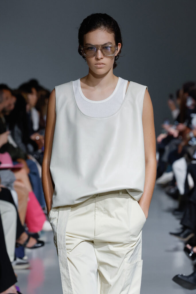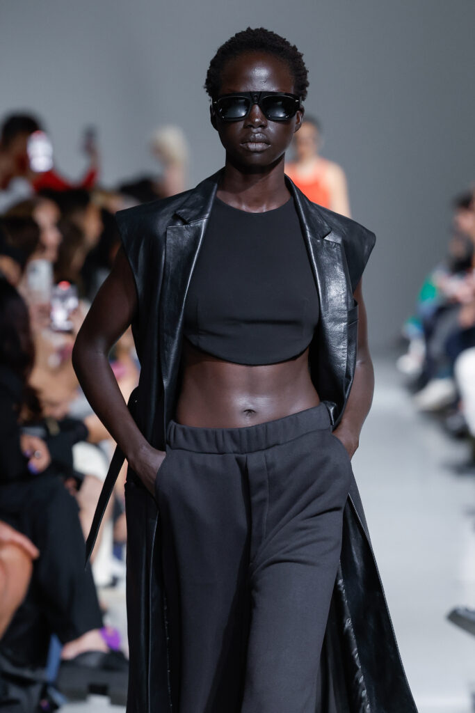 - Jeux de Matières : Un contraste entre la mousseline de soie transparente et le cuir opaque crée une dynamique intéressante au sein des silhouettes.