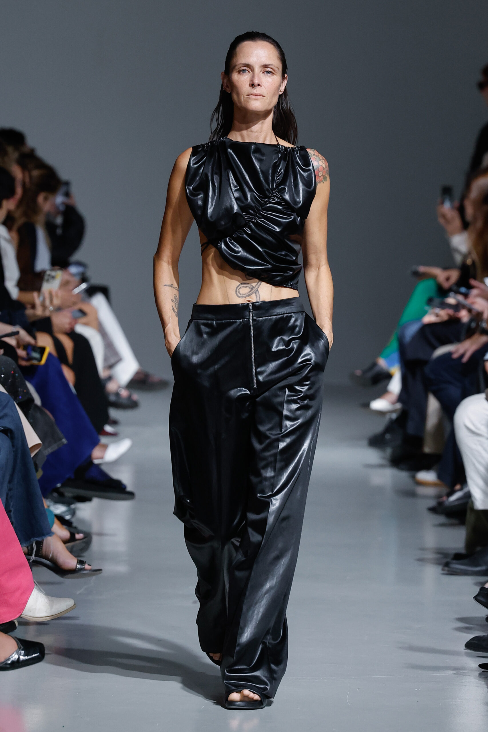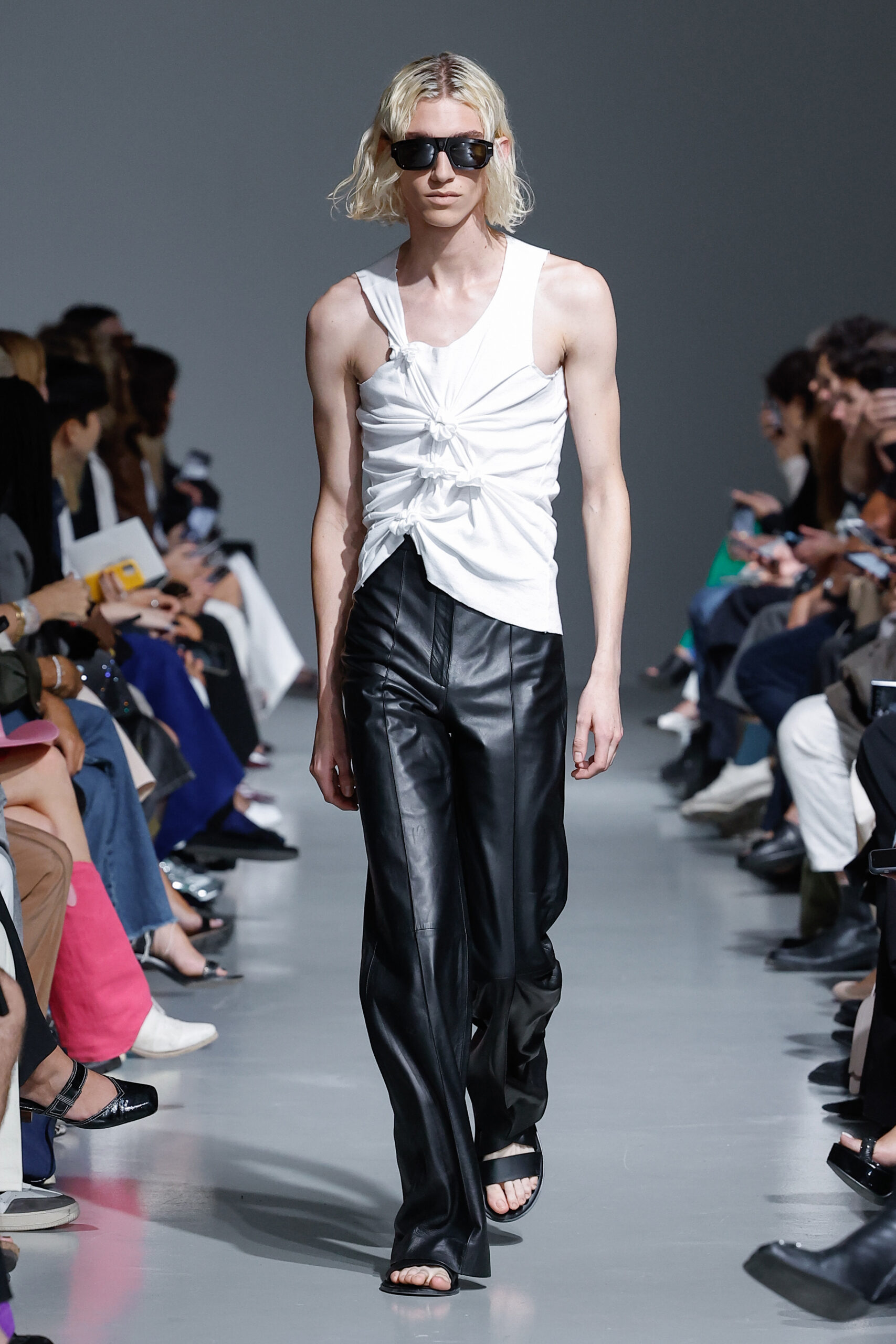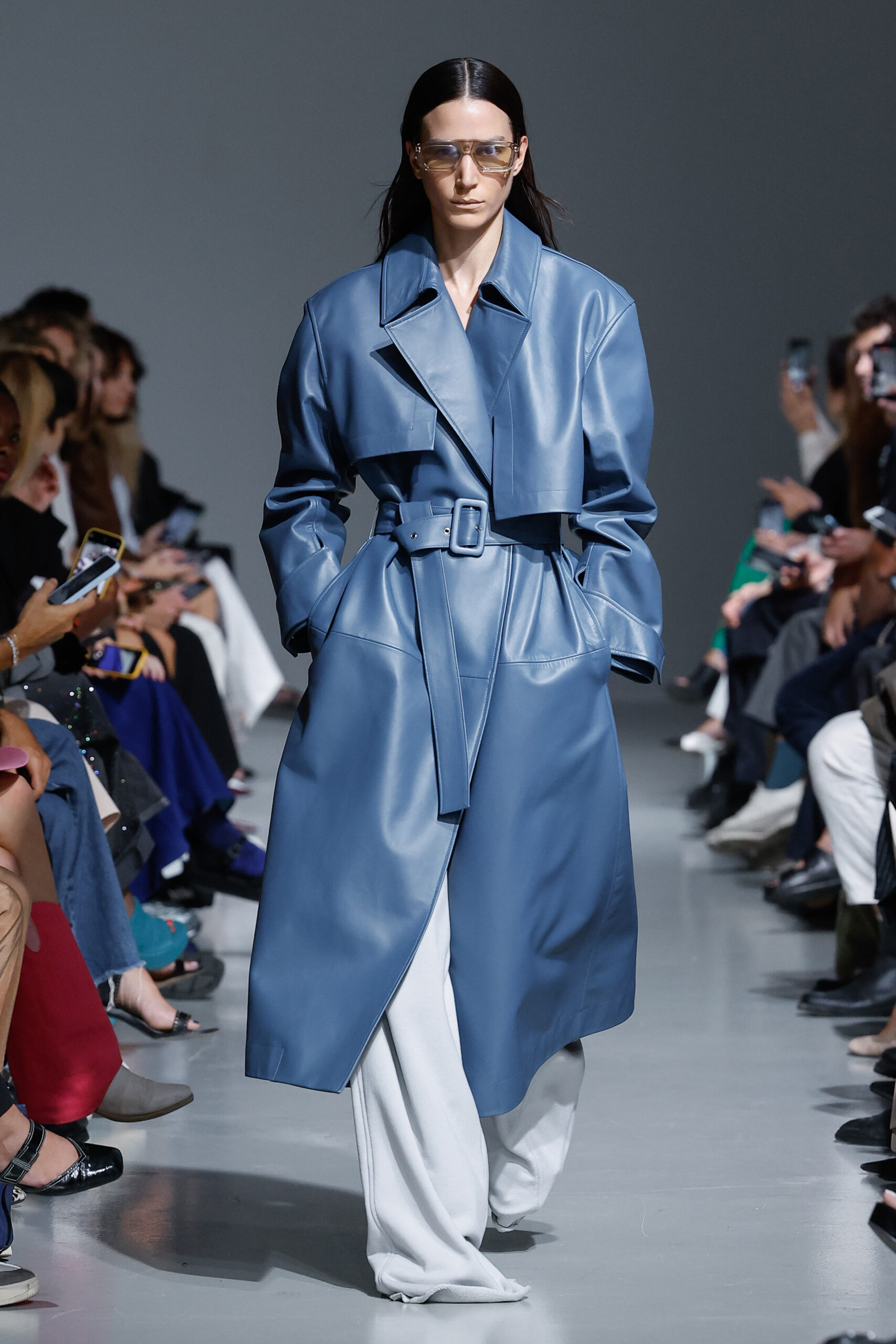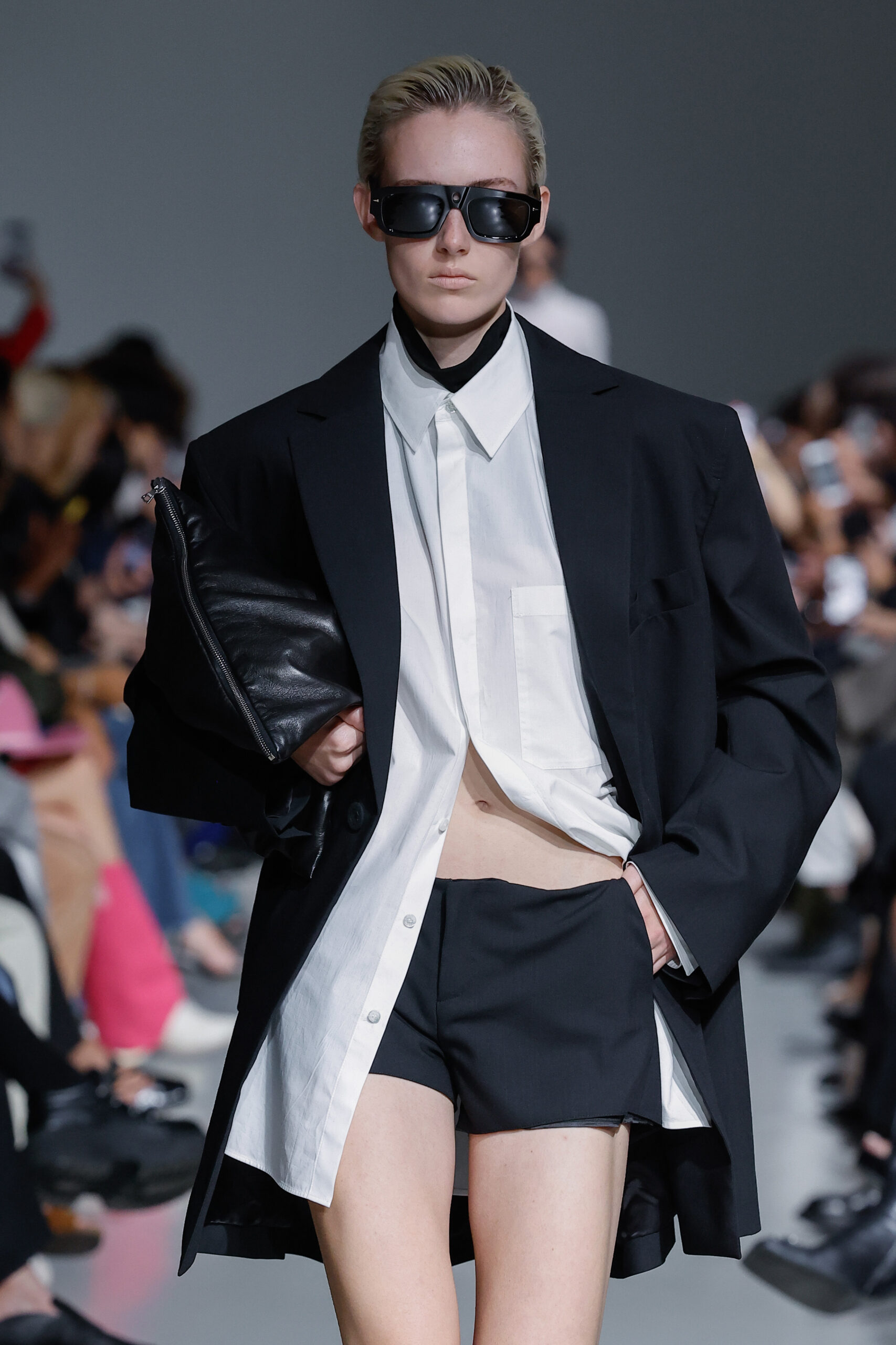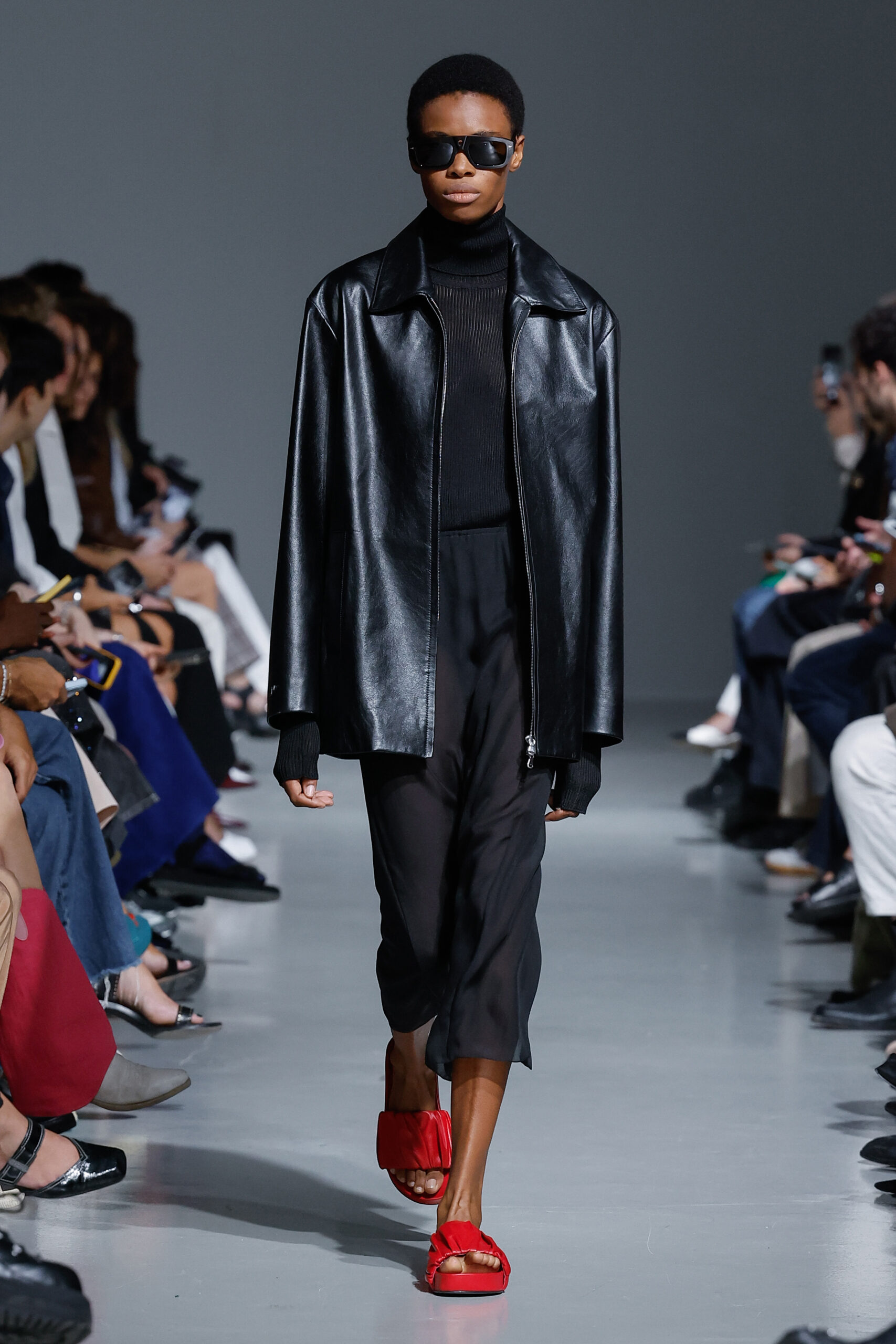 - Jeux de Matières : Un contraste entre la mousseline de soie transparente et le cuir opaque crée une dynamique intéressante au sein des silhouettes.