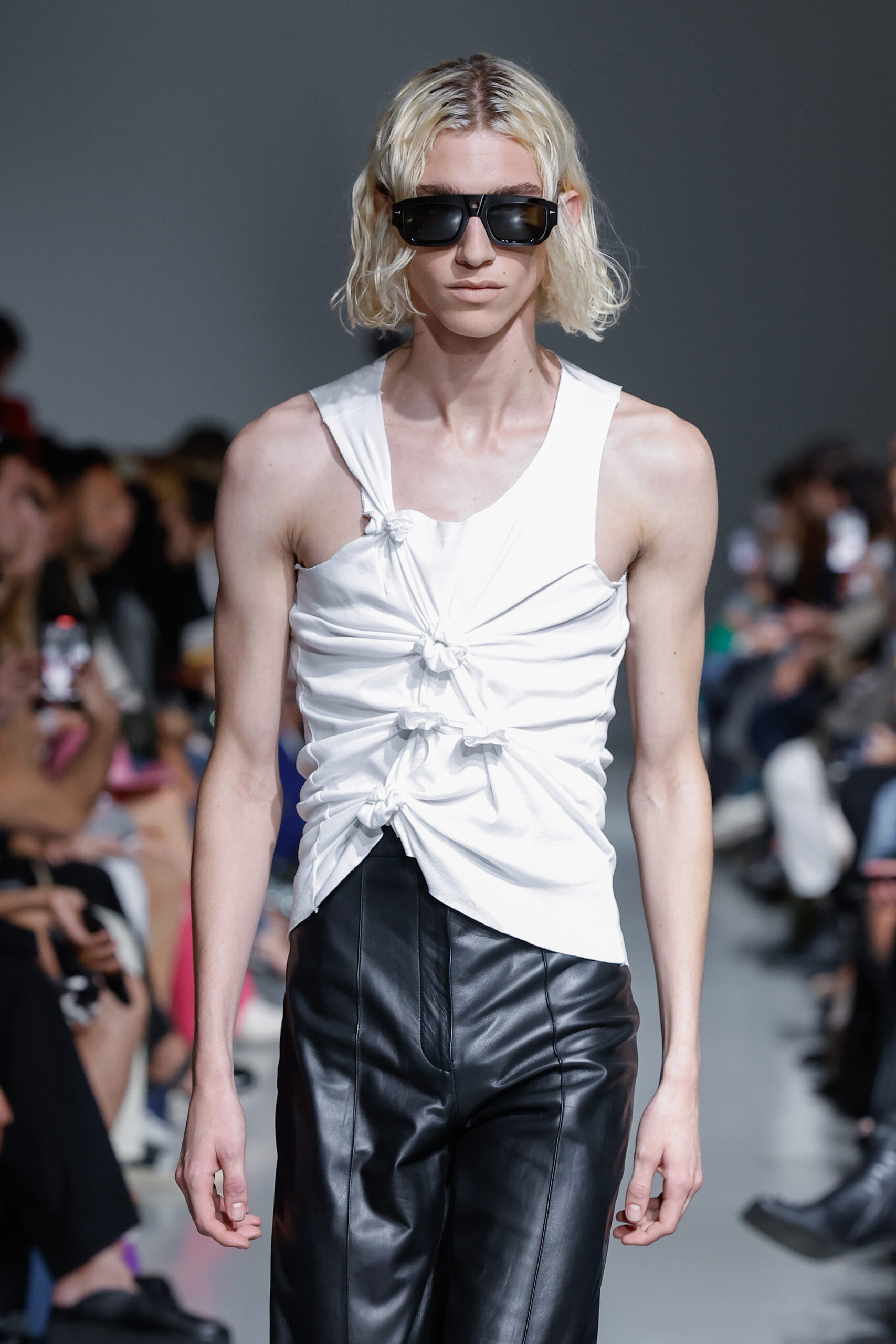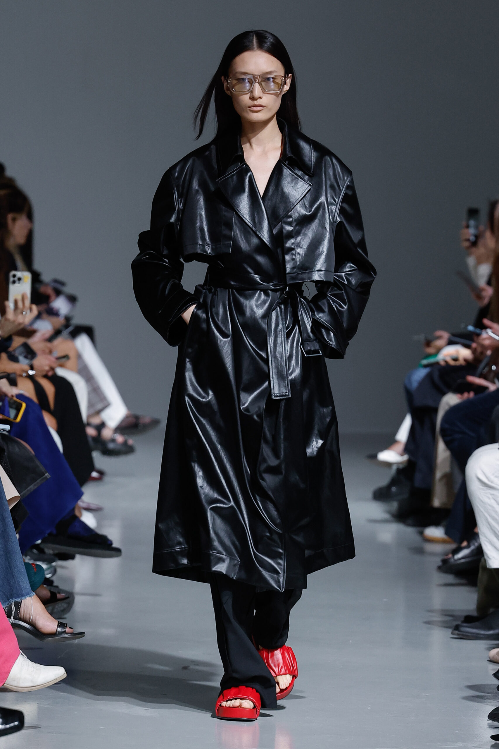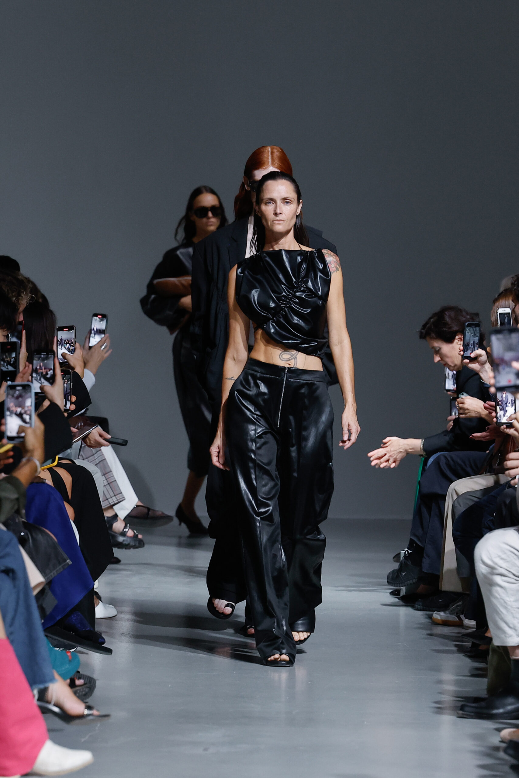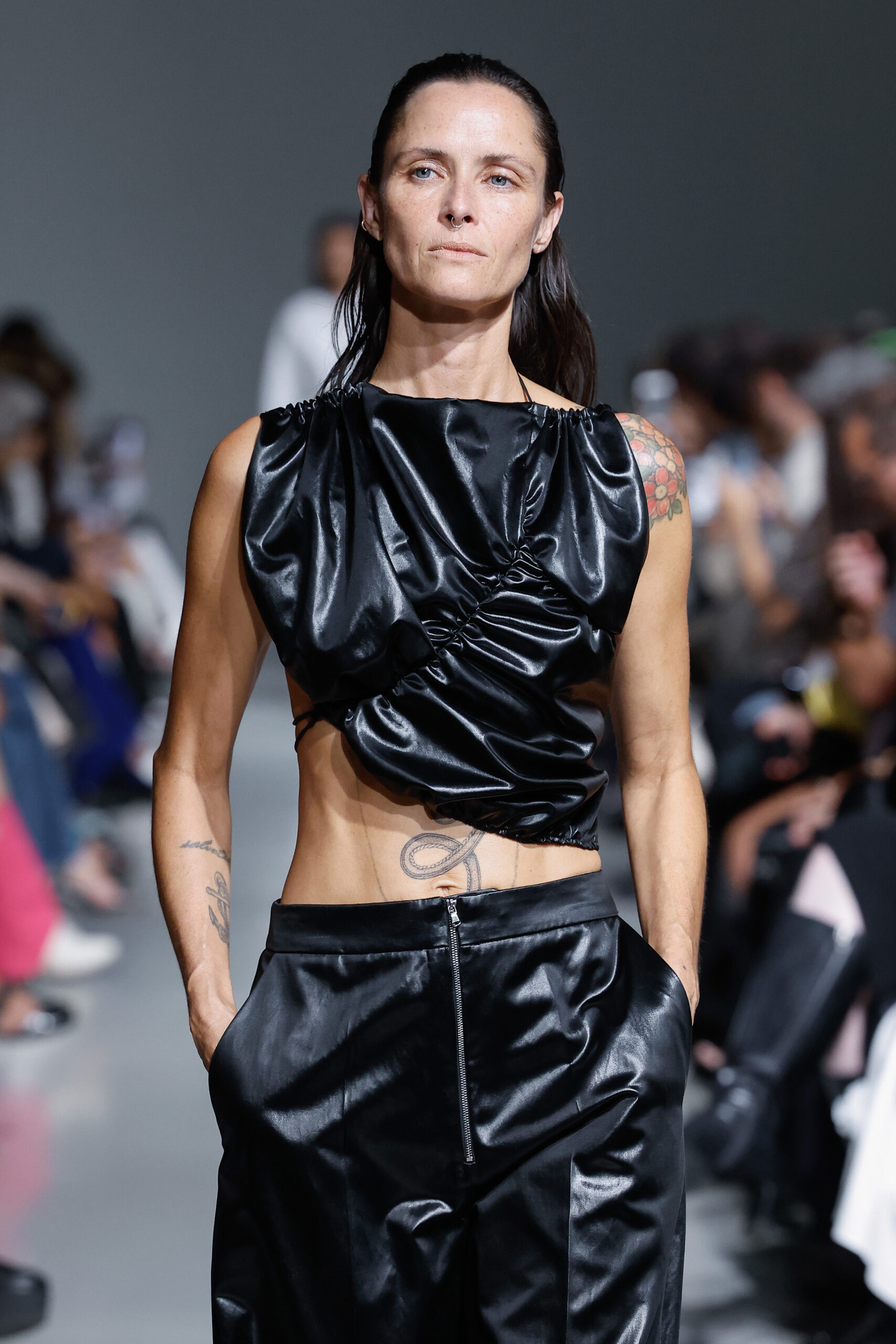 - Jeux de Matières : Un contraste entre la mousseline de soie transparente et le cuir opaque crée une dynamique intéressante au sein des silhouettes.