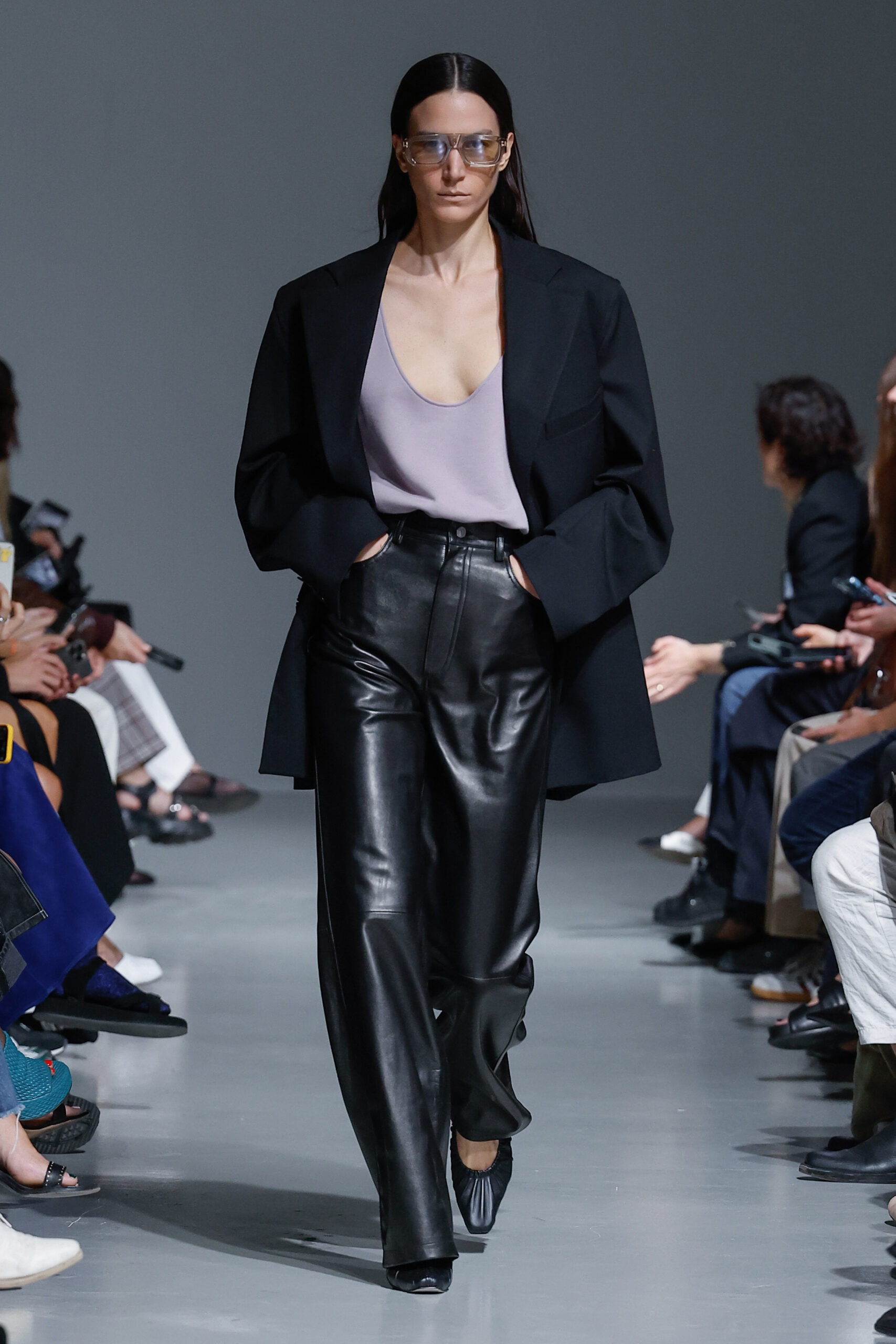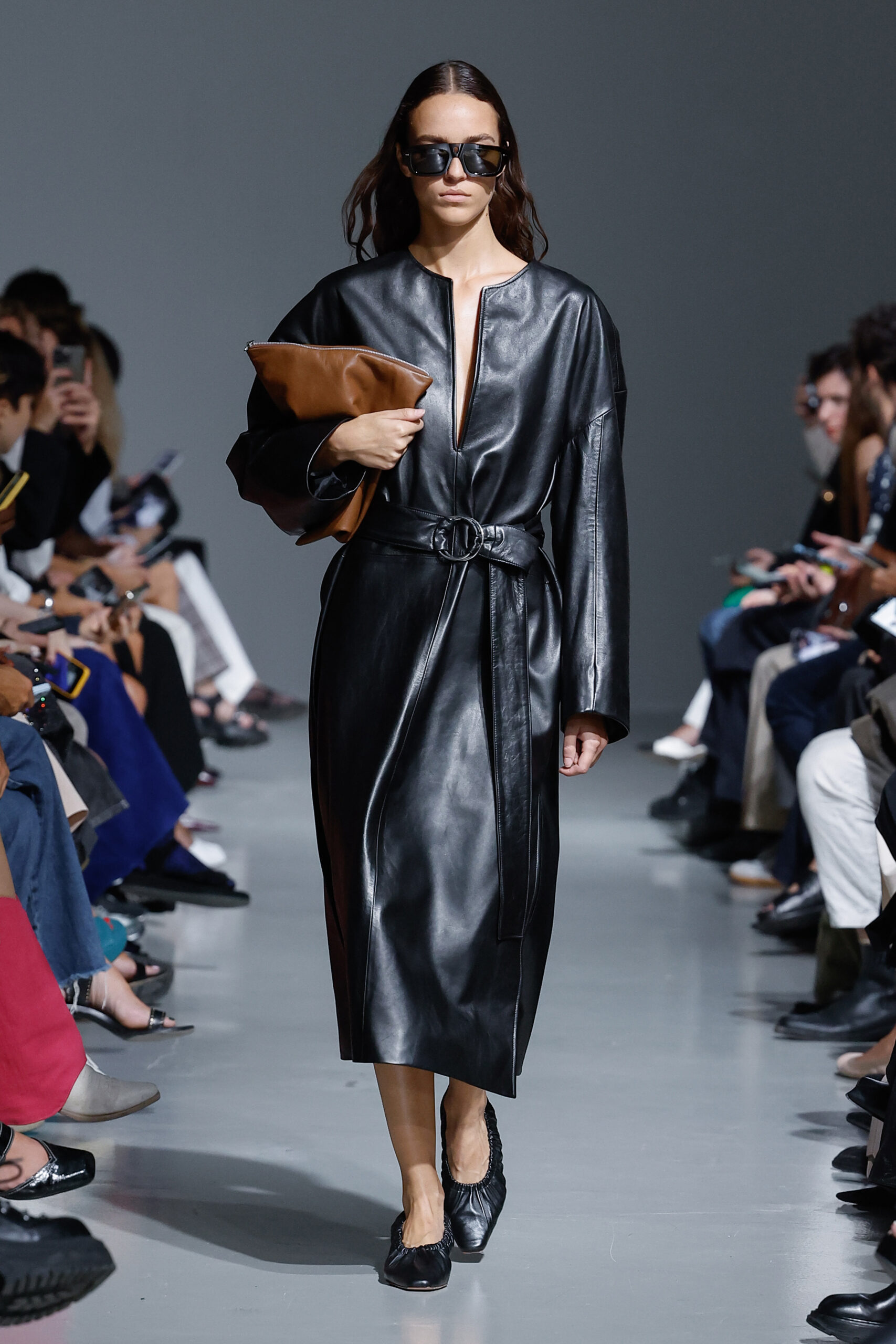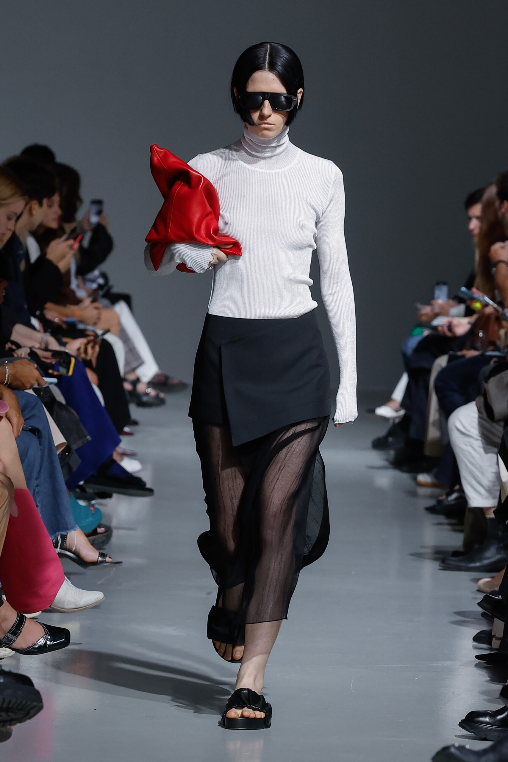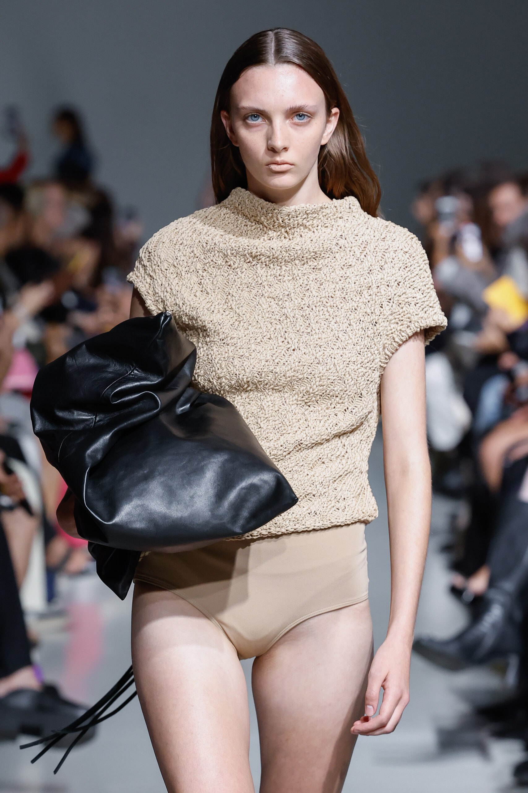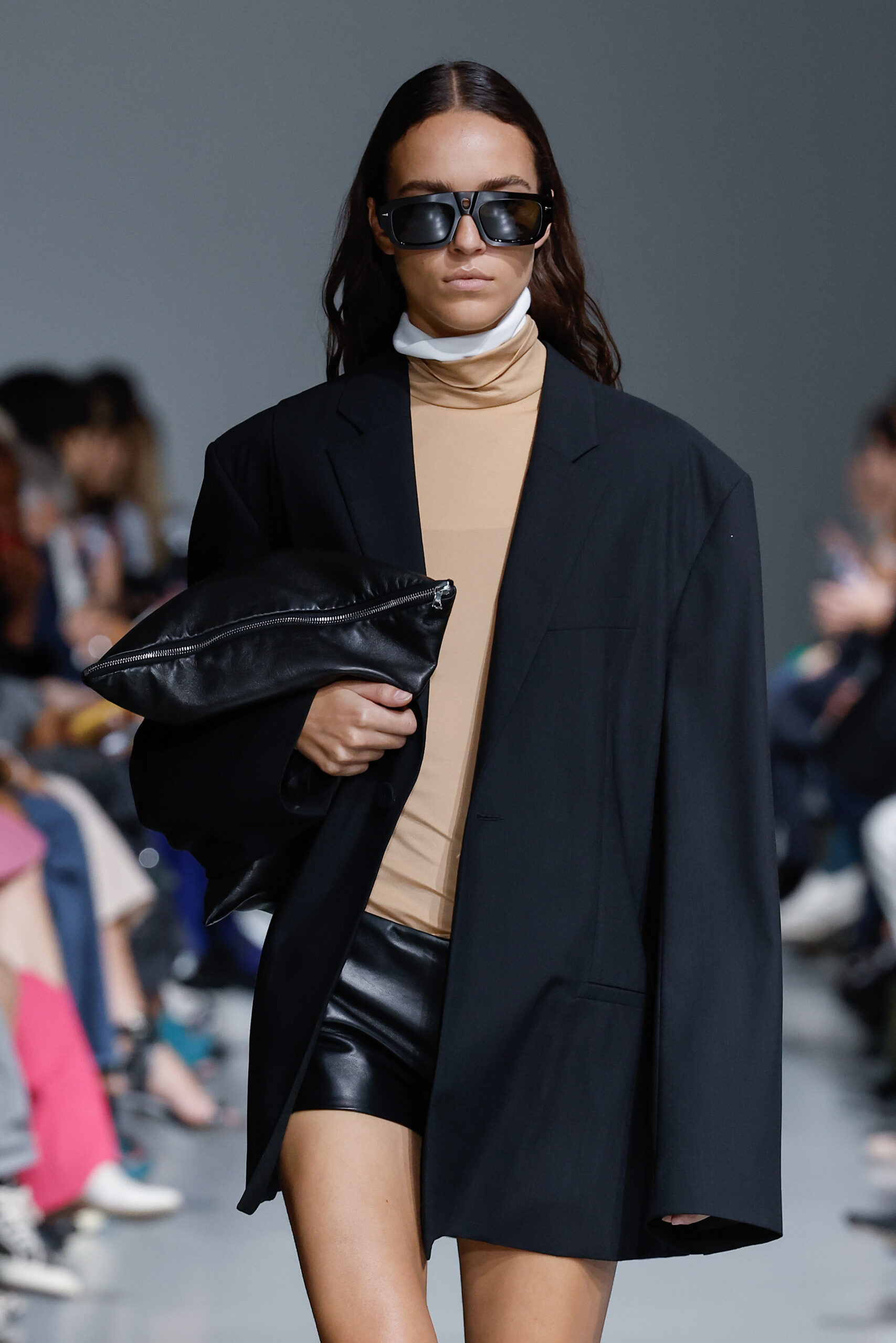 - Jeux de Matières : Un contraste entre la mousseline de soie transparente et le cuir opaque crée une dynamique intéressante au sein des silhouettes.