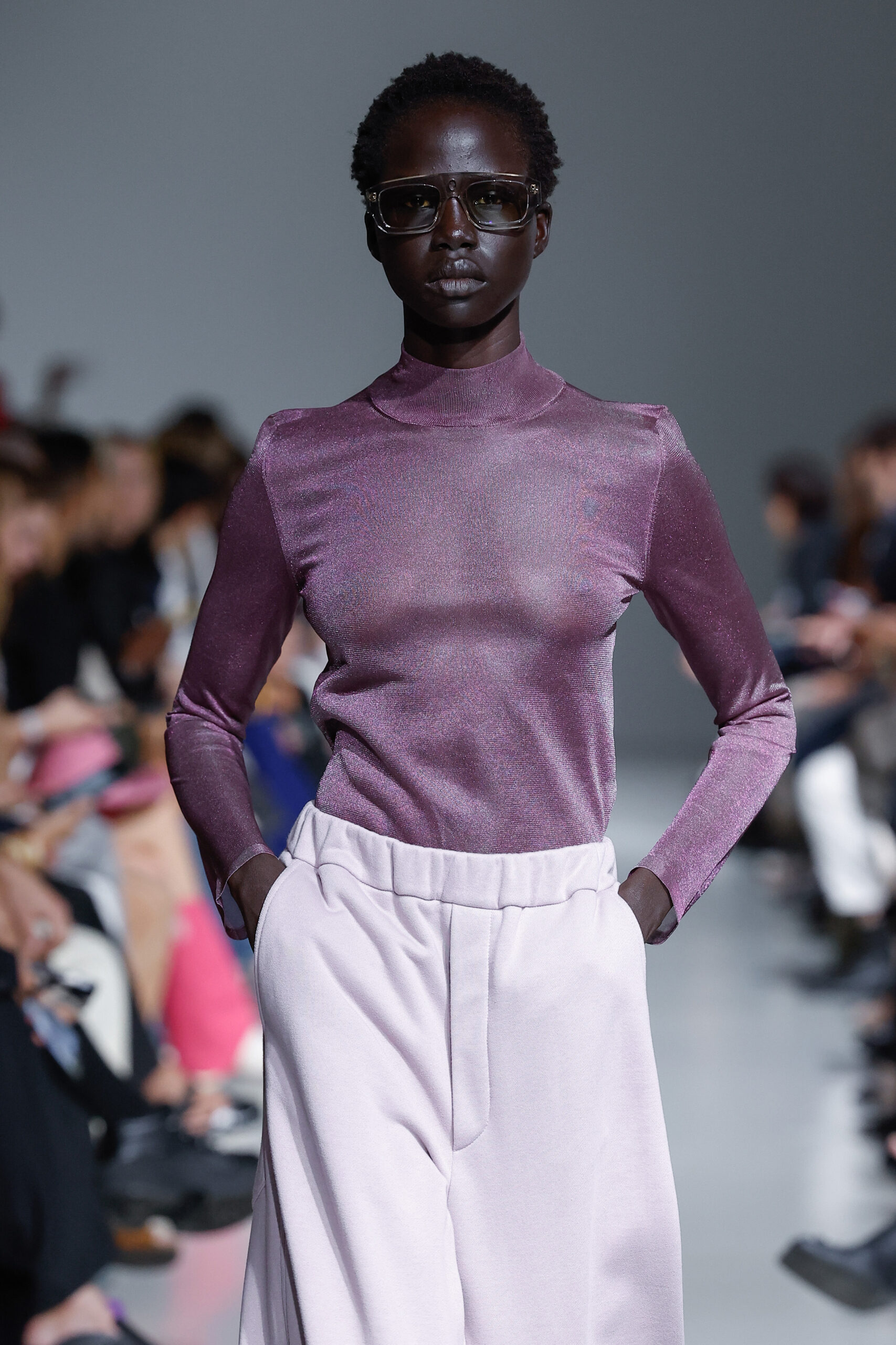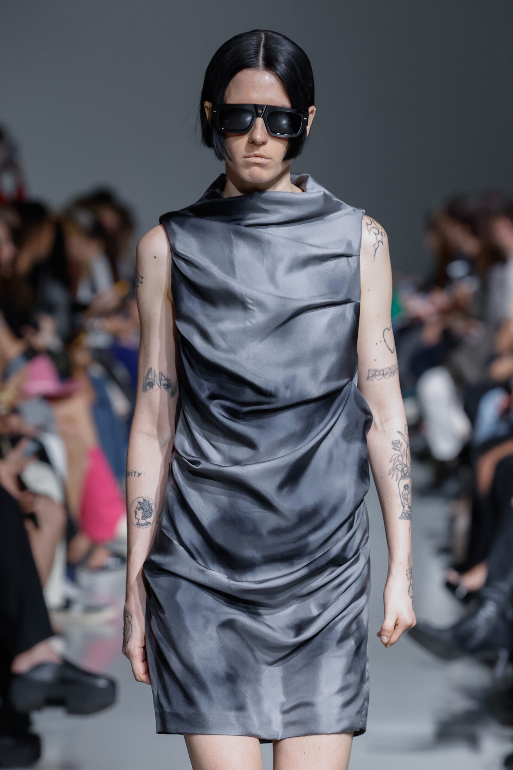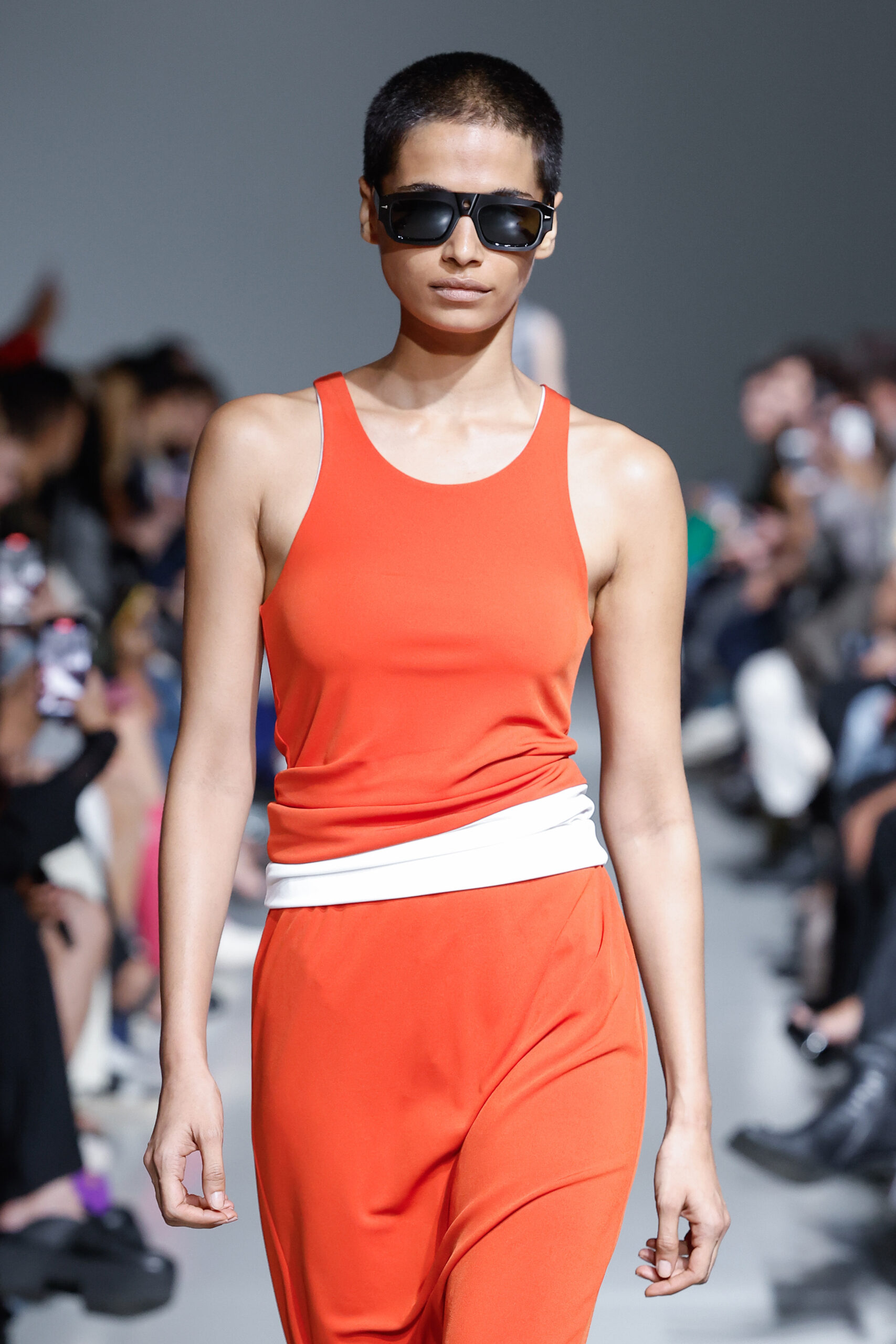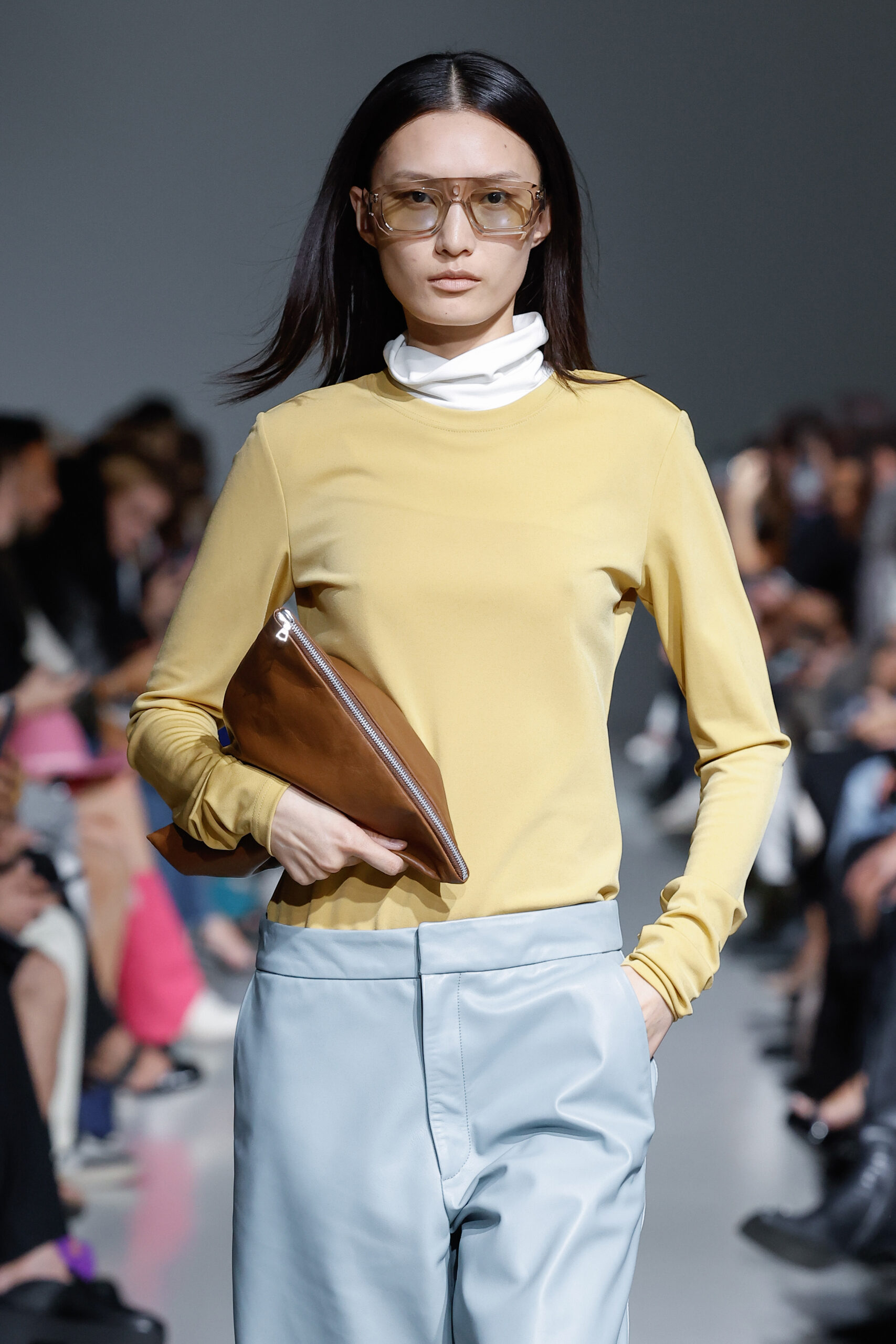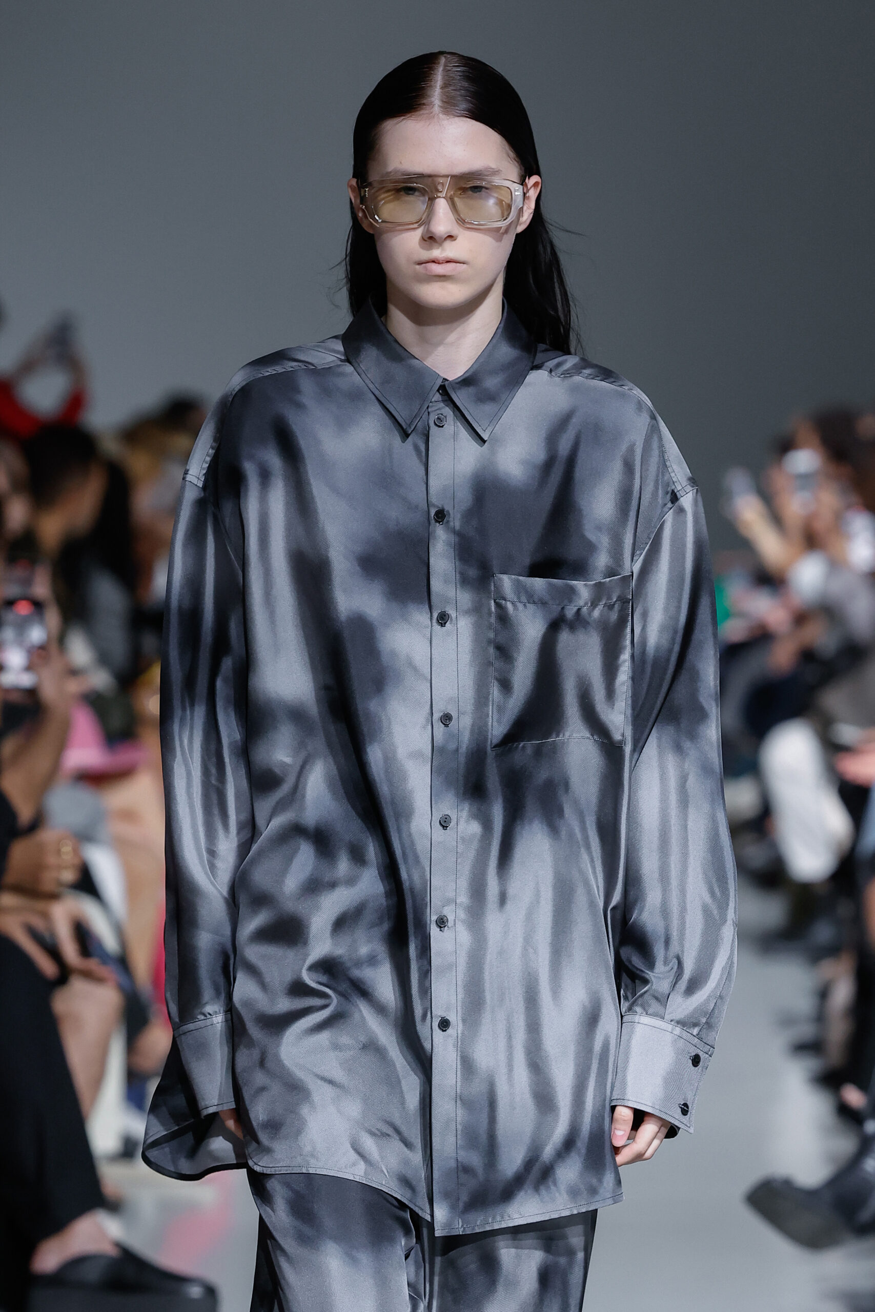 - Jeux de Matières : Un contraste entre la mousseline de soie transparente et le cuir opaque crée une dynamique intéressante au sein des silhouettes.