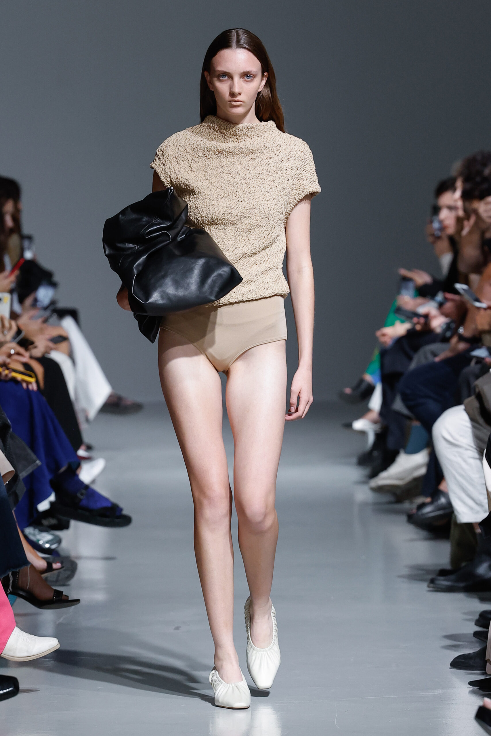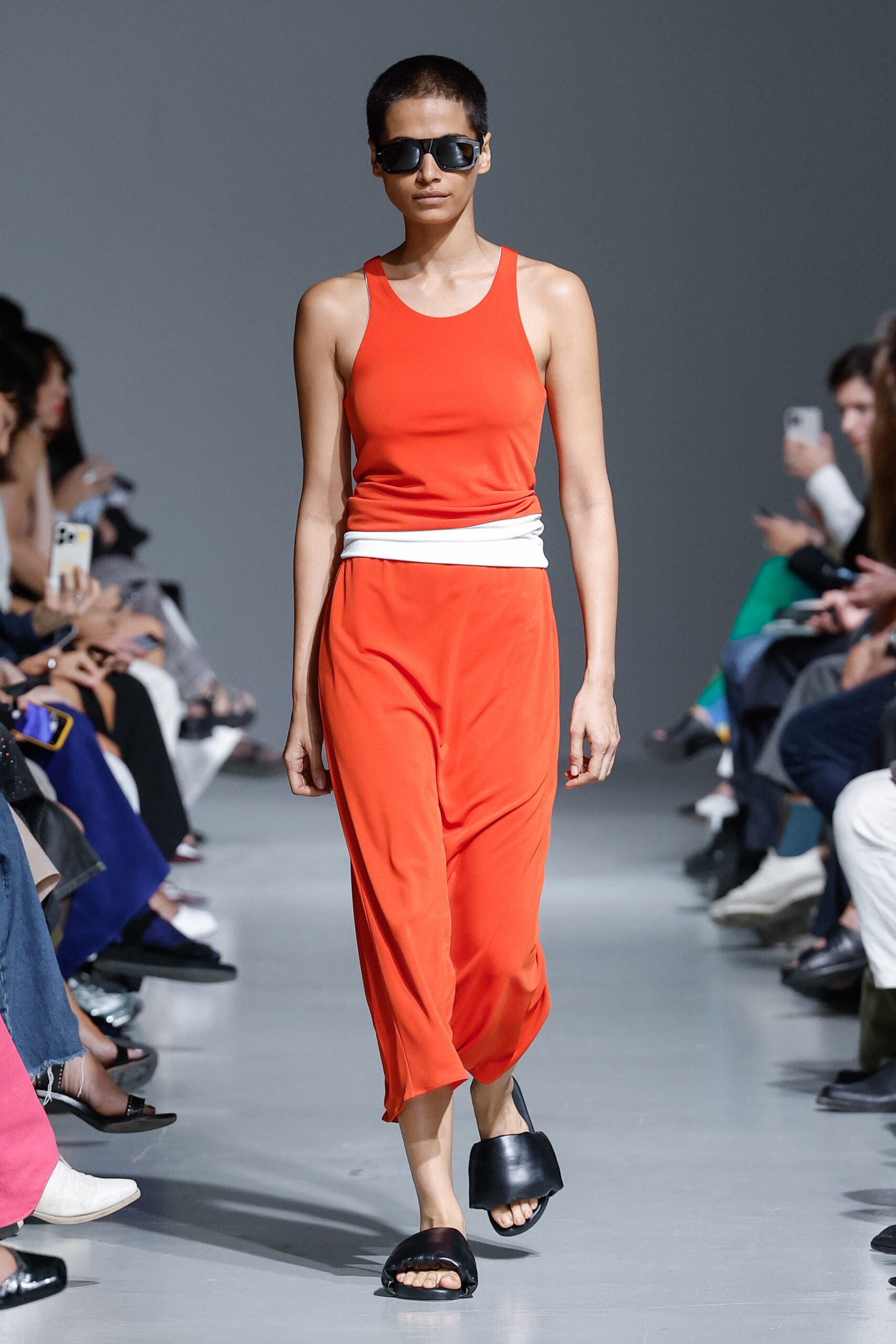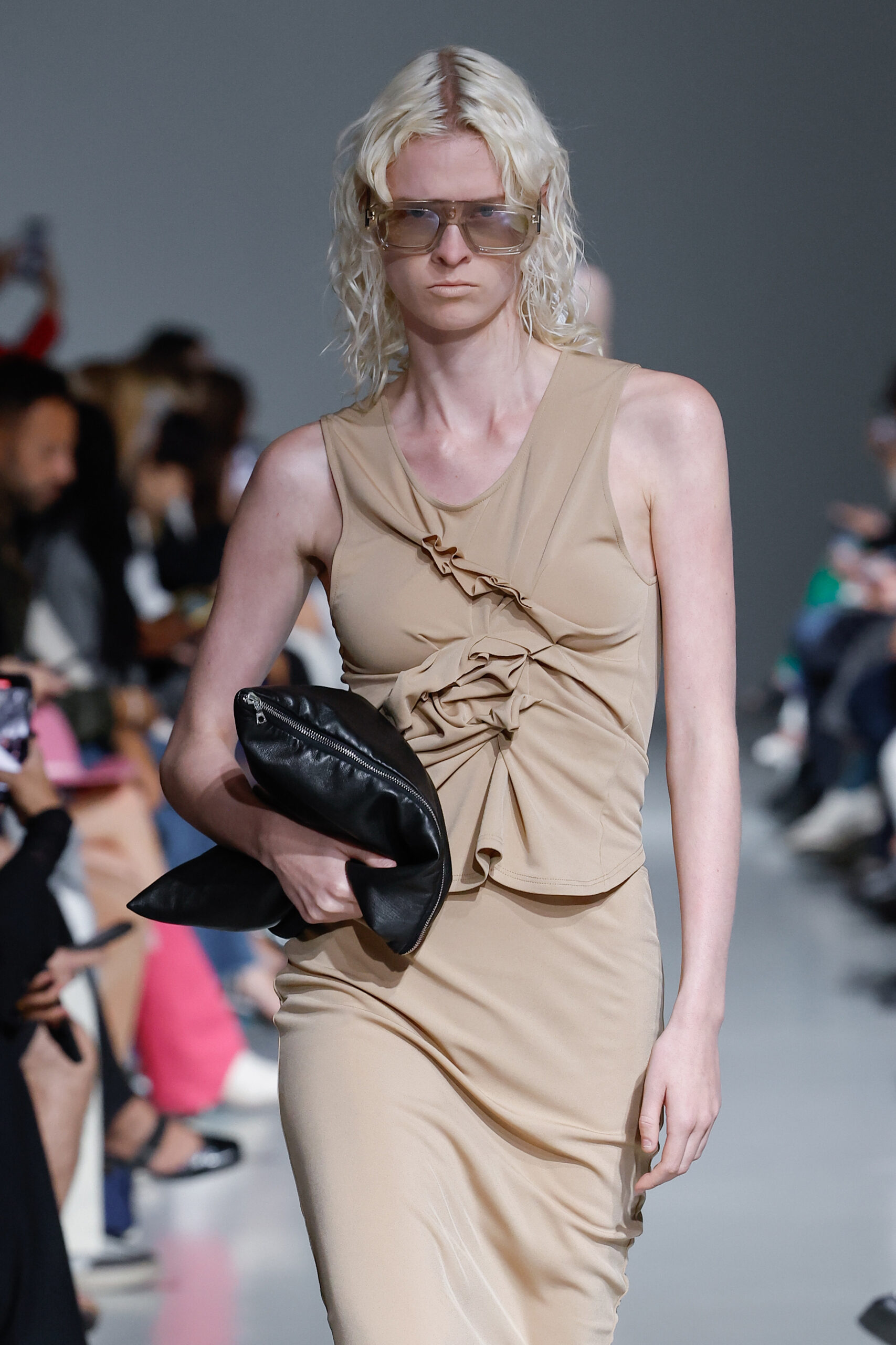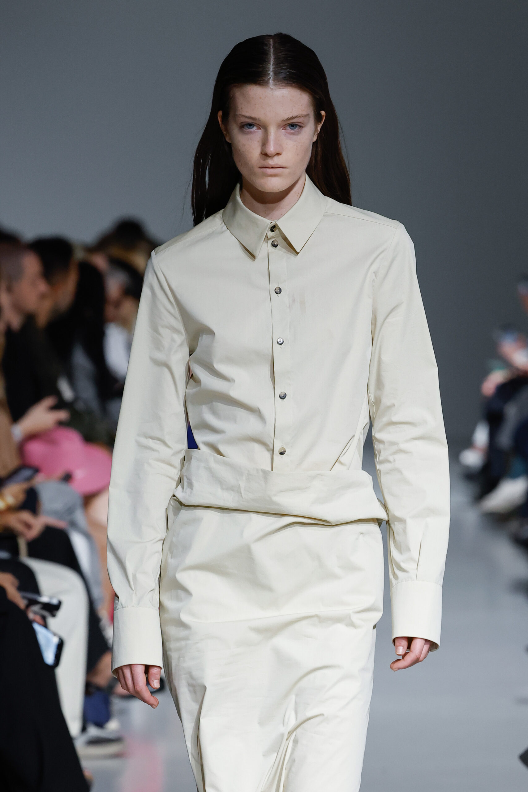 - Jeux de Matières : Un contraste entre la mousseline de soie transparente et le cuir opaque crée une dynamique intéressante au sein des silhouettes.