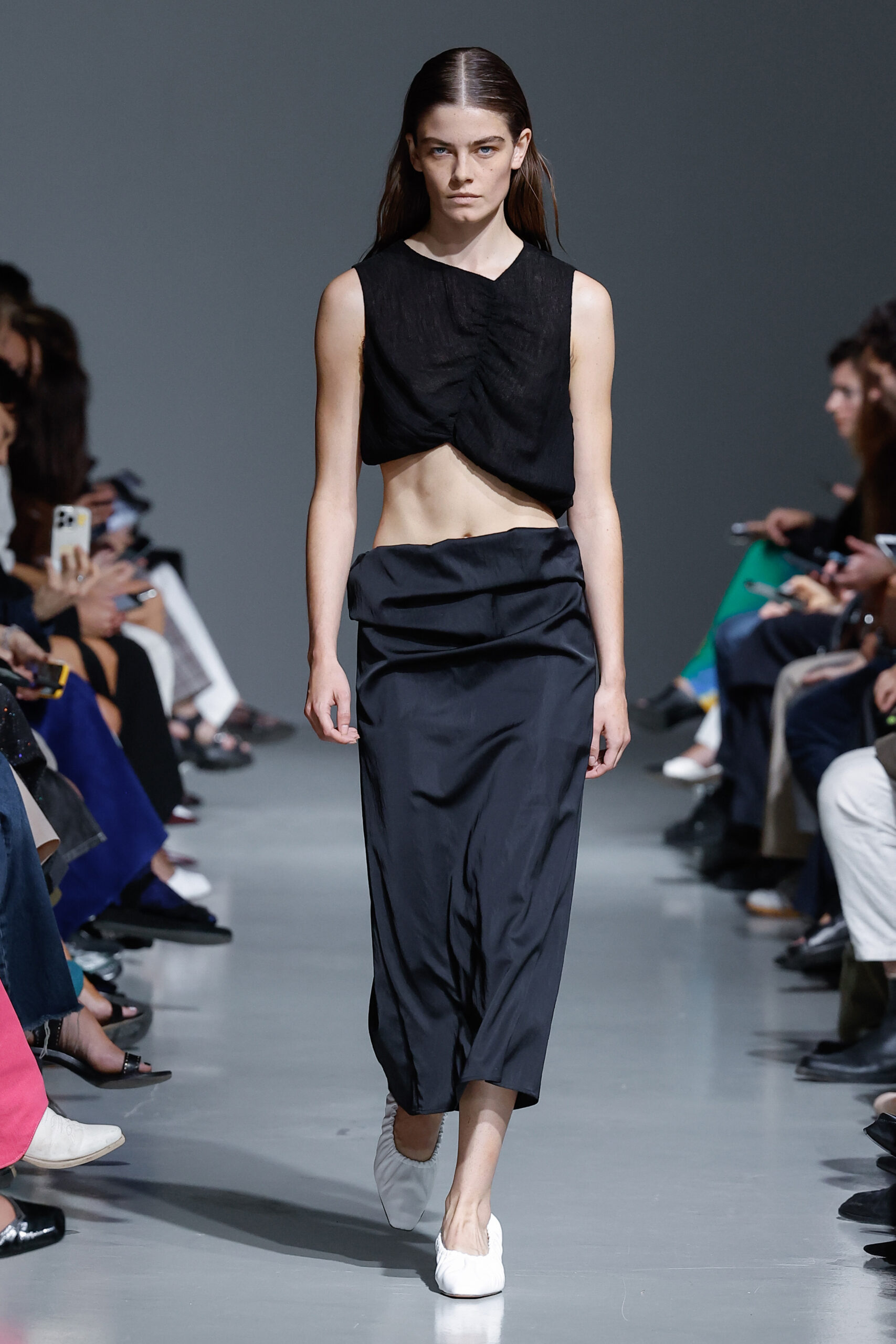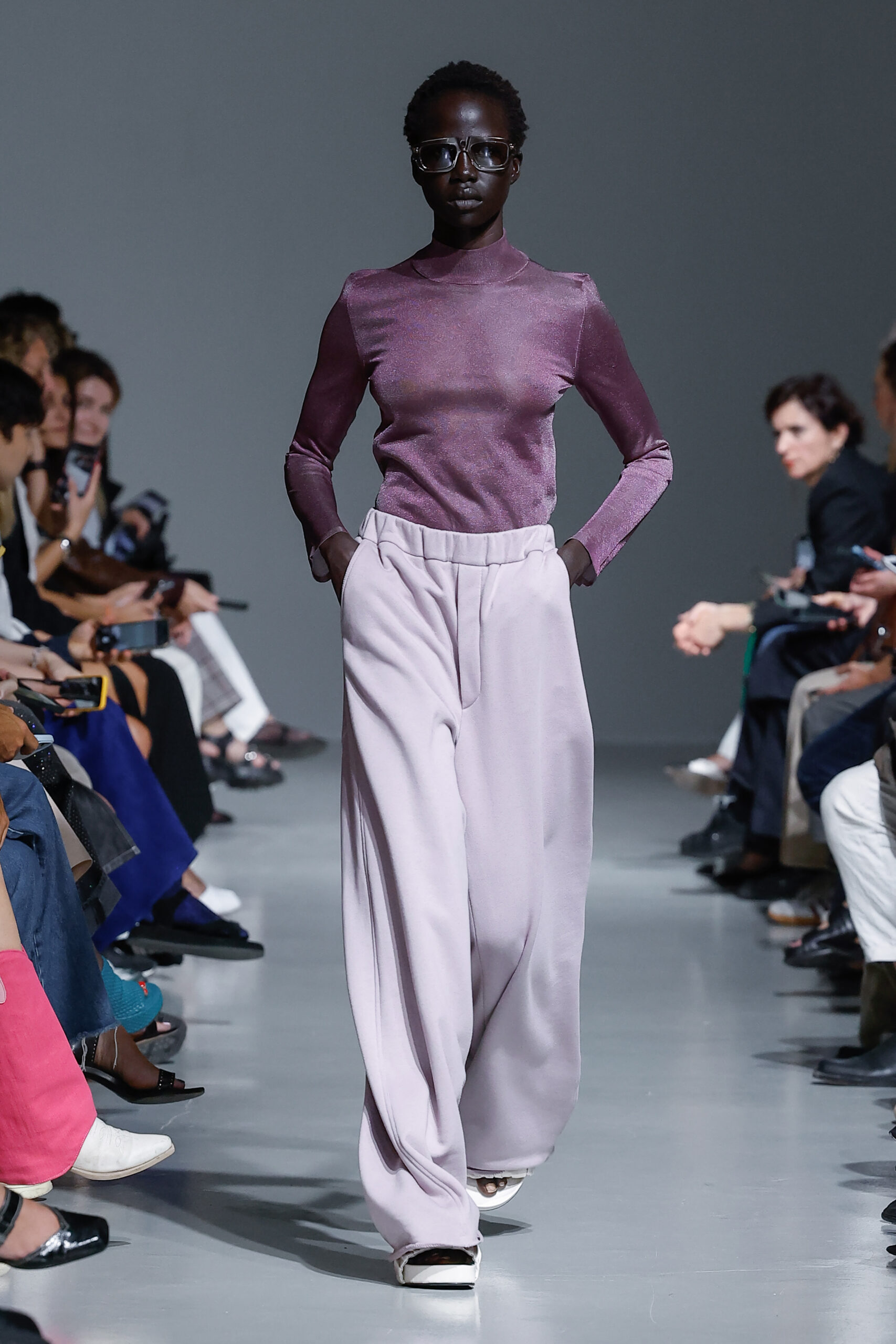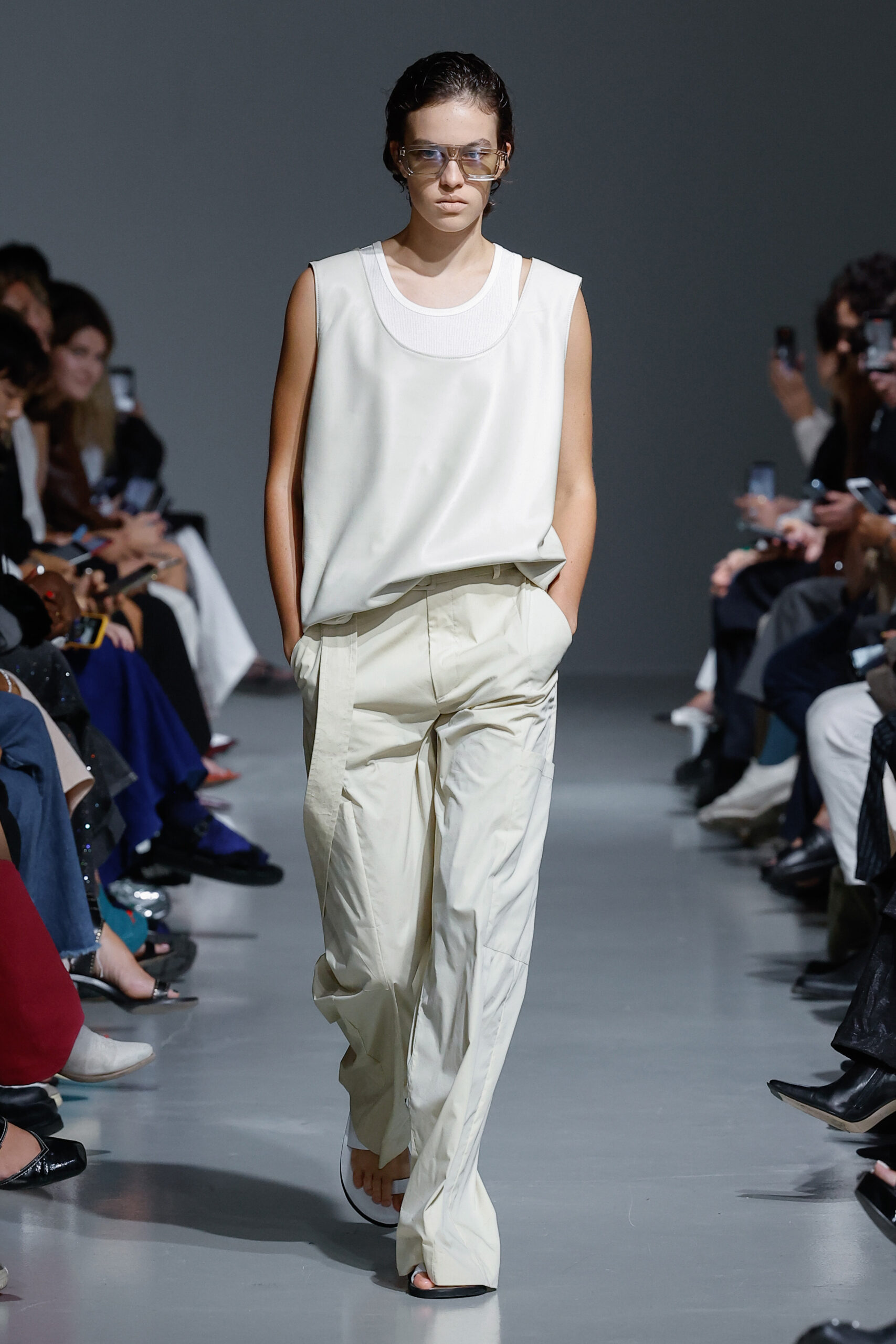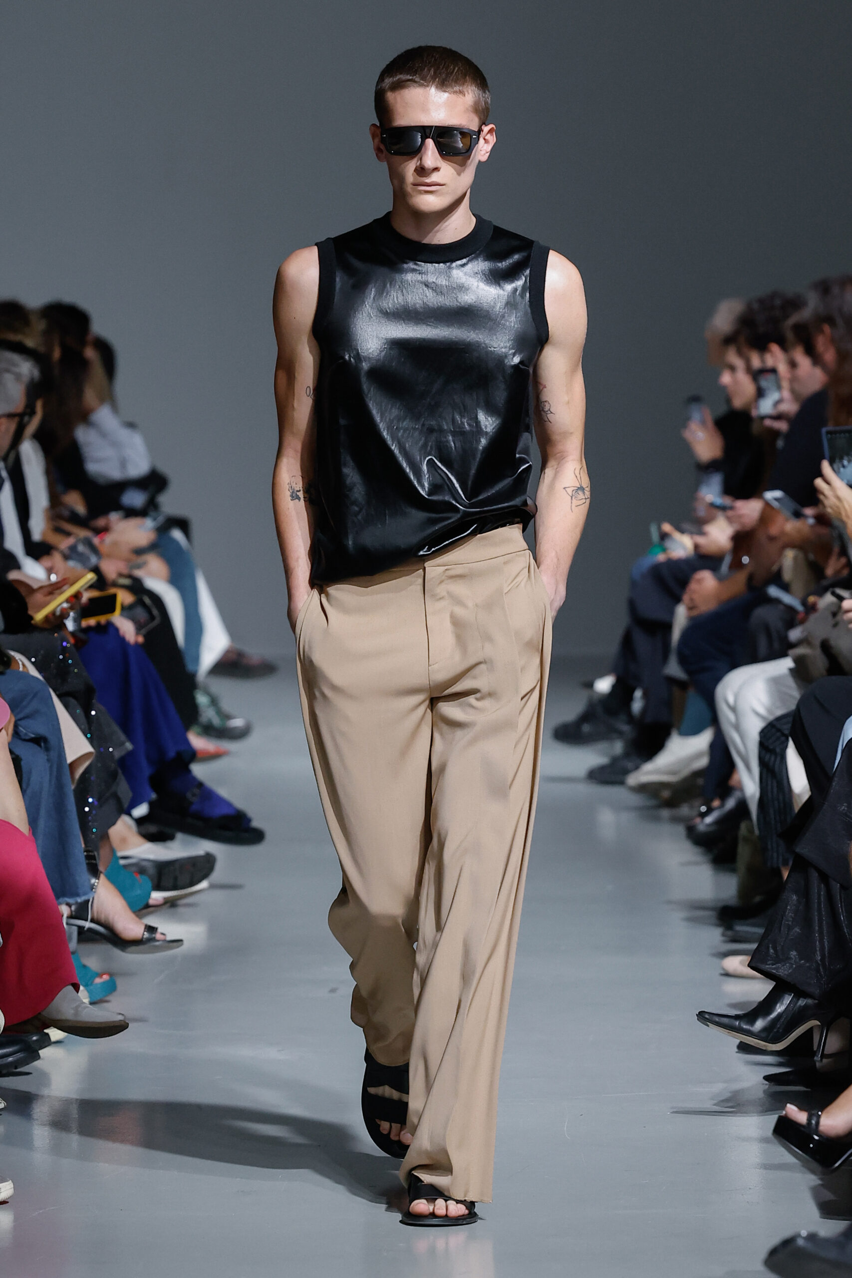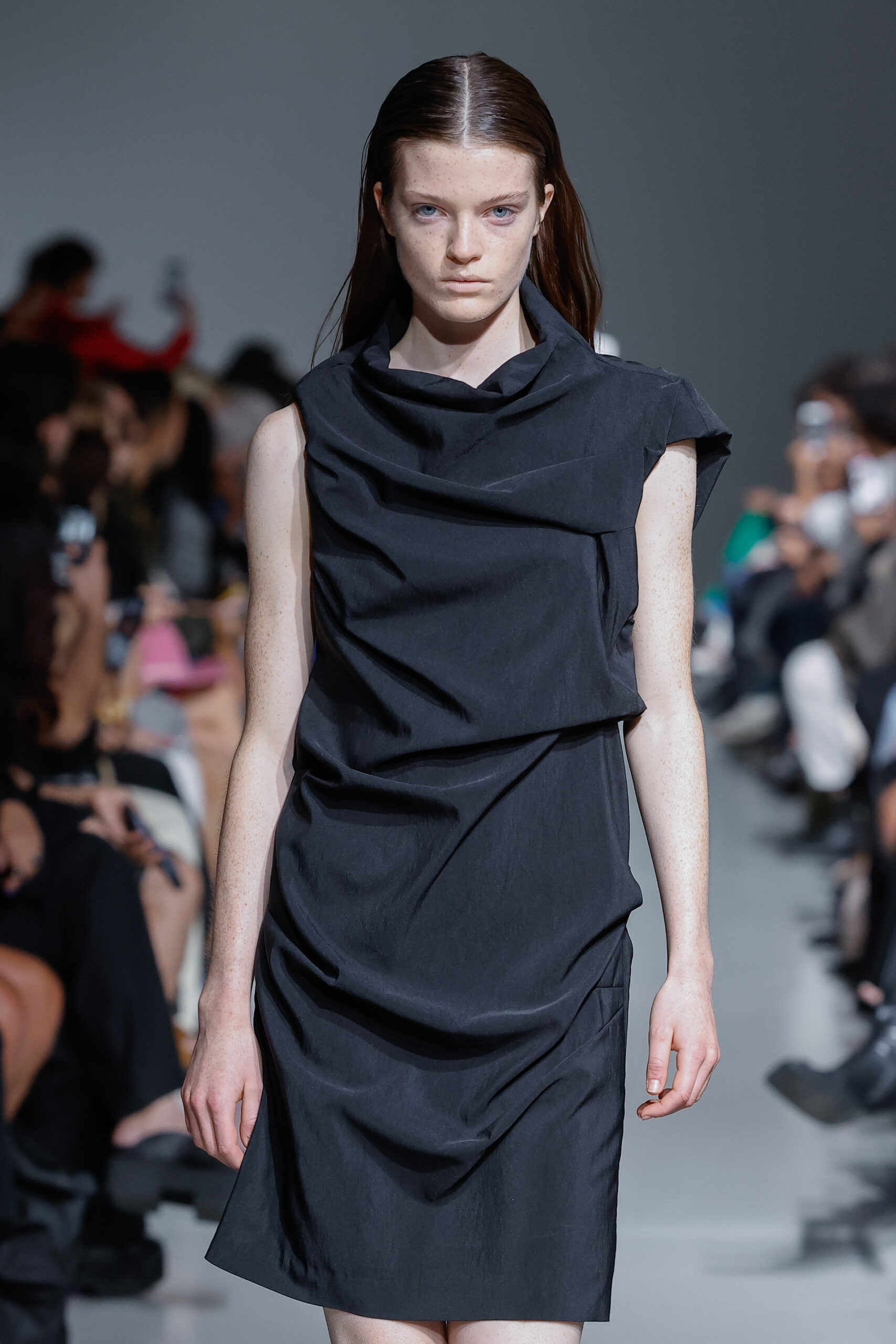 - Jeux de Matières : Un contraste entre la mousseline de soie transparente et le cuir opaque crée une dynamique intéressante au sein des silhouettes.