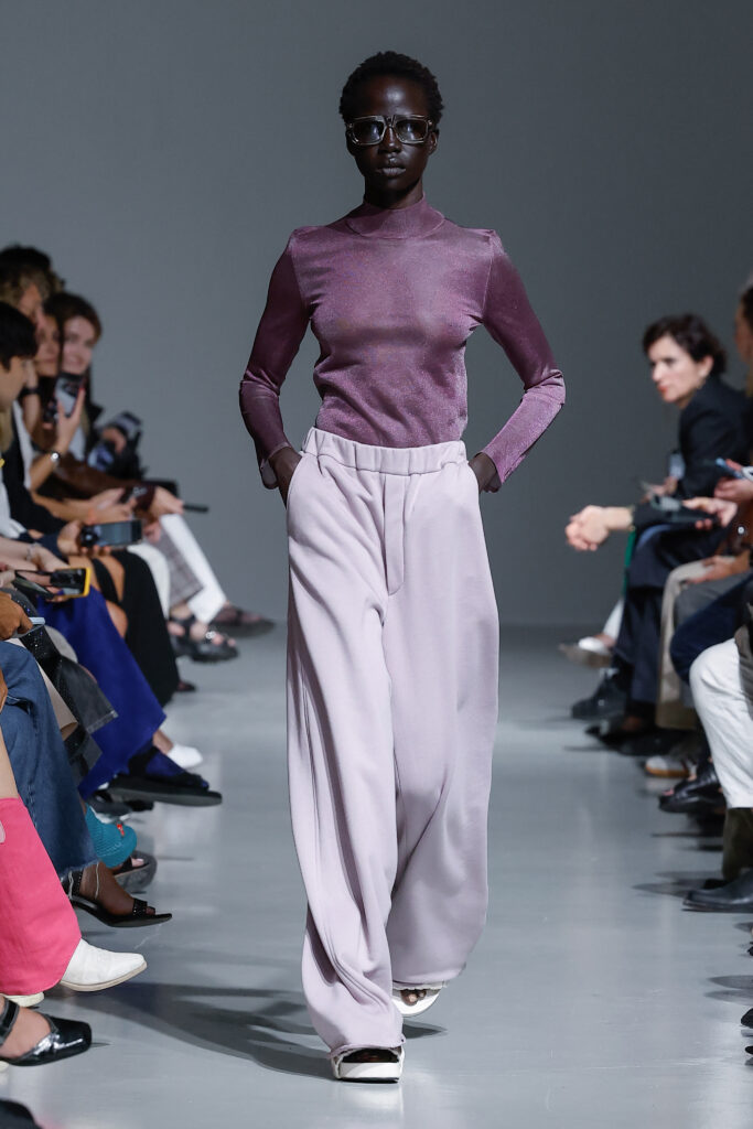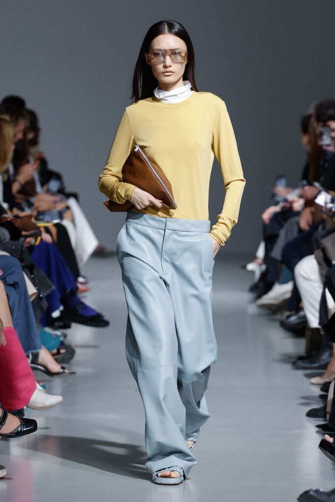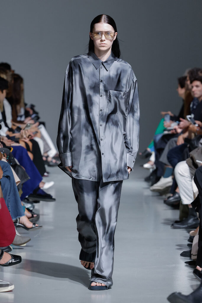 - Uniforme Monochrome : La collection met l’accent sur des ensembles monochromes, apportant une perspective graphique au tailoring classique de la maison.