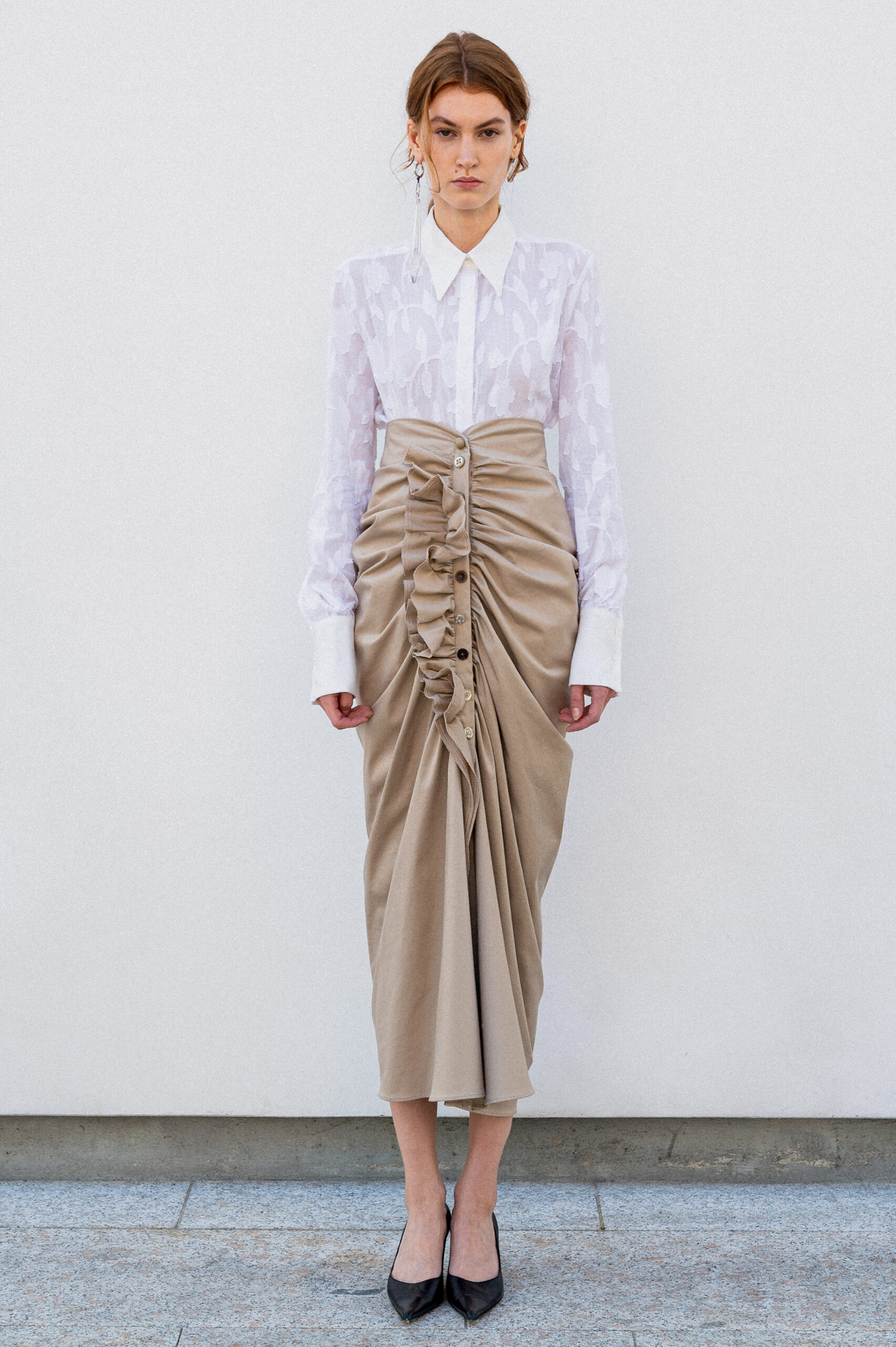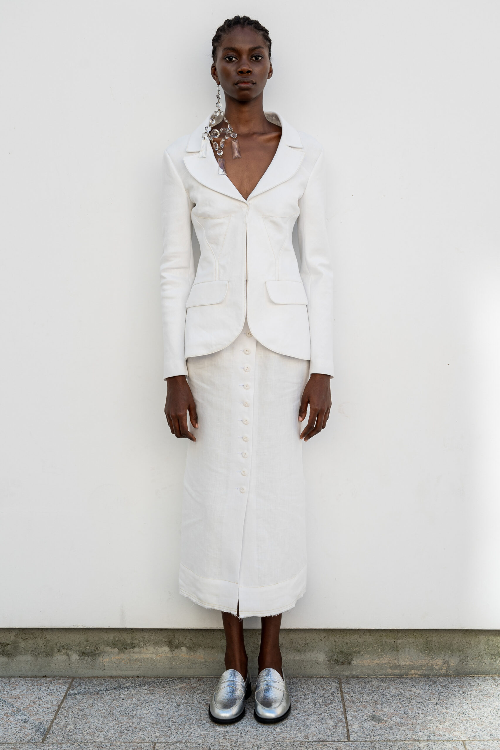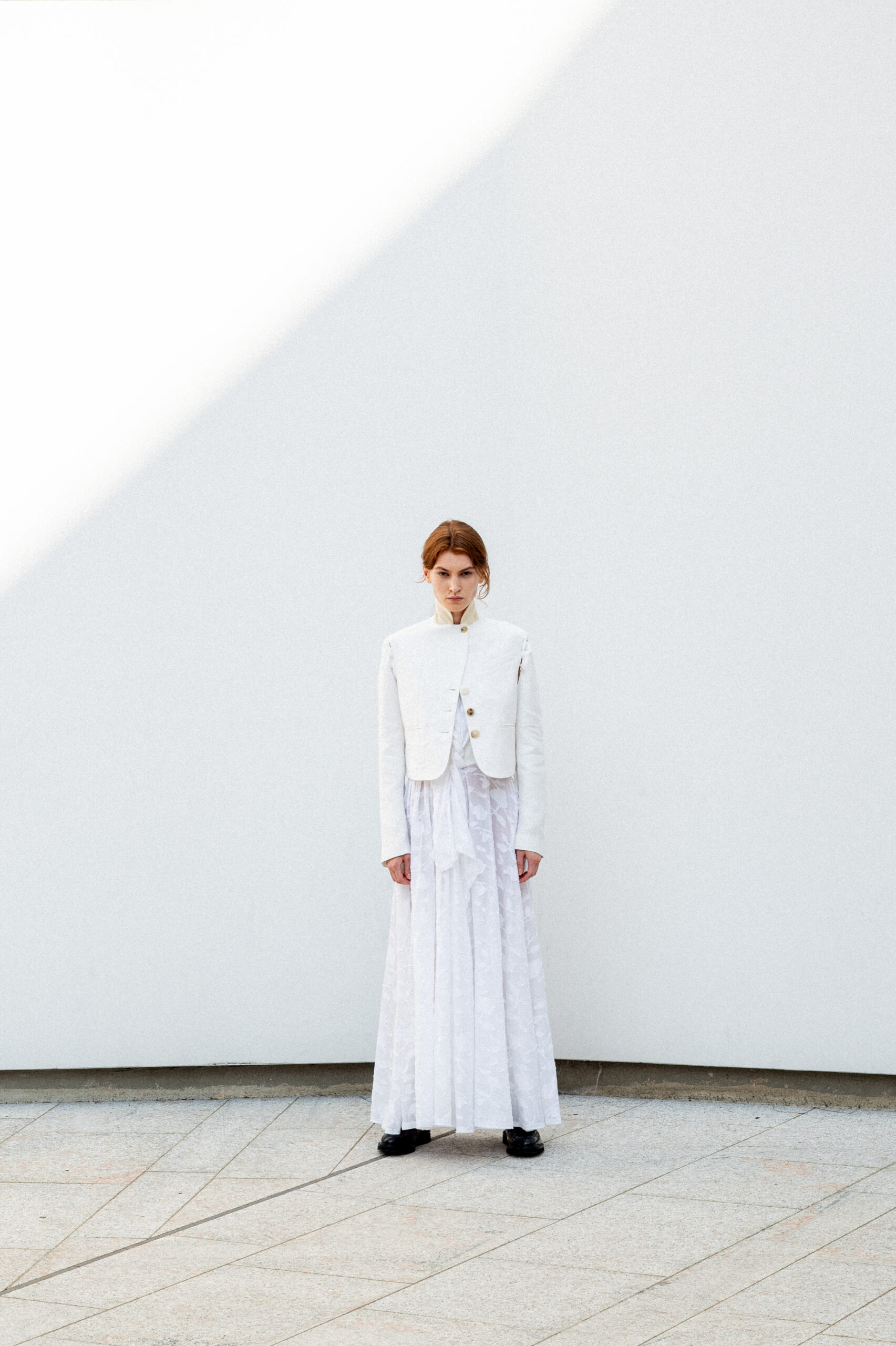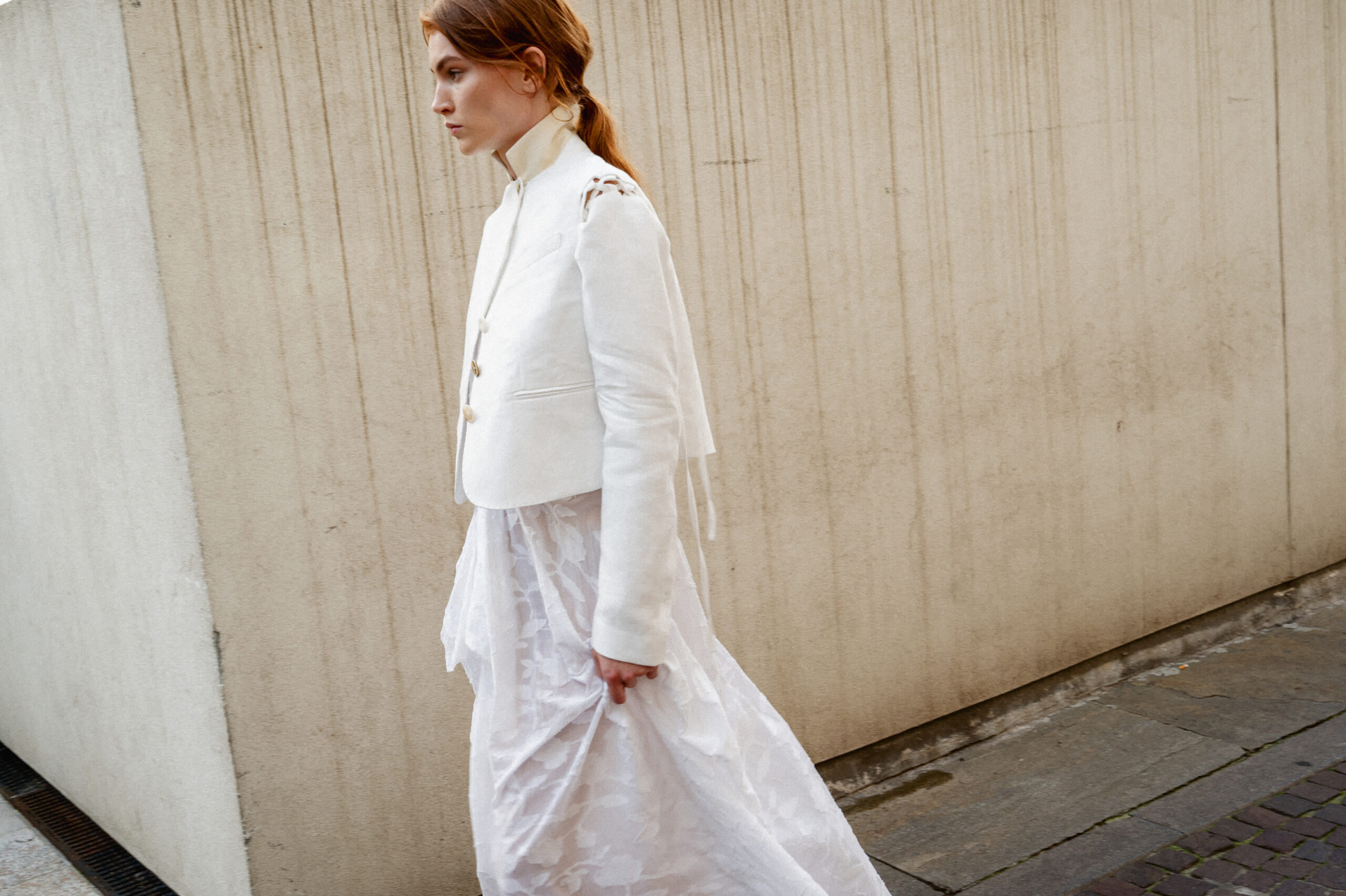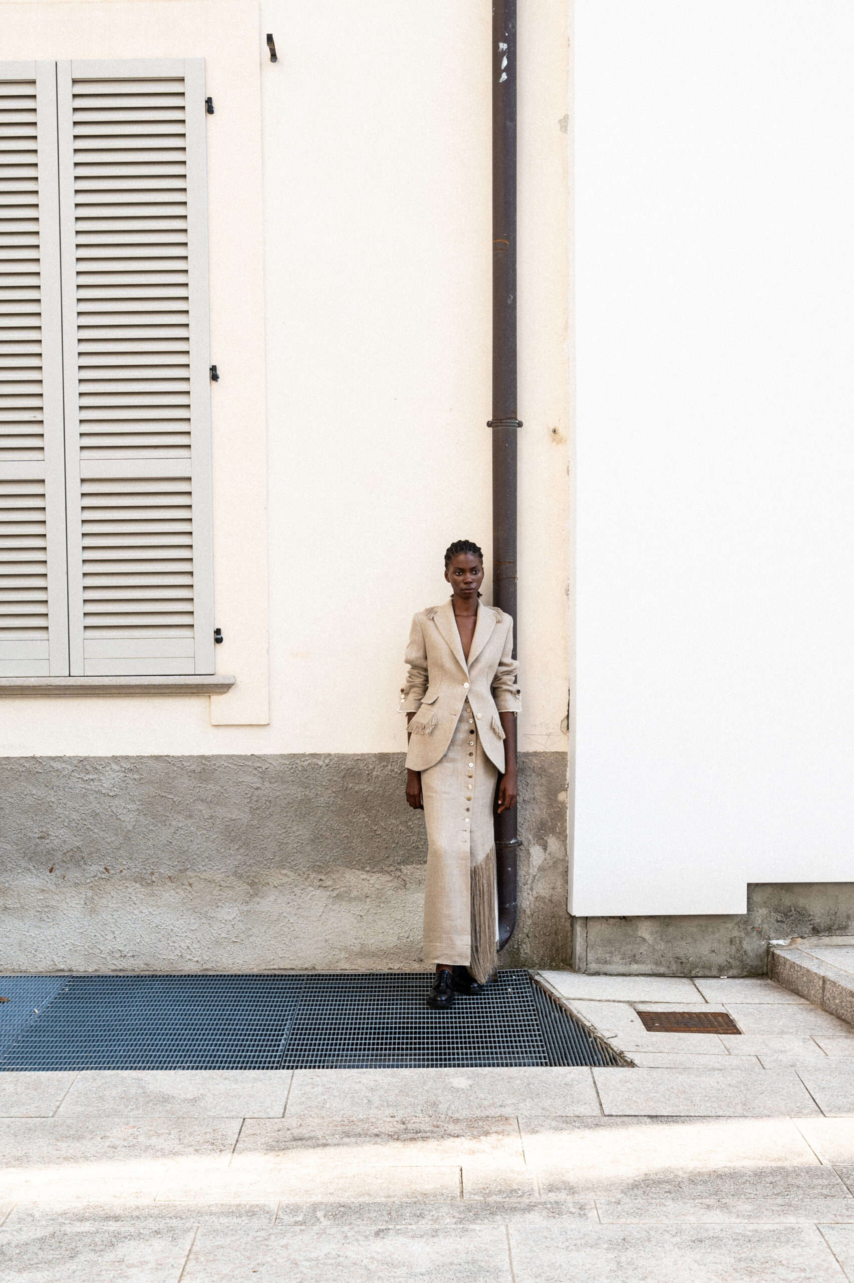 La jute, habilement transformée en franges, anime vestes et vêtements, façonnés avec des techniques manuelles précieuses qui racontent des histoires anciennes. Le coton de cavalerie, évoquant les uniformes des gendarmes du début du XXe siècle, donne naissance à des jupes volantées au drapé « coupé net » dans une forme cocon strict, typique du Gigli le plus romantique.