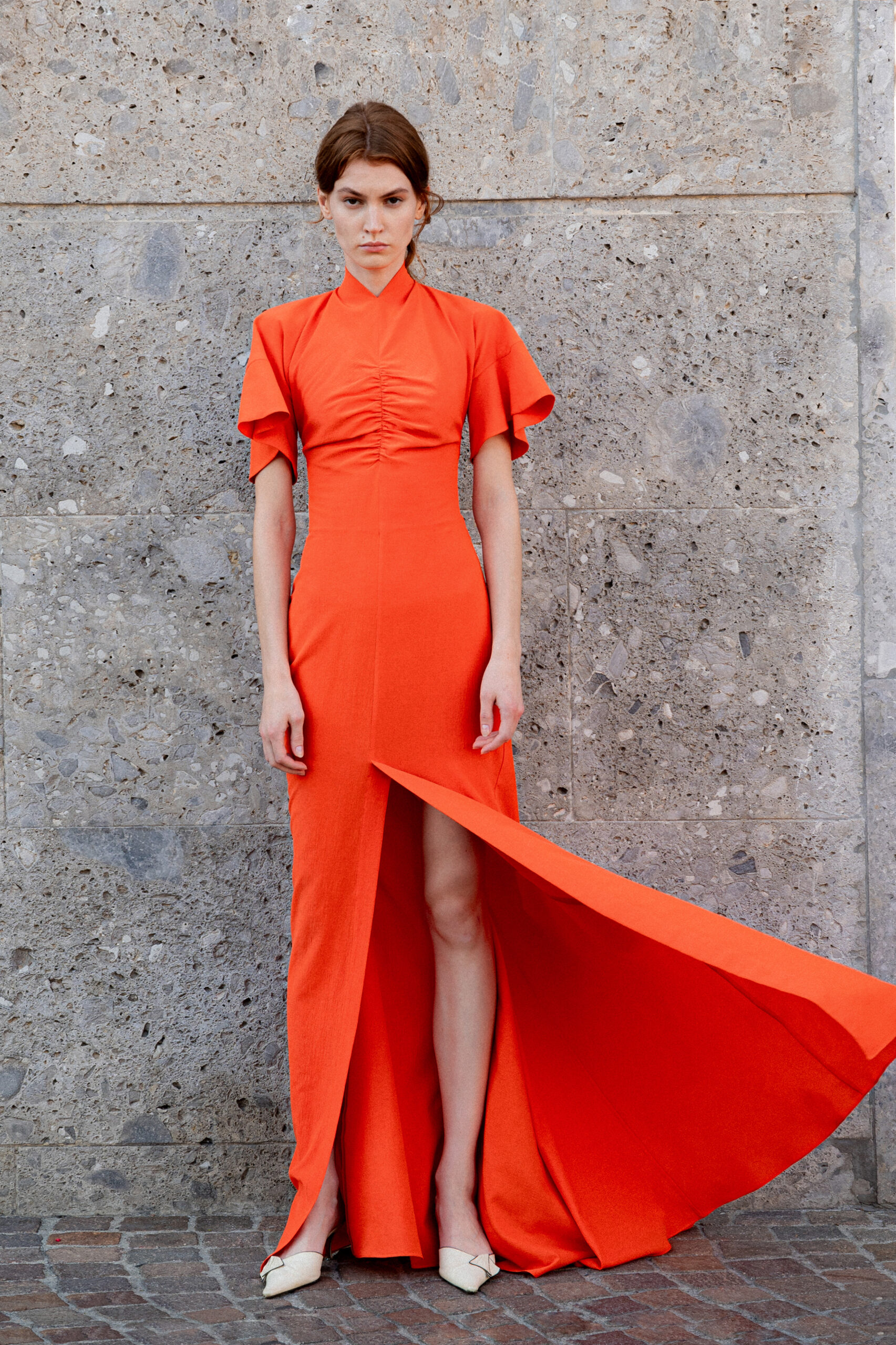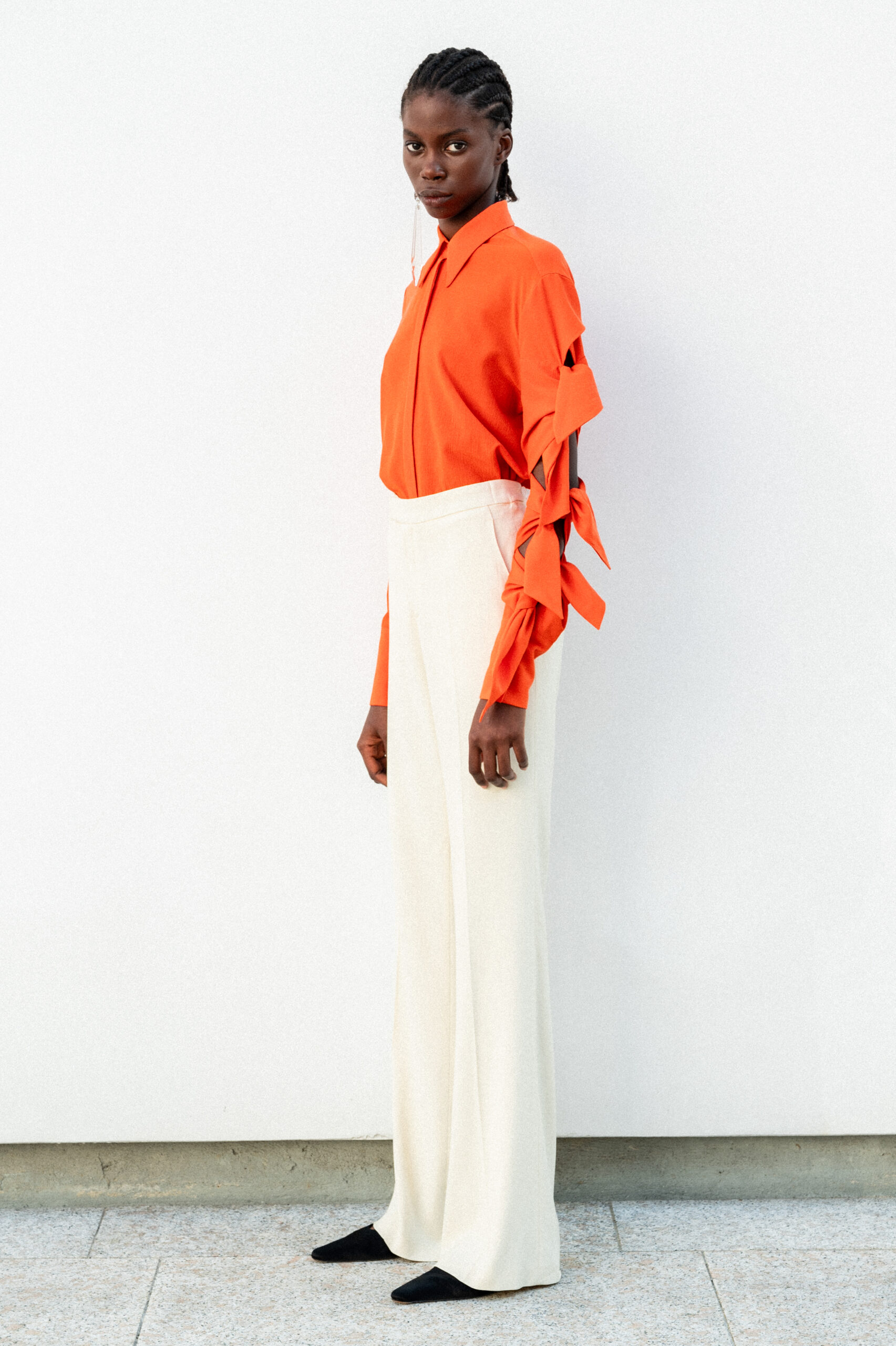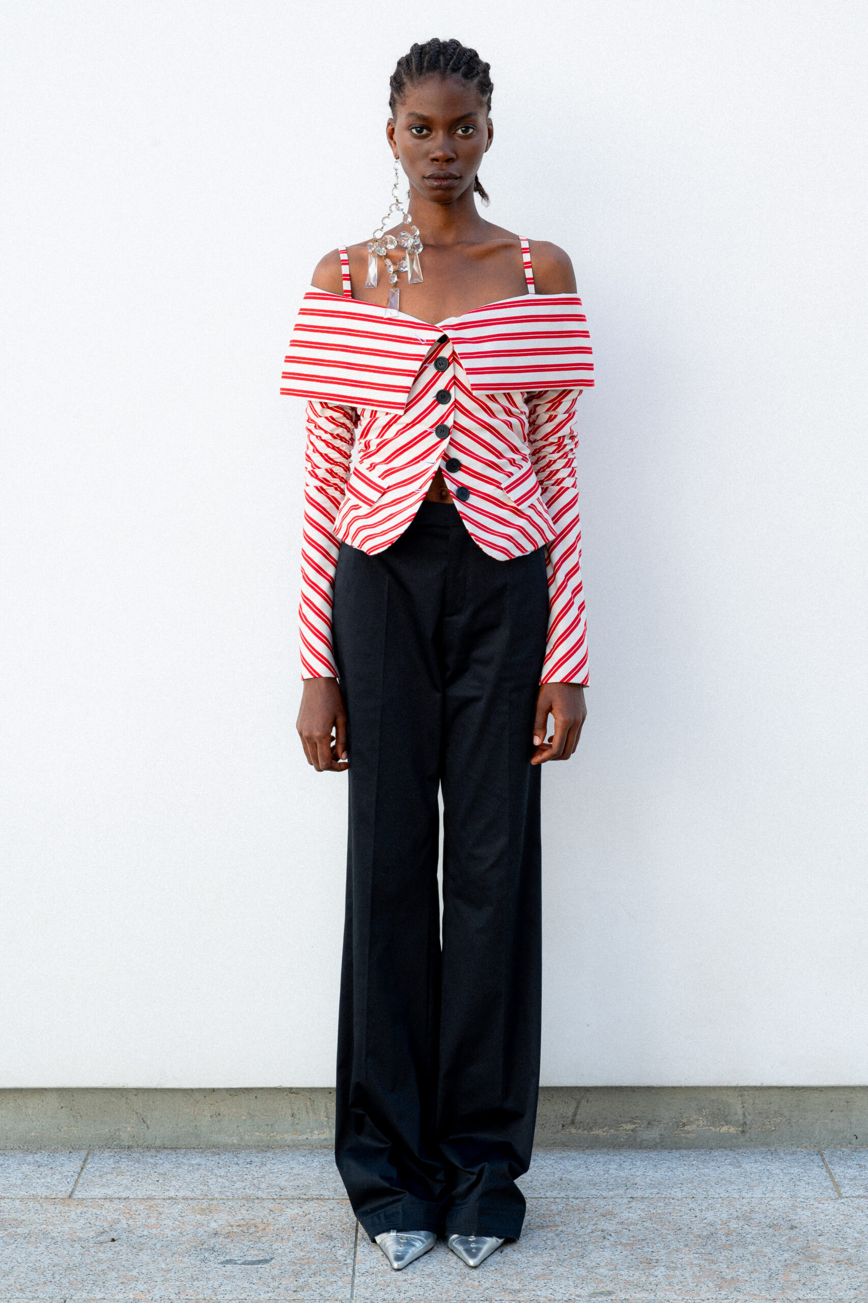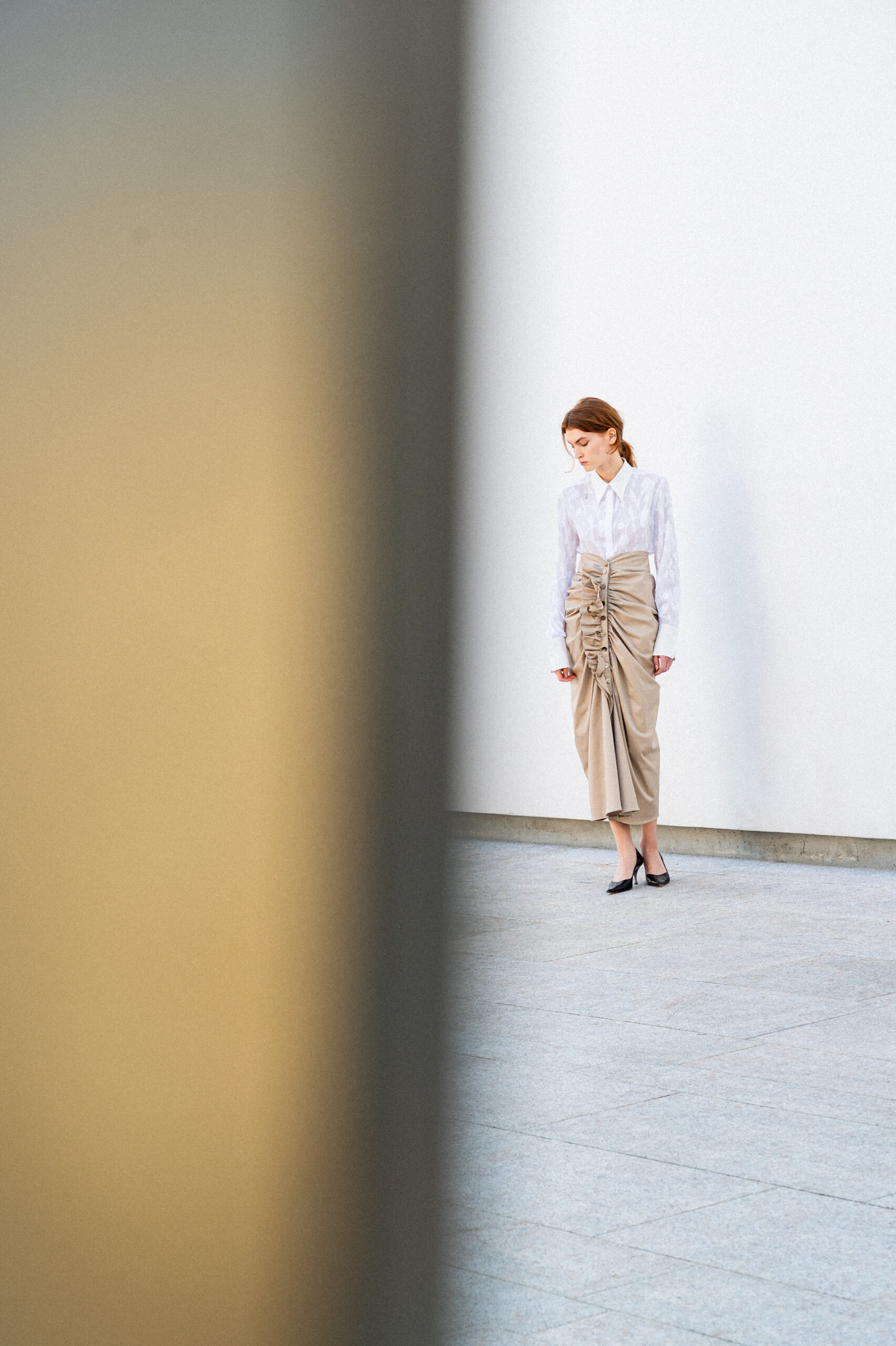 La jute, habilement transformée en franges, anime vestes et vêtements, façonnés avec des techniques manuelles précieuses qui racontent des histoires anciennes. Le coton de cavalerie, évoquant les uniformes des gendarmes du début du XXe siècle, donne naissance à des jupes volantées au drapé « coupé net » dans une forme cocon strict, typique du Gigli le plus romantique.