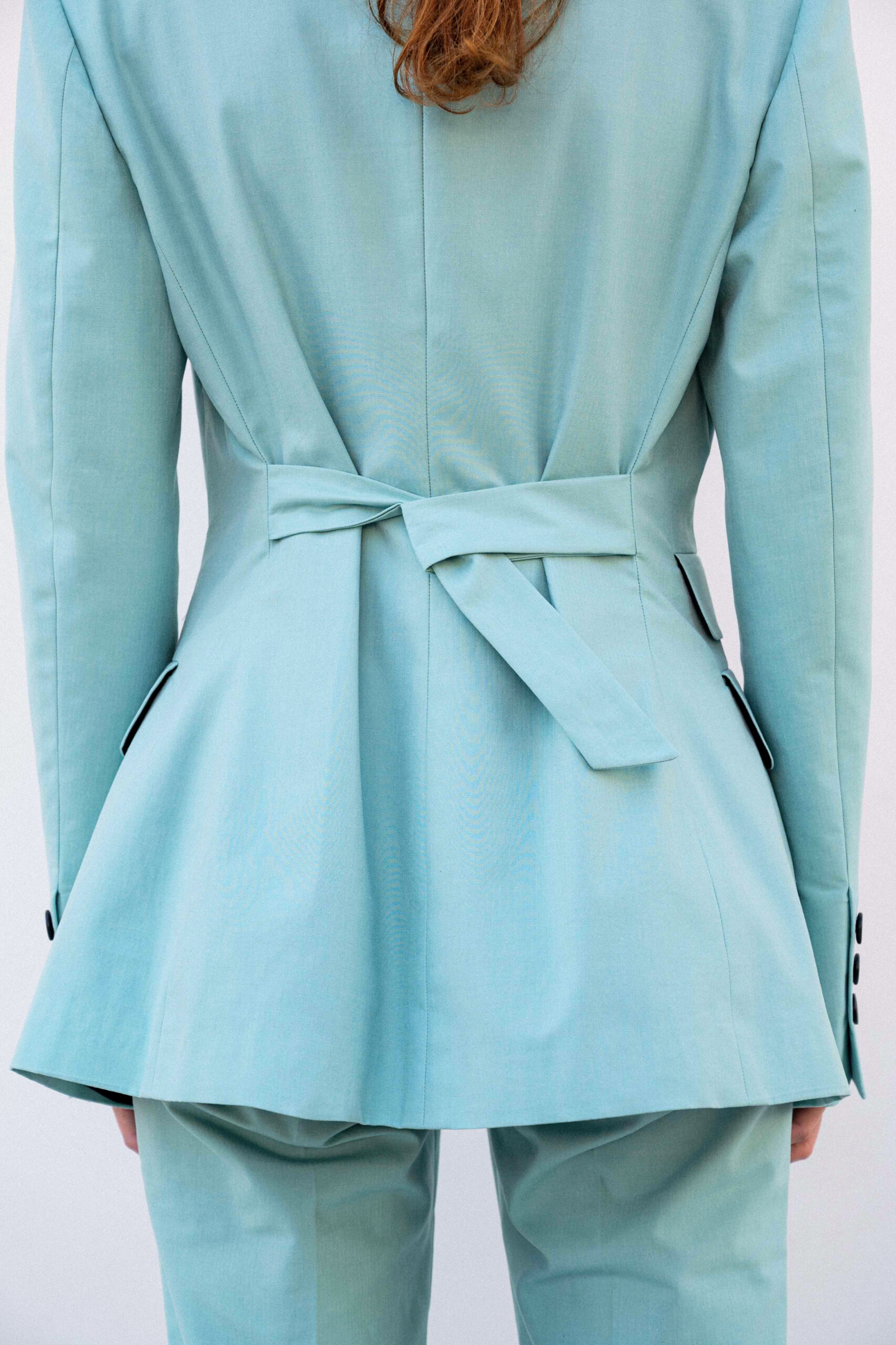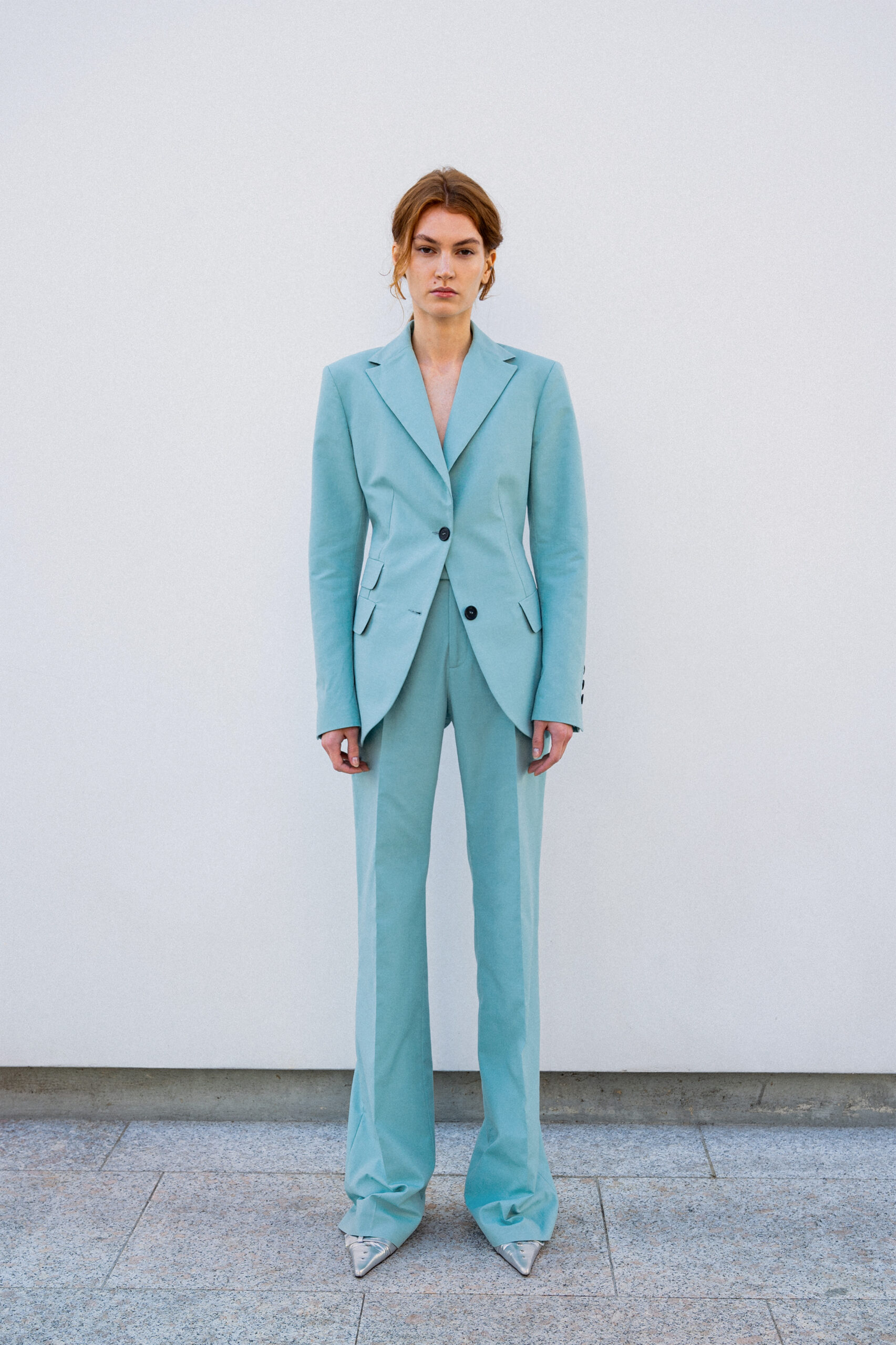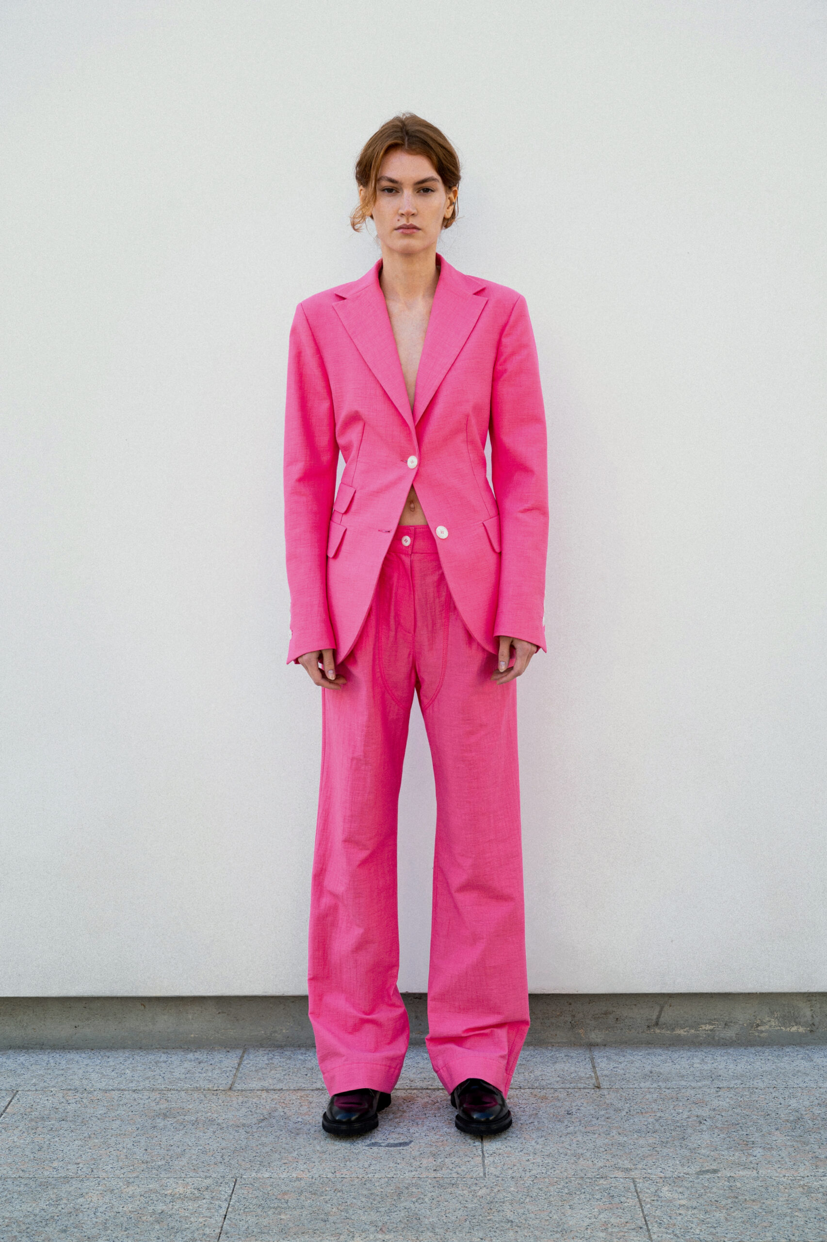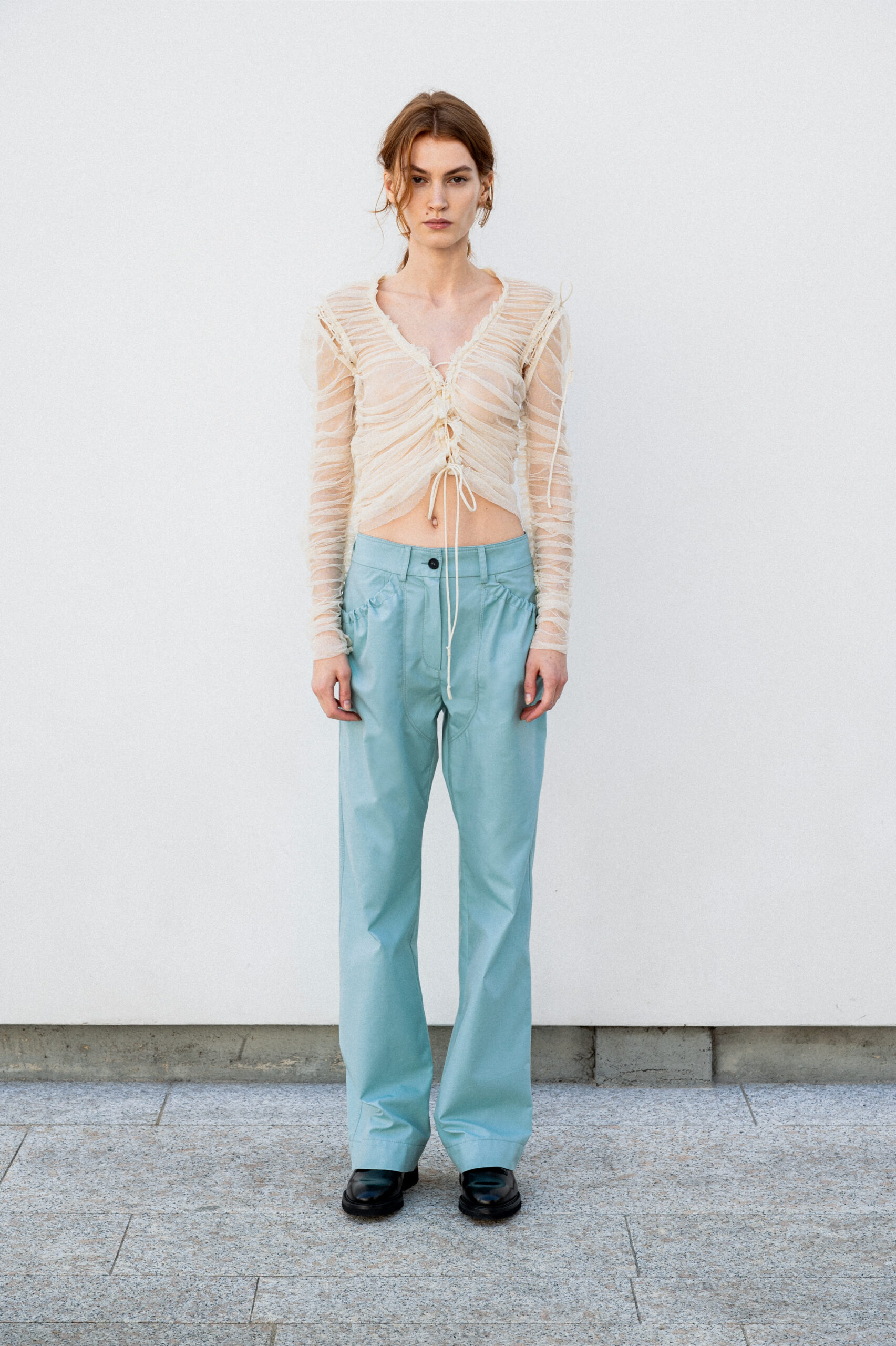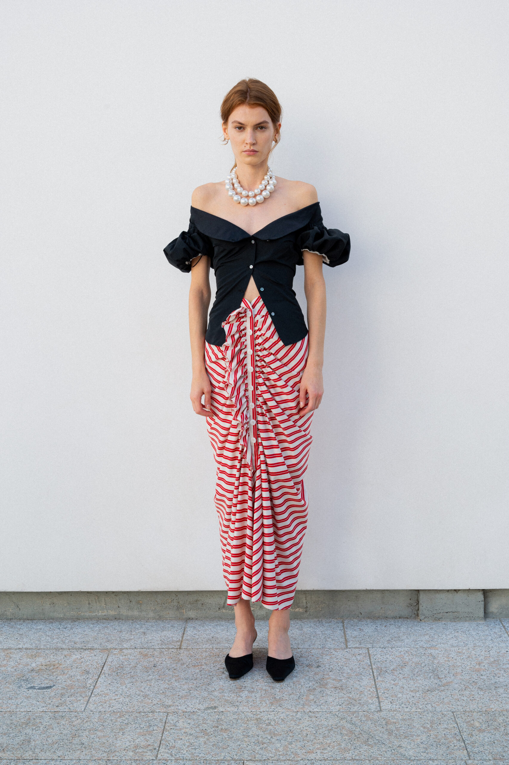 La jute, habilement transformée en franges, anime vestes et vêtements, façonnés avec des techniques manuelles précieuses qui racontent des histoires anciennes. Le coton de cavalerie, évoquant les uniformes des gendarmes du début du XXe siècle, donne naissance à des jupes volantées au drapé « coupé net » dans une forme cocon strict, typique du Gigli le plus romantique.