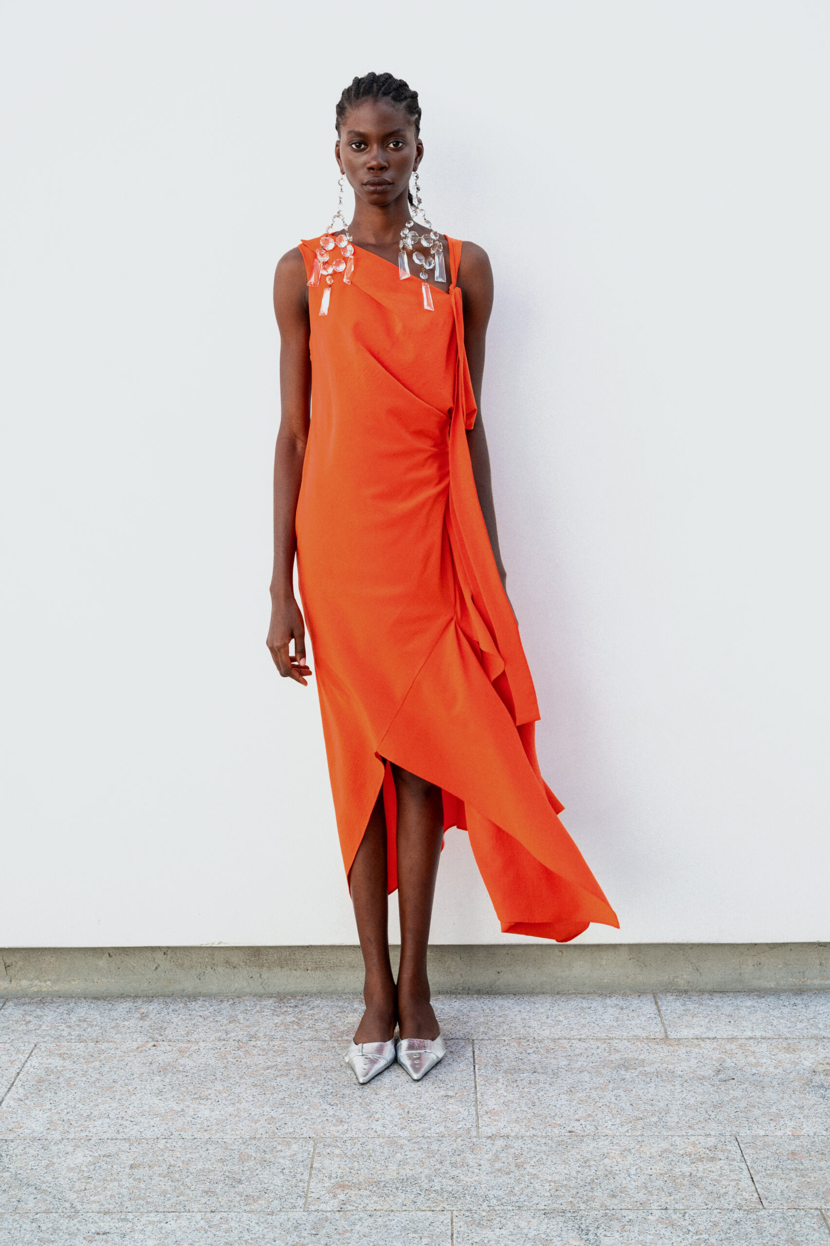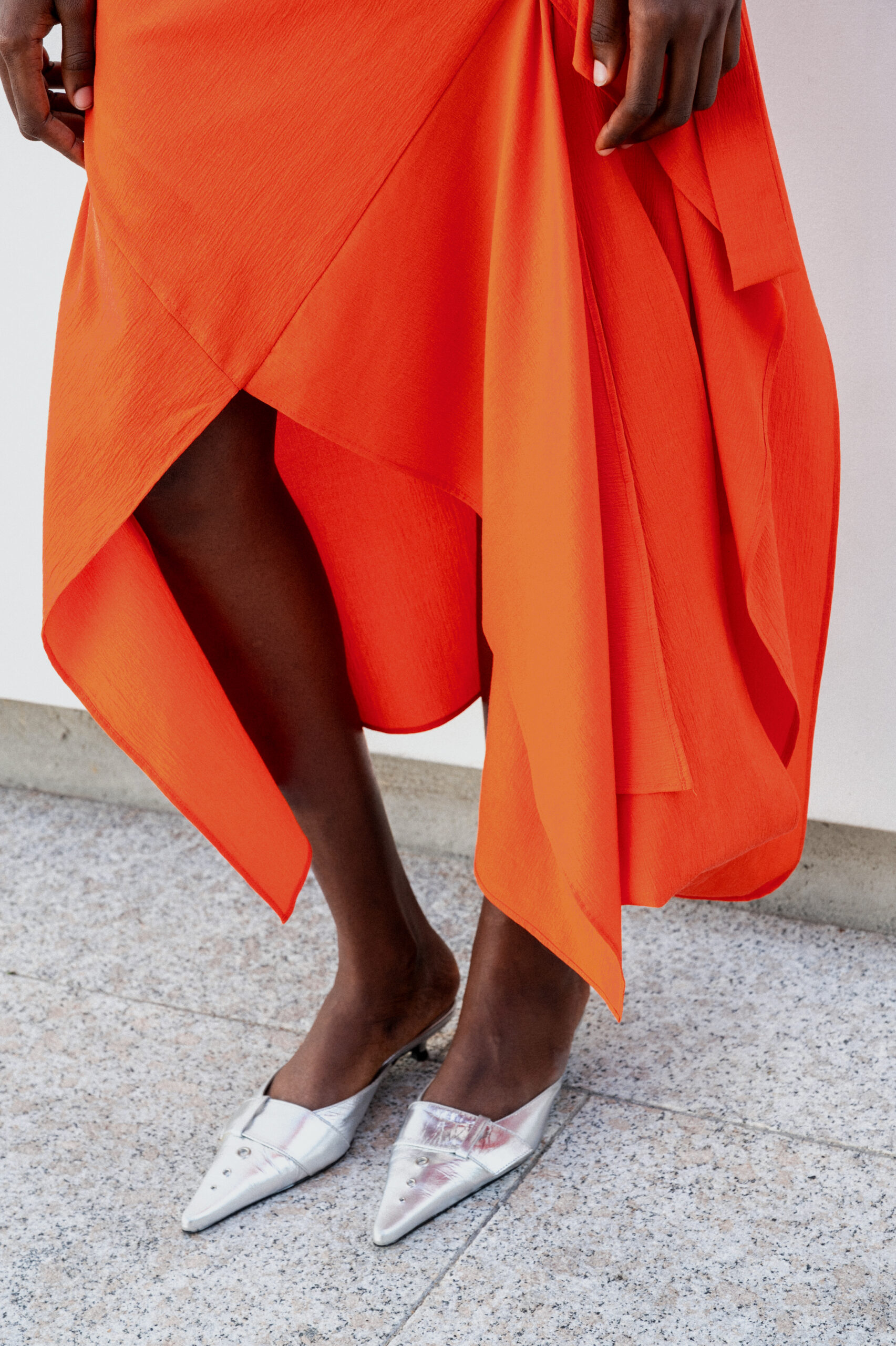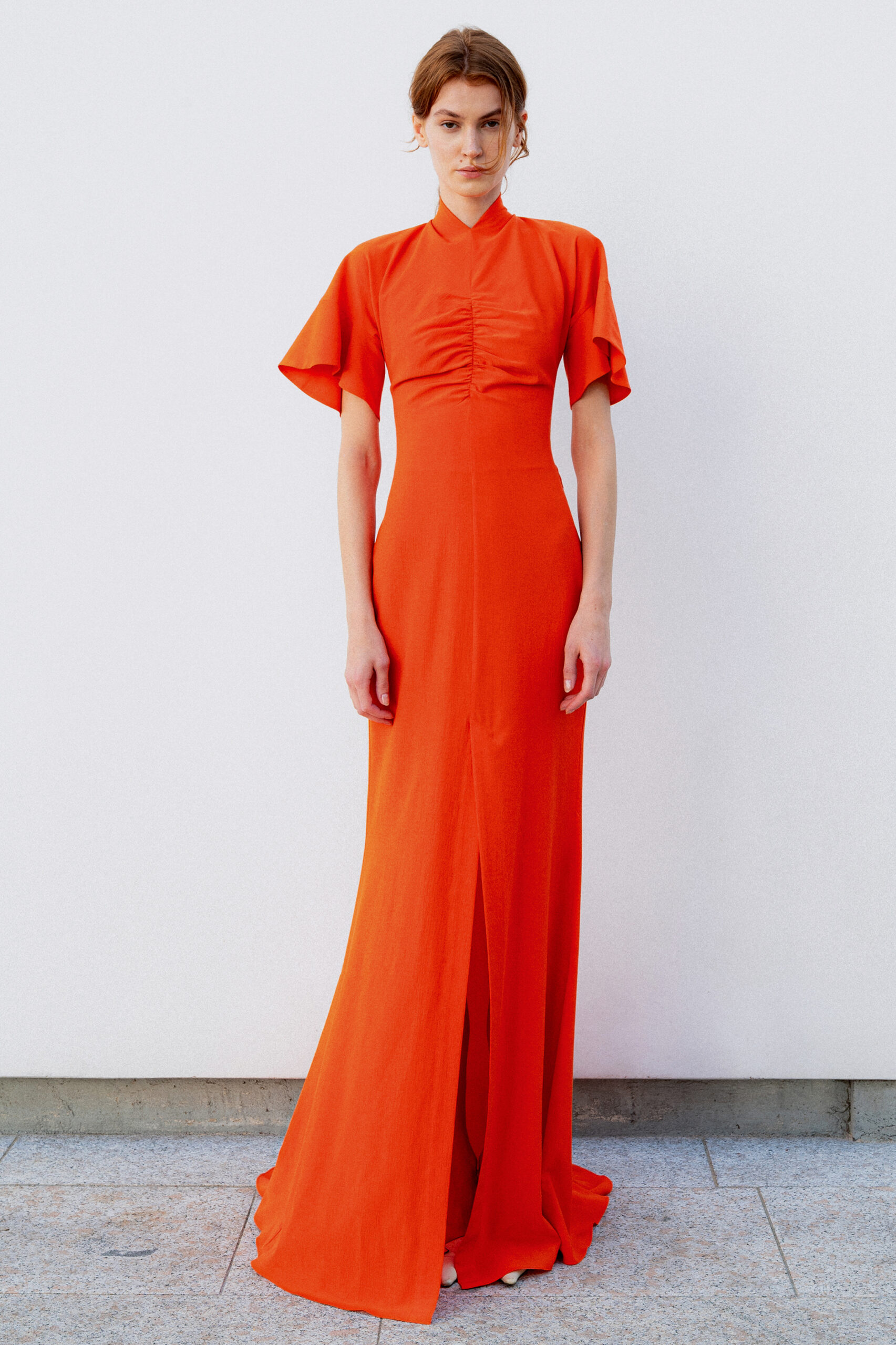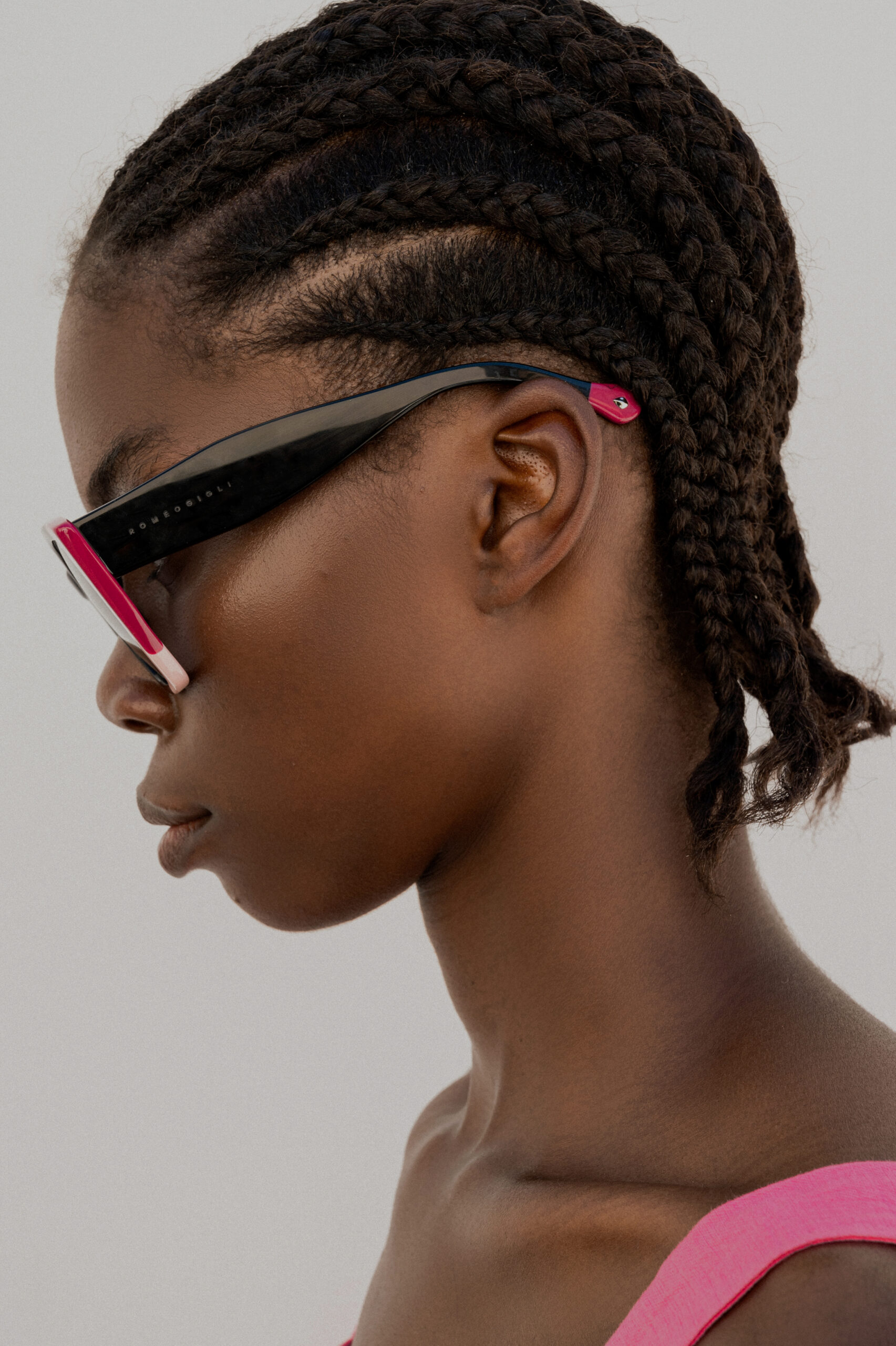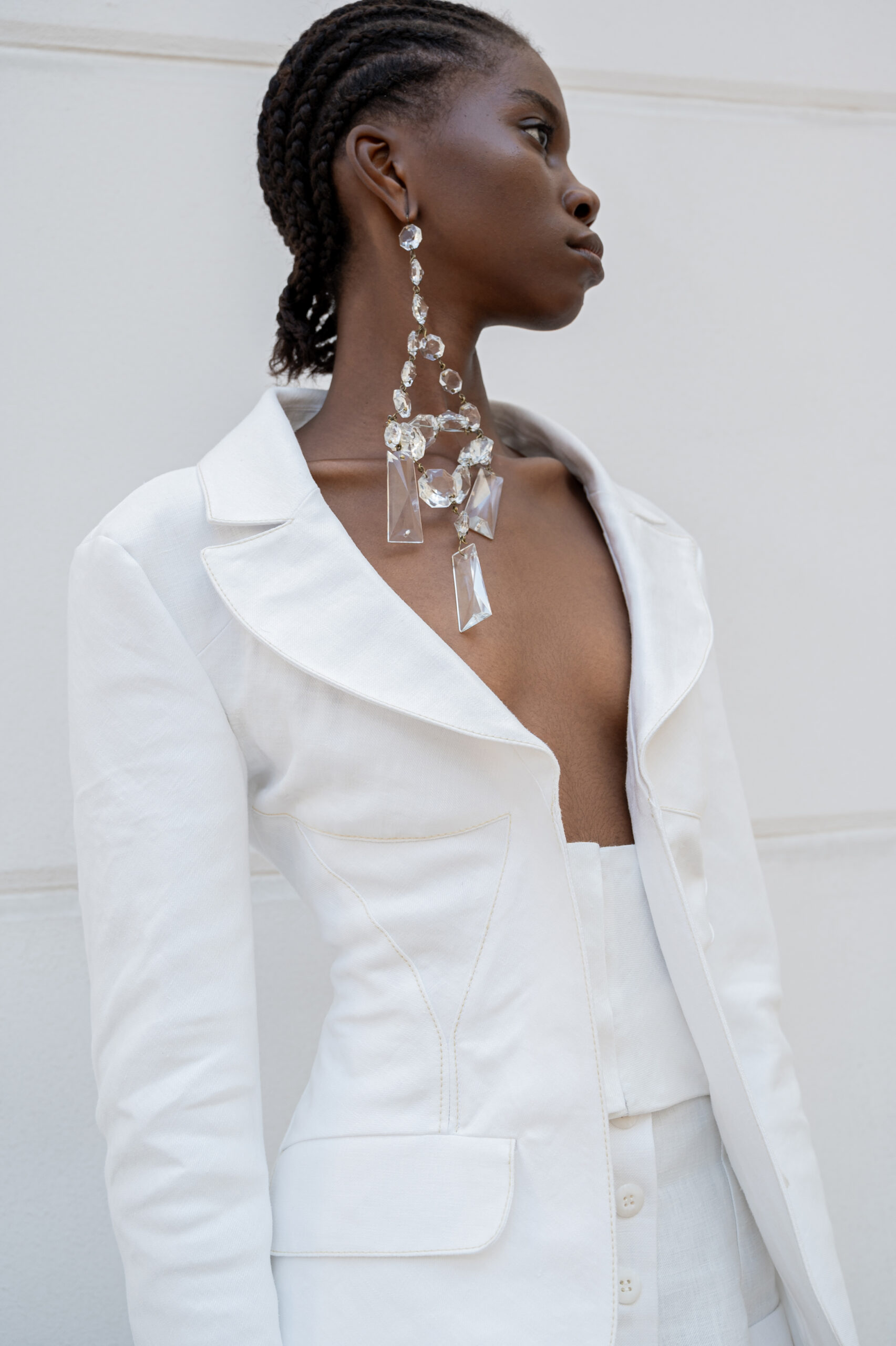 Les couleurs « orange coucher de soleil », « rose Mexique », « blanc dune » et « mastic sable » se mêlent au bleu des aurores tropicales dans le ciel égyptien, évoquant les reflets des anciennes pyramides dans les boucles d’oreilles surdimensionnées qui rendent hommage à la gloire passée de Gigli.