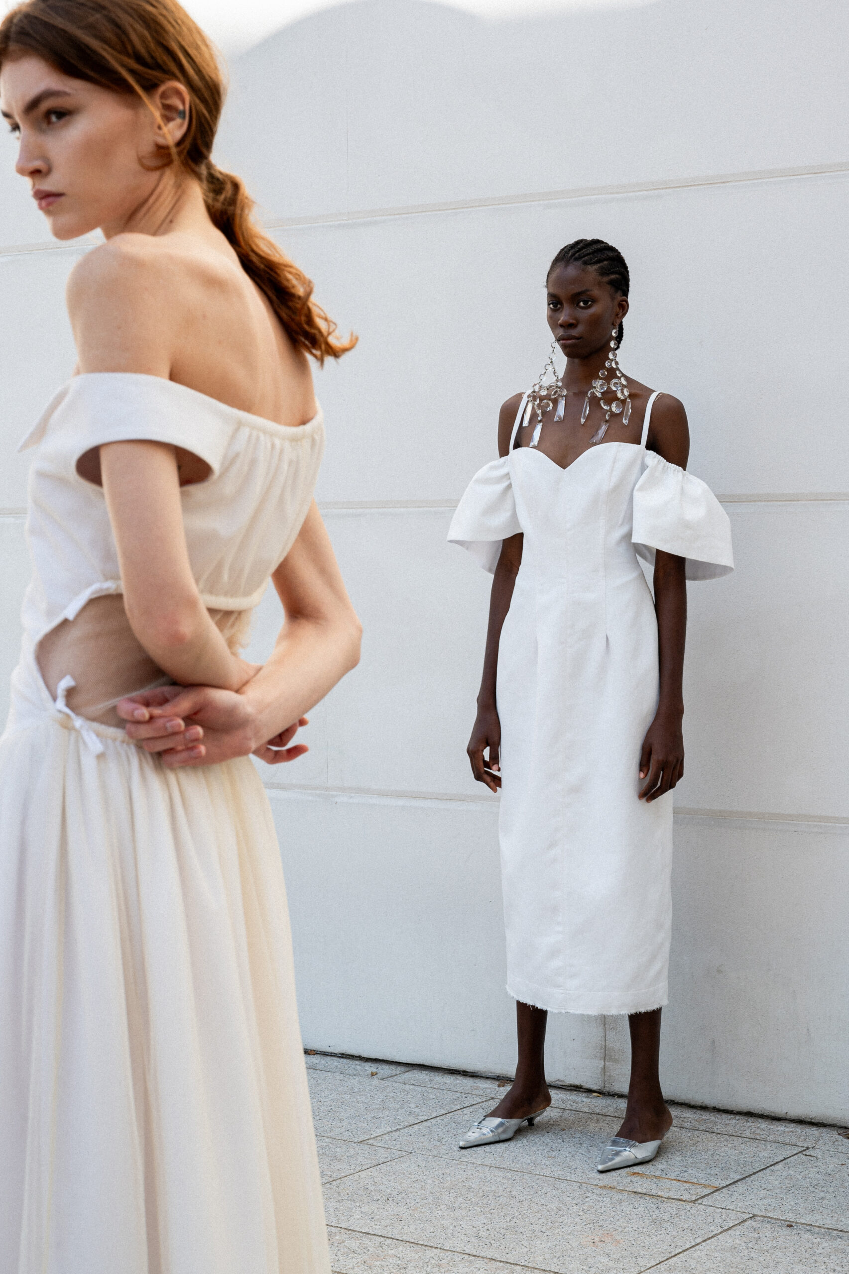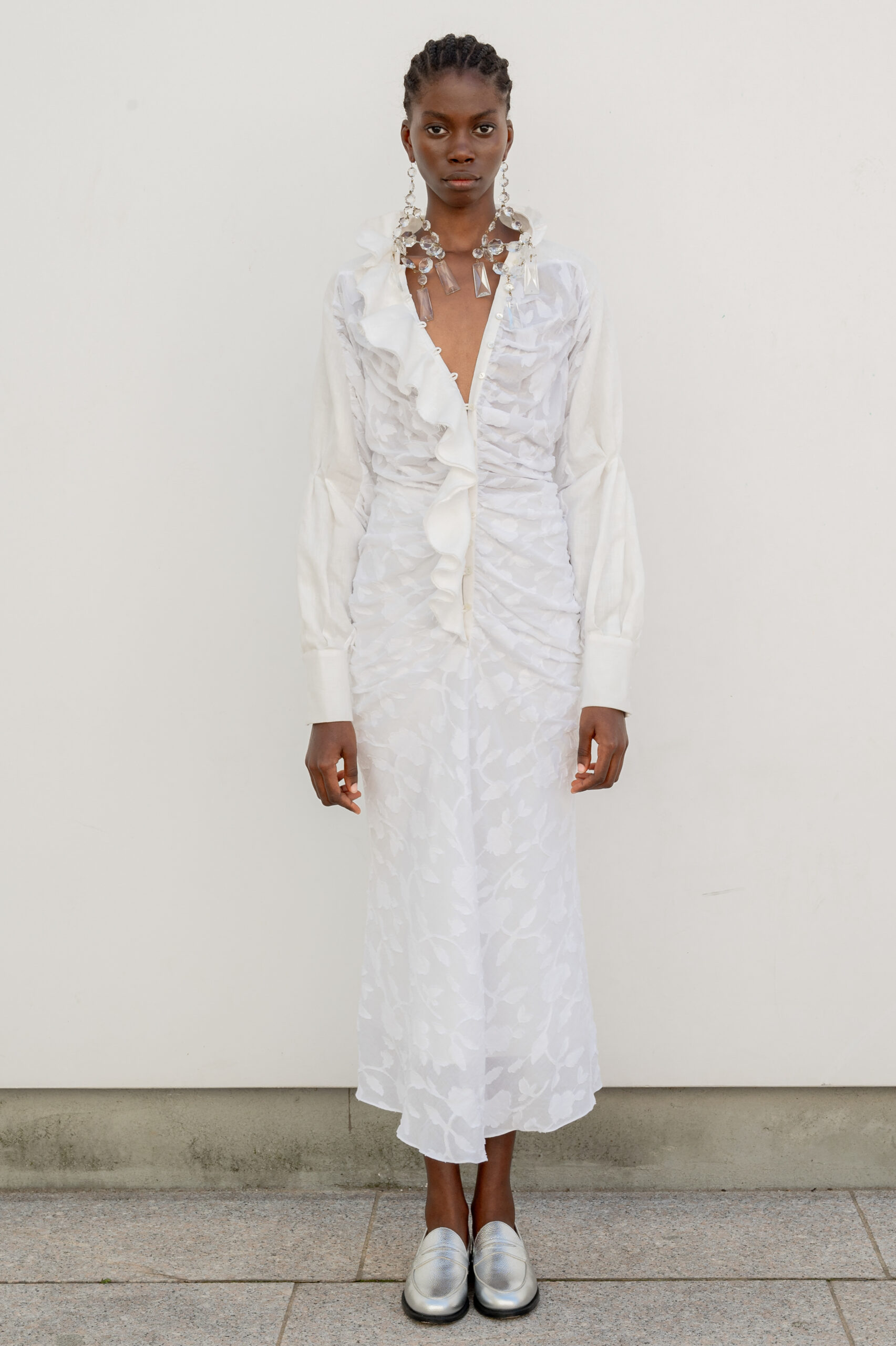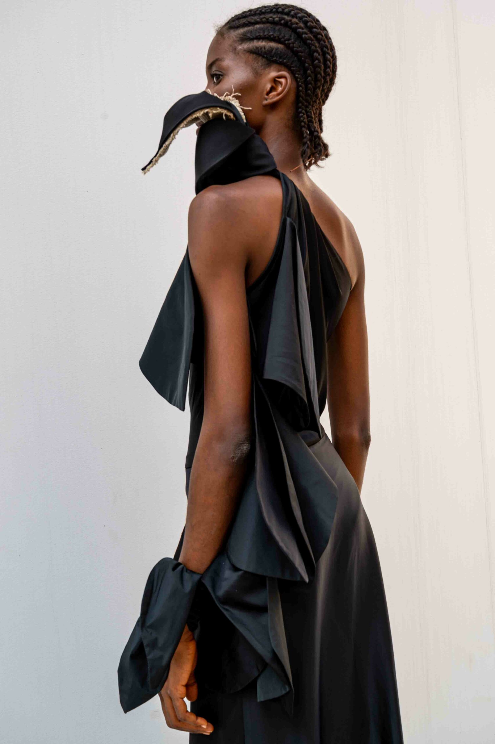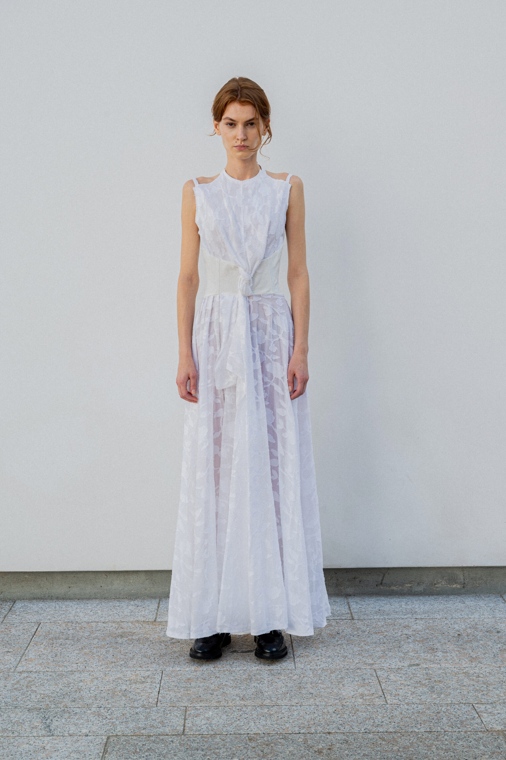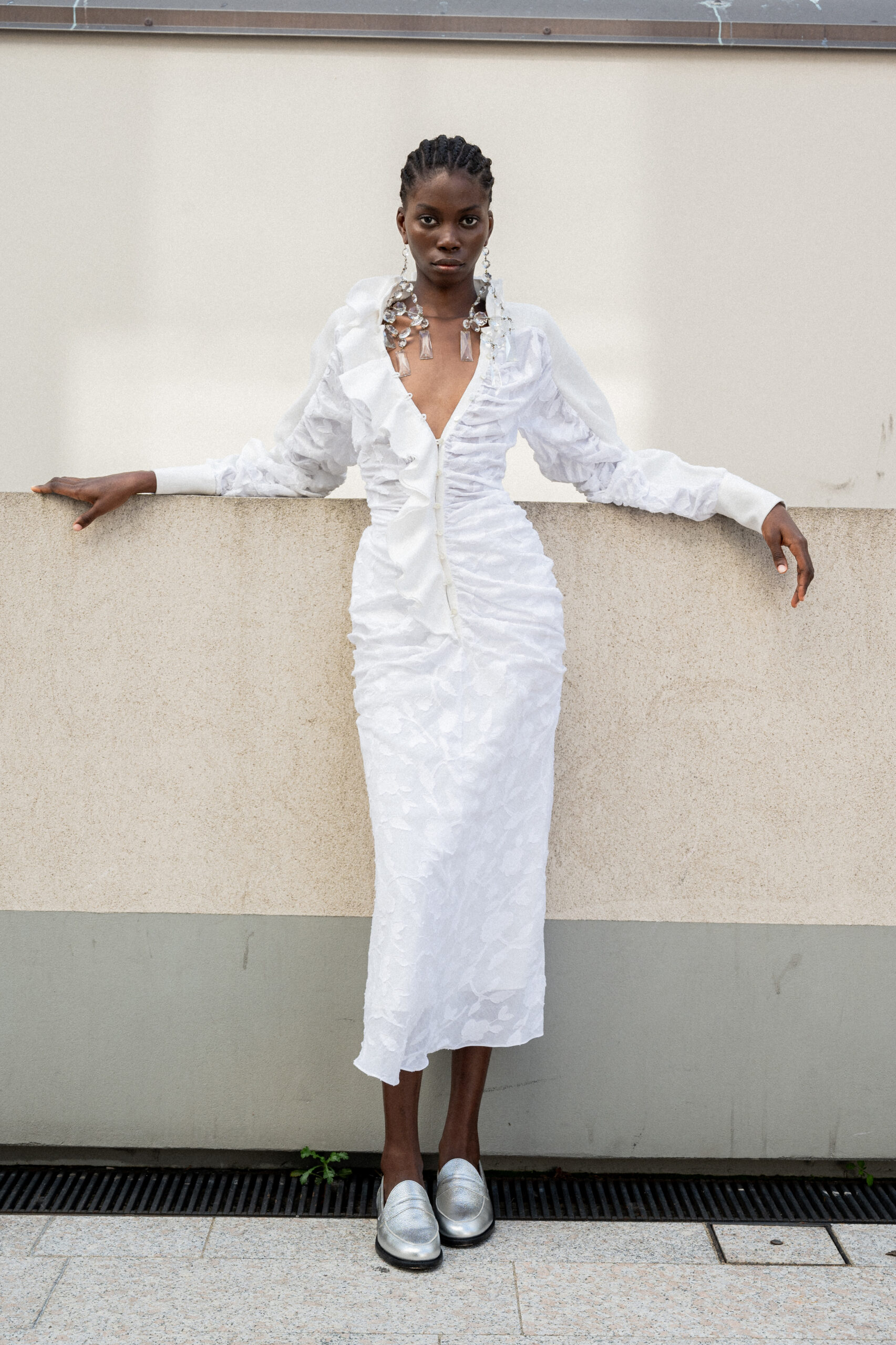 Le soie froissée, lavée et enzimée dévoile sa légèreté dans les robes de soirée, grâce à une sélection méticuleuse de fils fins qui confèrent un éclat intemporel. Le taffetas de soie soutient les jointures, enveloppant les pétales et se combine harmonieusement avec la jute effilochée, créant des vagues de disparité conceptuelle. Le fil coupé de soie-lin floral s’adapte au corps avec des drapés froissés qui semblent transporter le porteur dans une autre époque, évoquant des héroïnes glaciales en croisière sur le Nil au milieu de dunes ésotériques ensoleillées, en quête de mystères inexpliqués.