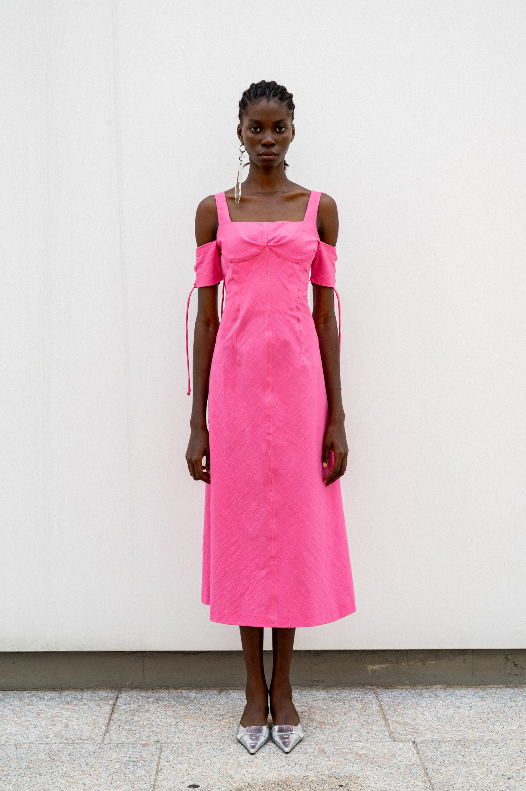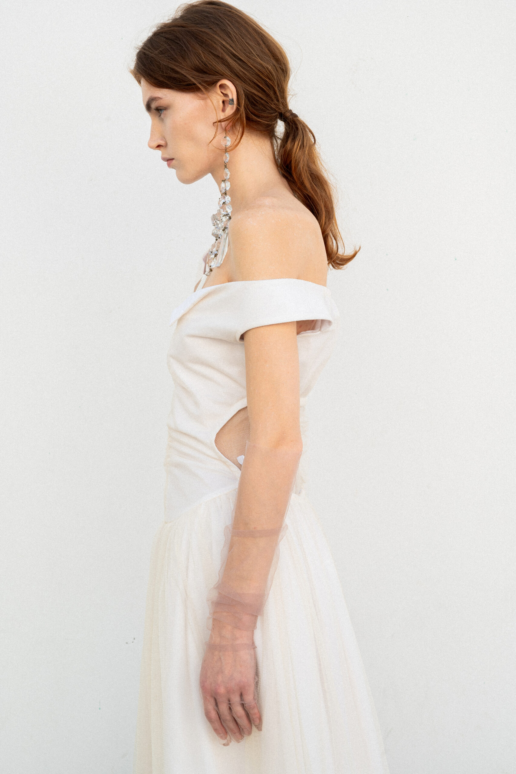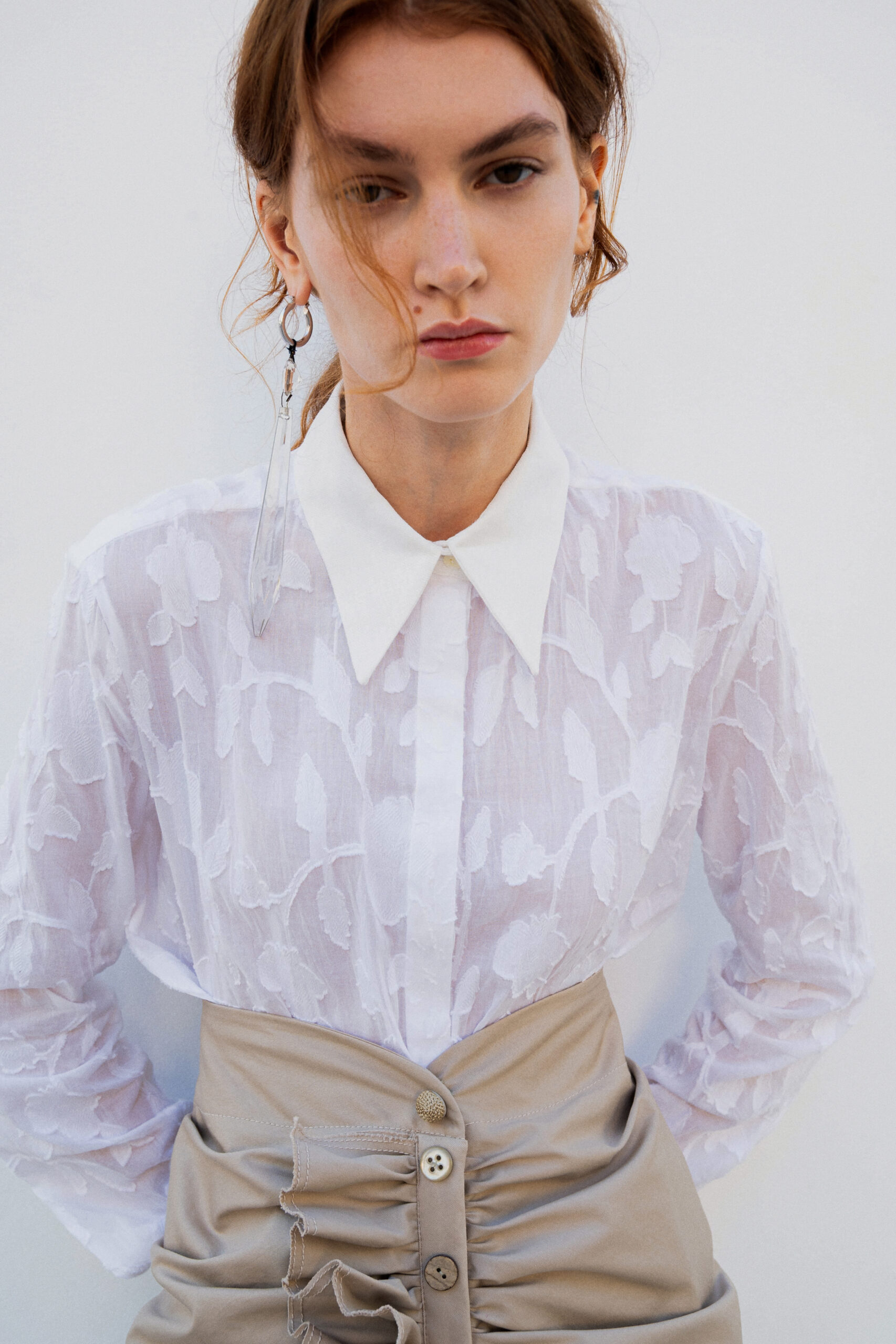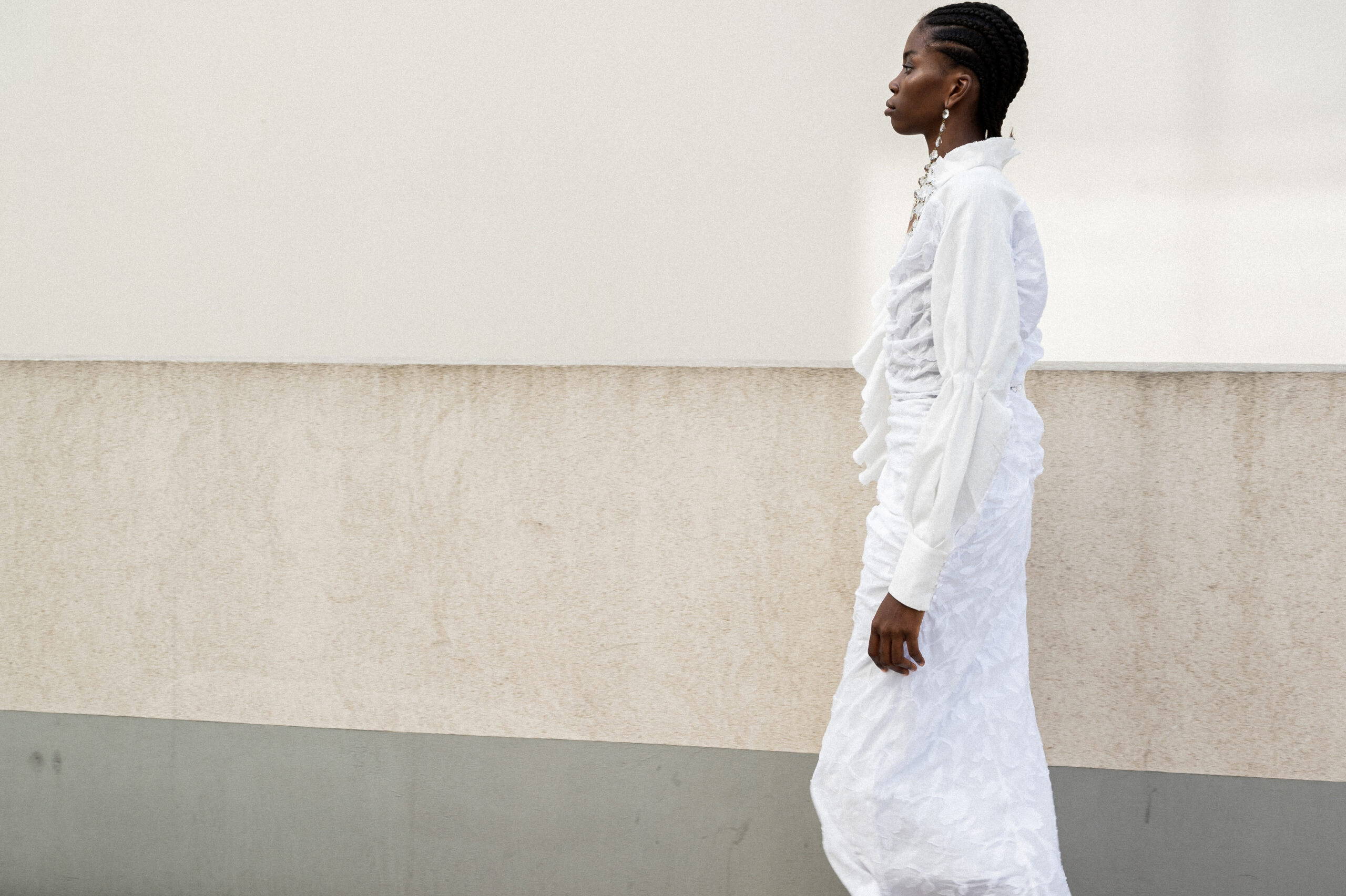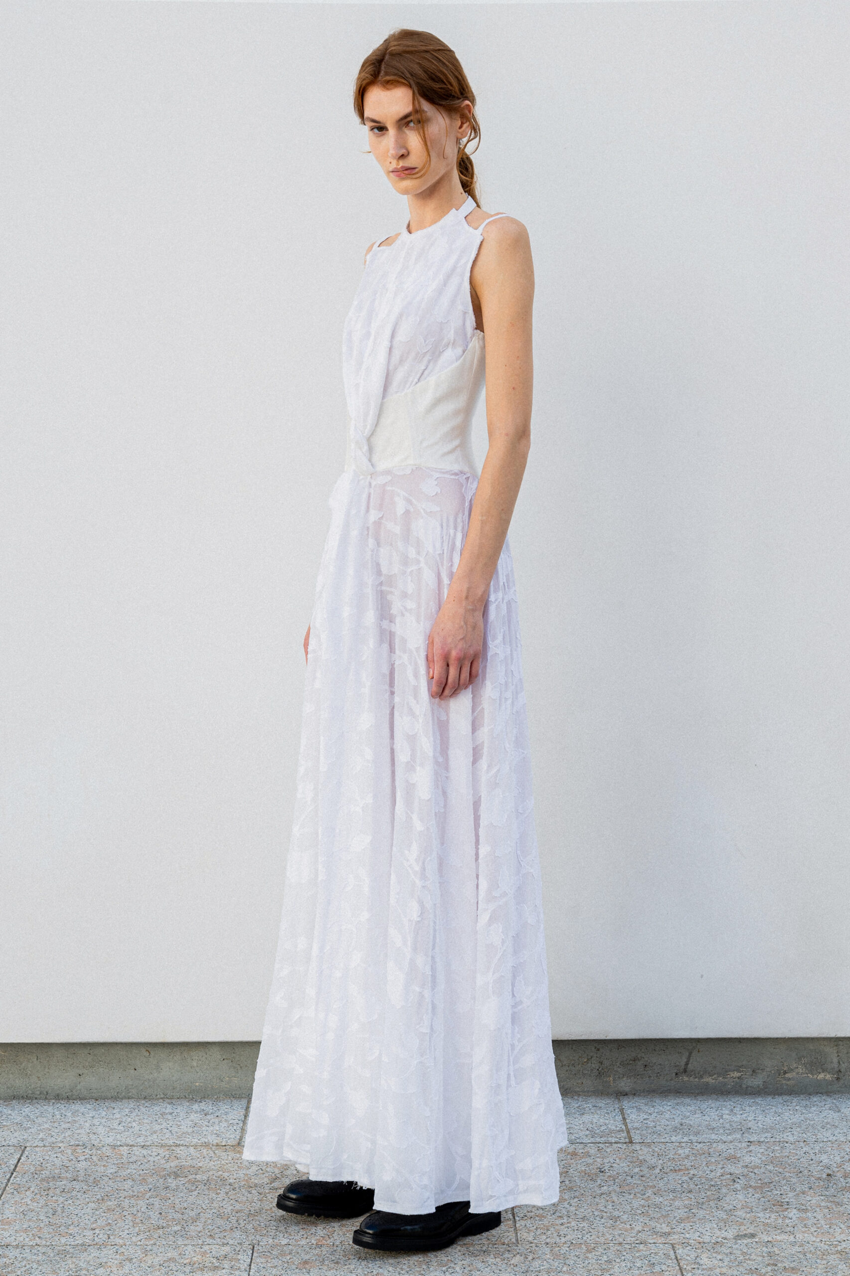 Le soie froissée, lavée et enzimée dévoile sa légèreté dans les robes de soirée, grâce à une sélection méticuleuse de fils fins qui confèrent un éclat intemporel. Le taffetas de soie soutient les jointures, enveloppant les pétales et se combine harmonieusement avec la jute effilochée, créant des vagues de disparité conceptuelle. Le fil coupé de soie-lin floral s’adapte au corps avec des drapés froissés qui semblent transporter le porteur dans une autre époque, évoquant des héroïnes glaciales en croisière sur le Nil au milieu de dunes ésotériques ensoleillées, en quête de mystères inexpliqués.