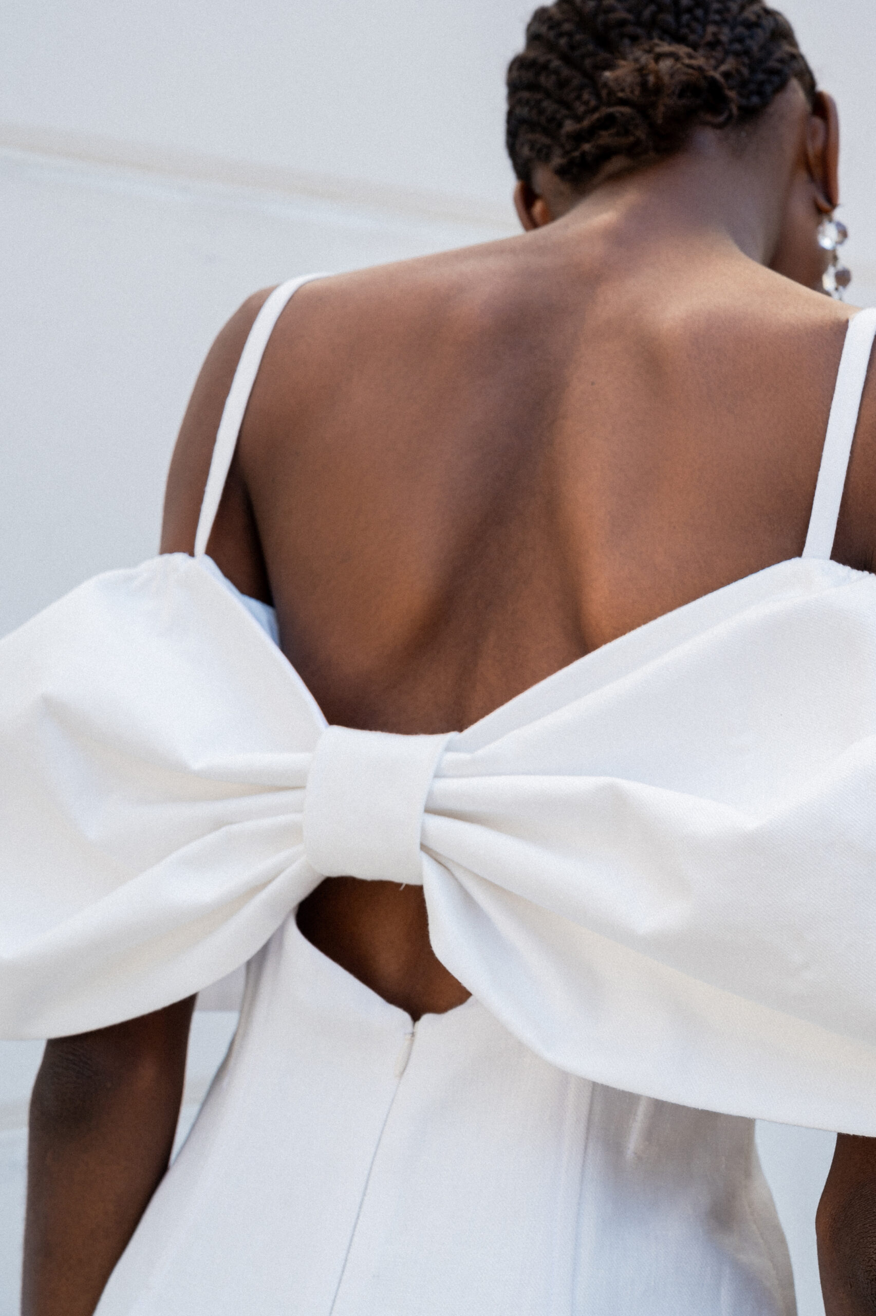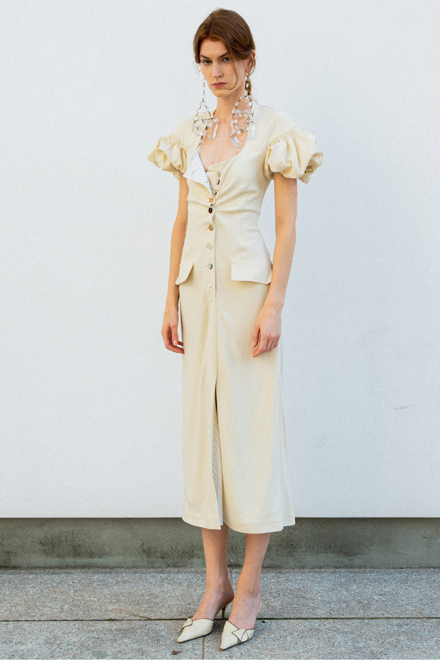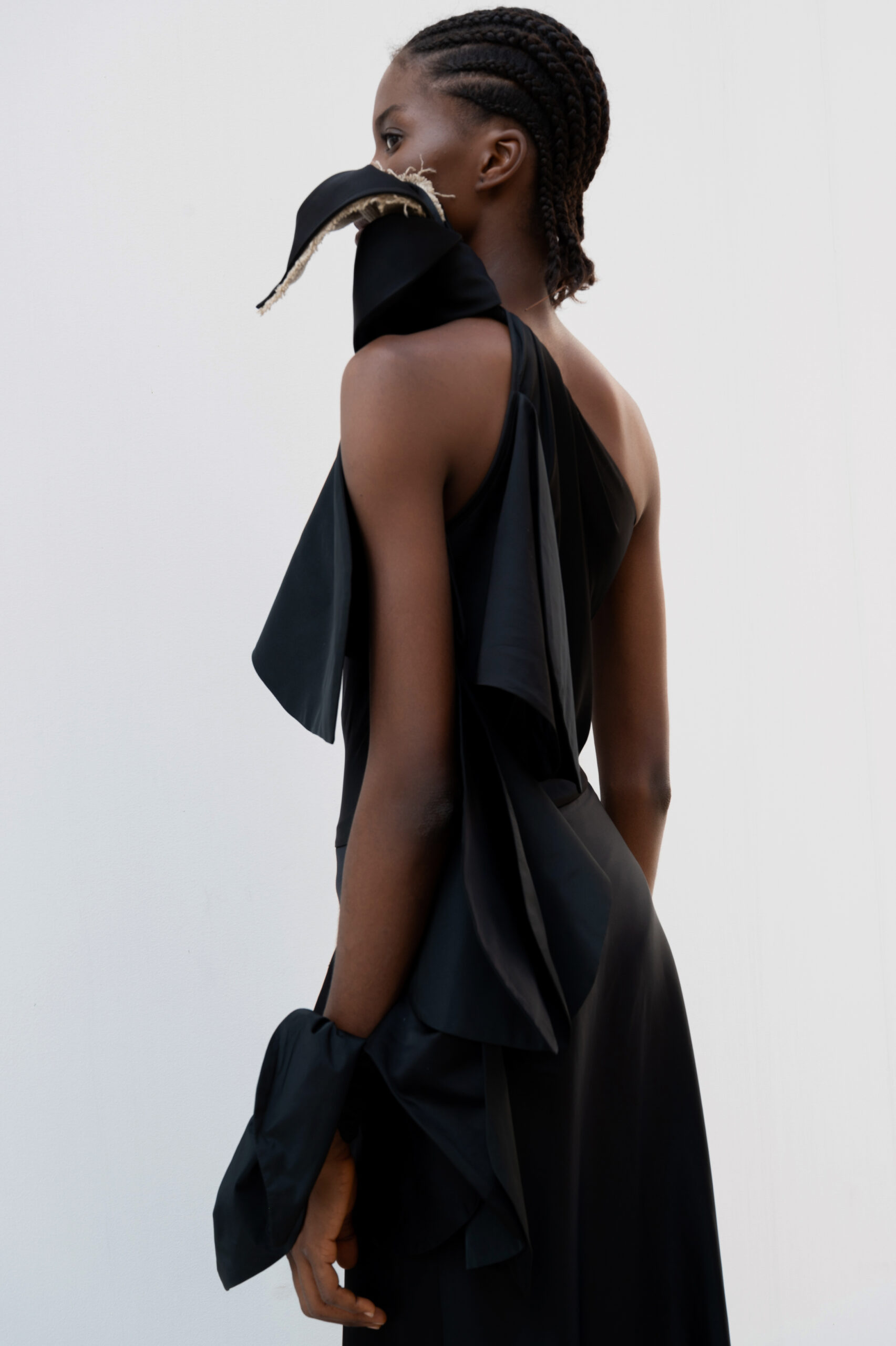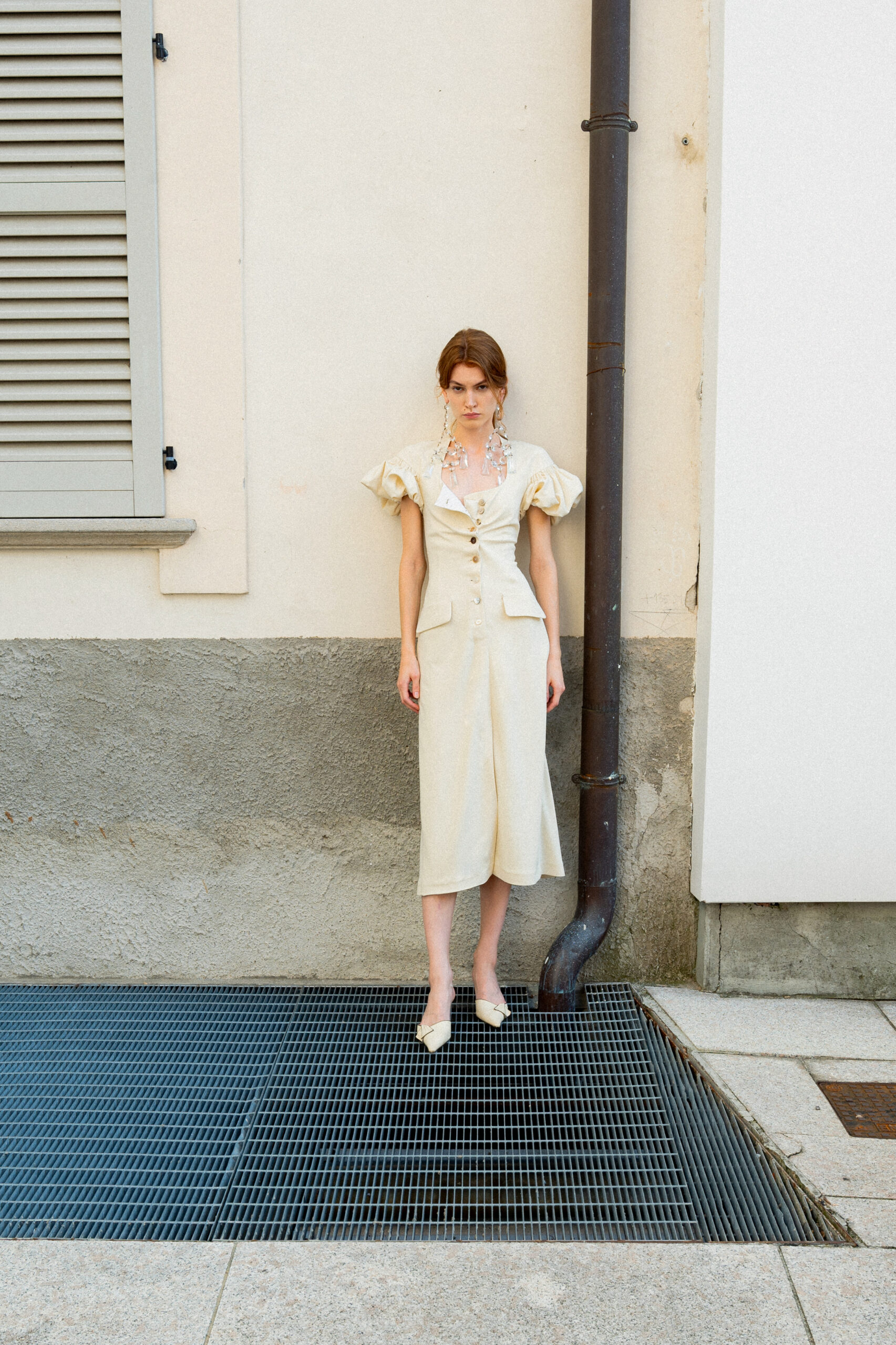 L’obsession du détail est évidente dans chaque pièce de Romeo Gigli, avec des doublures en taffetas de soie souvent ornées de boutons antiques récupérés d’époques révolues. Des surprises arcanes se cachent au dos des robes en coton et satin de soie, où les nœuds se transforment en manches, soutenus par des baleines de corset.