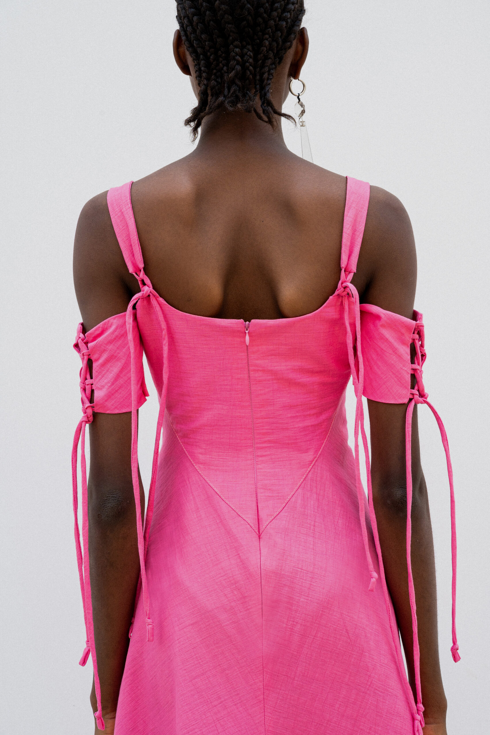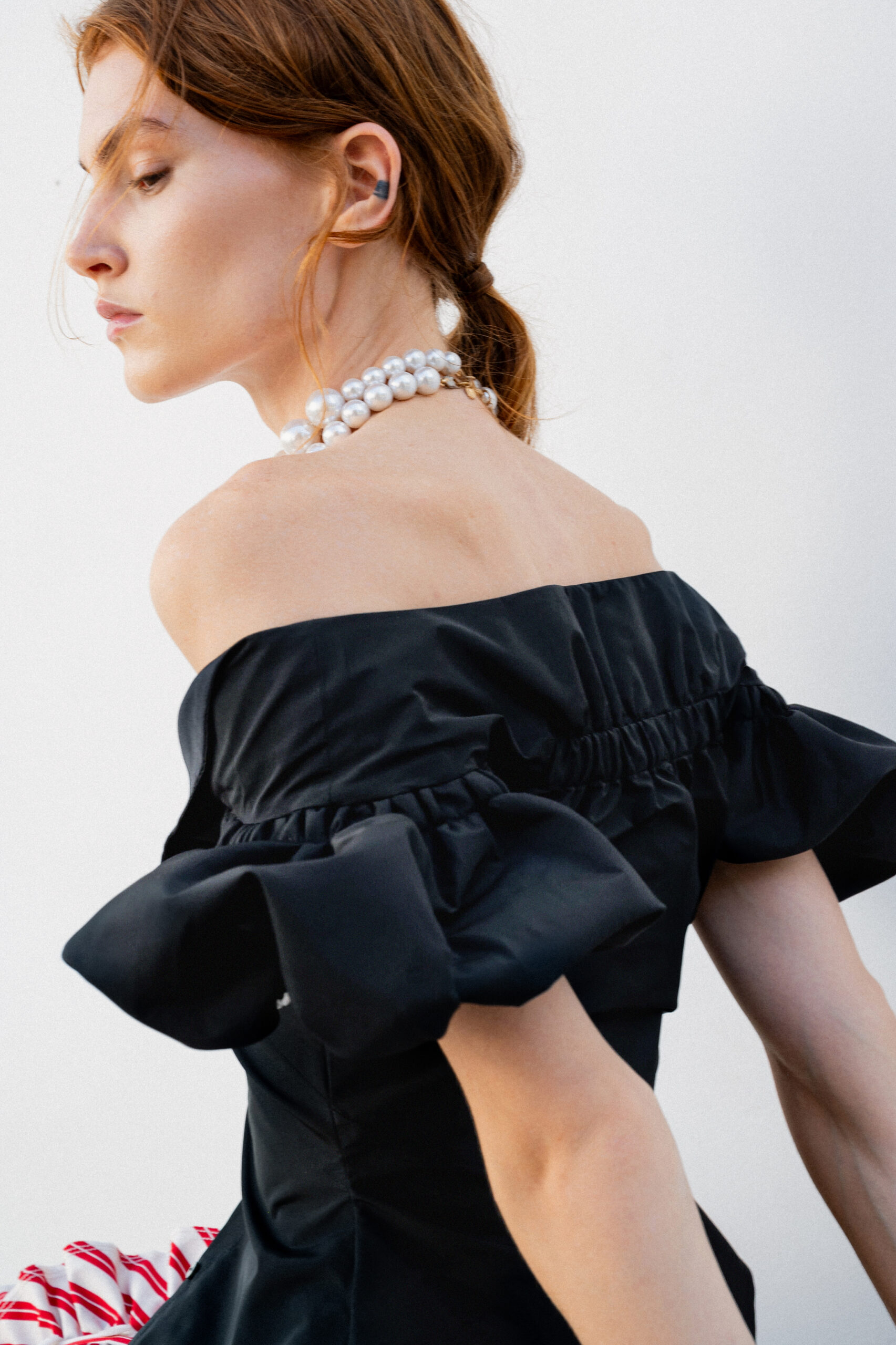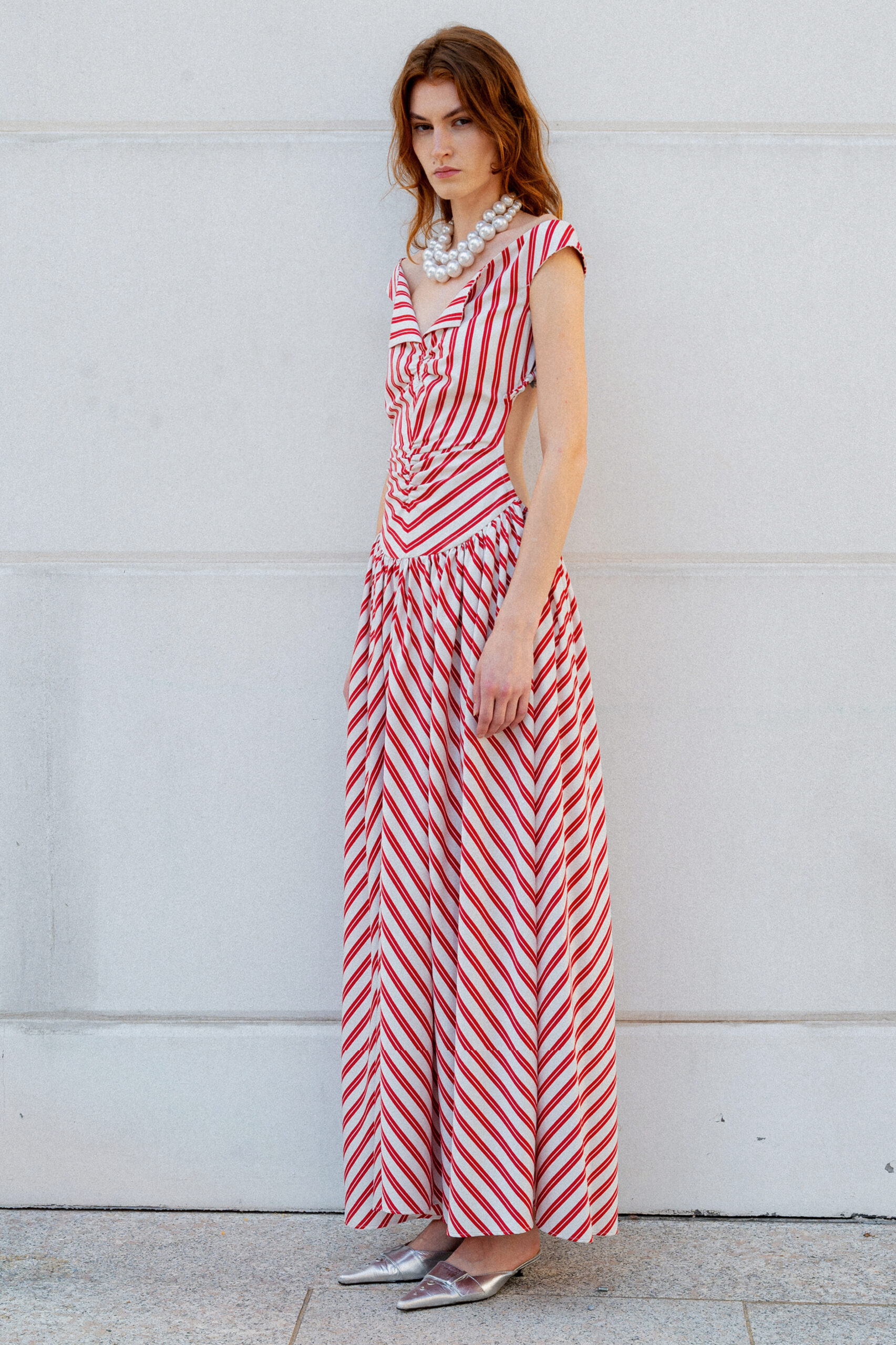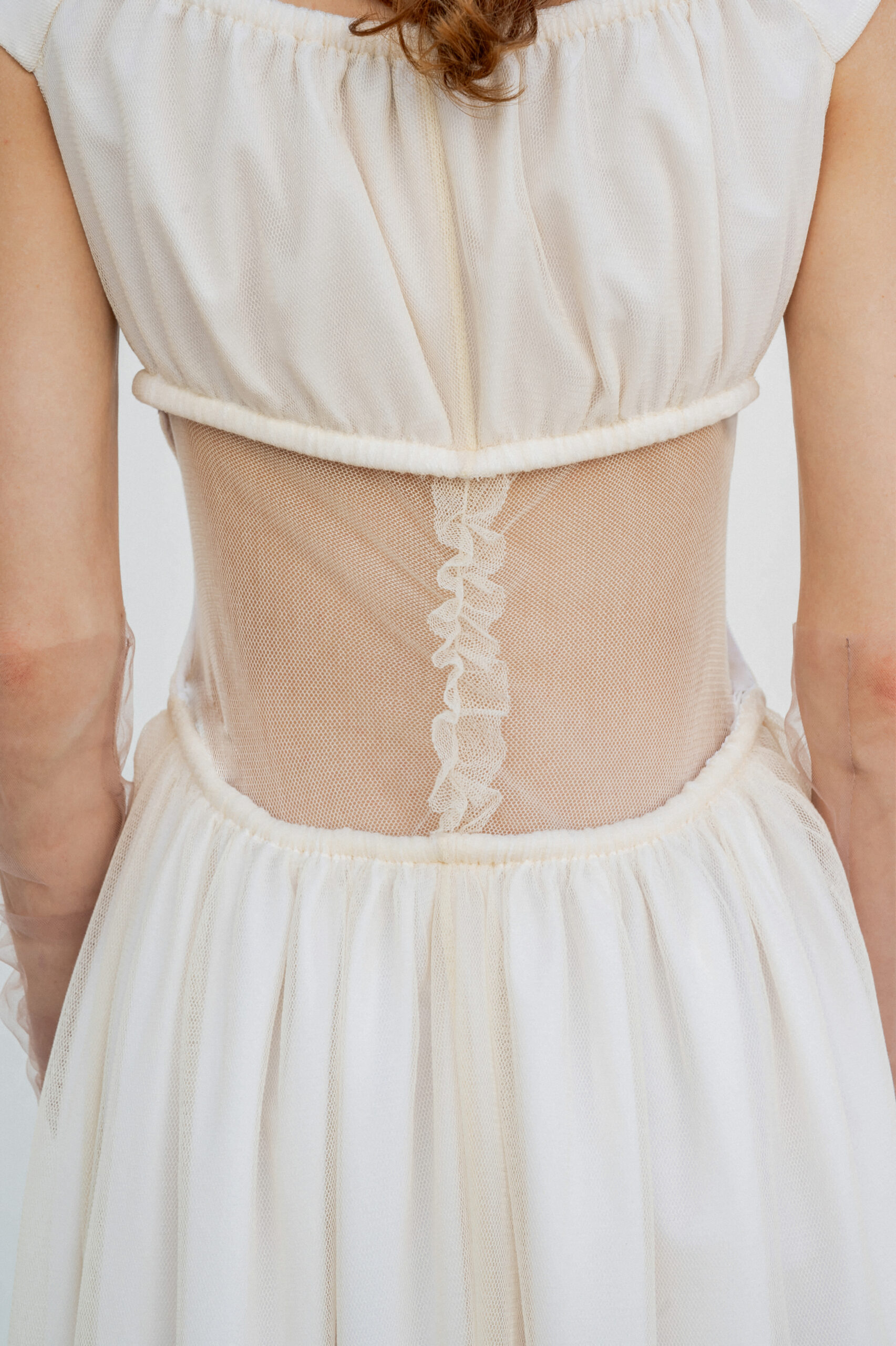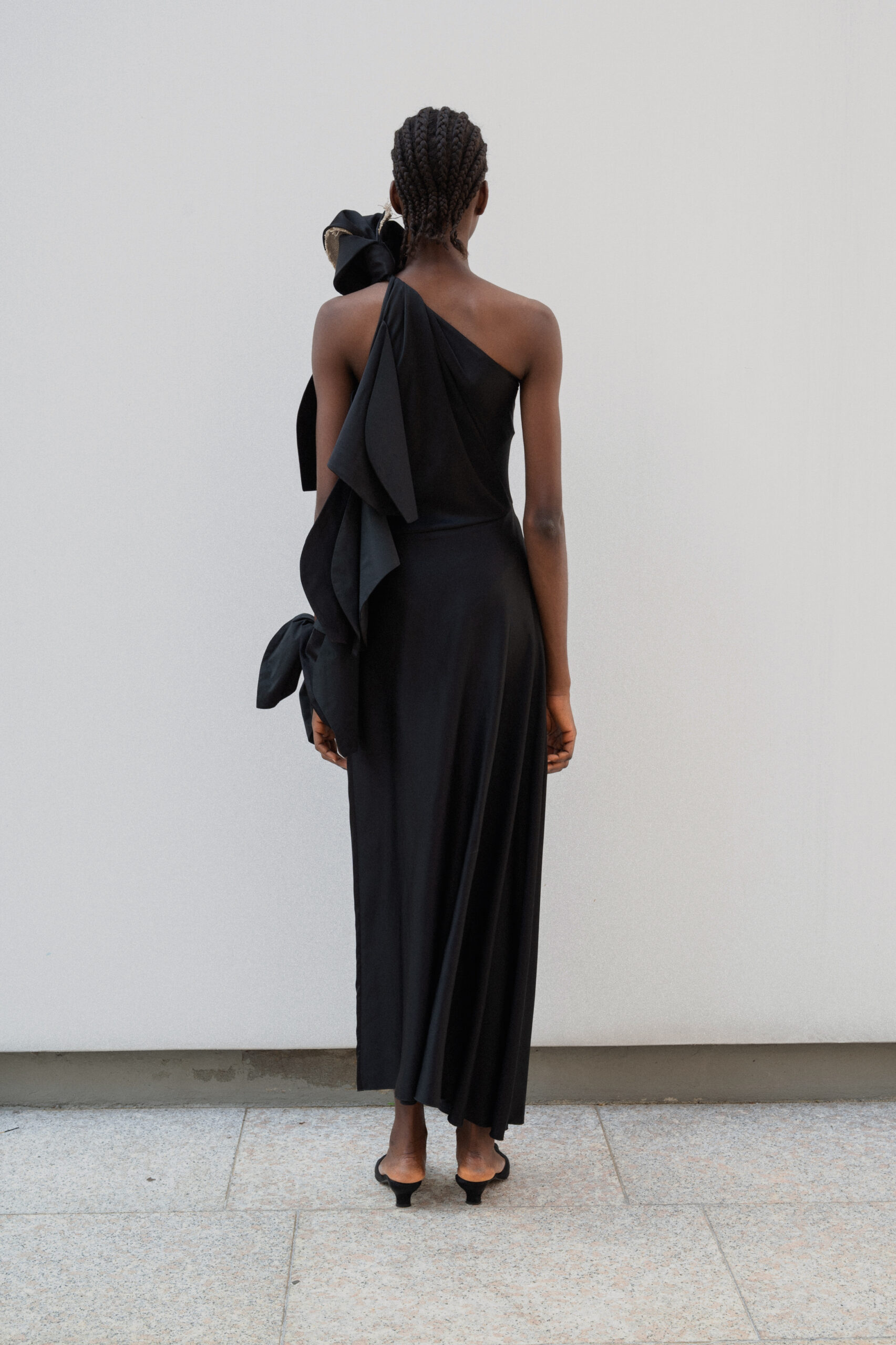 L’obsession du détail est évidente dans chaque pièce de Romeo Gigli, avec des doublures en taffetas de soie souvent ornées de boutons antiques récupérés d’époques révolues. Des surprises arcanes se cachent au dos des robes en coton et satin de soie, où les nœuds se transforment en manches, soutenus par des baleines de corset.