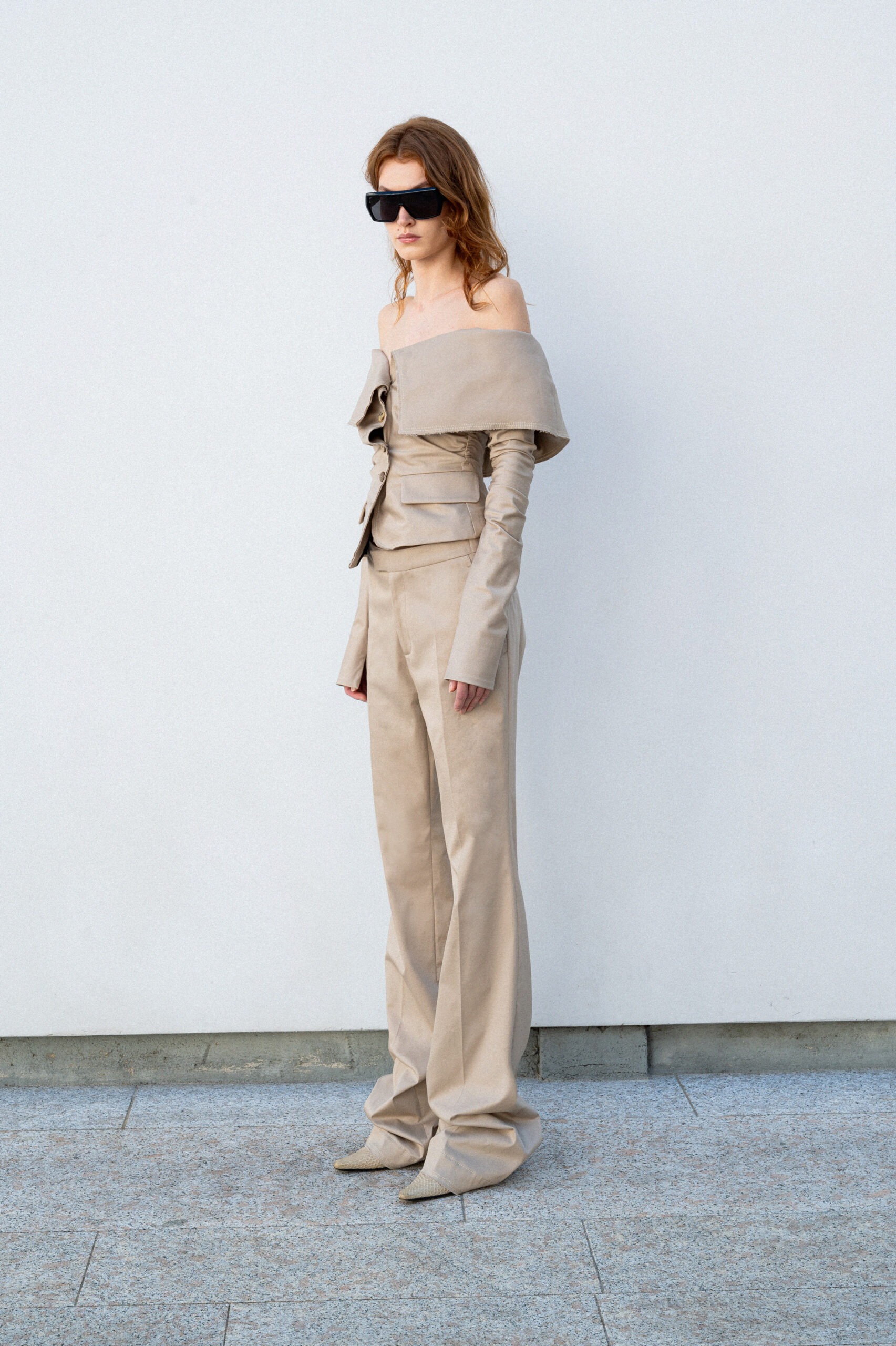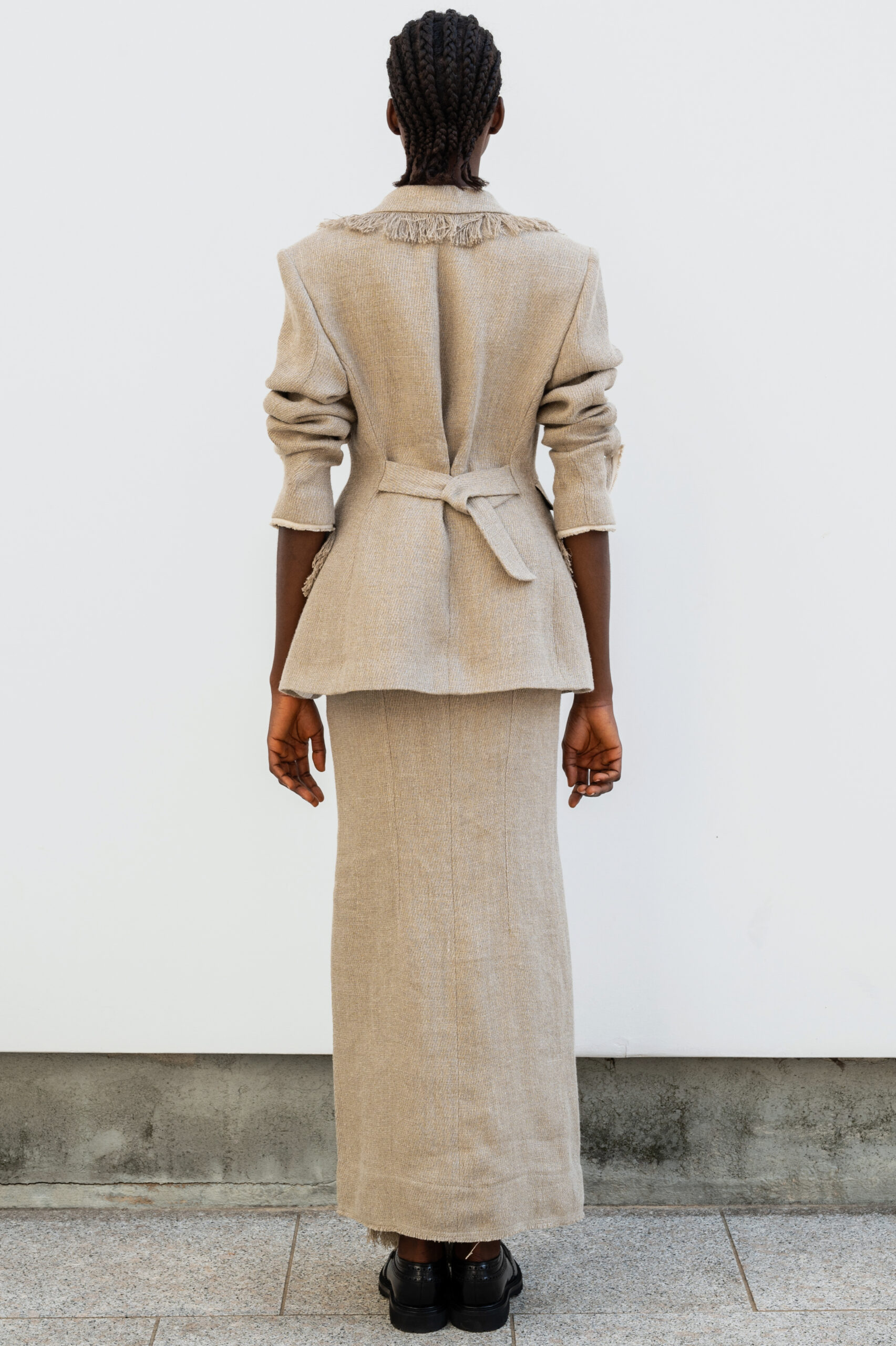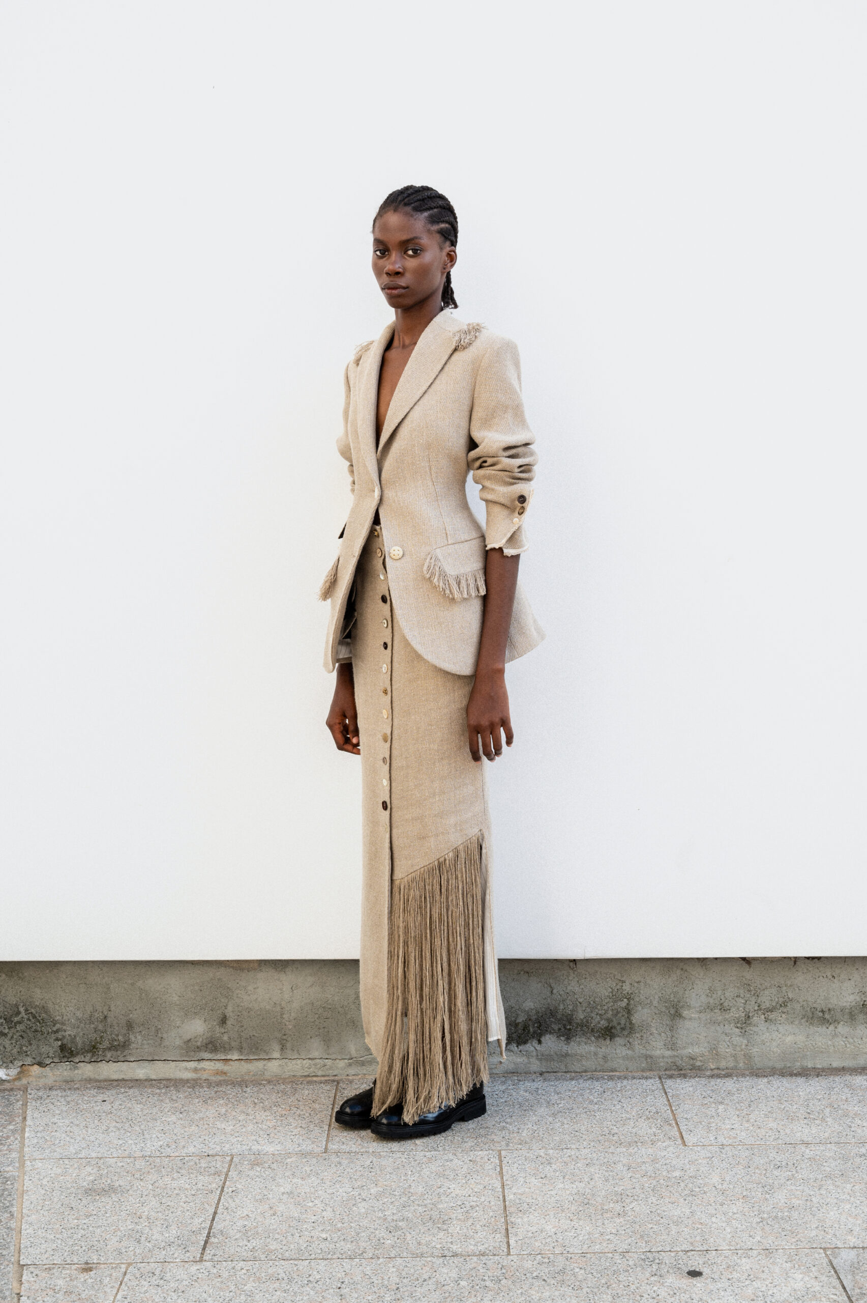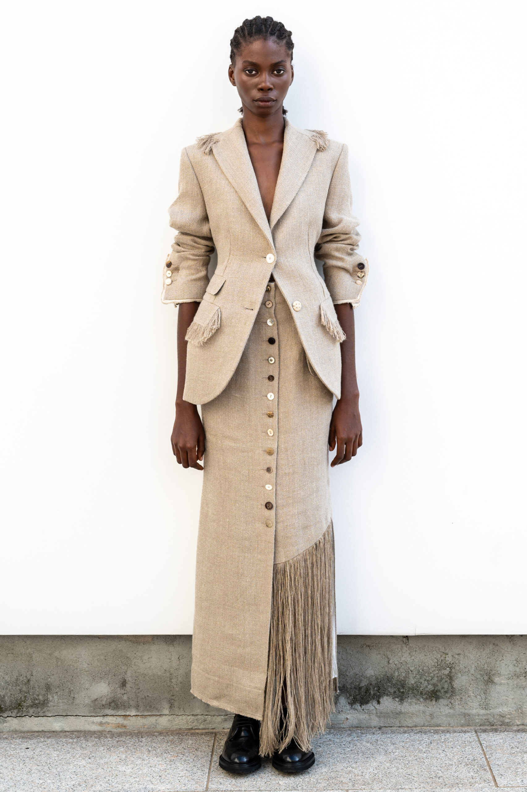 La construction unique de la veste inversée, signe mystérieux cher au maître dans les années ’90, est réinterprétée sous forme de bustier à volants qui met en valeur les épaules. Les vêtements en jute et soie, formés directement sur les mannequins à travers des rituels druidiques, se transforment en franges surréalistes, tissées de fils précieux qui s’entrelacent comme des sortilèges. Le tailleur en chanvre avec inserts pyramidales découpées est complété par la longue jupe boutonnée, évoquant l’élégance des héroïnes en croisière sur le Nil en quête de mystères non résolus.