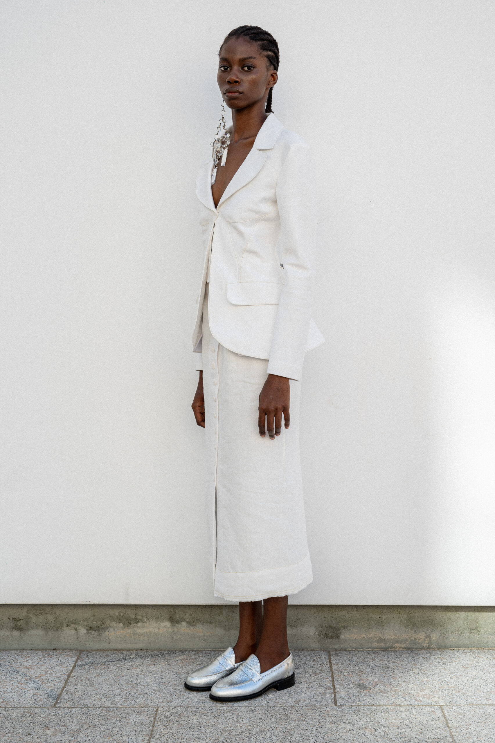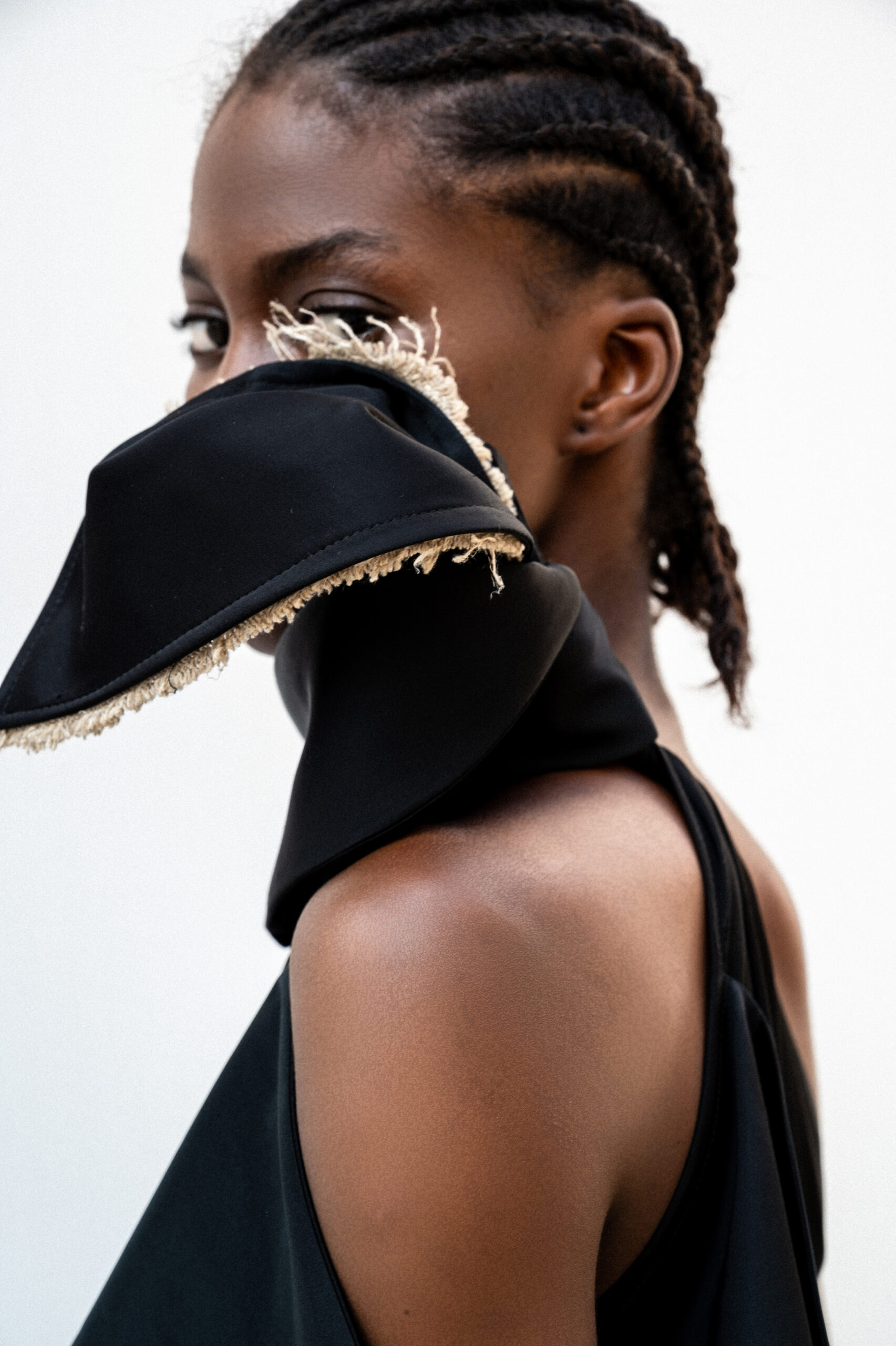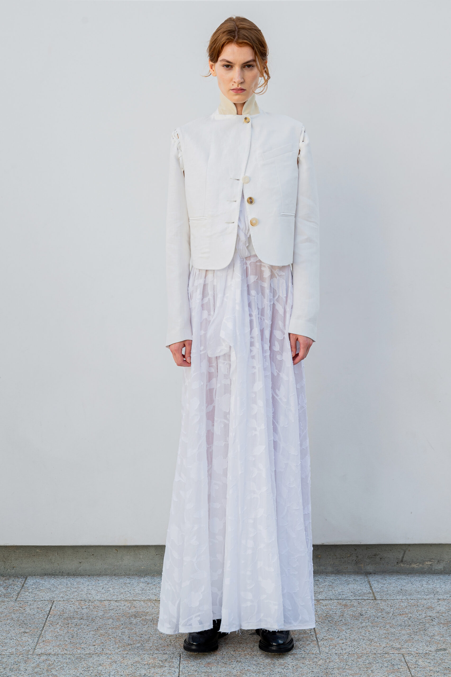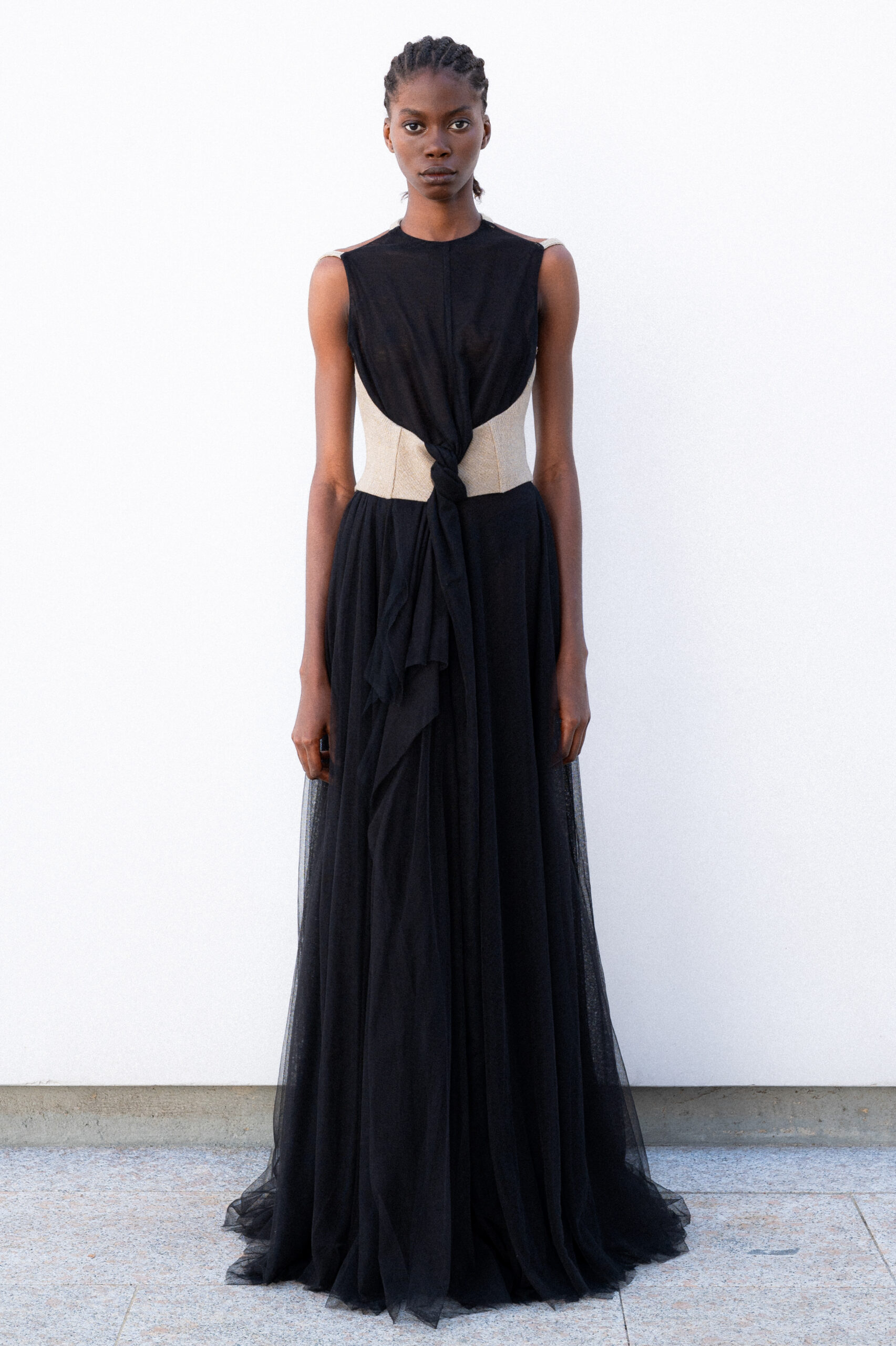 La construction unique de la veste inversée, signe mystérieux cher au maître dans les années ’90, est réinterprétée sous forme de bustier à volants qui met en valeur les épaules. Les vêtements en jute et soie, formés directement sur les mannequins à travers des rituels druidiques, se transforment en franges surréalistes, tissées de fils précieux qui s’entrelacent comme des sortilèges. Le tailleur en chanvre avec inserts pyramidales découpées est complété par la longue jupe boutonnée, évoquant l’élégance des héroïnes en croisière sur le Nil en quête de mystères non résolus.