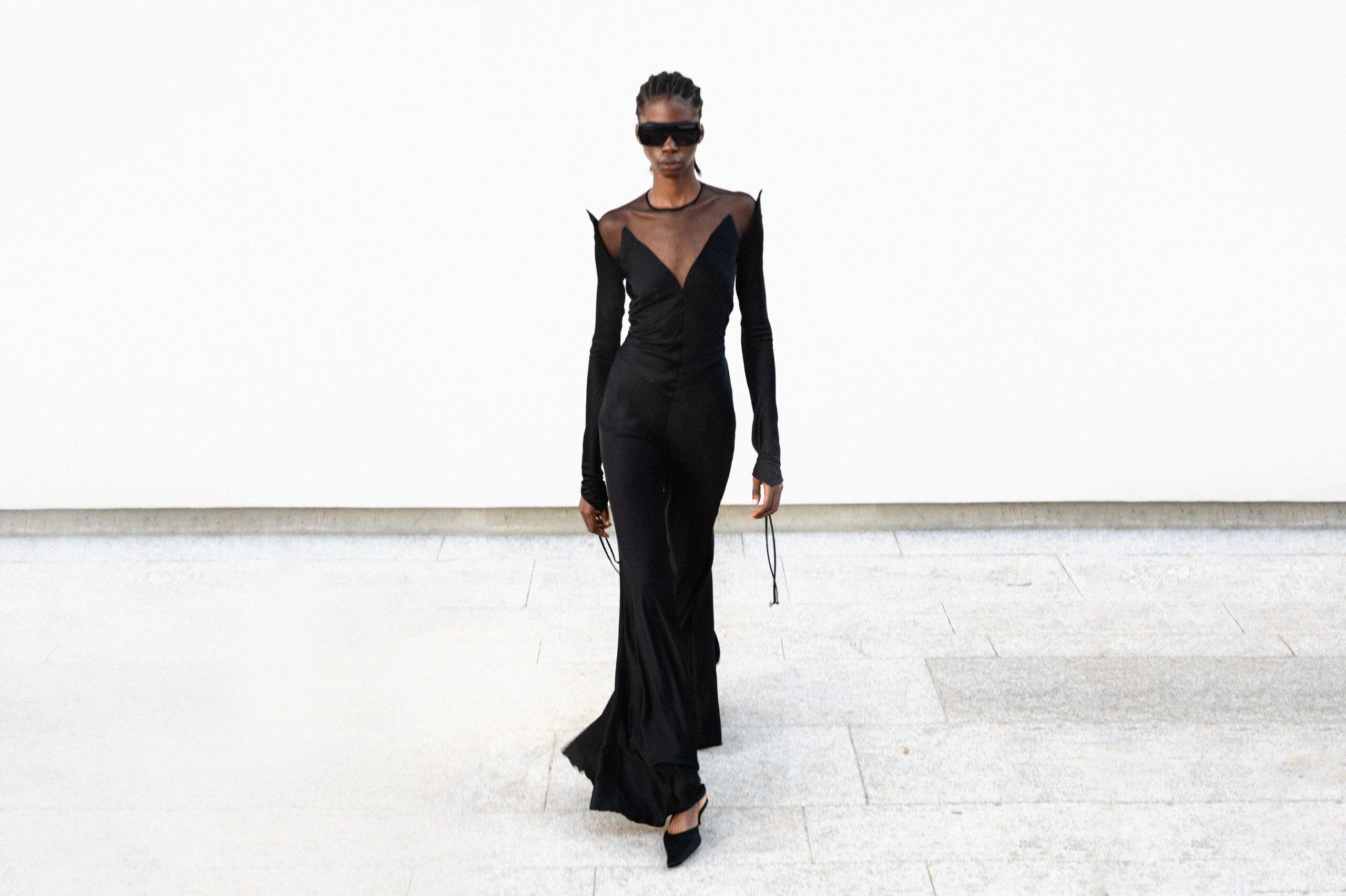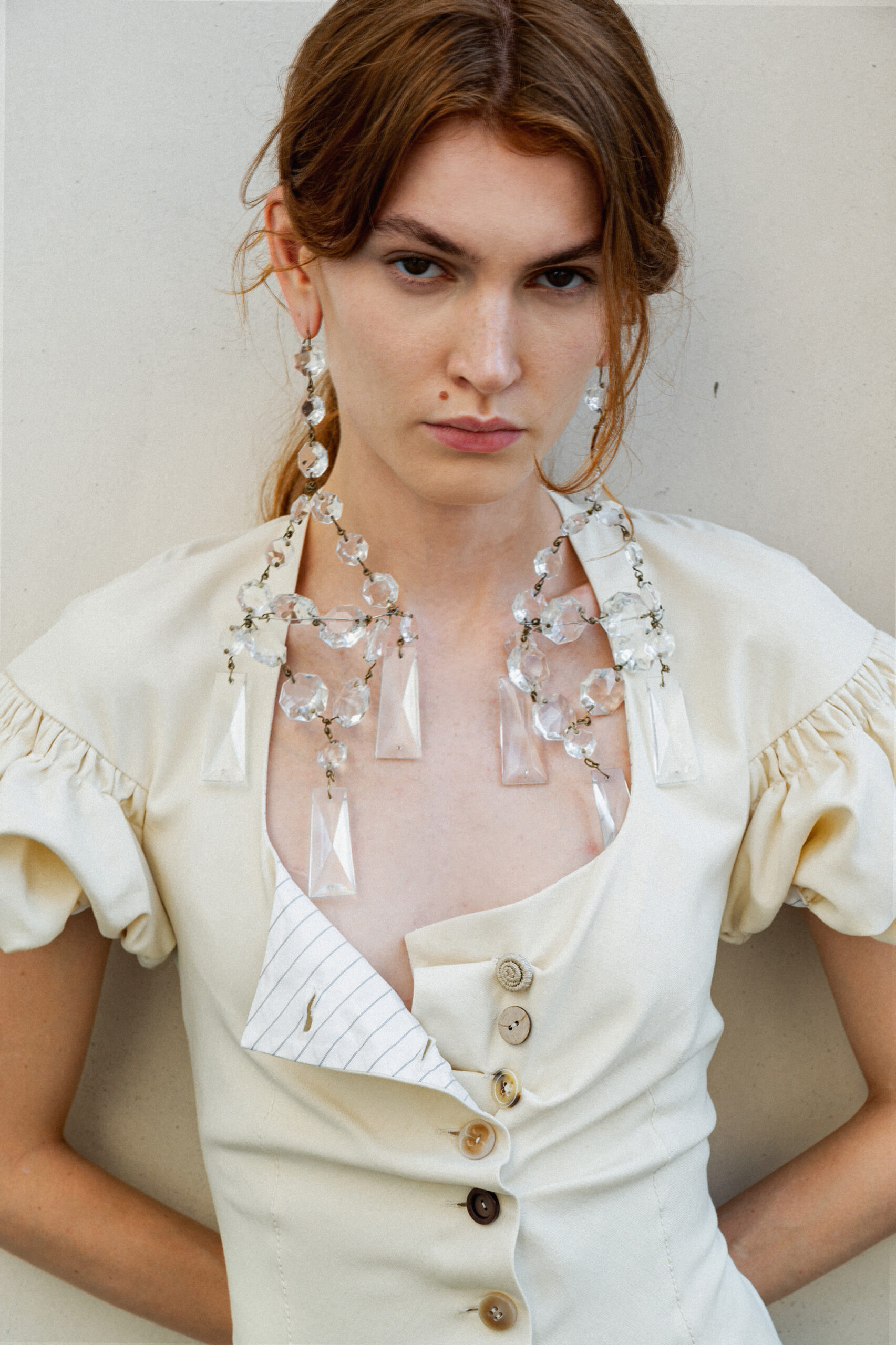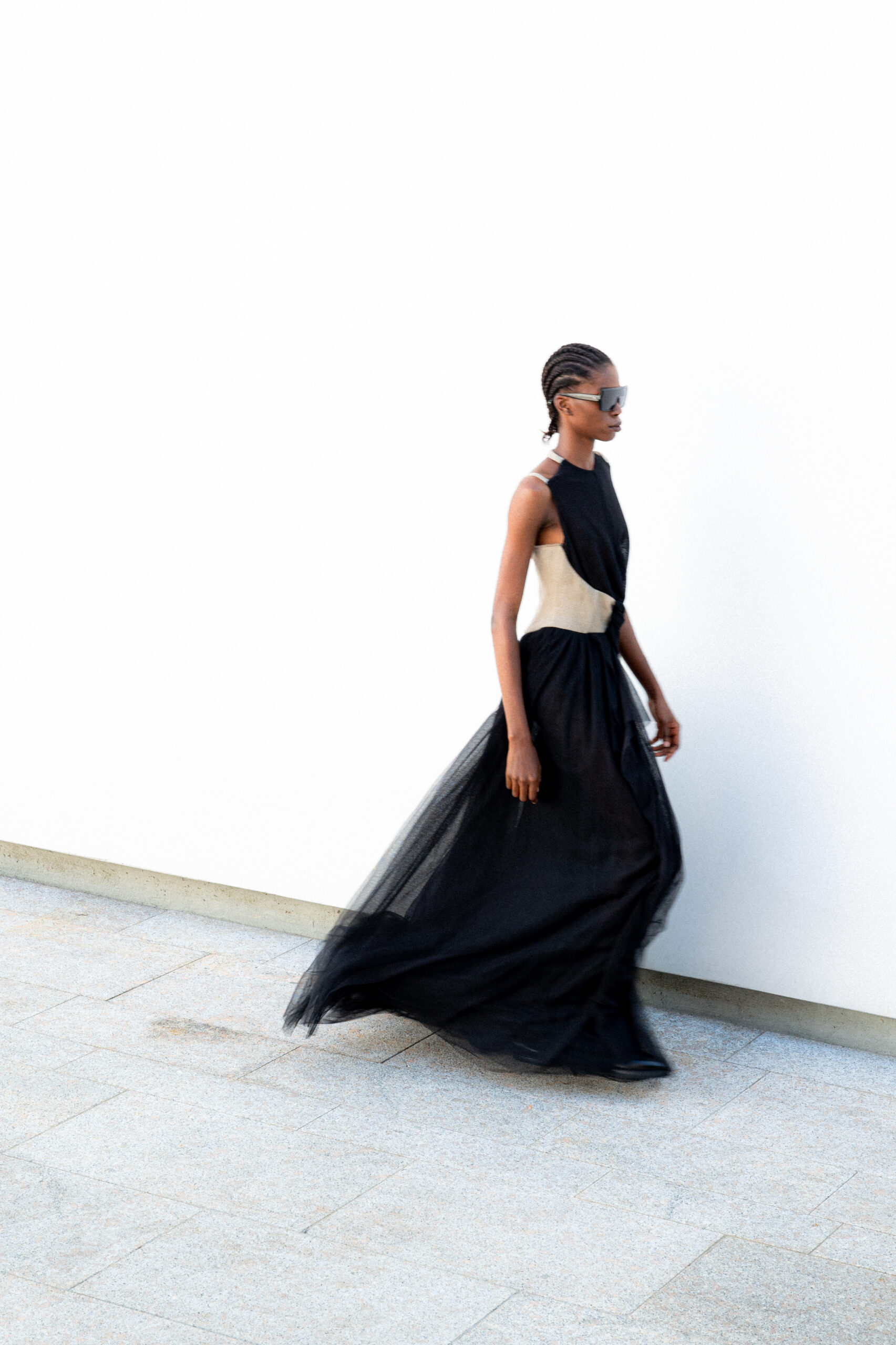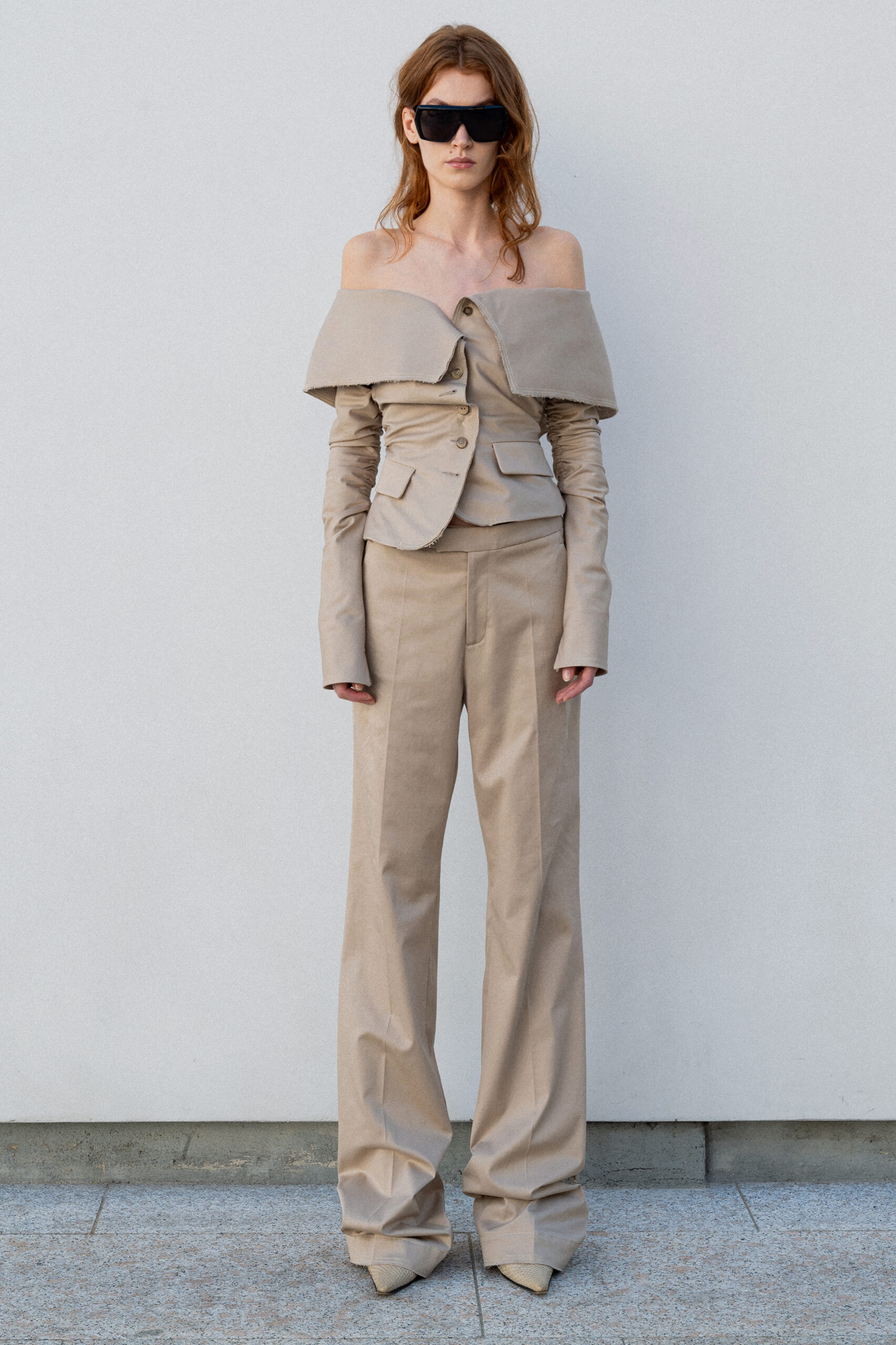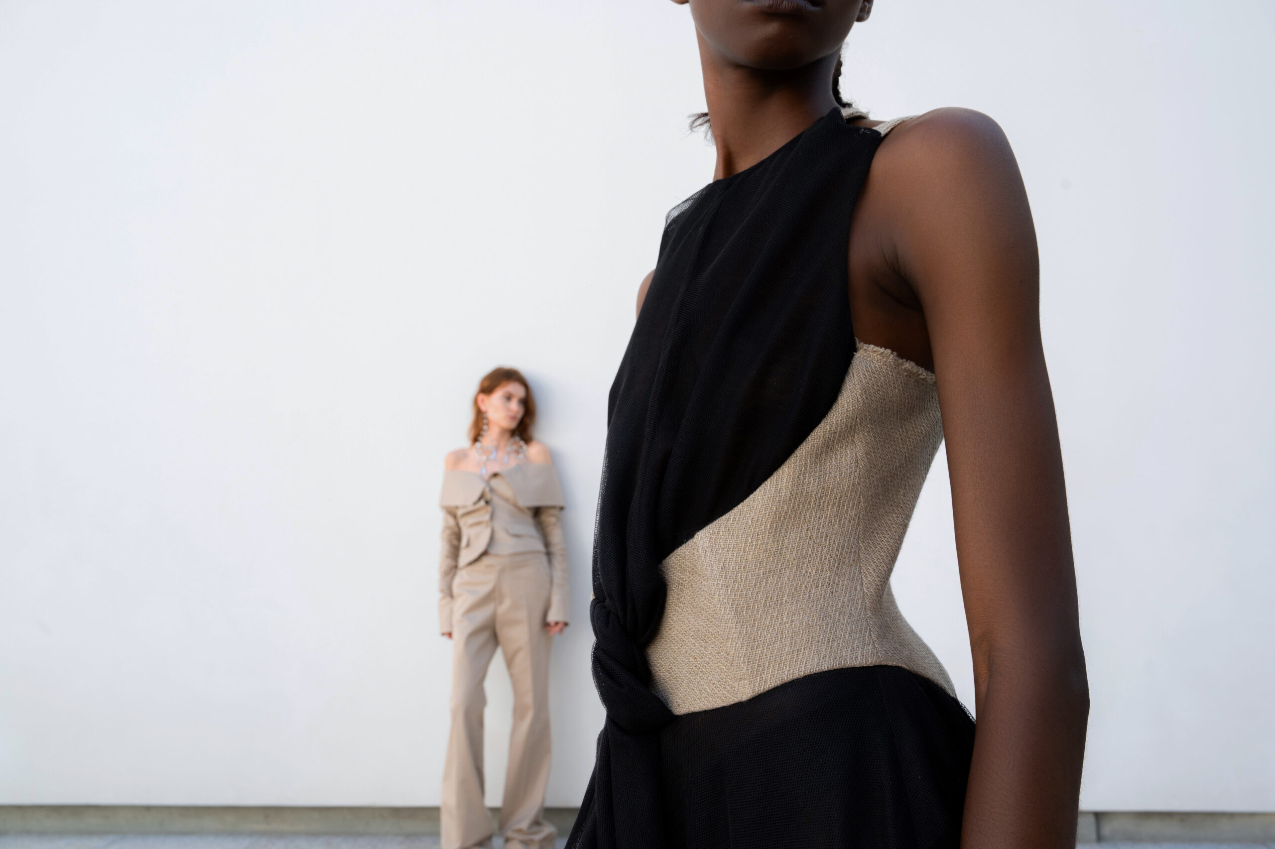 La construction unique de la veste inversée, signe mystérieux cher au maître dans les années ’90, est réinterprétée sous forme de bustier à volants qui met en valeur les épaules. Les vêtements en jute et soie, formés directement sur les mannequins à travers des rituels druidiques, se transforment en franges surréalistes, tissées de fils précieux qui s’entrelacent comme des sortilèges. Le tailleur en chanvre avec inserts pyramidales découpées est complété par la longue jupe boutonnée, évoquant l’élégance des héroïnes en croisière sur le Nil en quête de mystères non résolus.