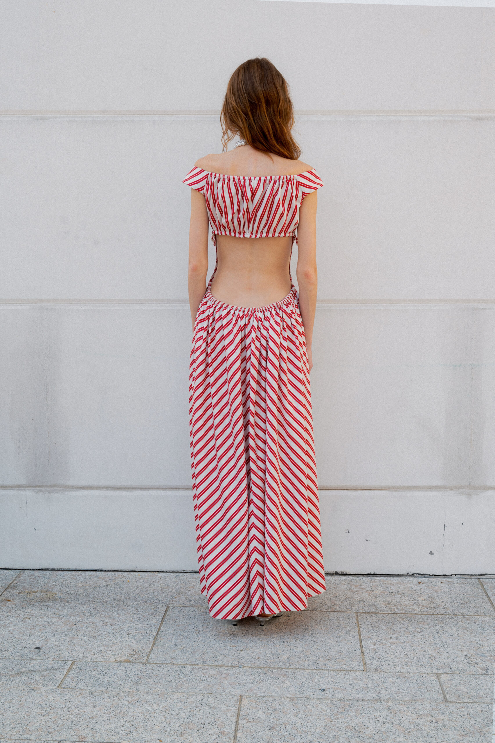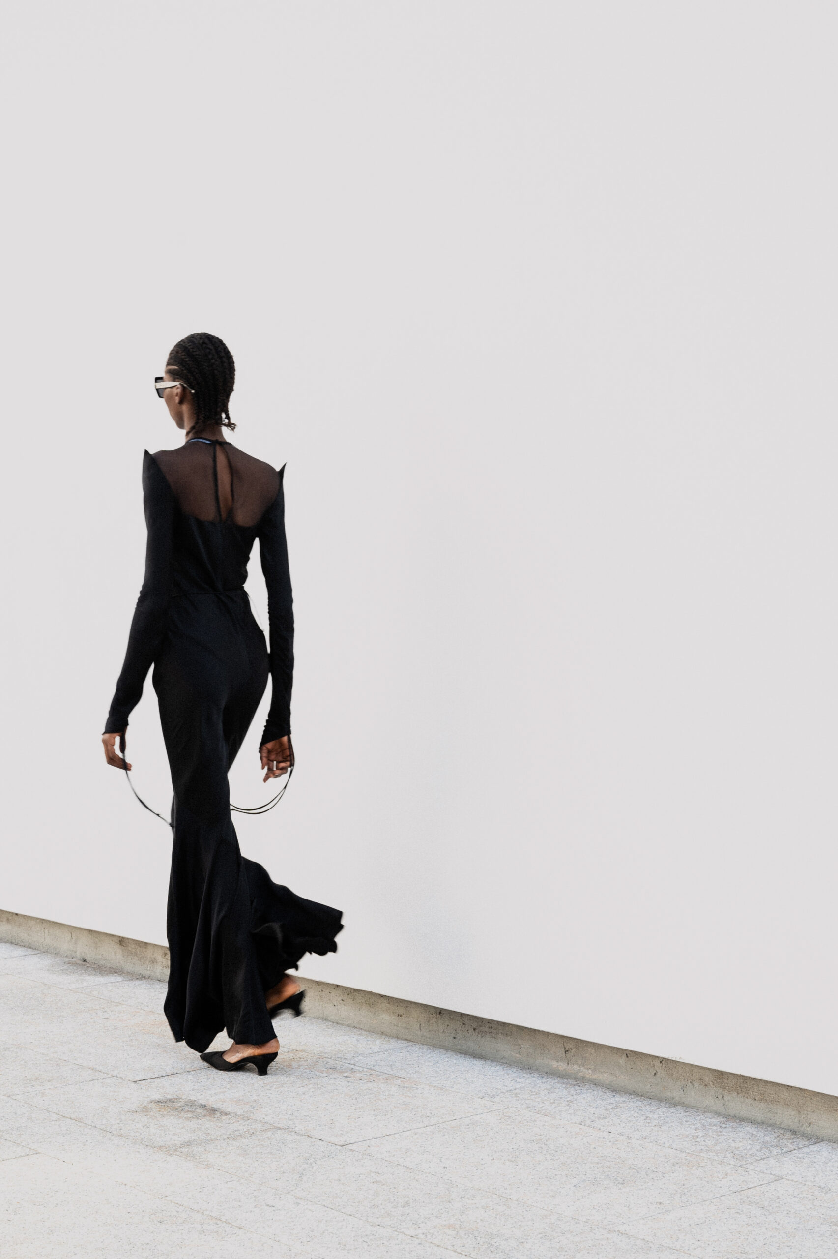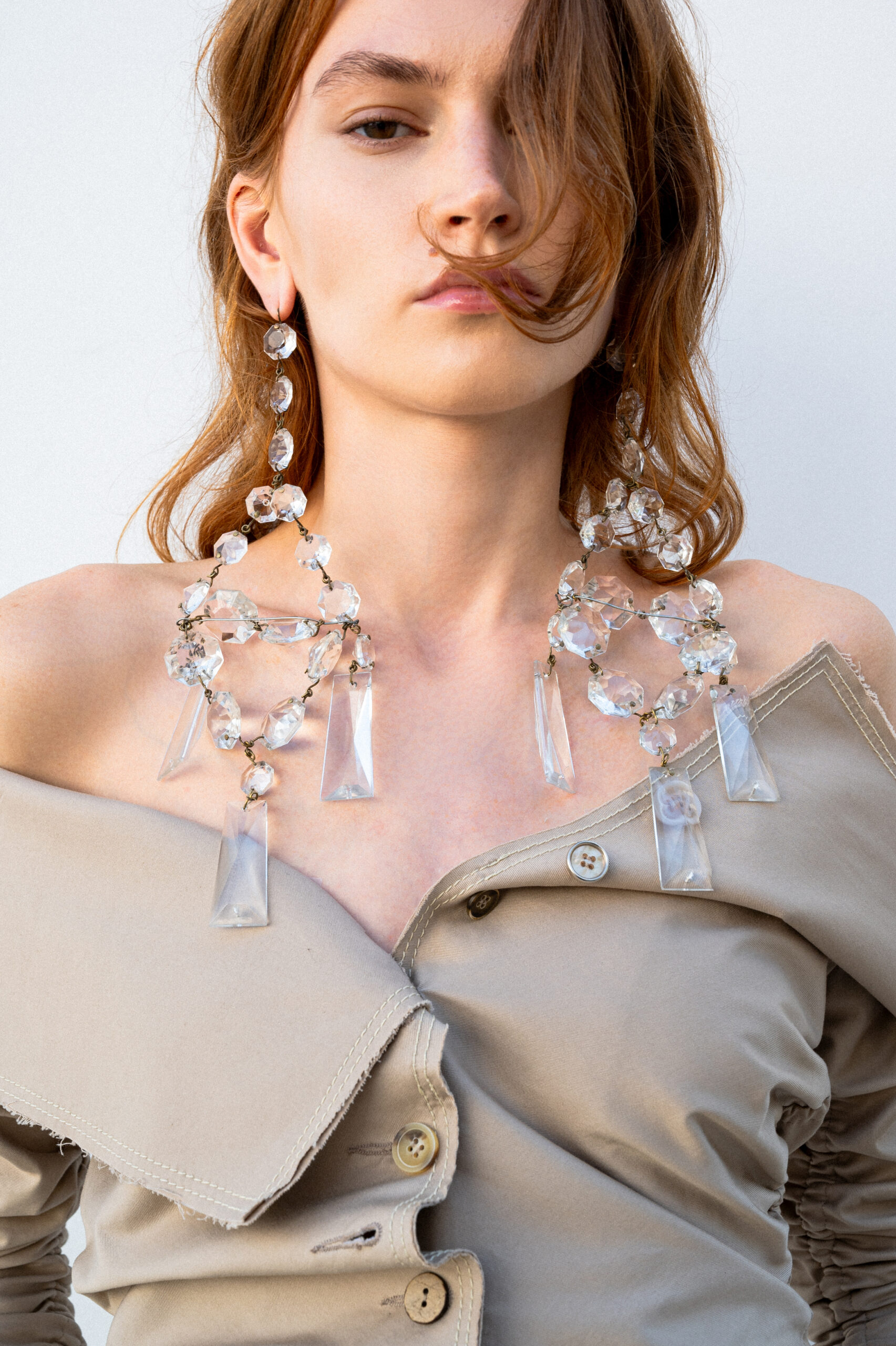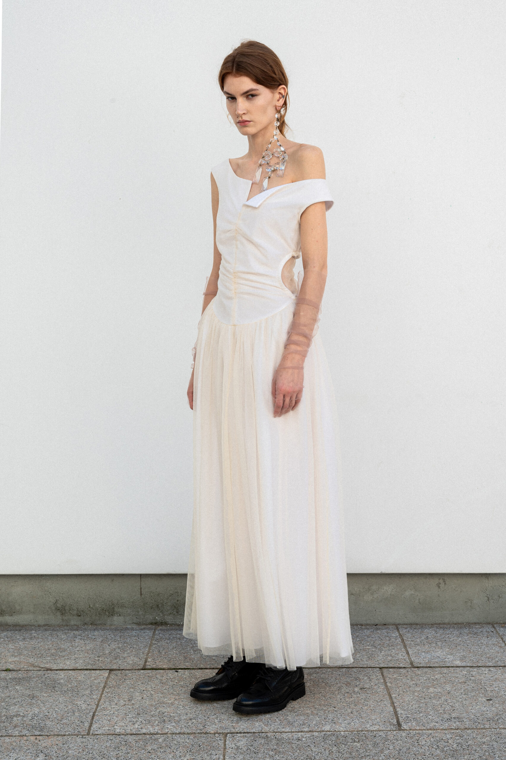 La construction unique de la veste inversée, signe mystérieux cher au maître dans les années ’90, est réinterprétée sous forme de bustier à volants qui met en valeur les épaules. Les vêtements en jute et soie, formés directement sur les mannequins à travers des rituels druidiques, se transforment en franges surréalistes, tissées de fils précieux qui s’entrelacent comme des sortilèges. Le tailleur en chanvre avec inserts pyramidales découpées est complété par la longue jupe boutonnée, évoquant l’élégance des héroïnes en croisière sur le Nil en quête de mystères non résolus.
