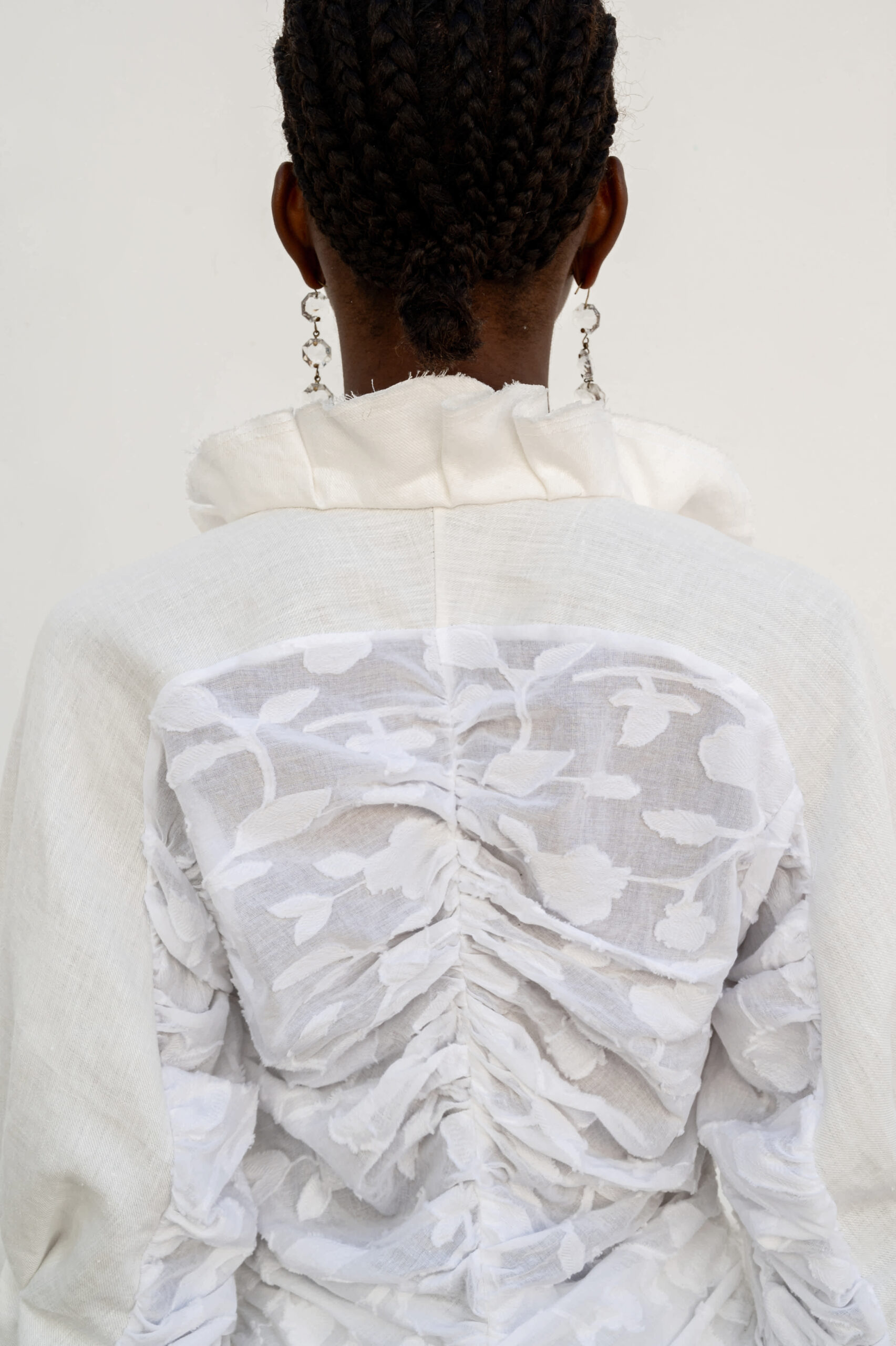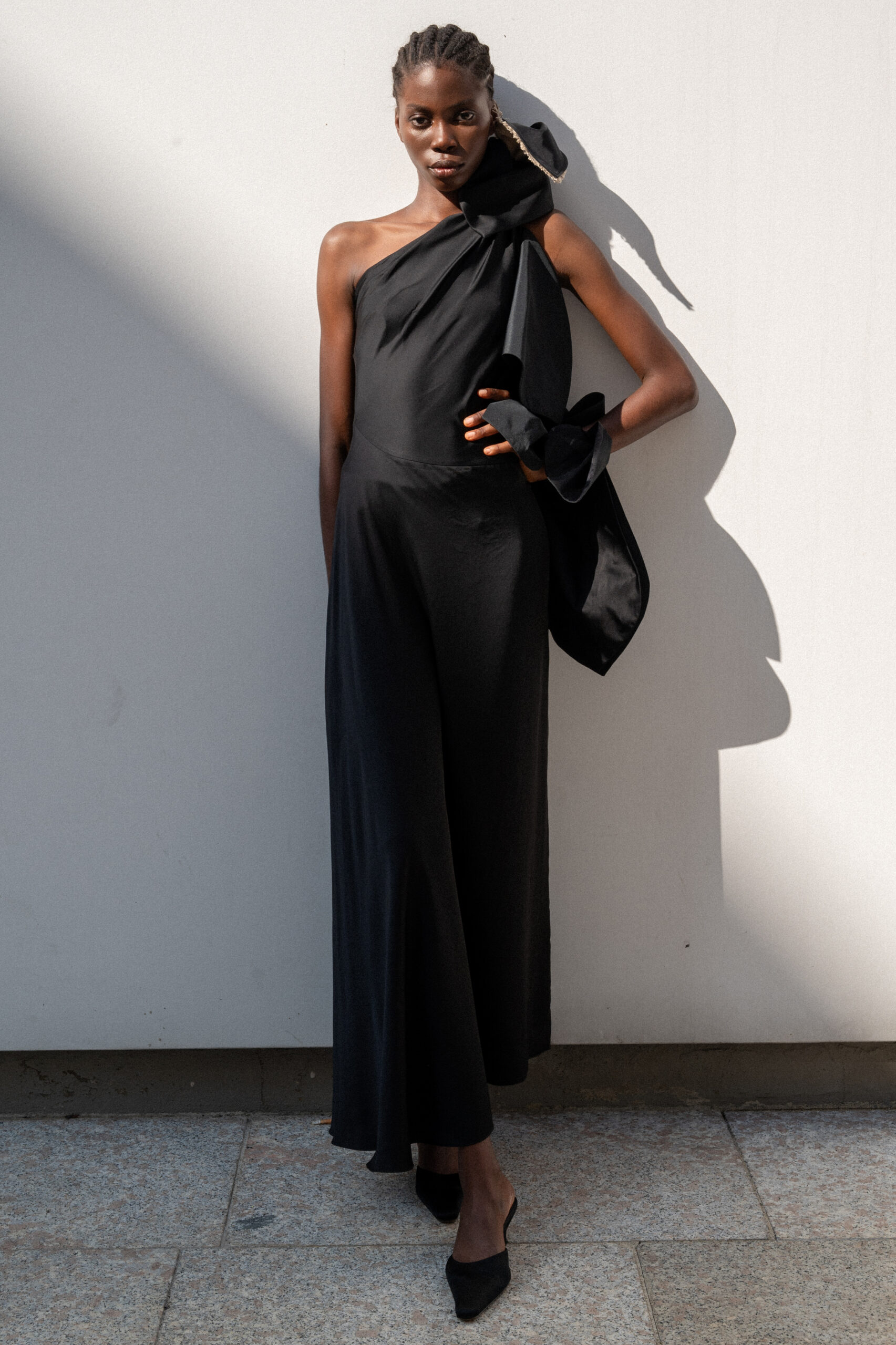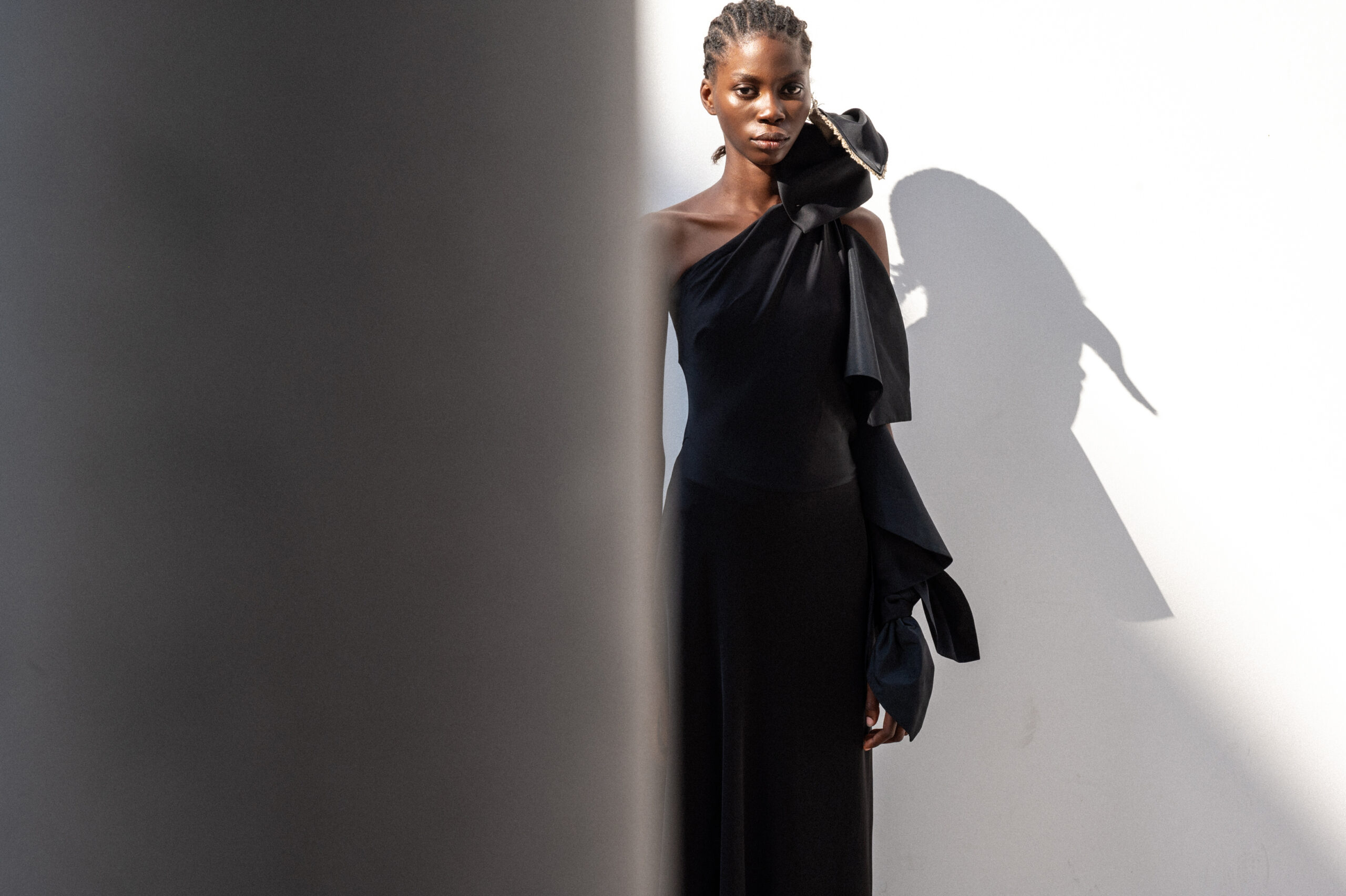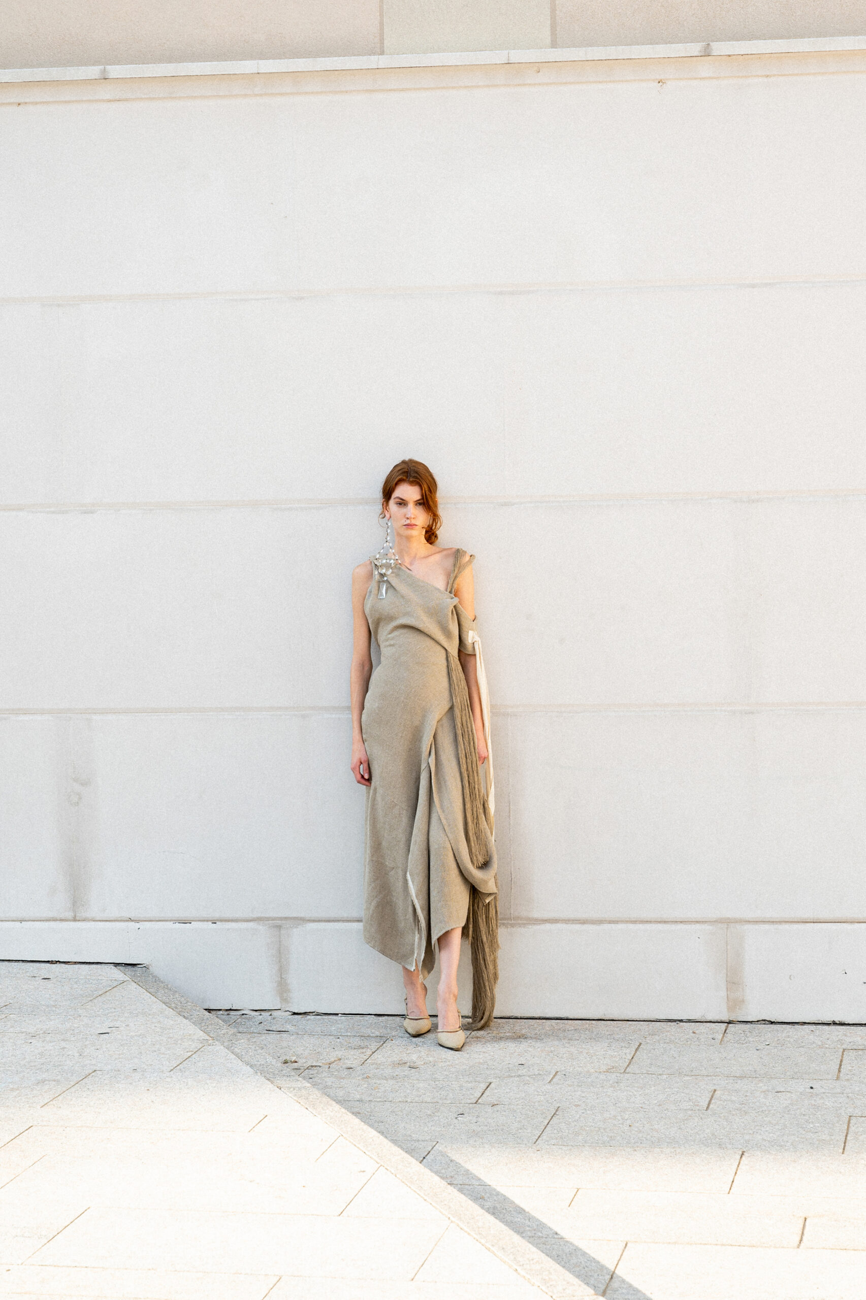 Les nœuds, signature indélébile de Romeo Gigli, se dévoilent tels des charmes envoûtants, enroulant leurs spirales de soie autour des bras et ornant les encolures arrières, évoquant des incantations magiques et incarnant l’asymétrie de l’élégance contemporaine. La collection célèbre la pureté de l’âme à travers des matières telles que la toile brute, le lin égyptien, et la jute tissée à la main – des matériaux purs qui font écho à la durabilité, érigée en mantra.