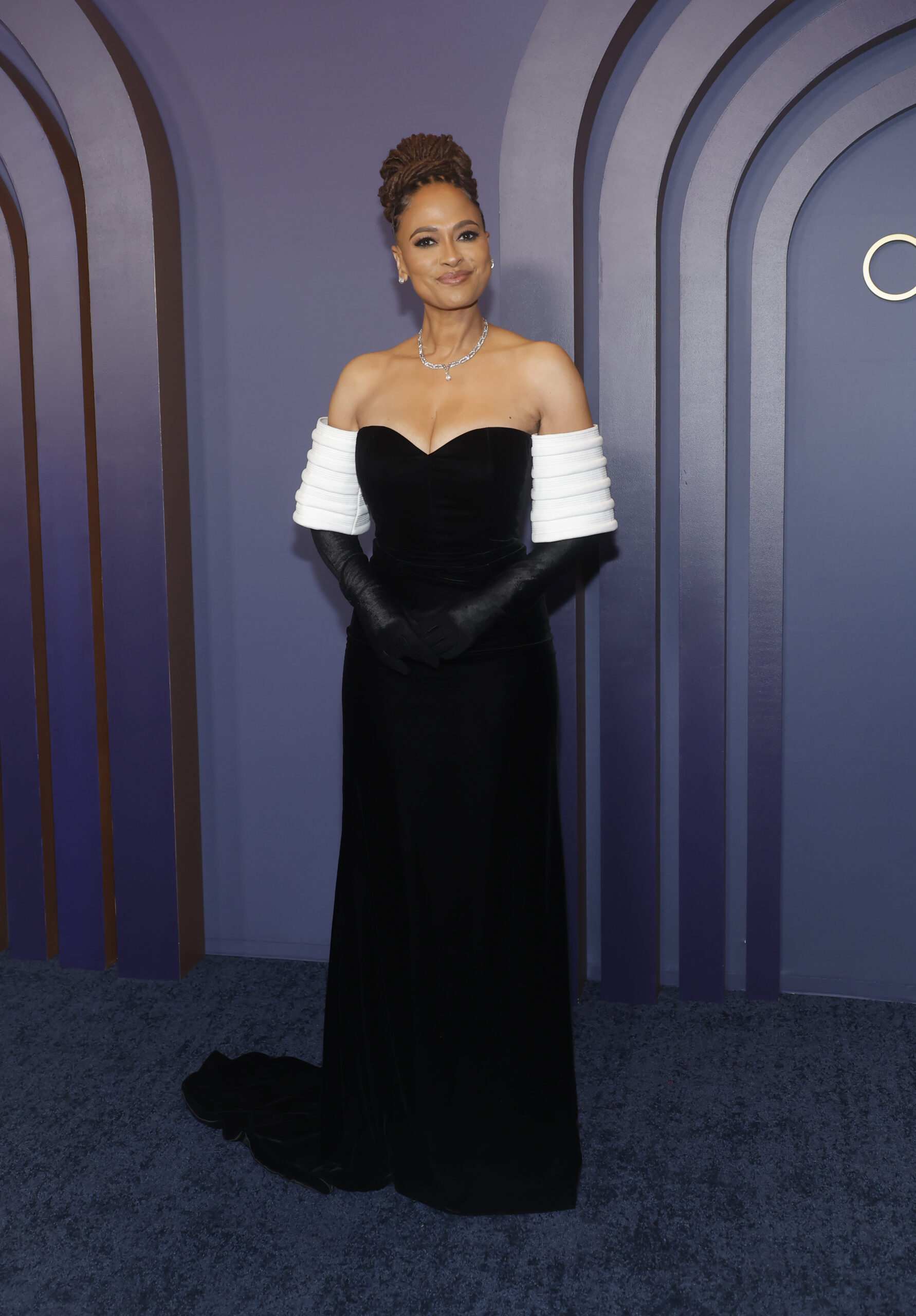 Ava DuVernay wears custom Louis Vuitton and High Jewelry to the 14th Annual Governors AwardsAva DuVernay wears a black velvet bustier gown with white cotton poplin padded sleeves, black velvet gloves and black pumps.Ava DuVernay also wears a white gold and diamond necklace from the Louis Vuitton High Jewelry collection.