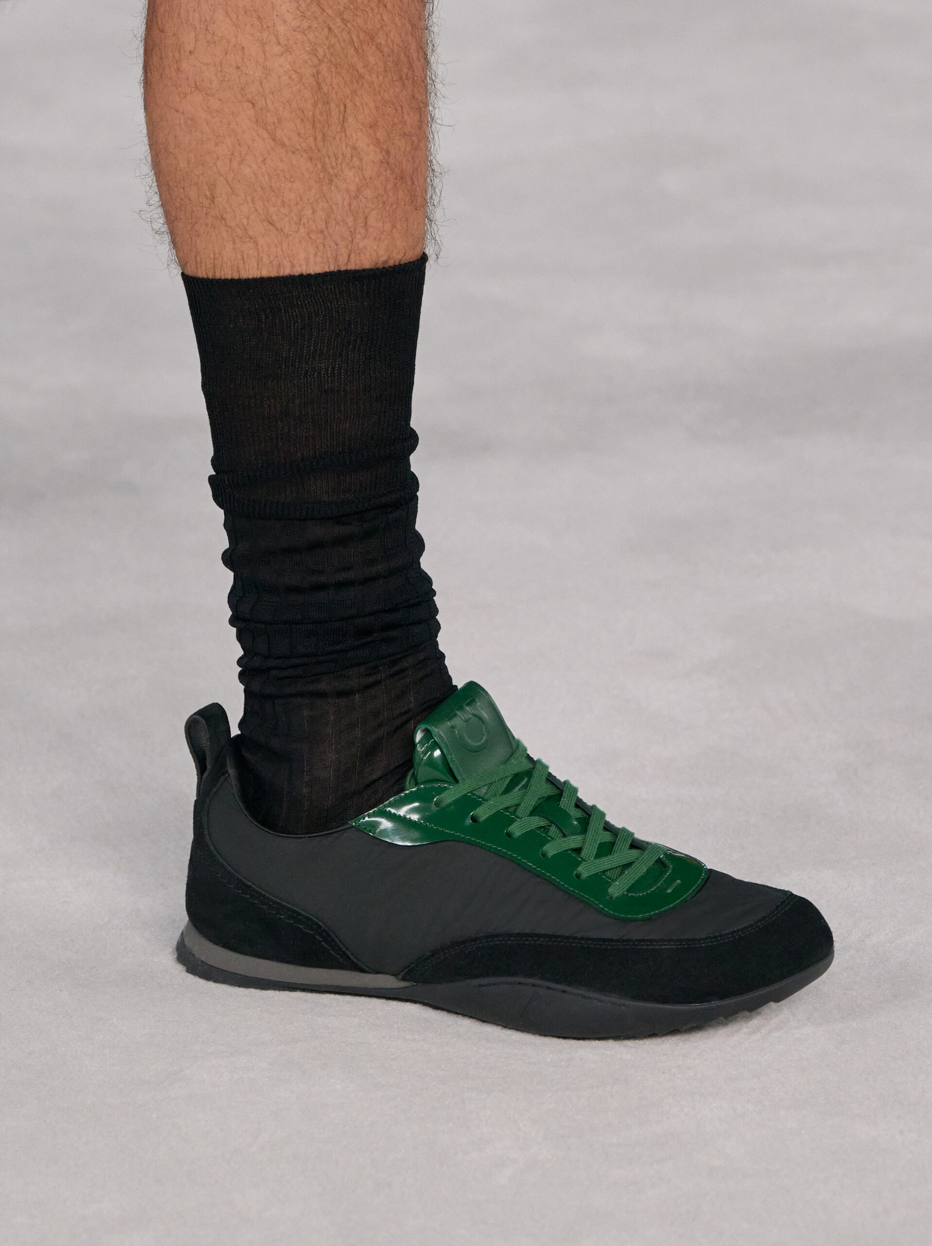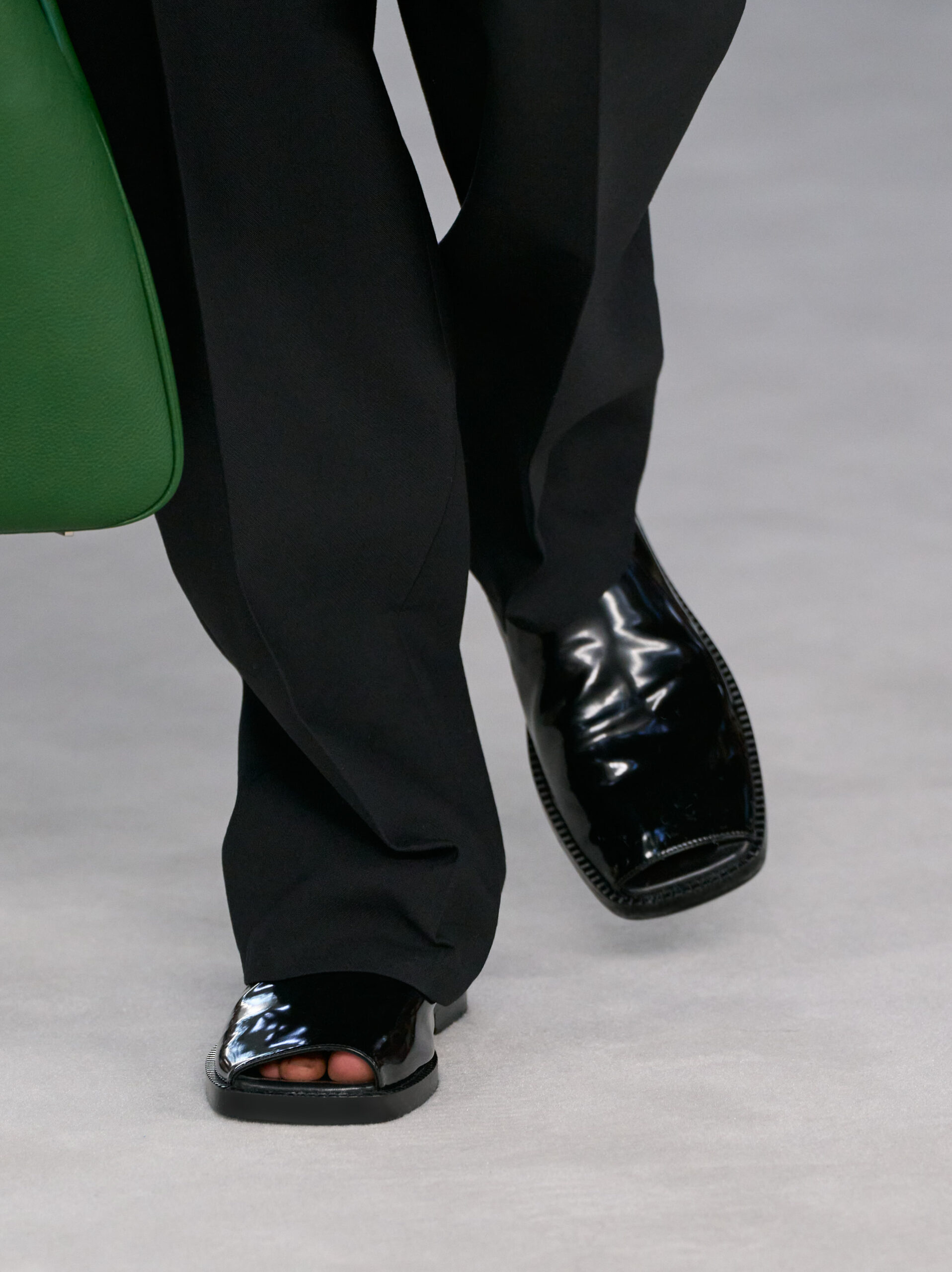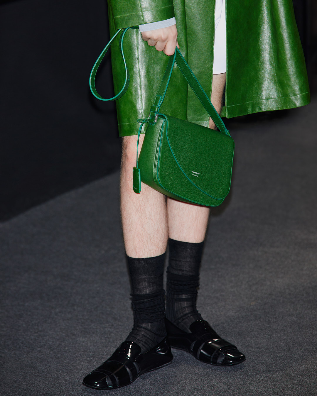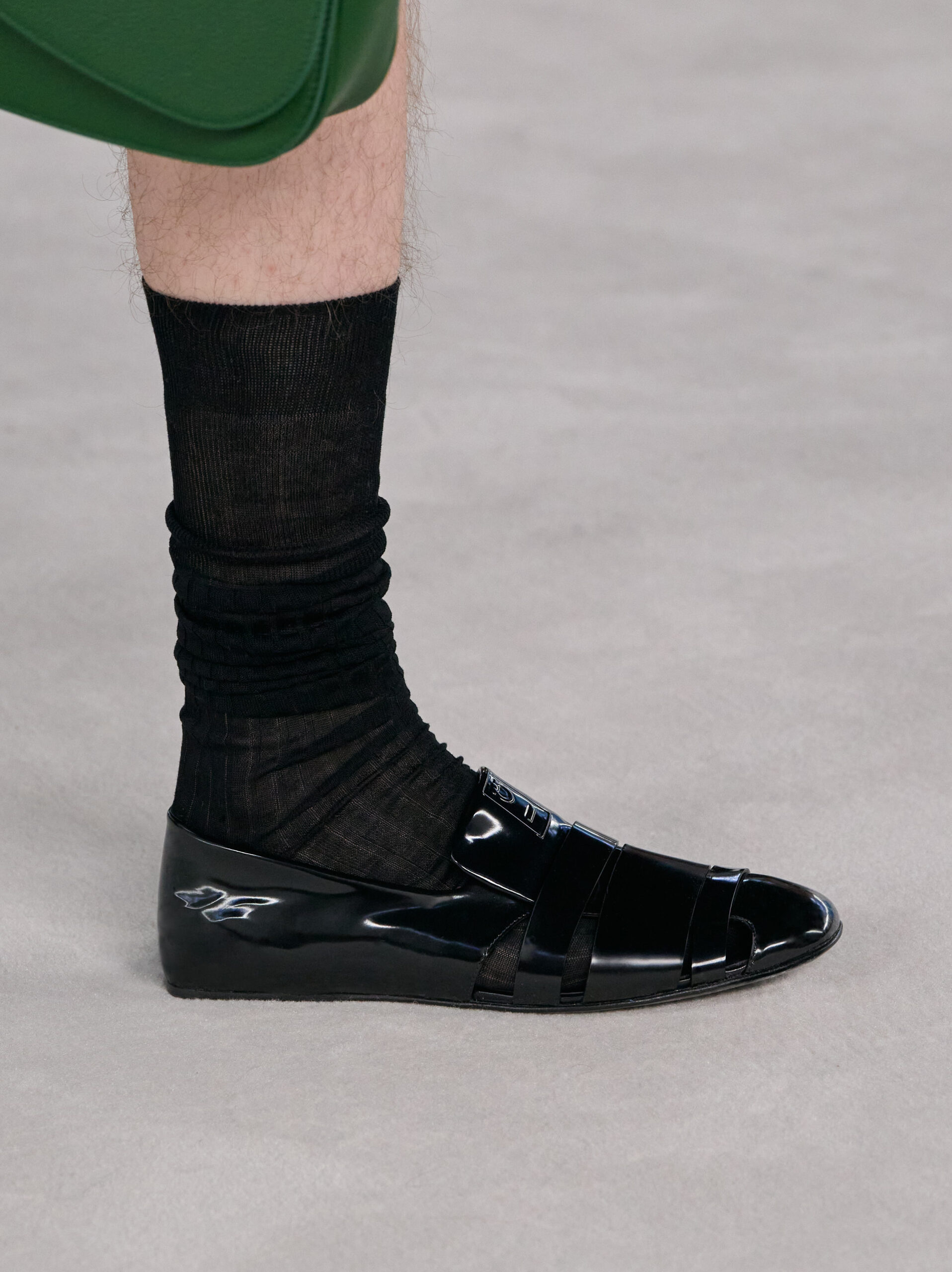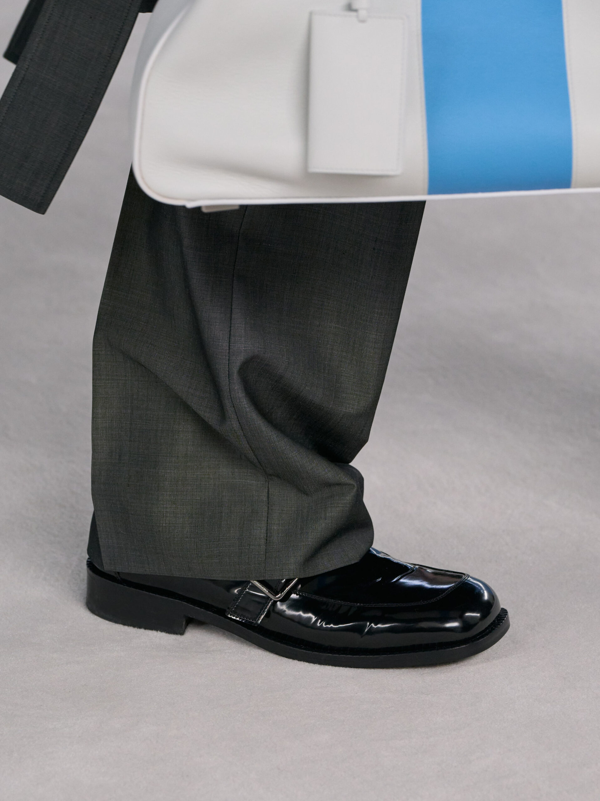 Dans les chaussures, l’approche de Davis se marie avec l’artisanat de Ferragamo : des chaussures en nappa latex et des bottes en cuir de gaucho reflètent ses inclinations esthétiques. Le talon « Calypso » de 1955 est réinterprété avec une impression 3D et une finition galvanisée. Pour les hommes, les classiques sont revisités avec une touche contemporaine.