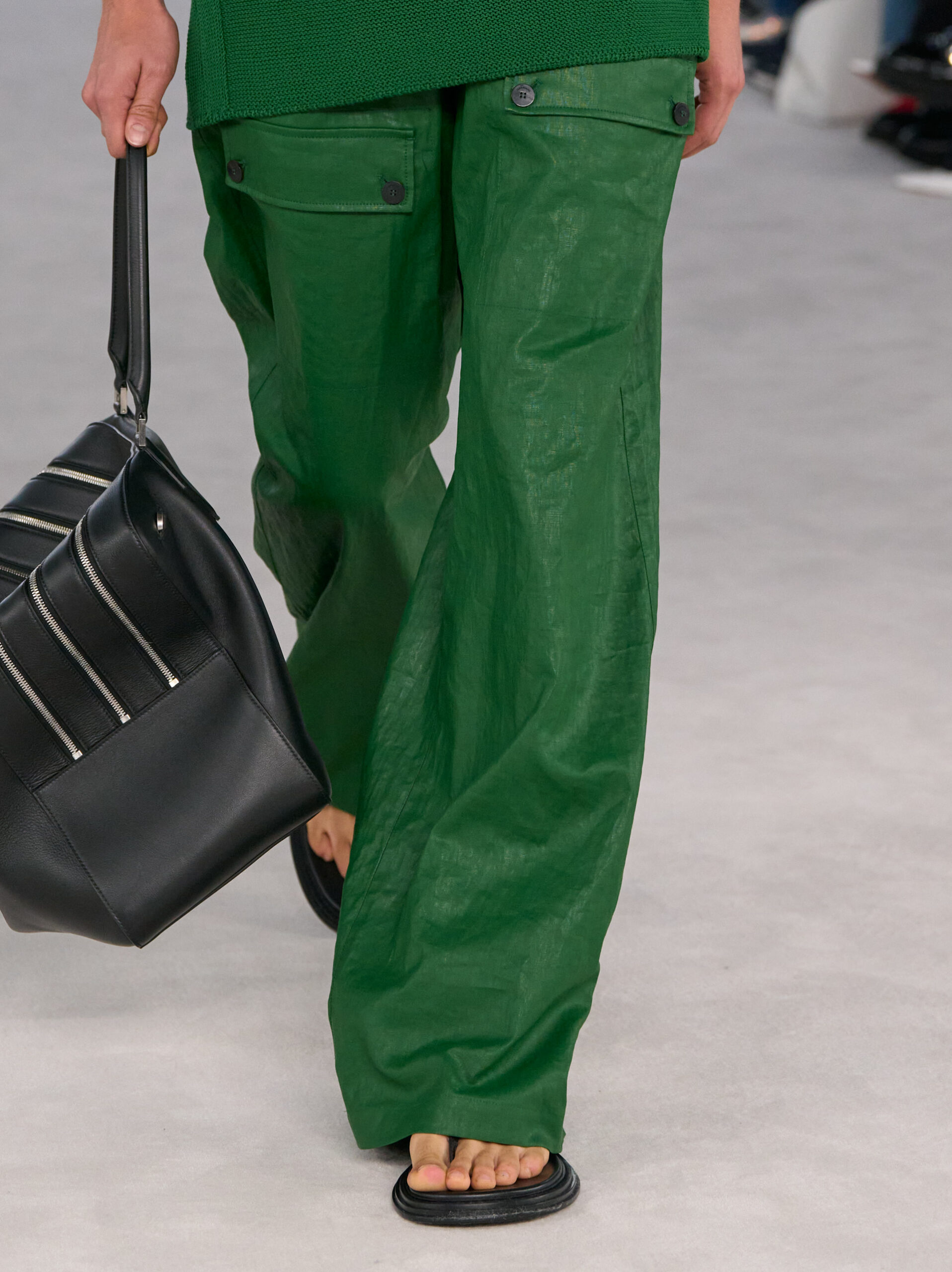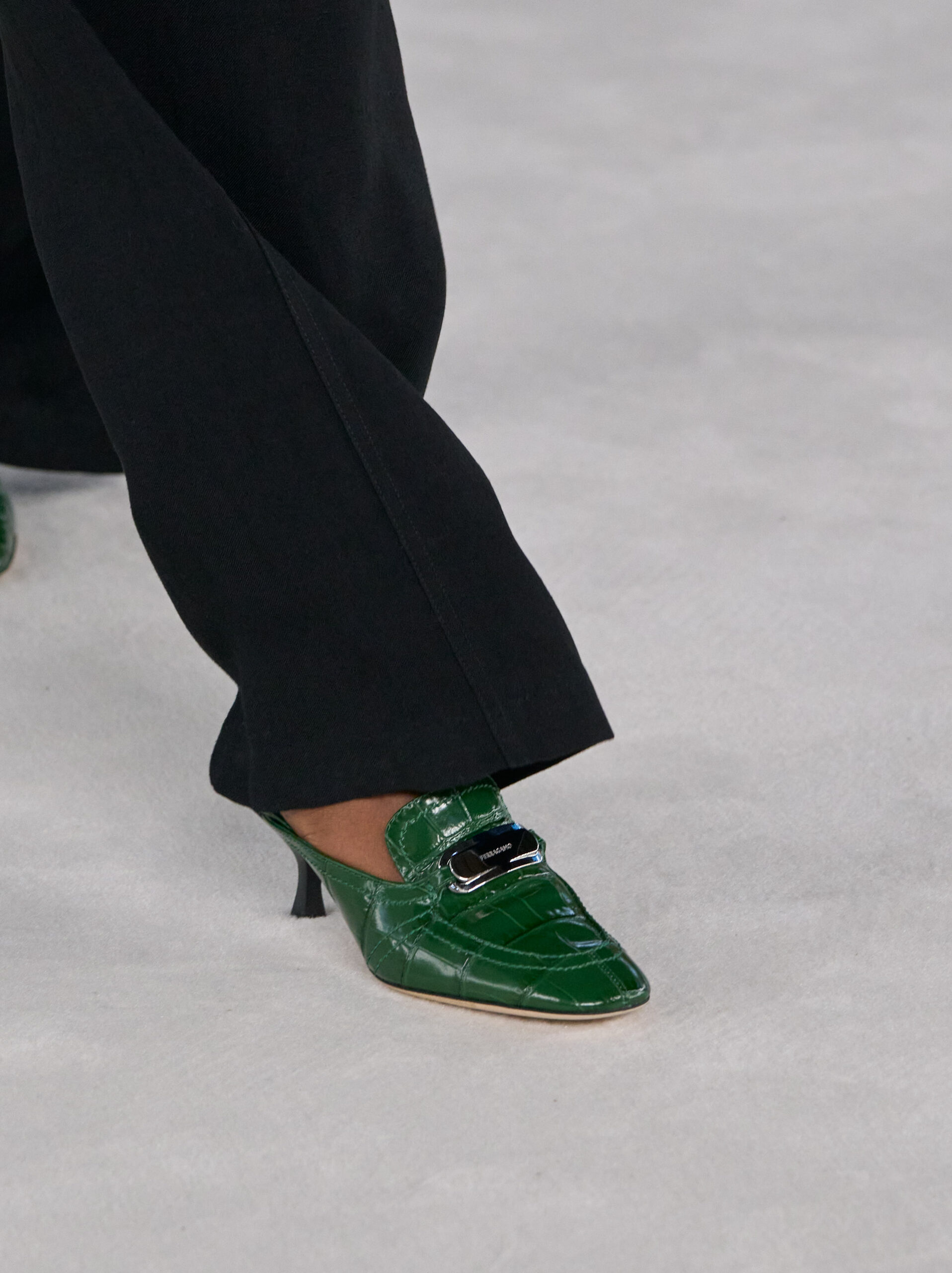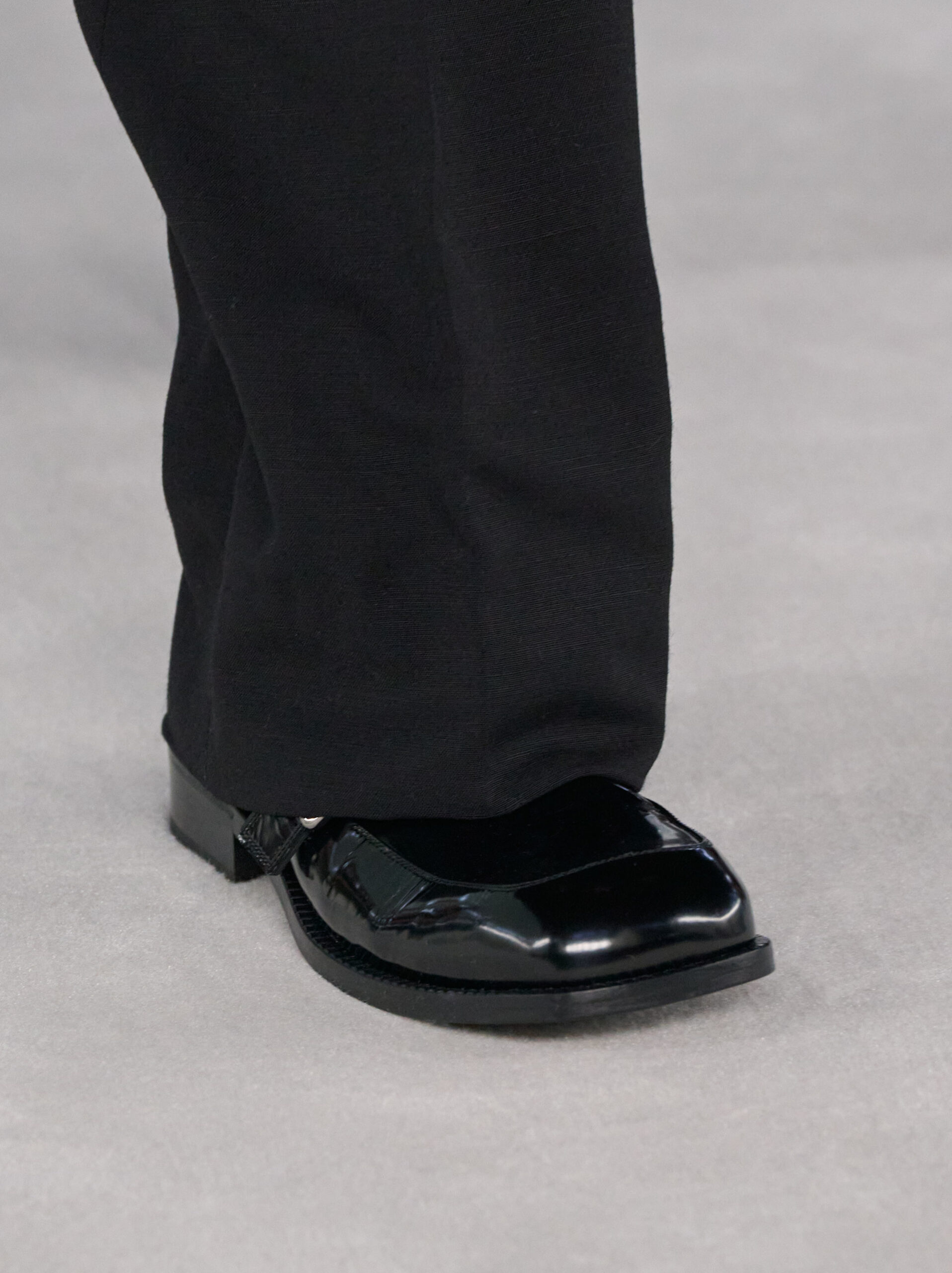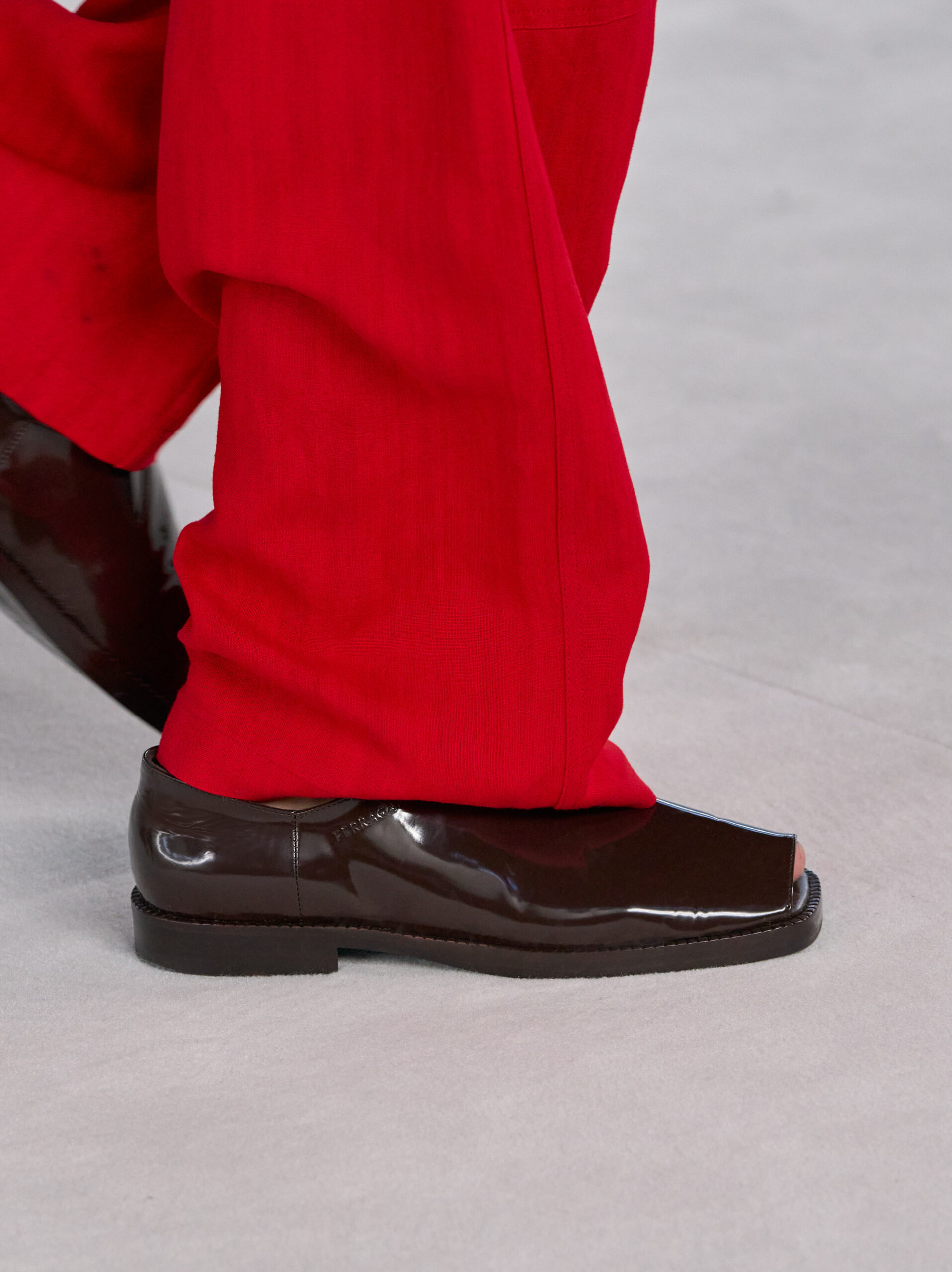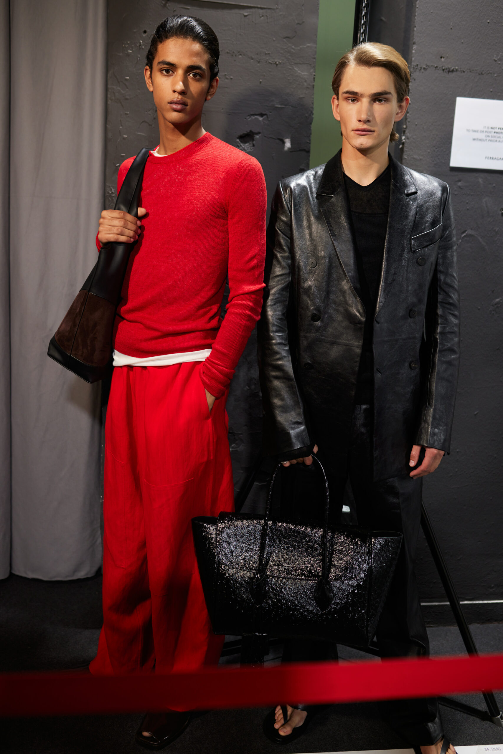 Dans les chaussures, l’approche de Davis se marie avec l’artisanat de Ferragamo : des chaussures en nappa latex et des bottes en cuir de gaucho reflètent ses inclinations esthétiques. Le talon « Calypso » de 1955 est réinterprété avec une impression 3D et une finition galvanisée. Pour les hommes, les classiques sont revisités avec une touche contemporaine.