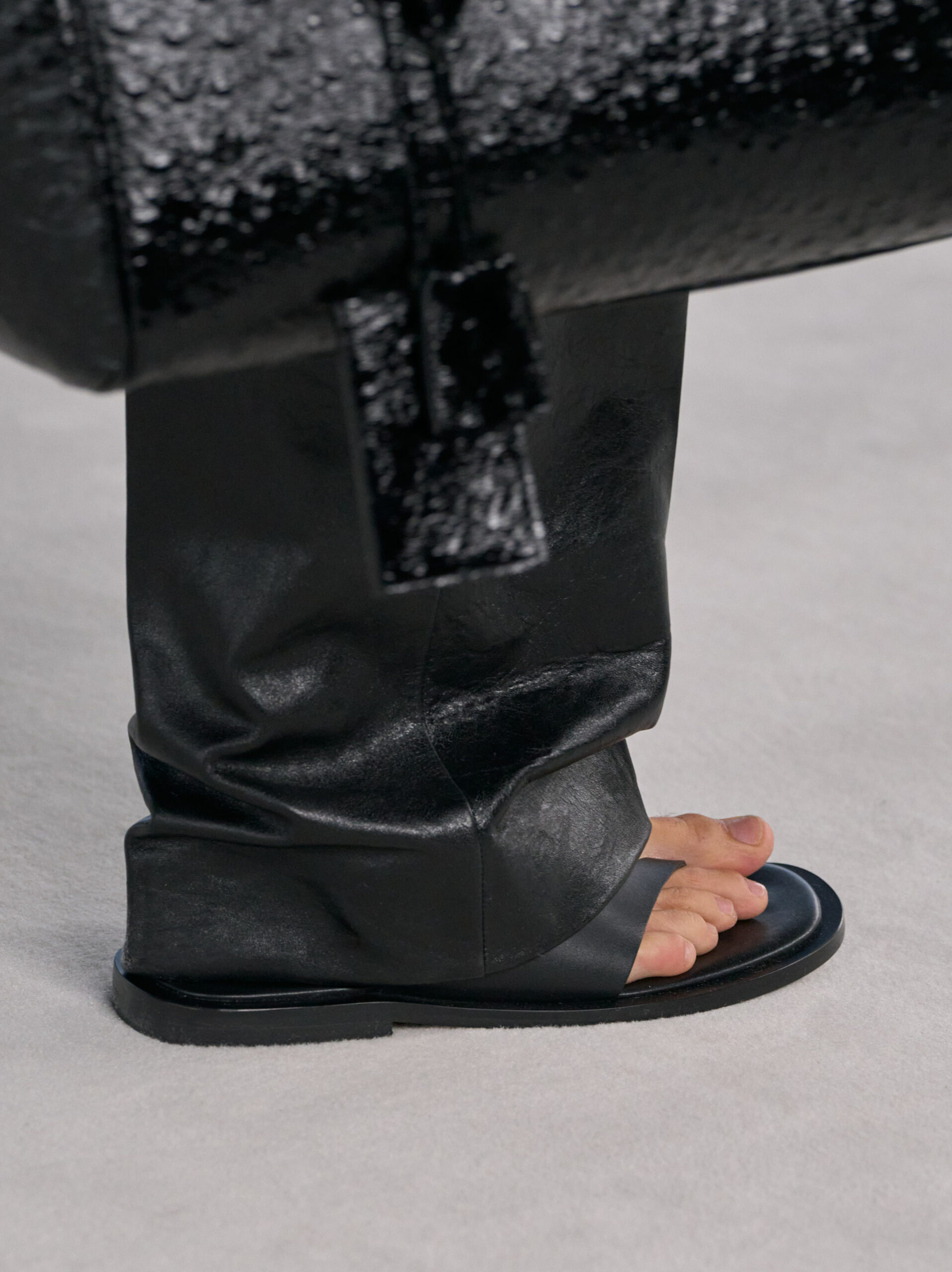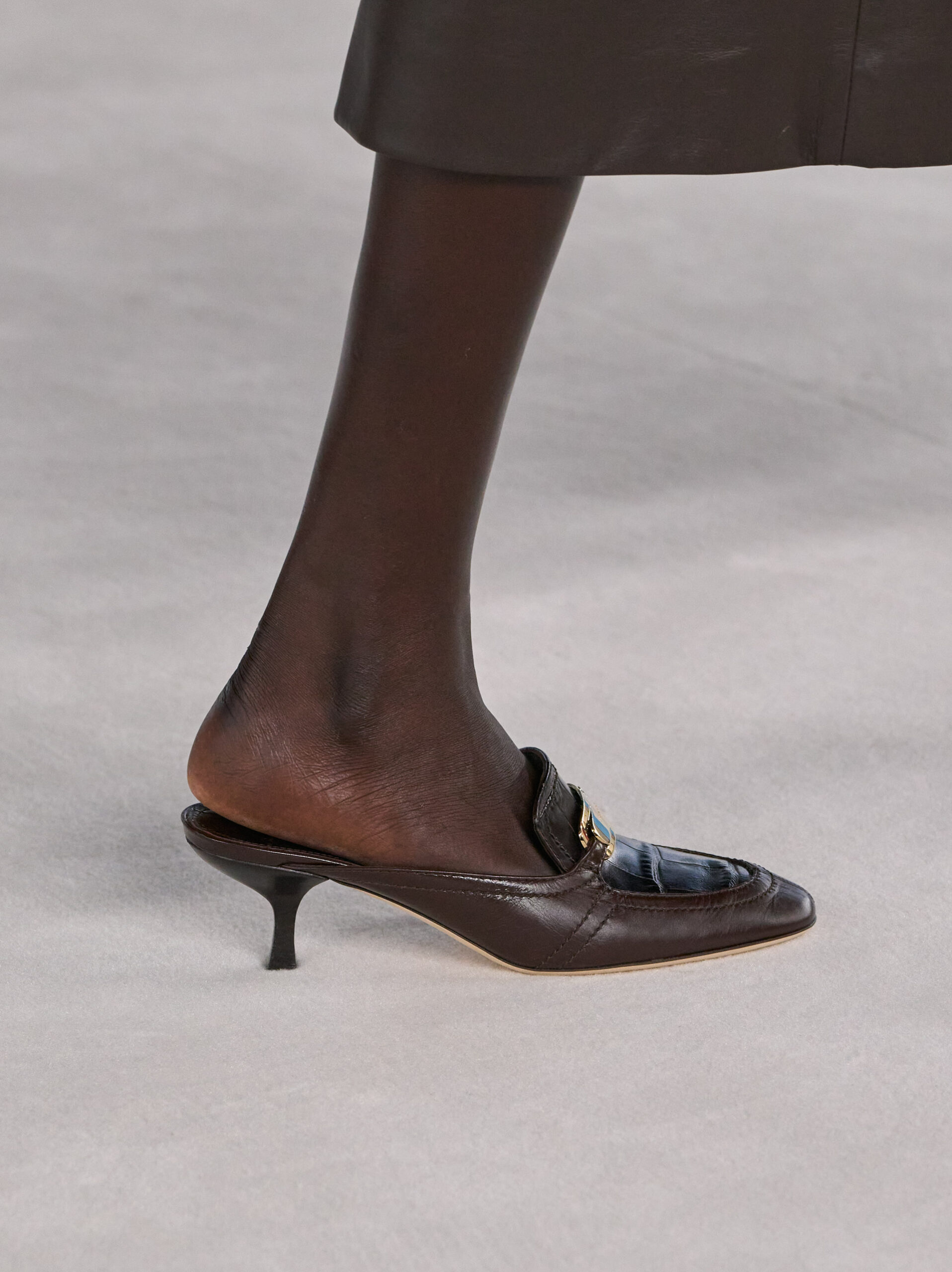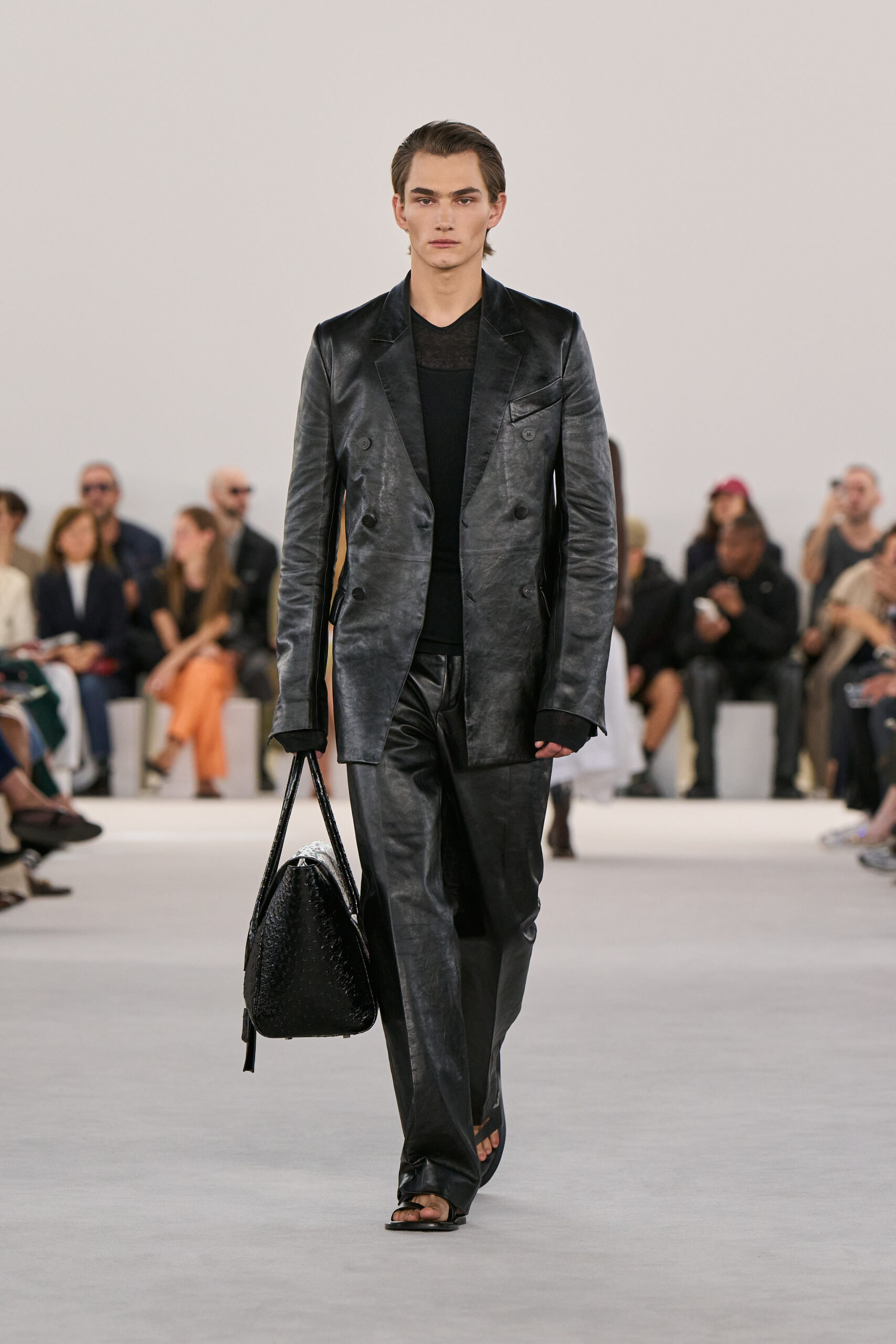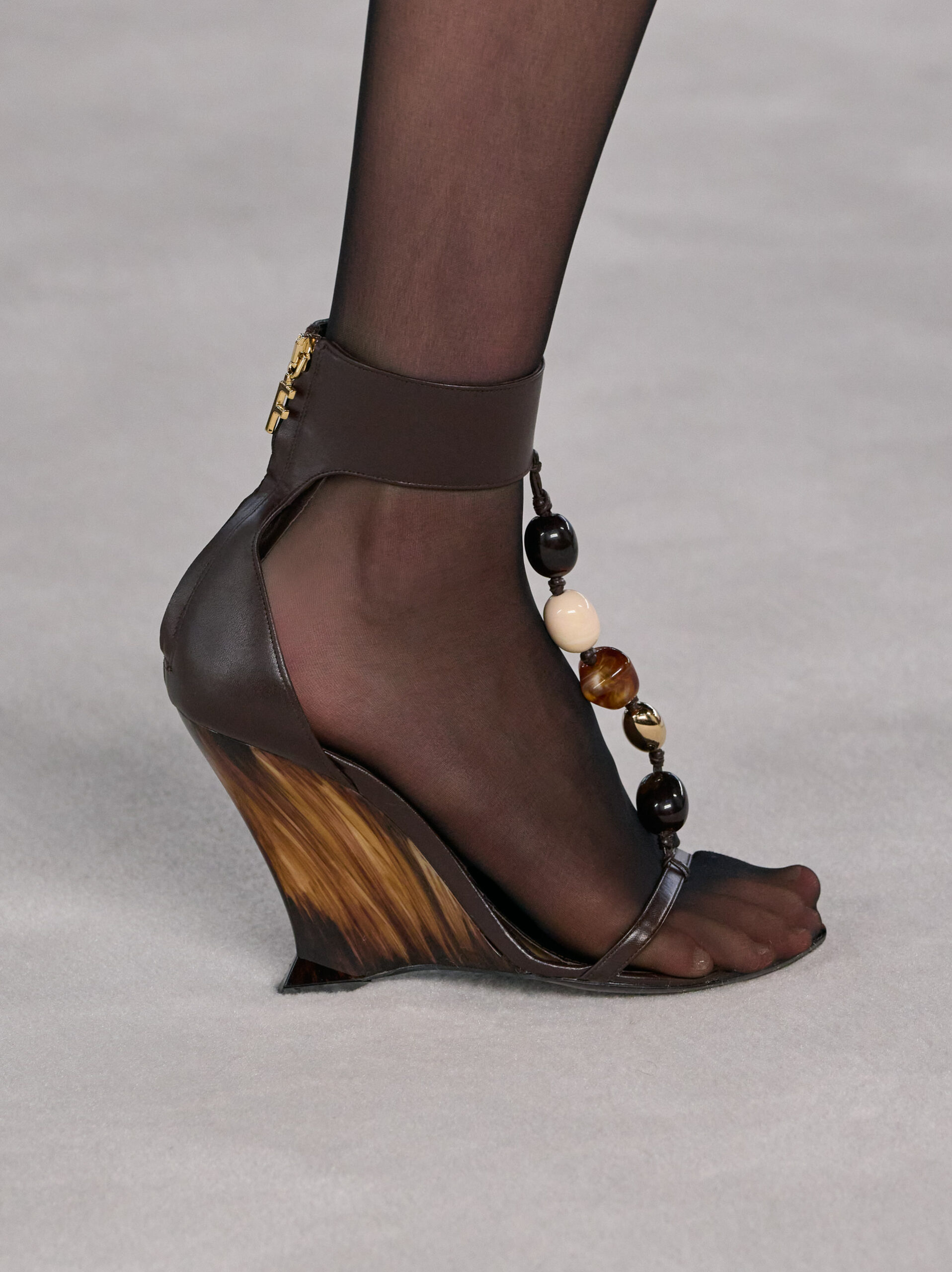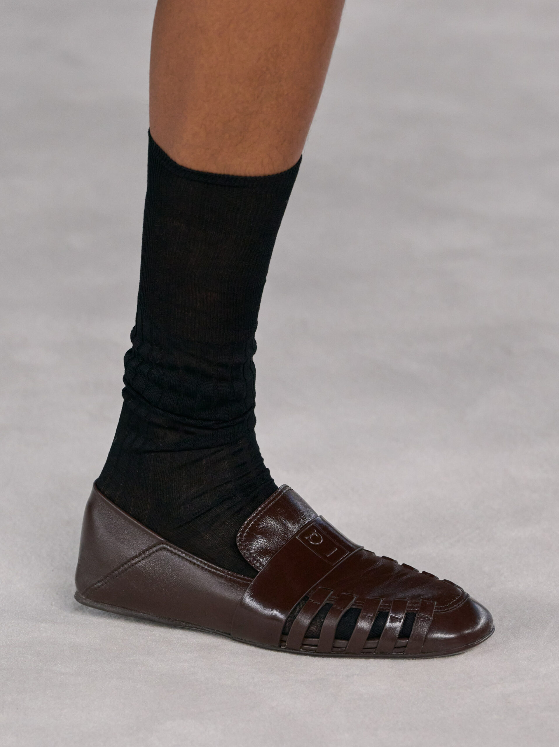 Dans les chaussures, l’approche de Davis se marie avec l’artisanat de Ferragamo : des chaussures en nappa latex et des bottes en cuir de gaucho reflètent ses inclinations esthétiques. Le talon « Calypso » de 1955 est réinterprété avec une impression 3D et une finition galvanisée. Pour les hommes, les classiques sont revisités avec une touche contemporaine.