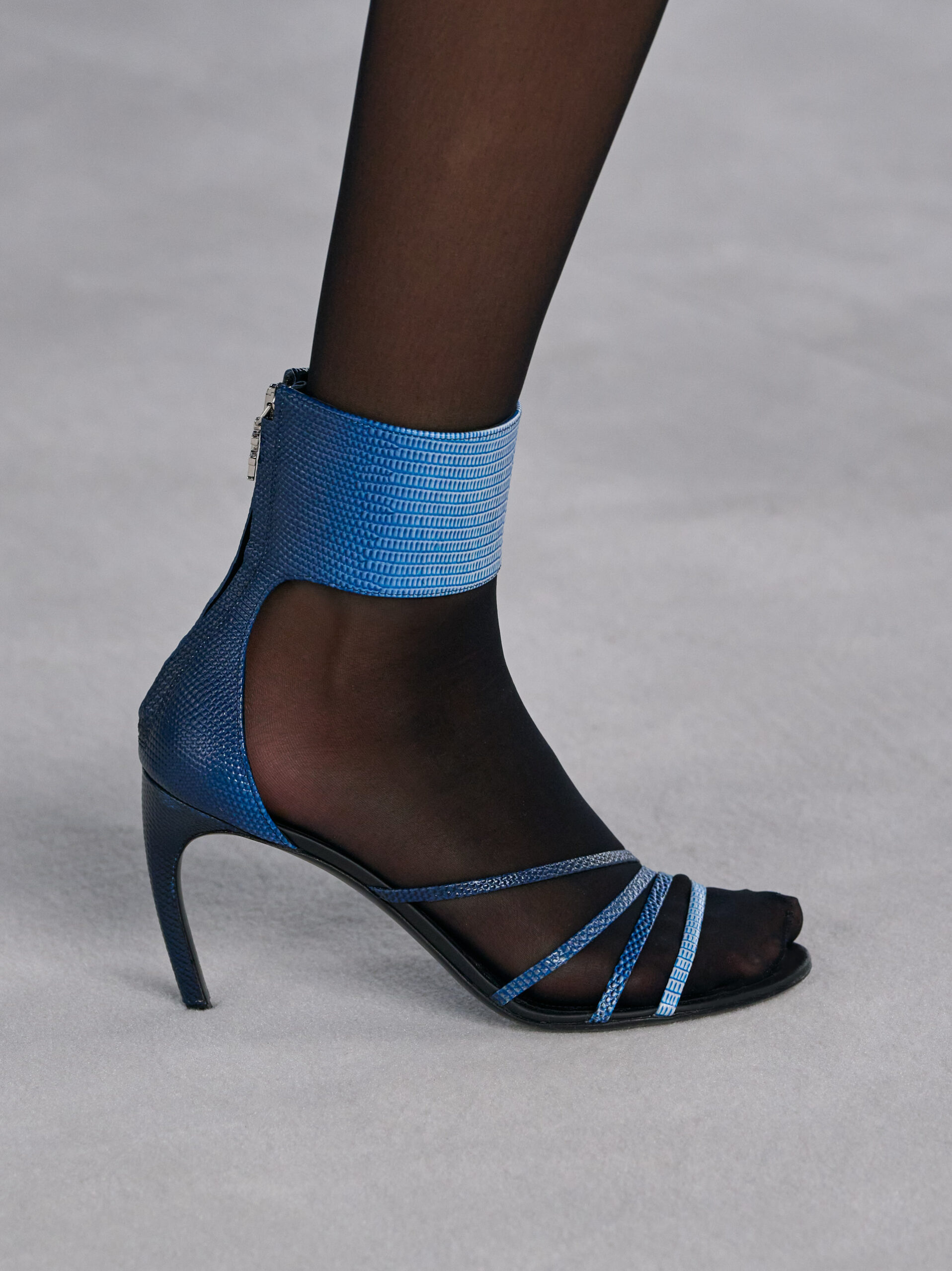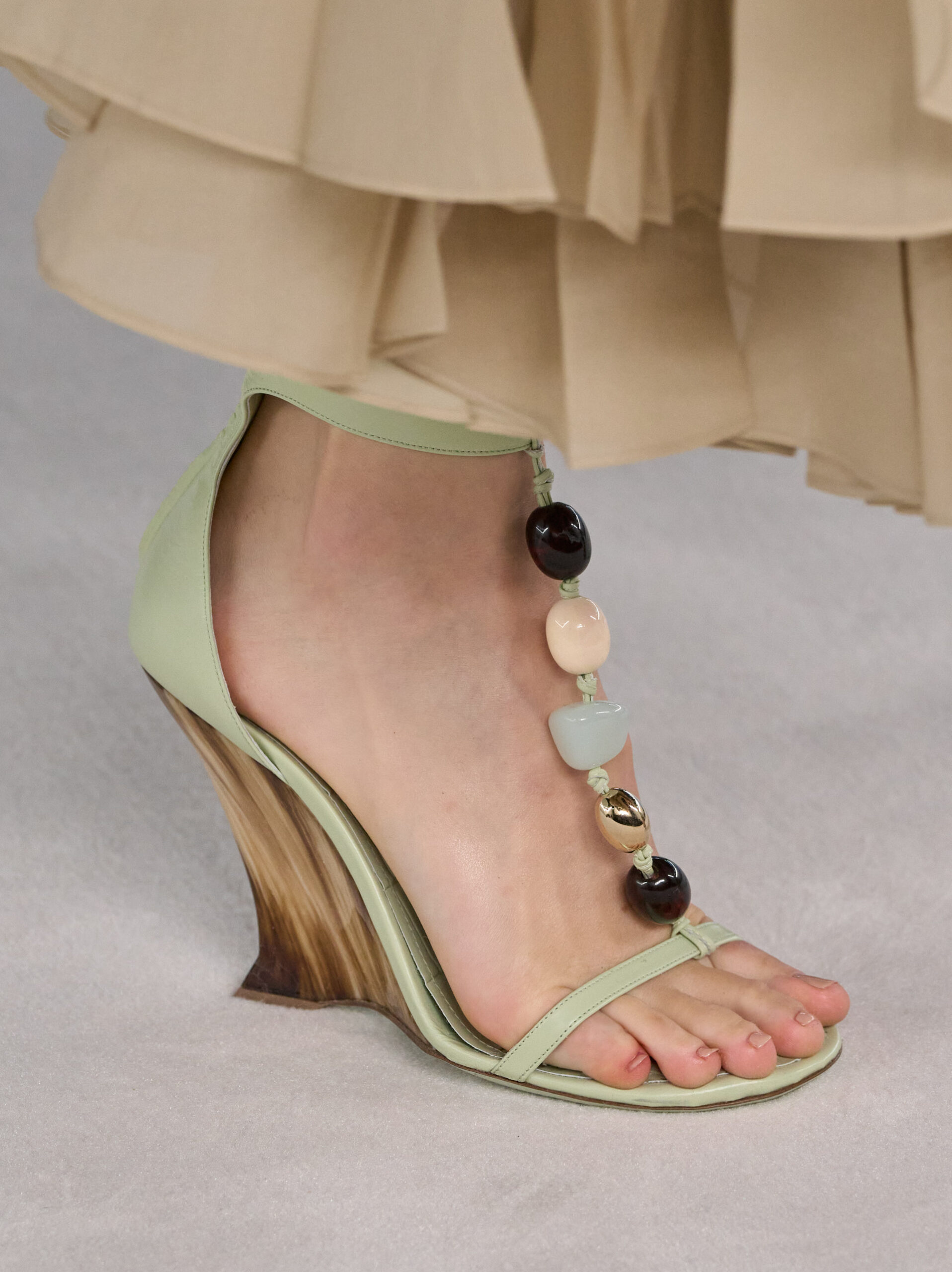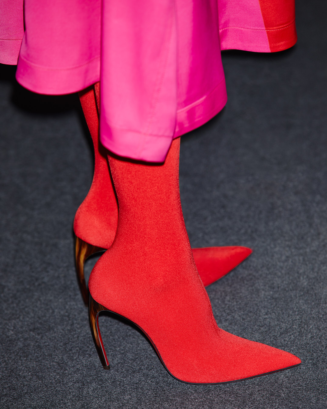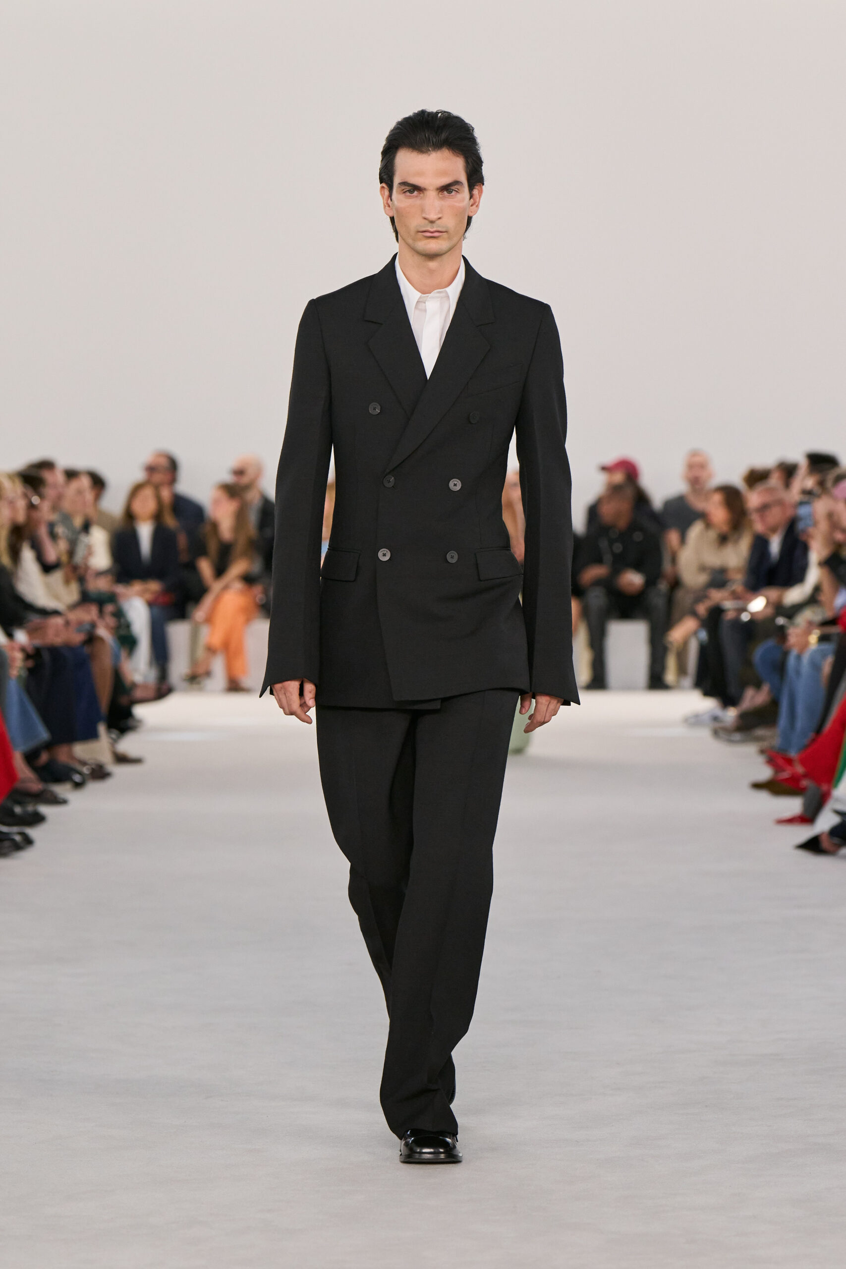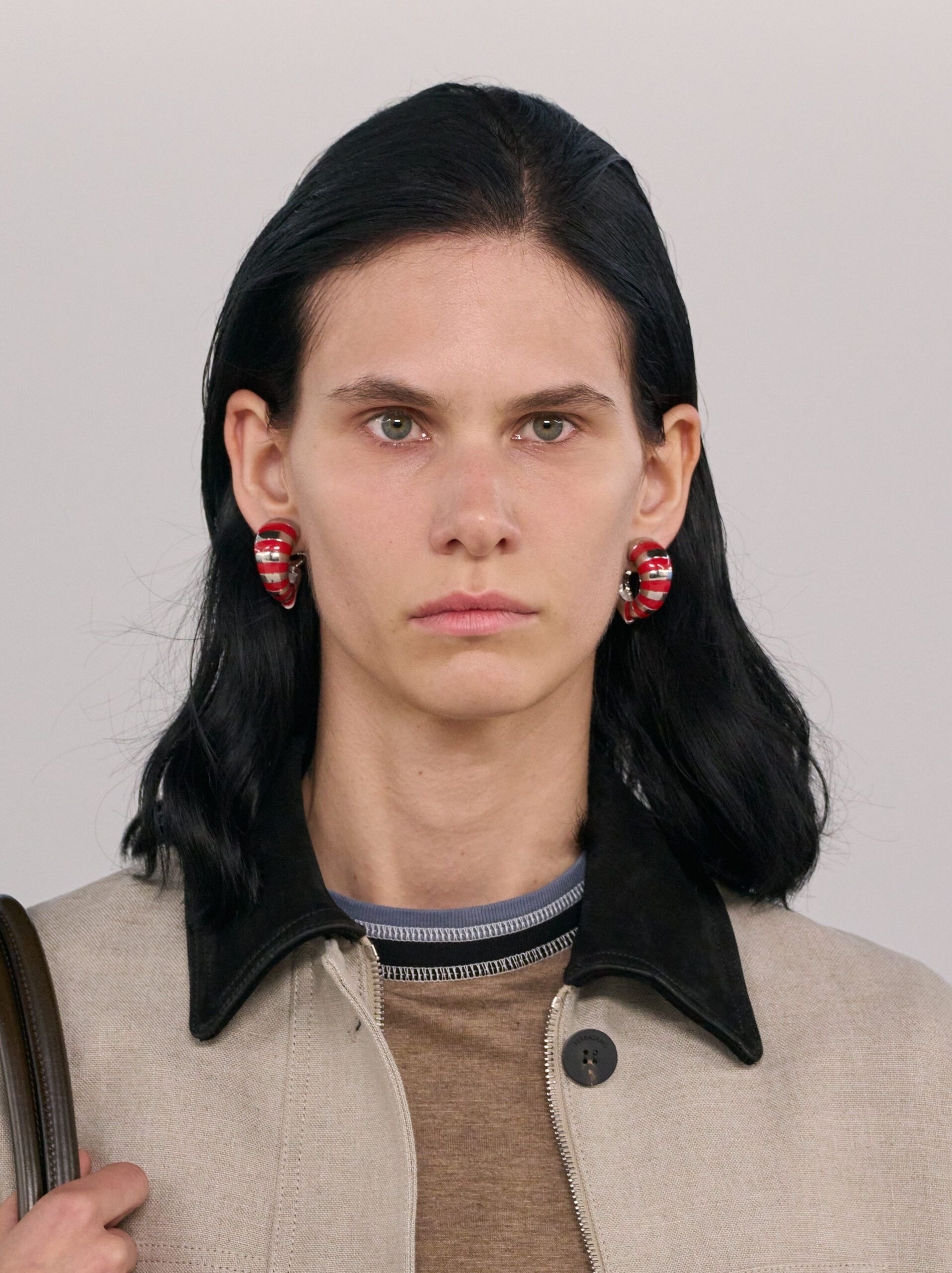 Dans les chaussures, l’approche de Davis se marie avec l’artisanat de Ferragamo : des chaussures en nappa latex et des bottes en cuir de gaucho reflètent ses inclinations esthétiques. Le talon « Calypso » de 1955 est réinterprété avec une impression 3D et une finition galvanisée. Pour les hommes, les classiques sont revisités avec une touche contemporaine.