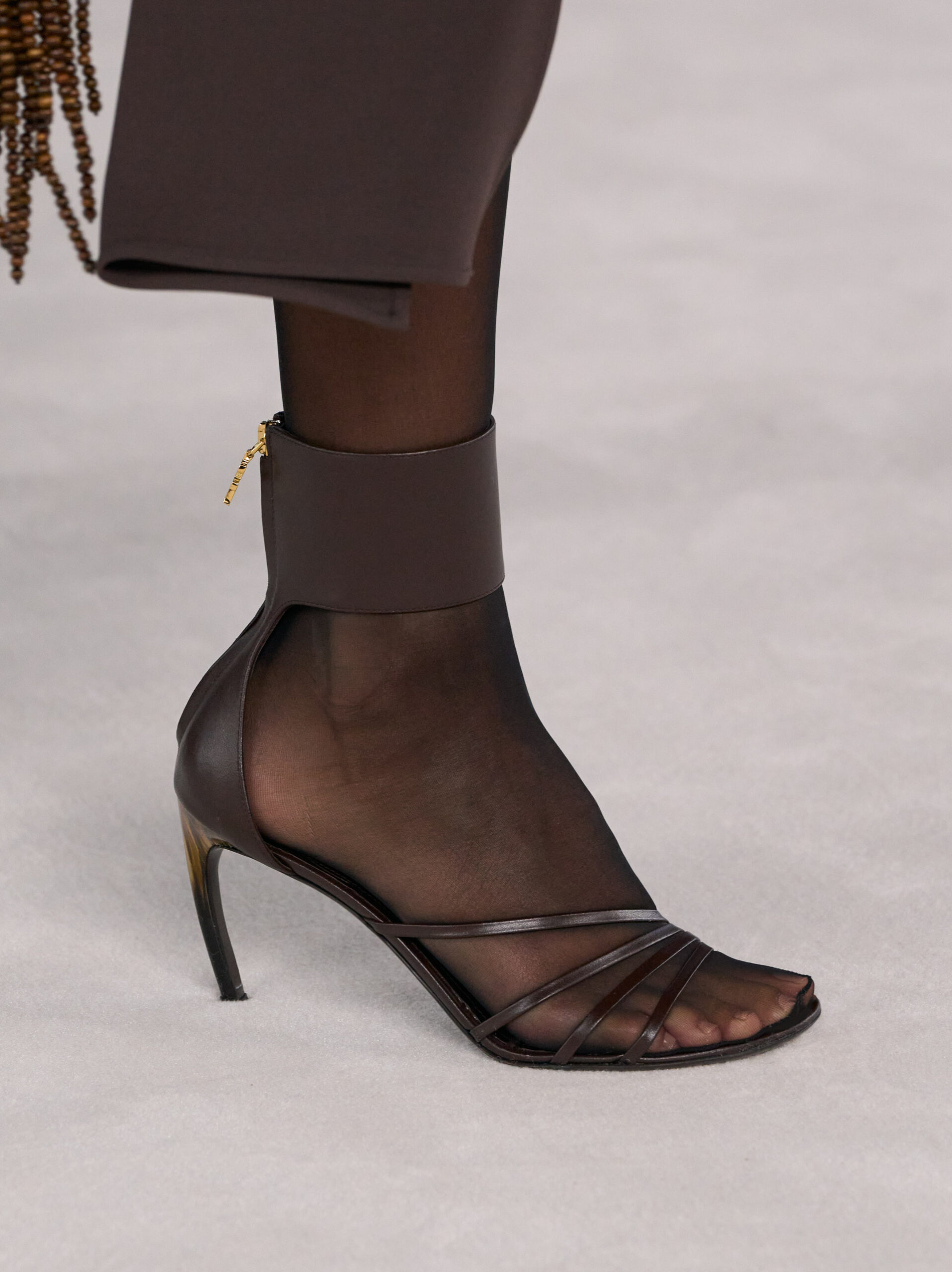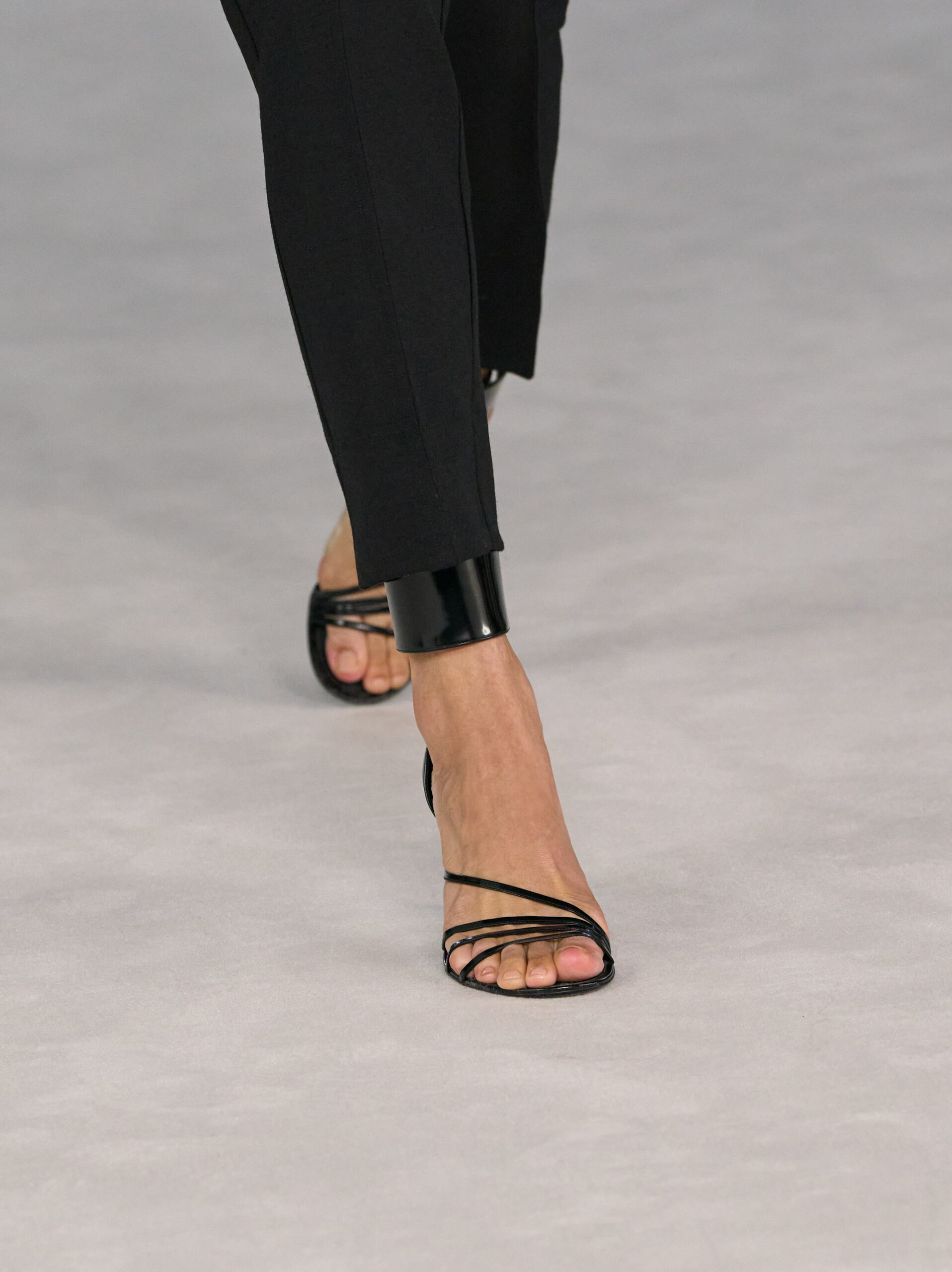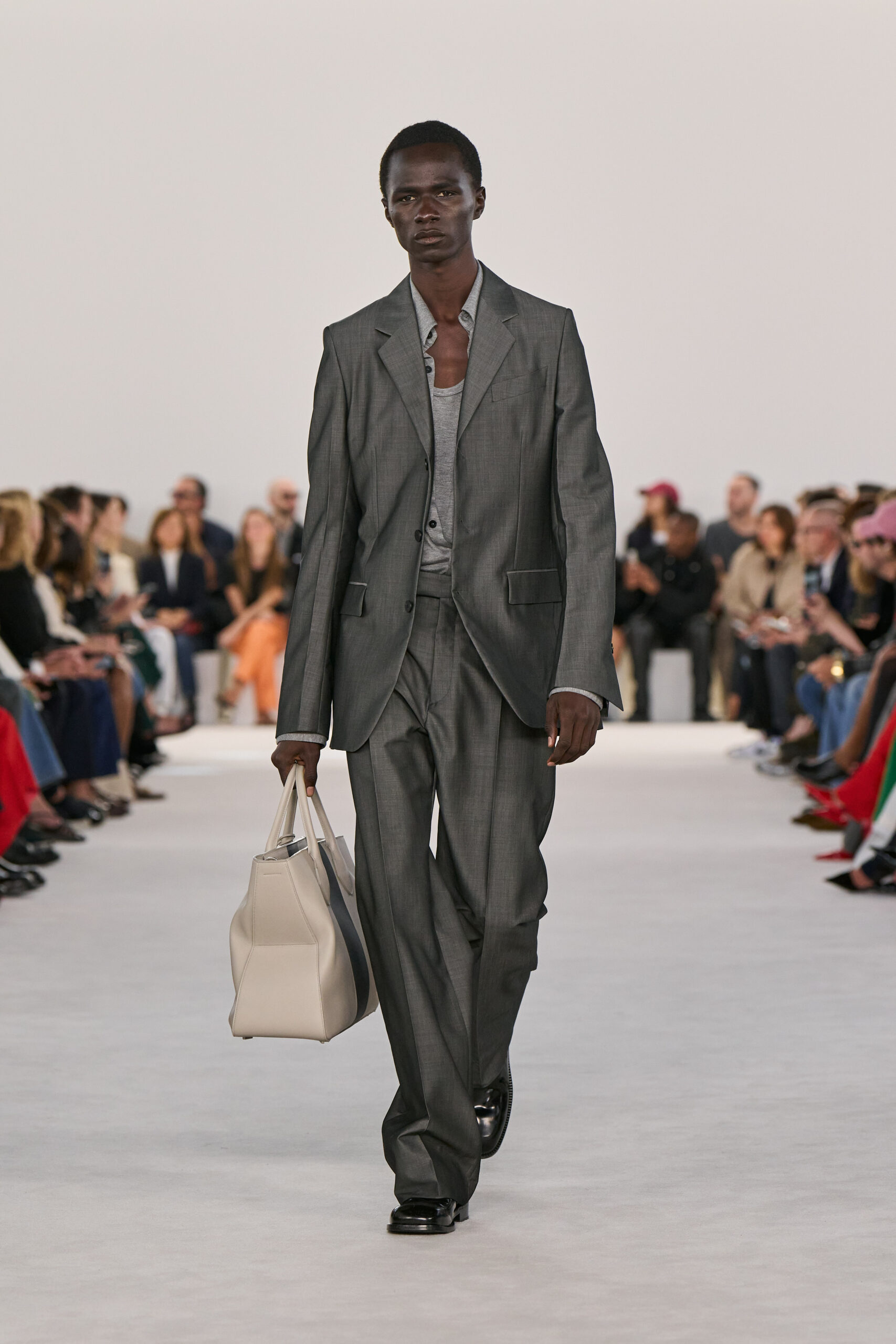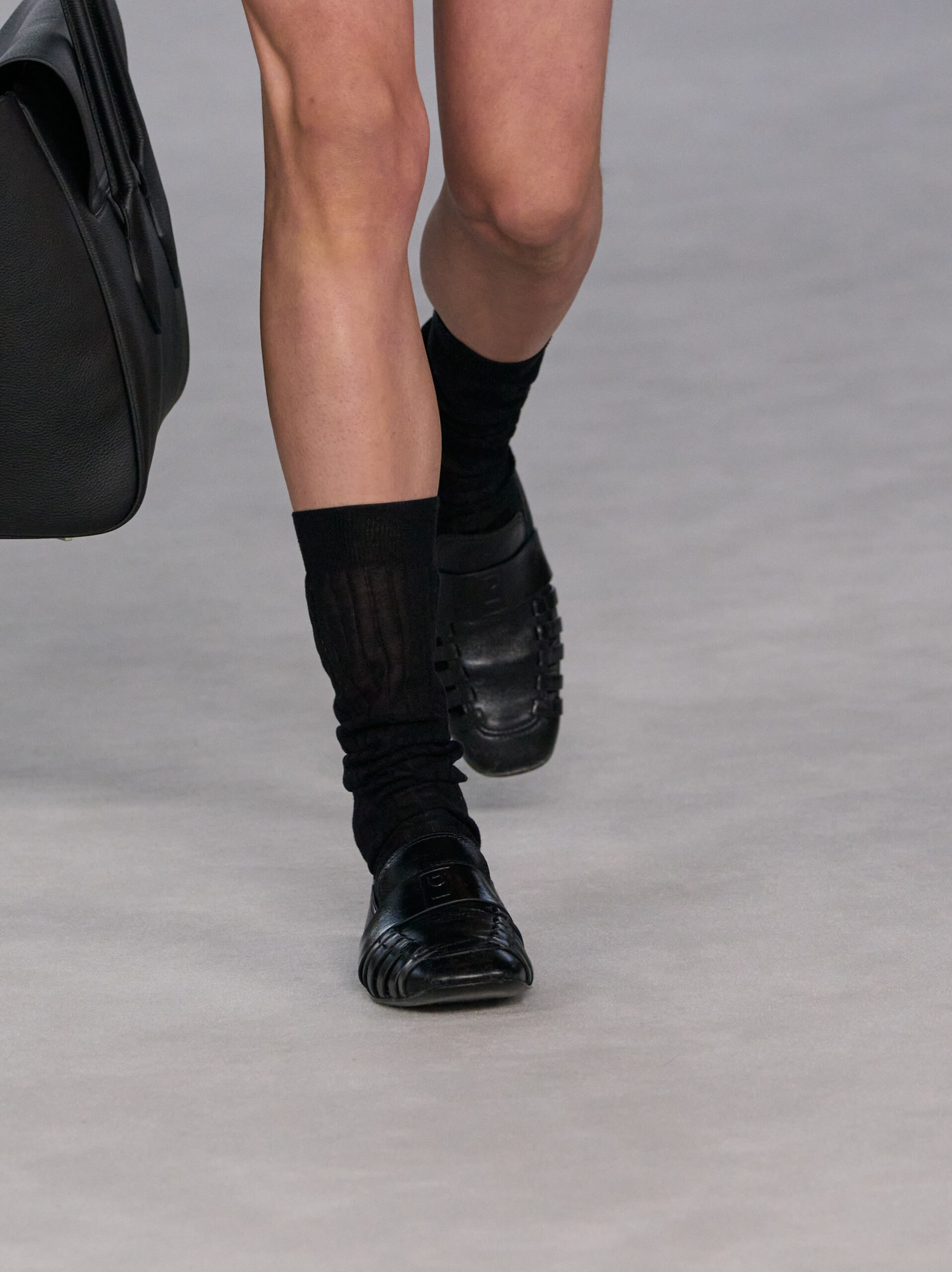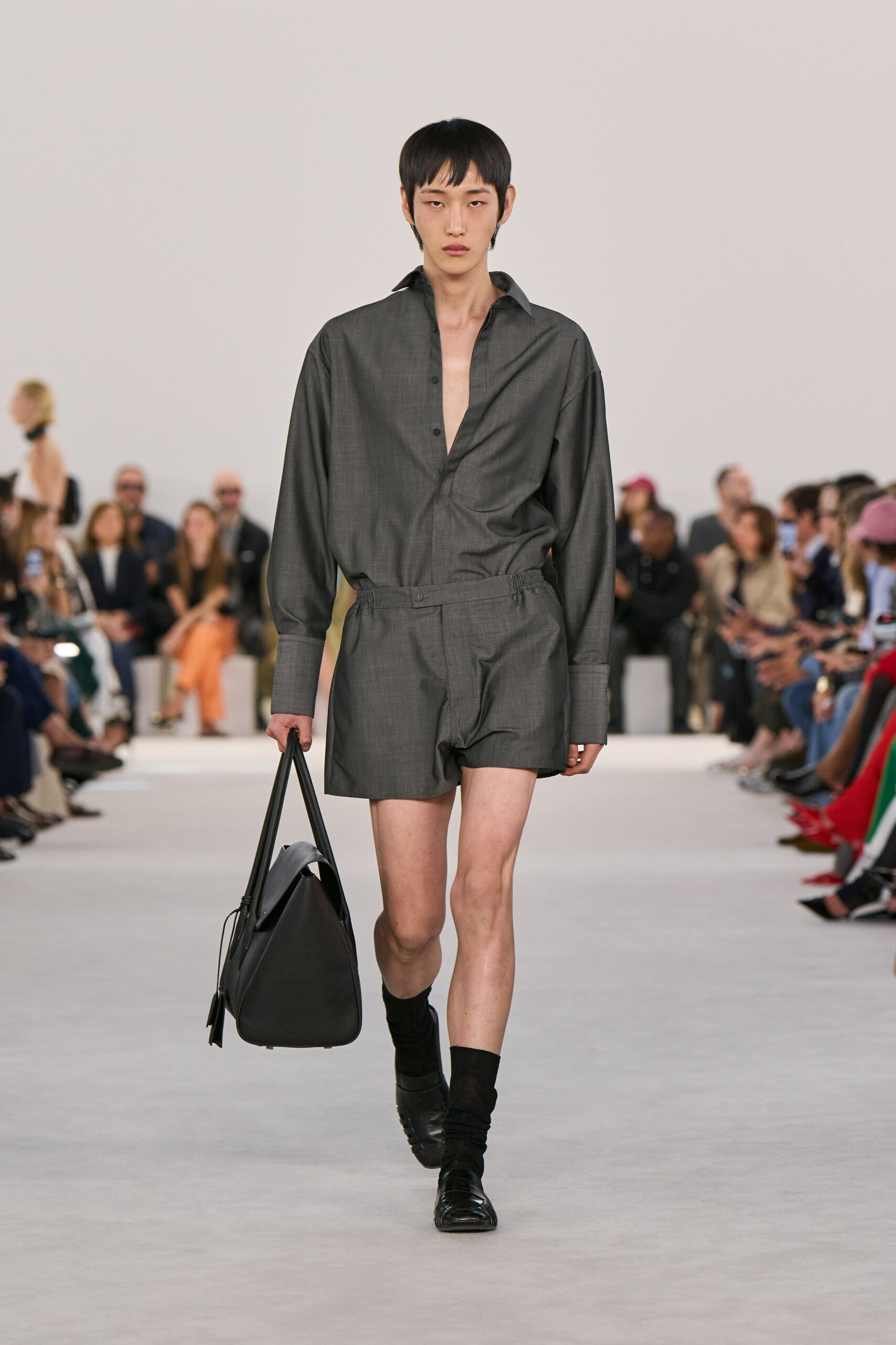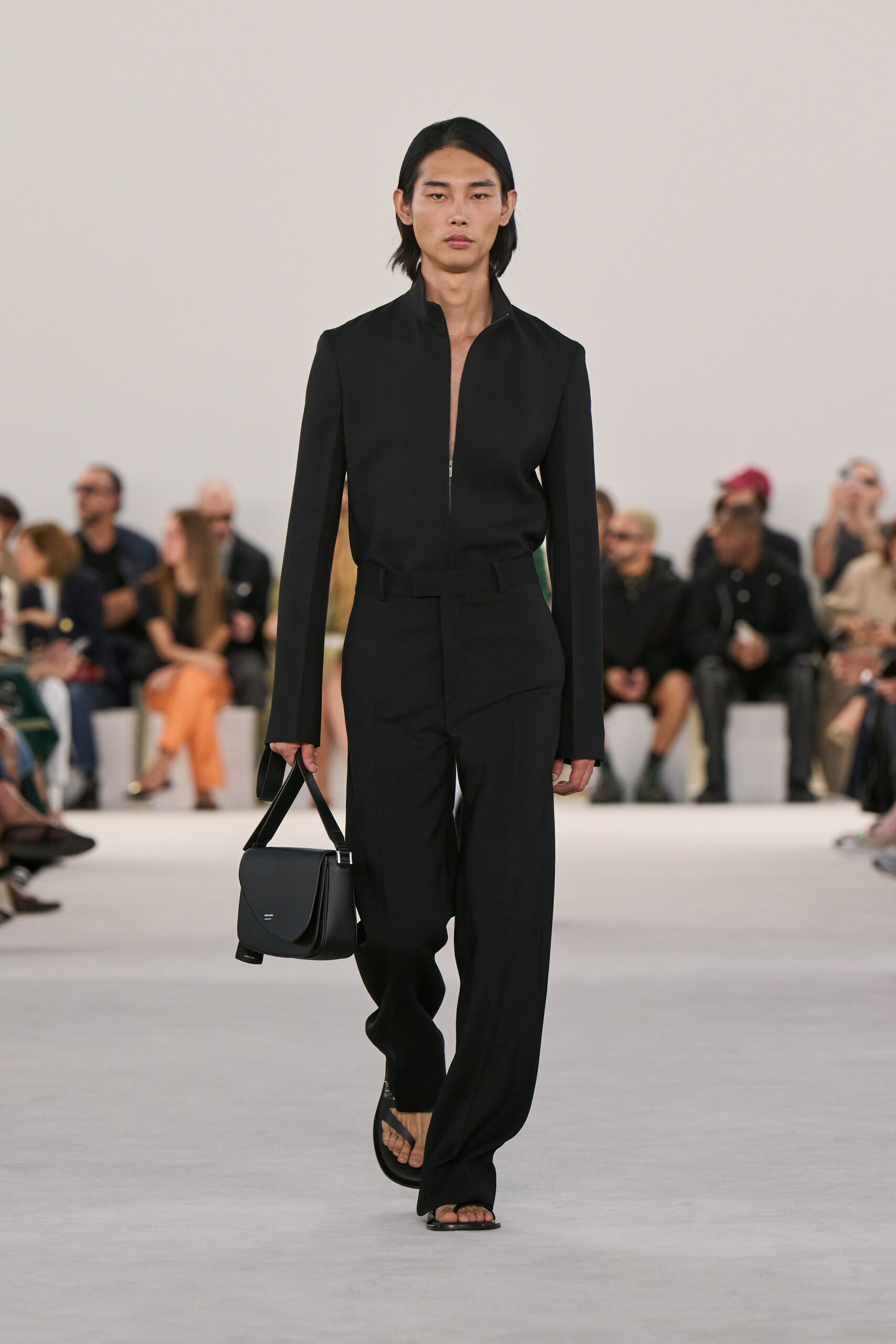 Dans les chaussures, l’approche de Davis se marie avec l’artisanat de Ferragamo : des chaussures en nappa latex et des bottes en cuir de gaucho reflètent ses inclinations esthétiques. Le talon « Calypso » de 1955 est réinterprété avec une impression 3D et une finition galvanisée. Pour les hommes, les classiques sont revisités avec une touche contemporaine.
