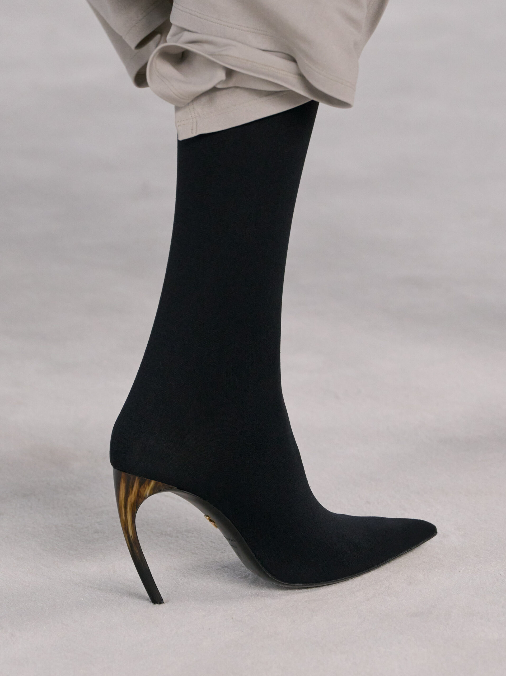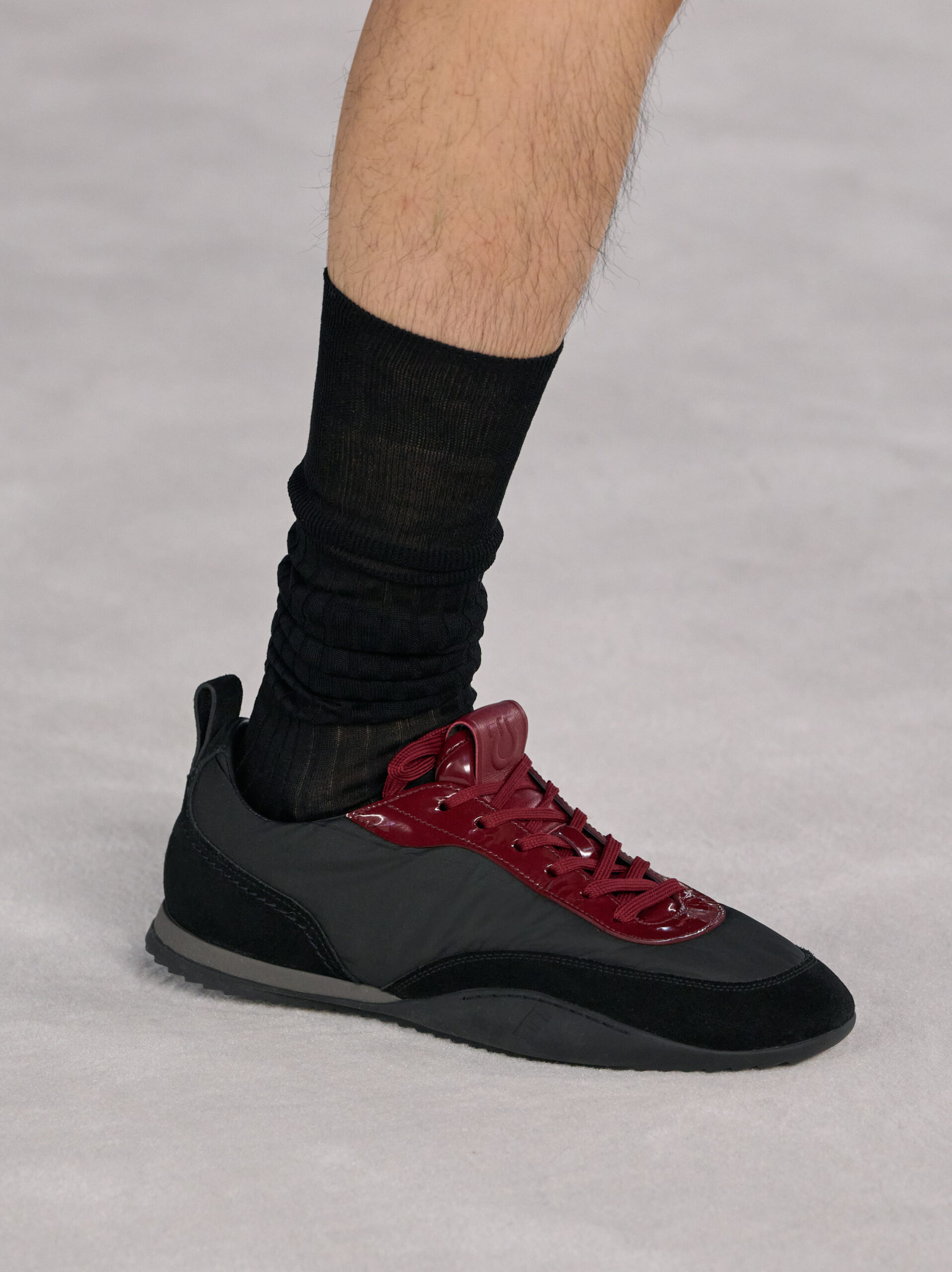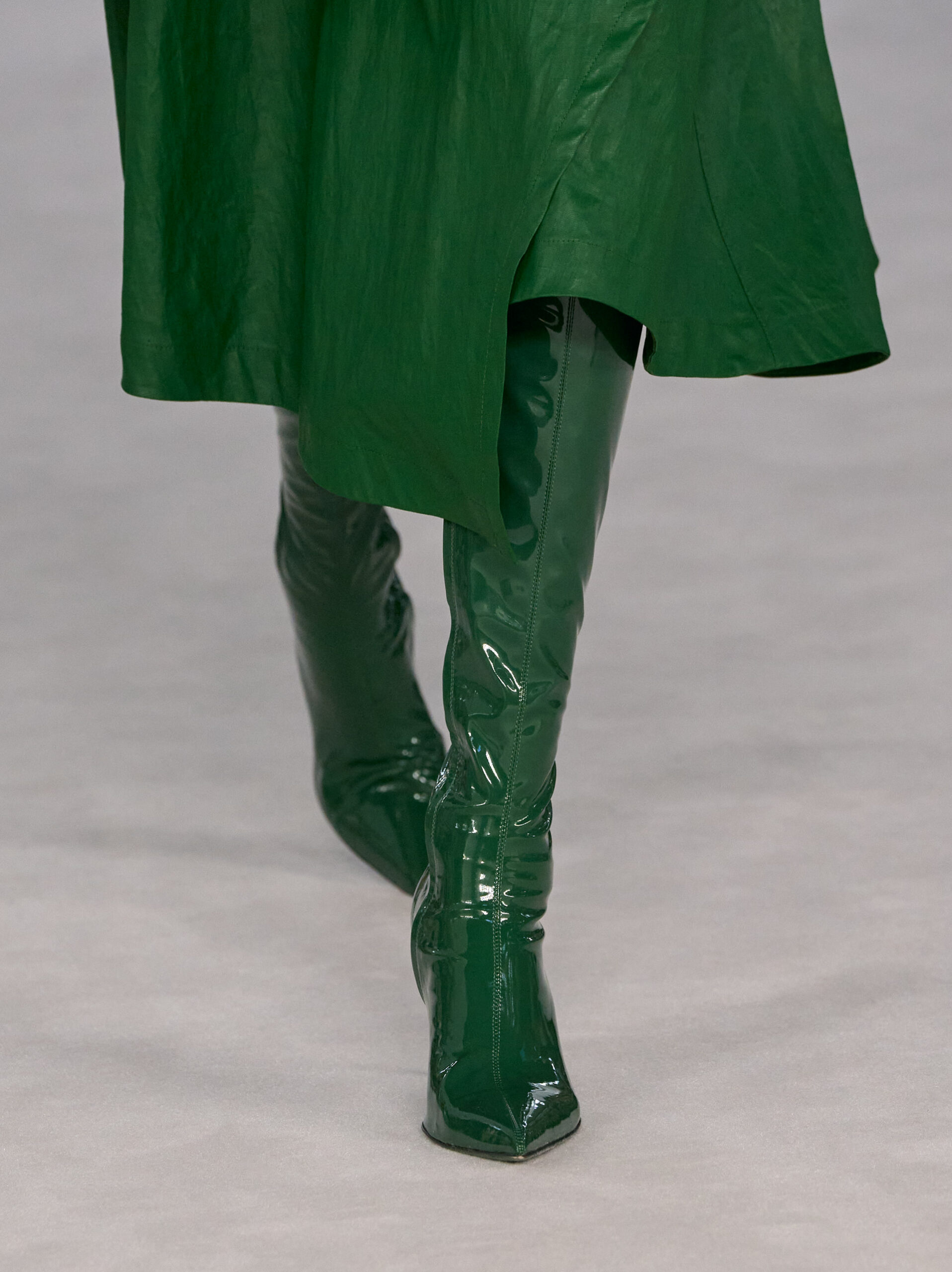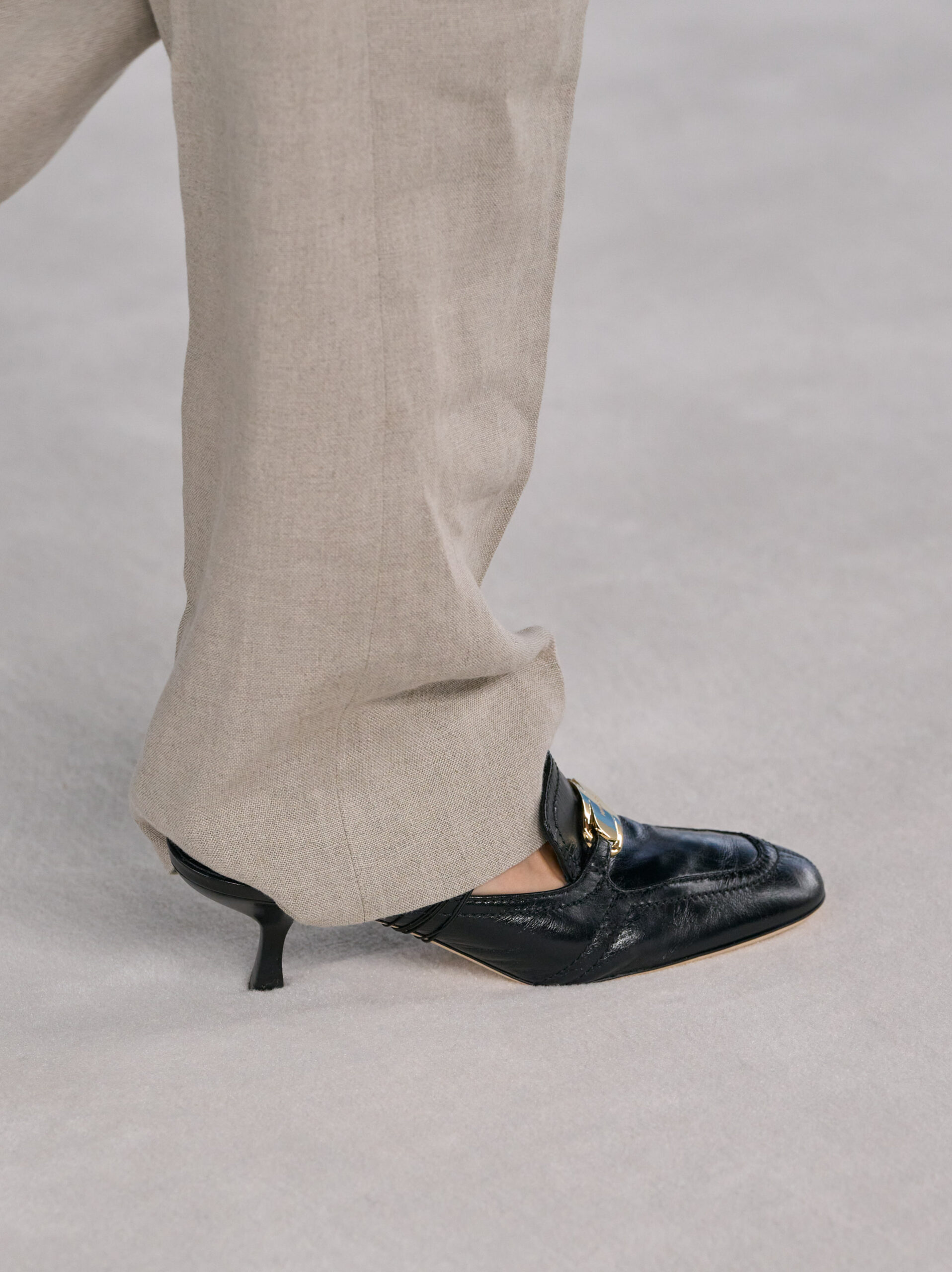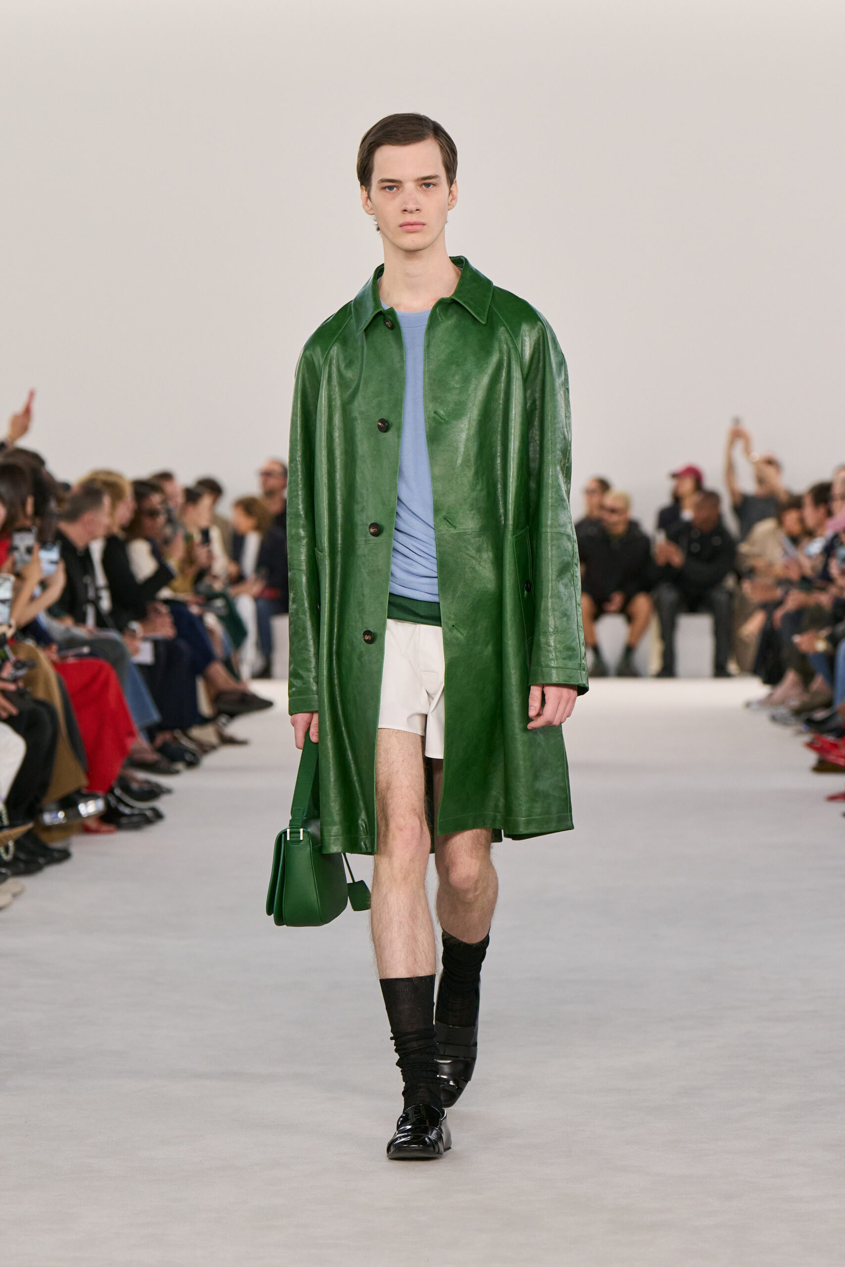 Dans les chaussures, l’approche de Davis se marie avec l’artisanat de Ferragamo : des chaussures en nappa latex et des bottes en cuir de gaucho reflètent ses inclinations esthétiques. Le talon « Calypso » de 1955 est réinterprété avec une impression 3D et une finition galvanisée. Pour les hommes, les classiques sont revisités avec une touche contemporaine.