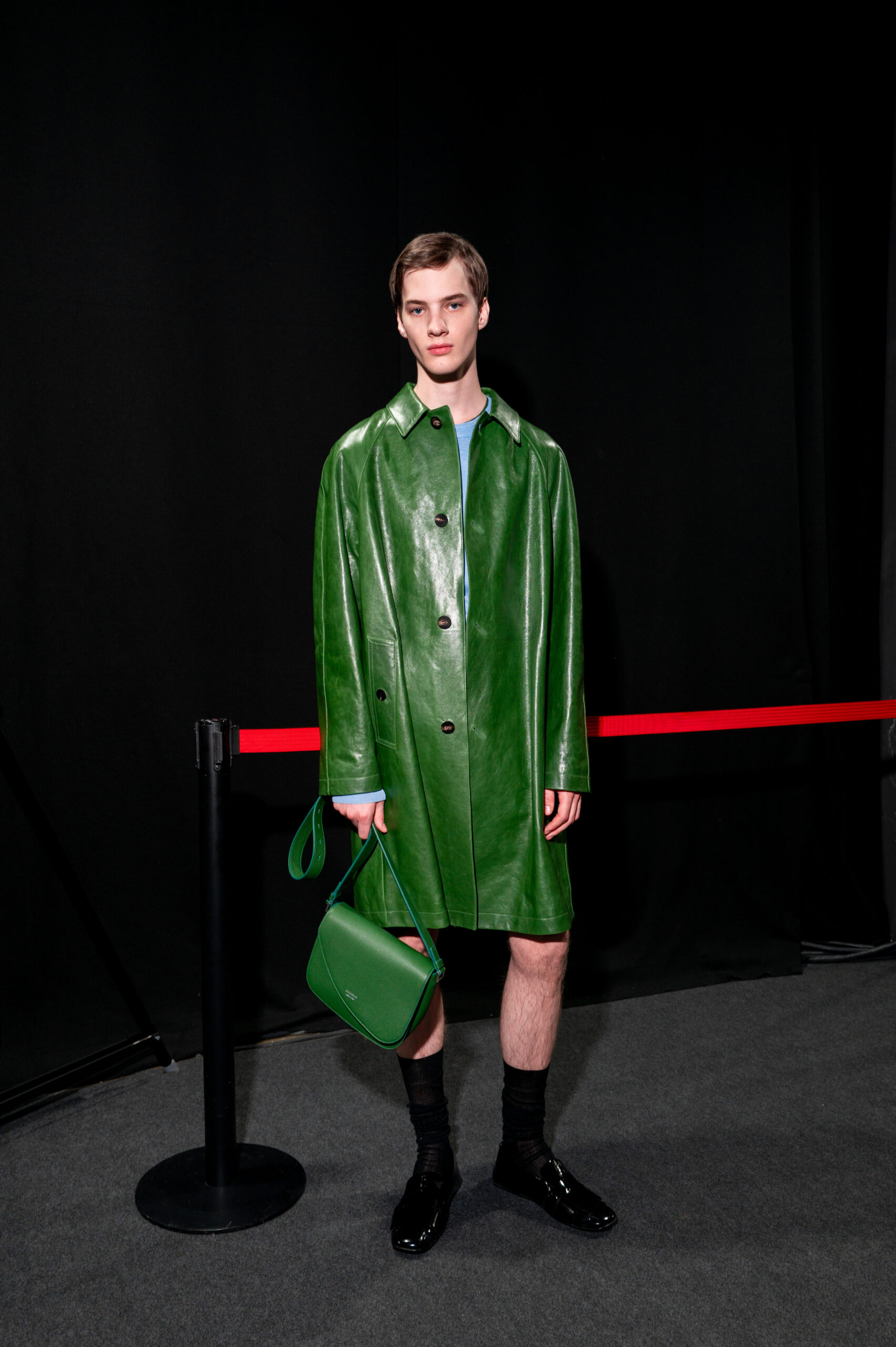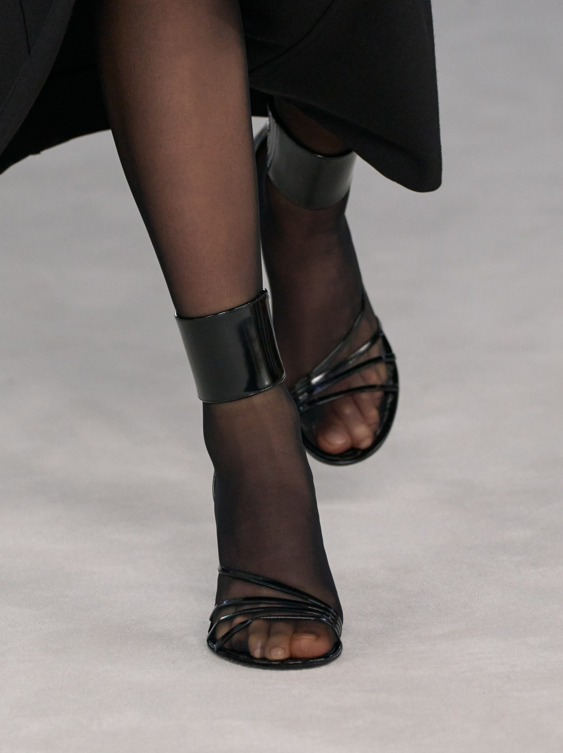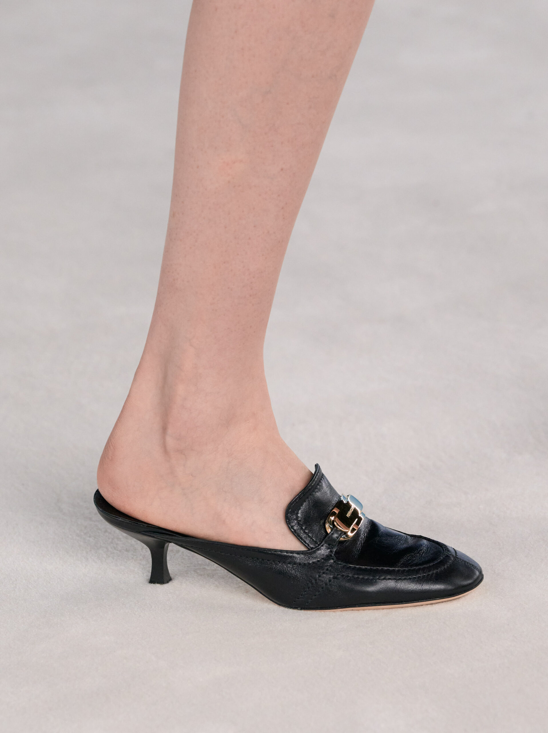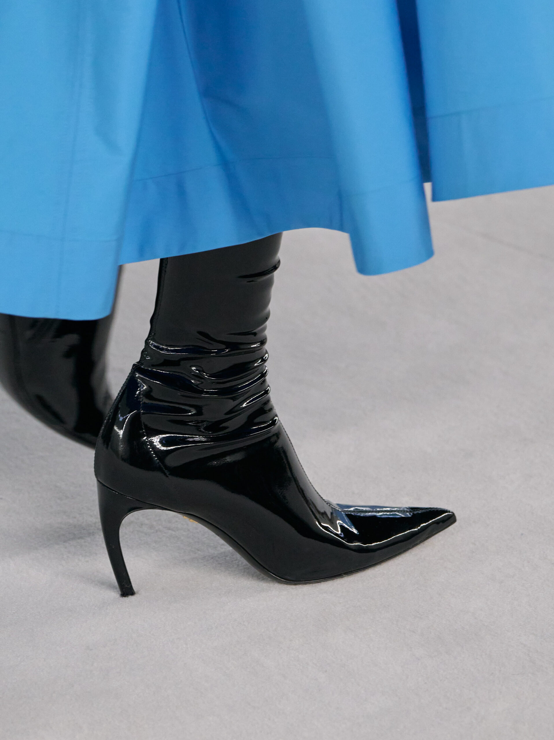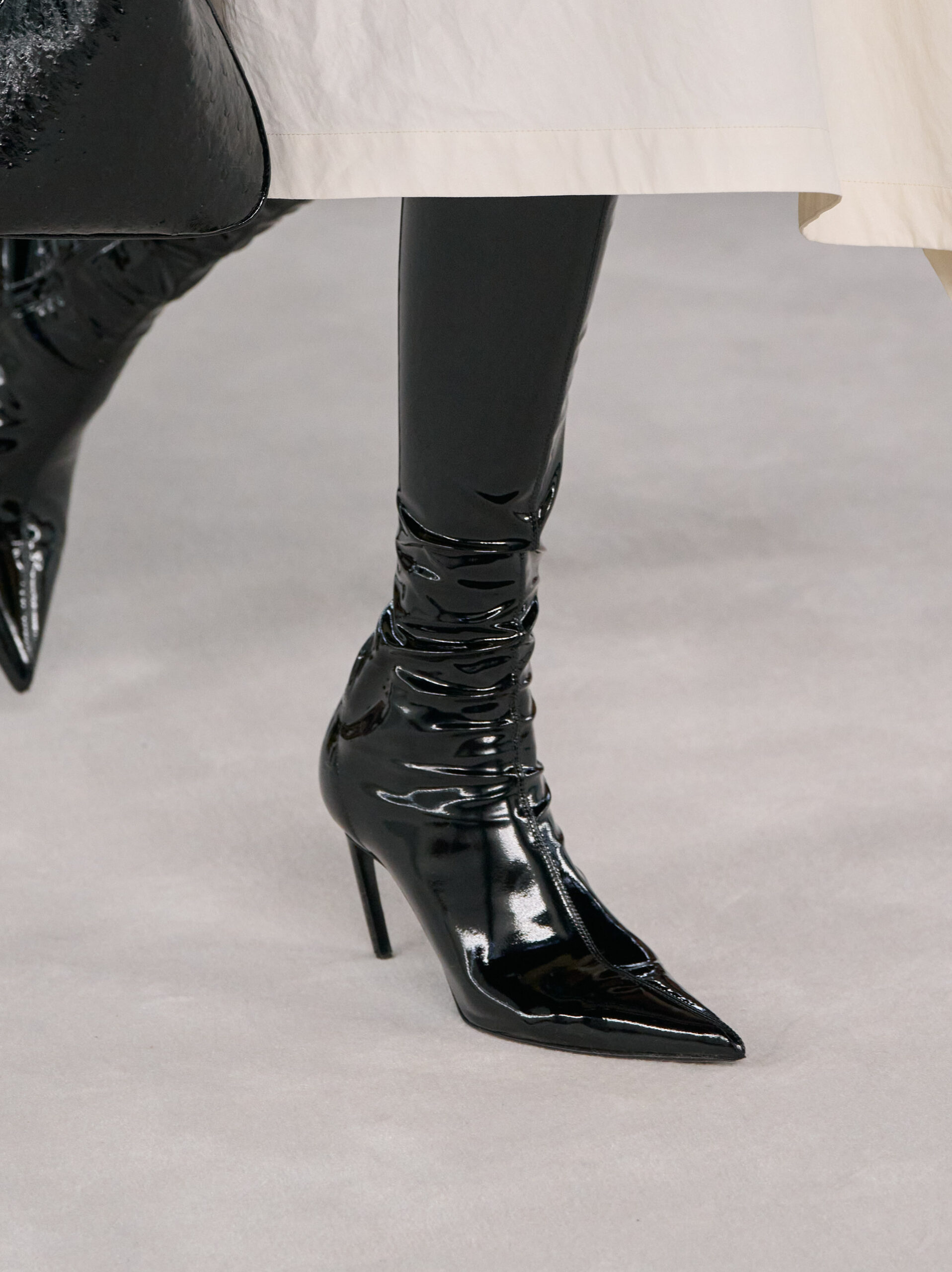 Dans les chaussures, l’approche de Davis se marie avec l’artisanat de Ferragamo : des chaussures en nappa latex et des bottes en cuir de gaucho reflètent ses inclinations esthétiques. Le talon « Calypso » de 1955 est réinterprété avec une impression 3D et une finition galvanisée. Pour les hommes, les classiques sont revisités avec une touche contemporaine.