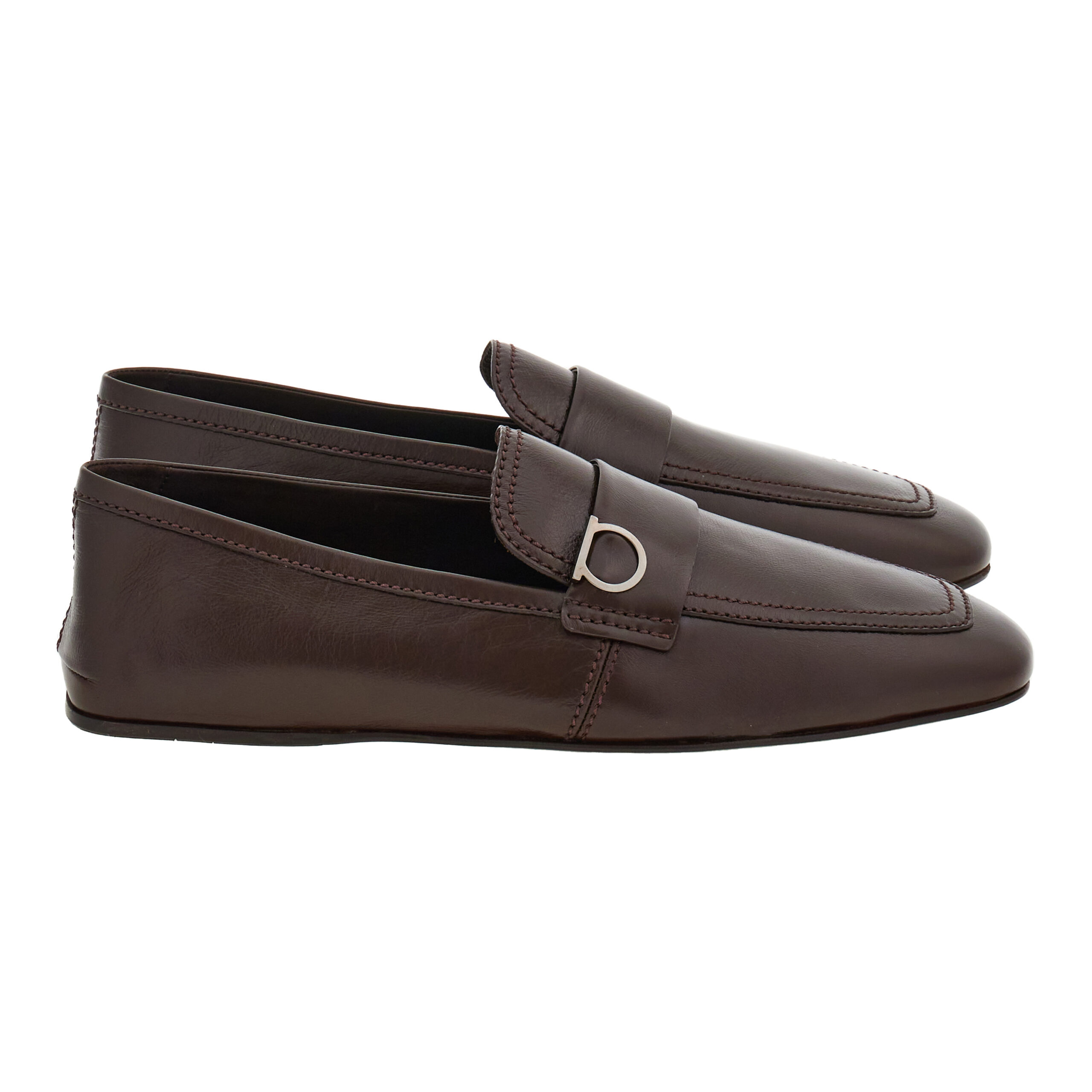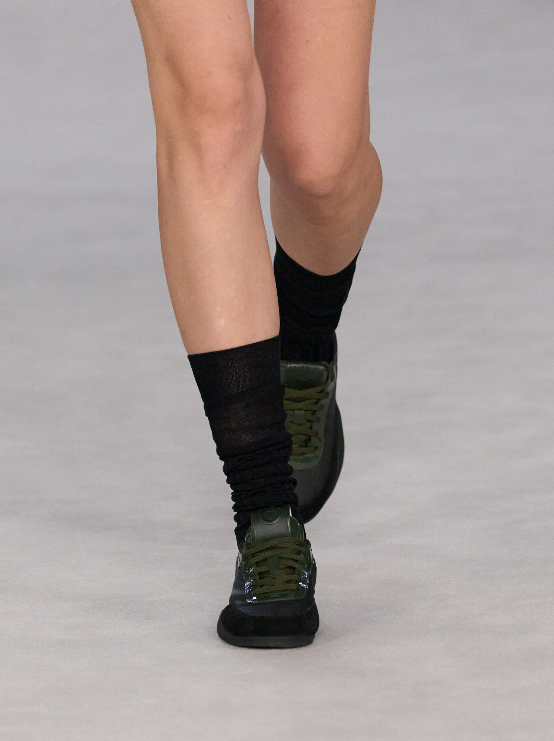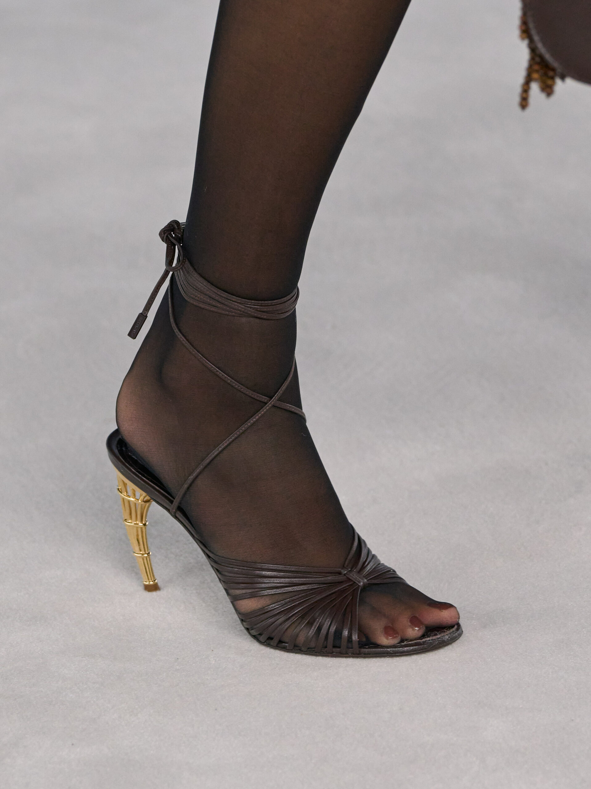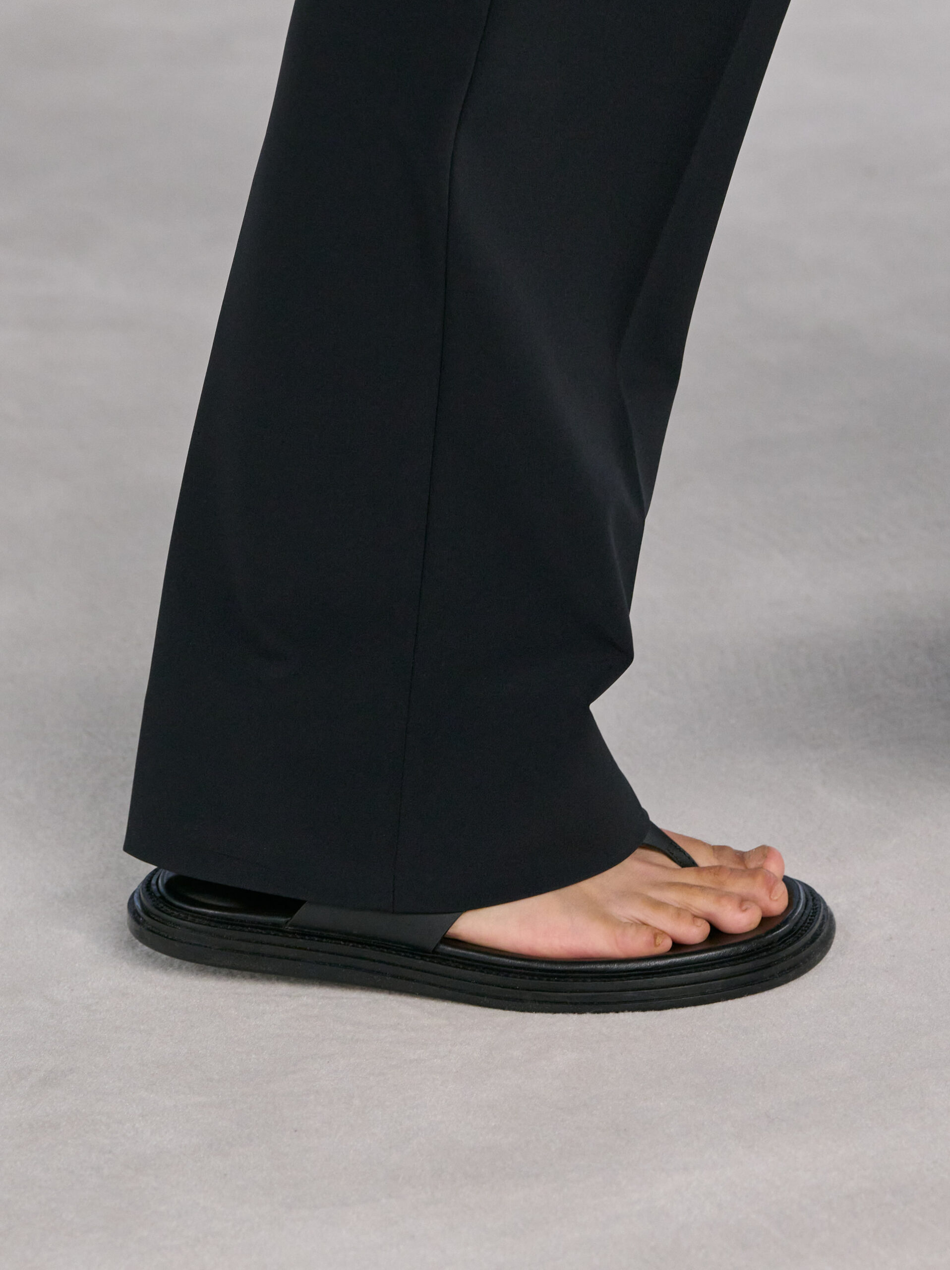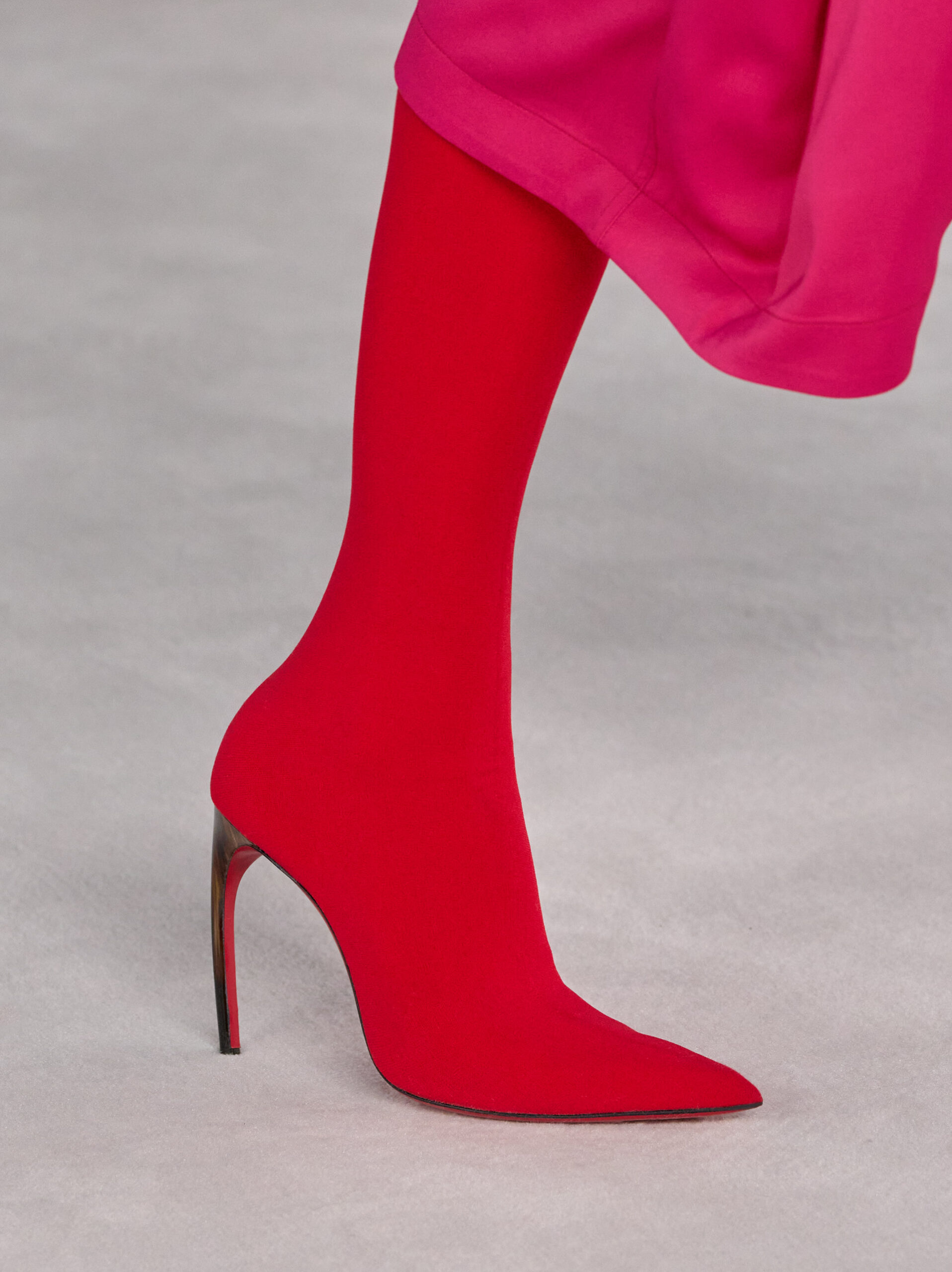 Dans les chaussures, l’approche de Davis se marie avec l’artisanat de Ferragamo : des chaussures en nappa latex et des bottes en cuir de gaucho reflètent ses inclinations esthétiques. Le talon « Calypso » de 1955 est réinterprété avec une impression 3D et une finition galvanisée. Pour les hommes, les classiques sont revisités avec une touche contemporaine.