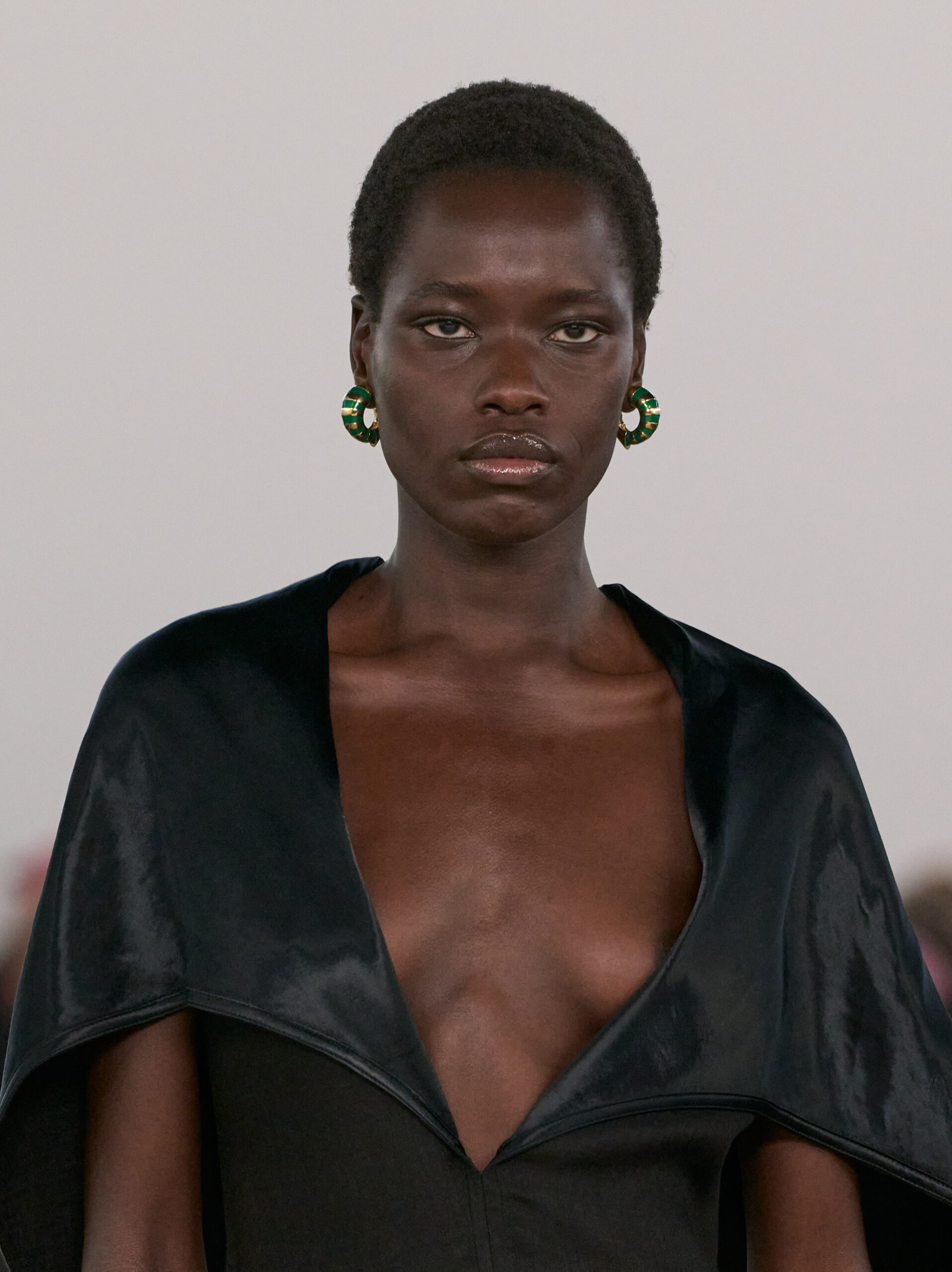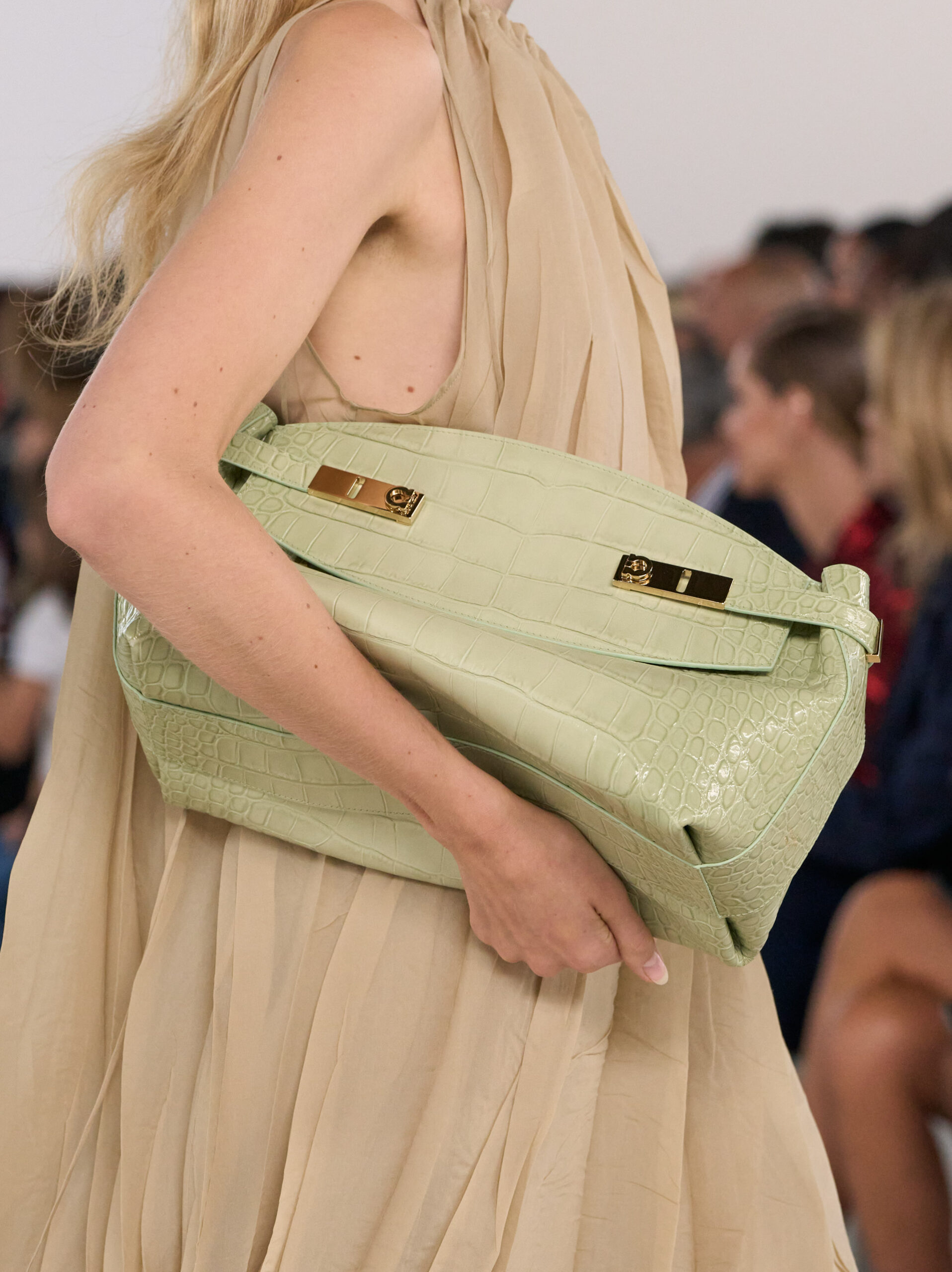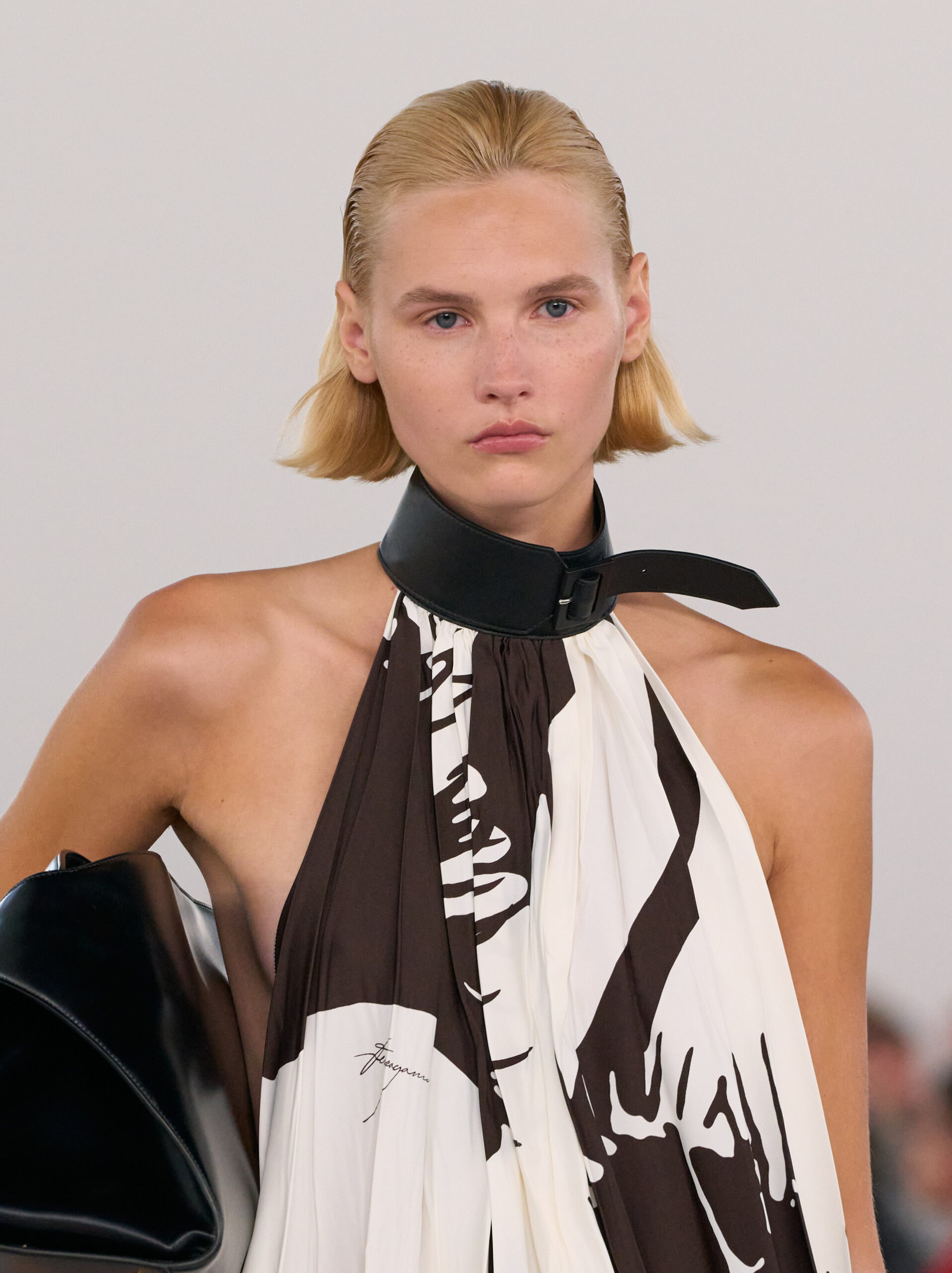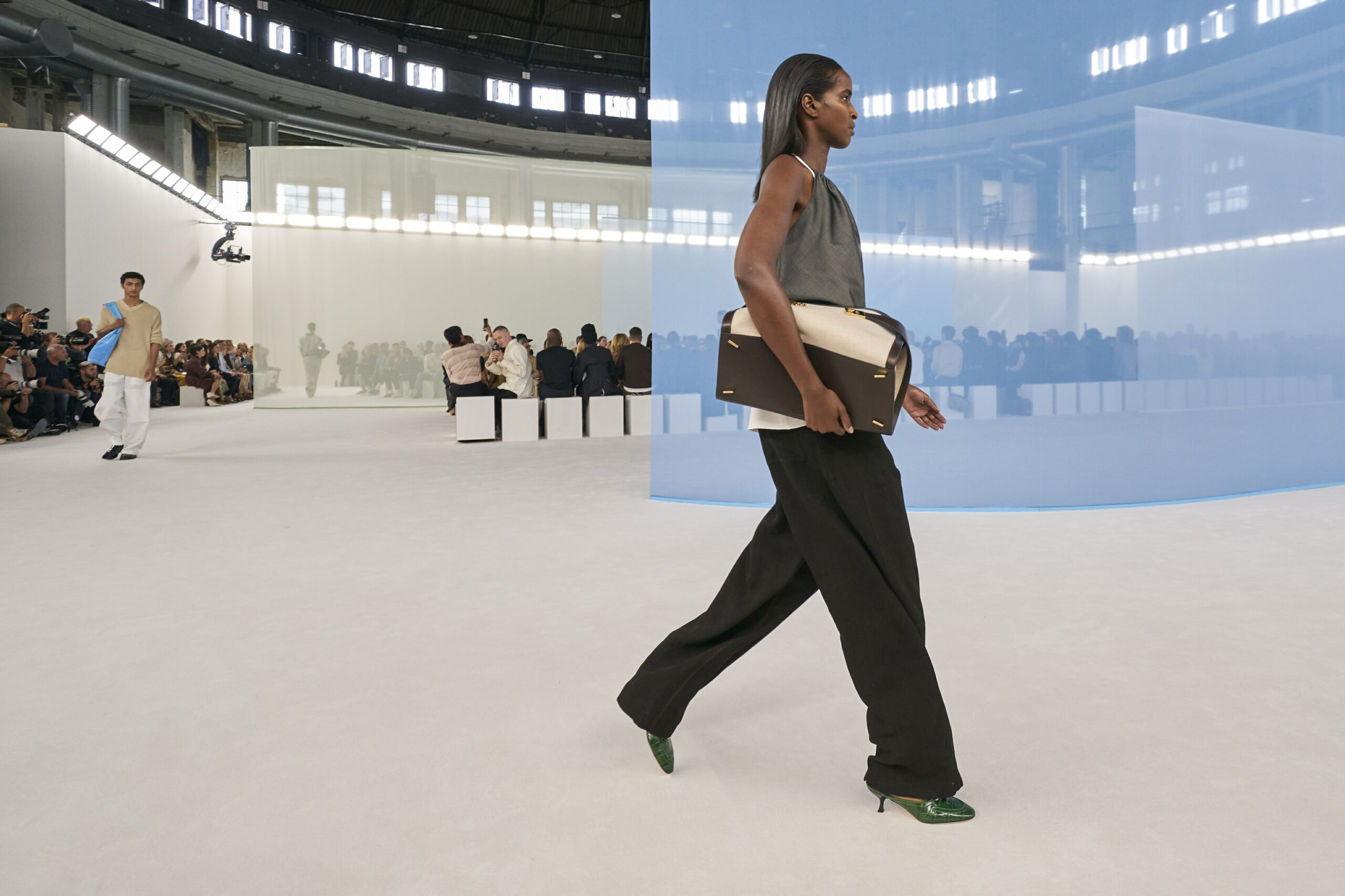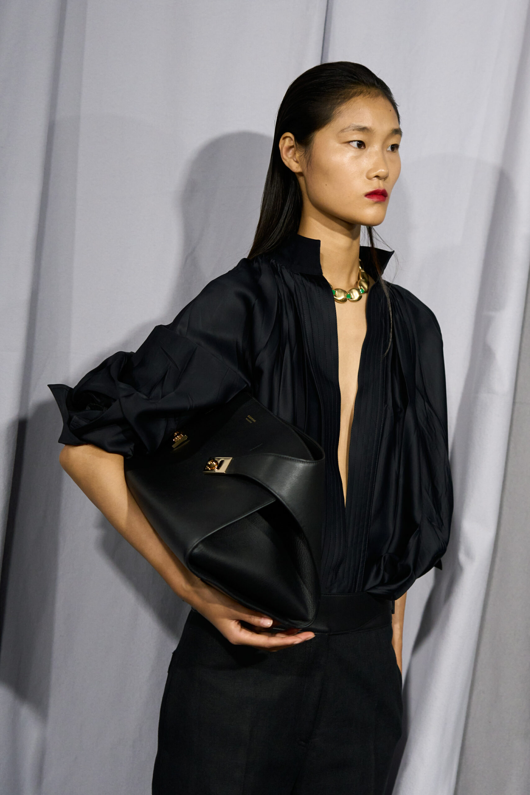 La collection joue sur un équilibre entre retenue et liberté : une insouciance décontractée se manifeste dans la texture usée du cuir, tandis que la taille de haute couture du milieu du siècle est transformée en fluidité. Les drapés en jersey de viscose, ancrés dans l’héritage florentin de Ferragamo et évoquant la robe caribéenne du 18ème siècle, sont maintenant associés à l’esthétique de l’armure de la Renaissance.