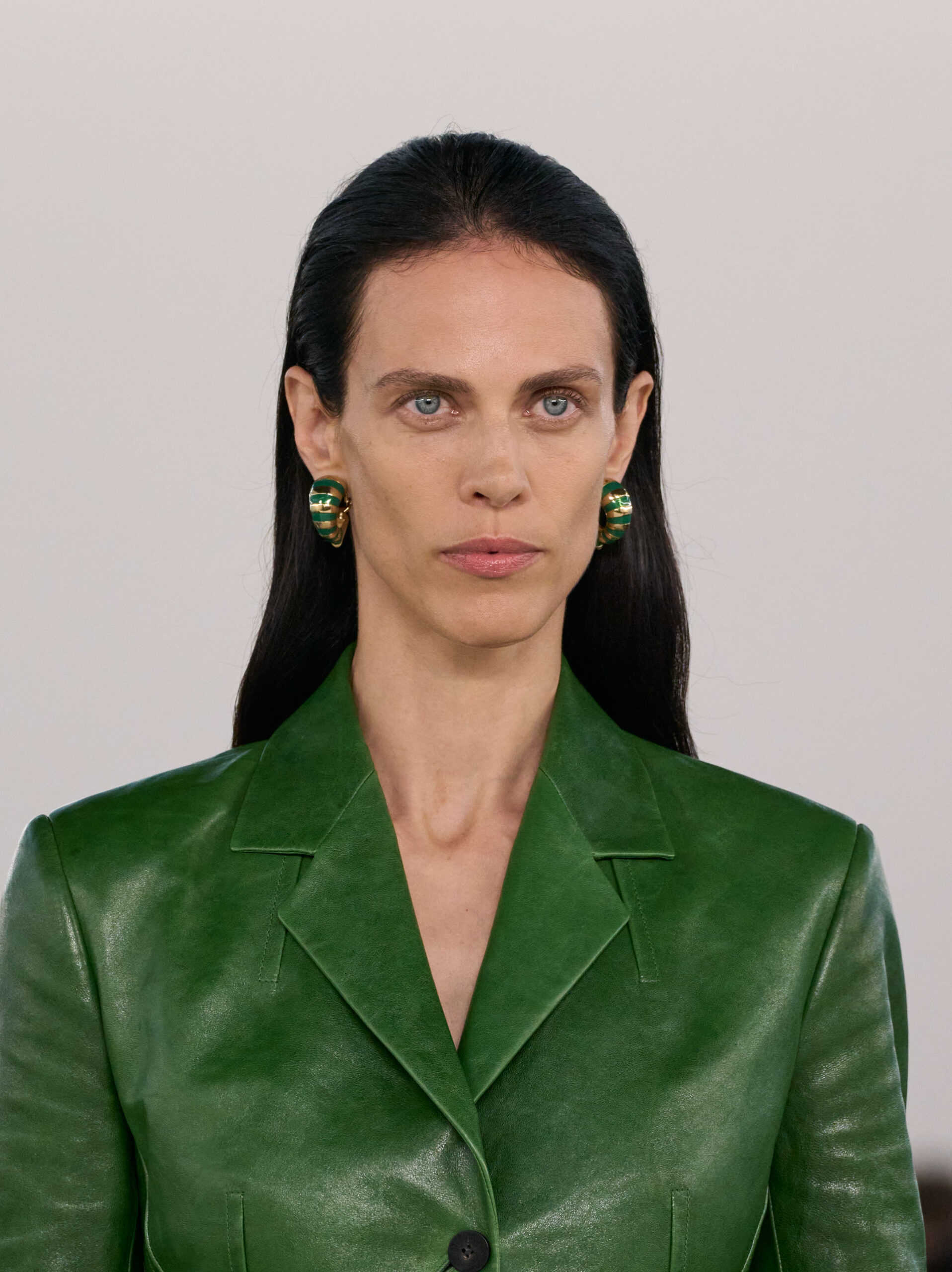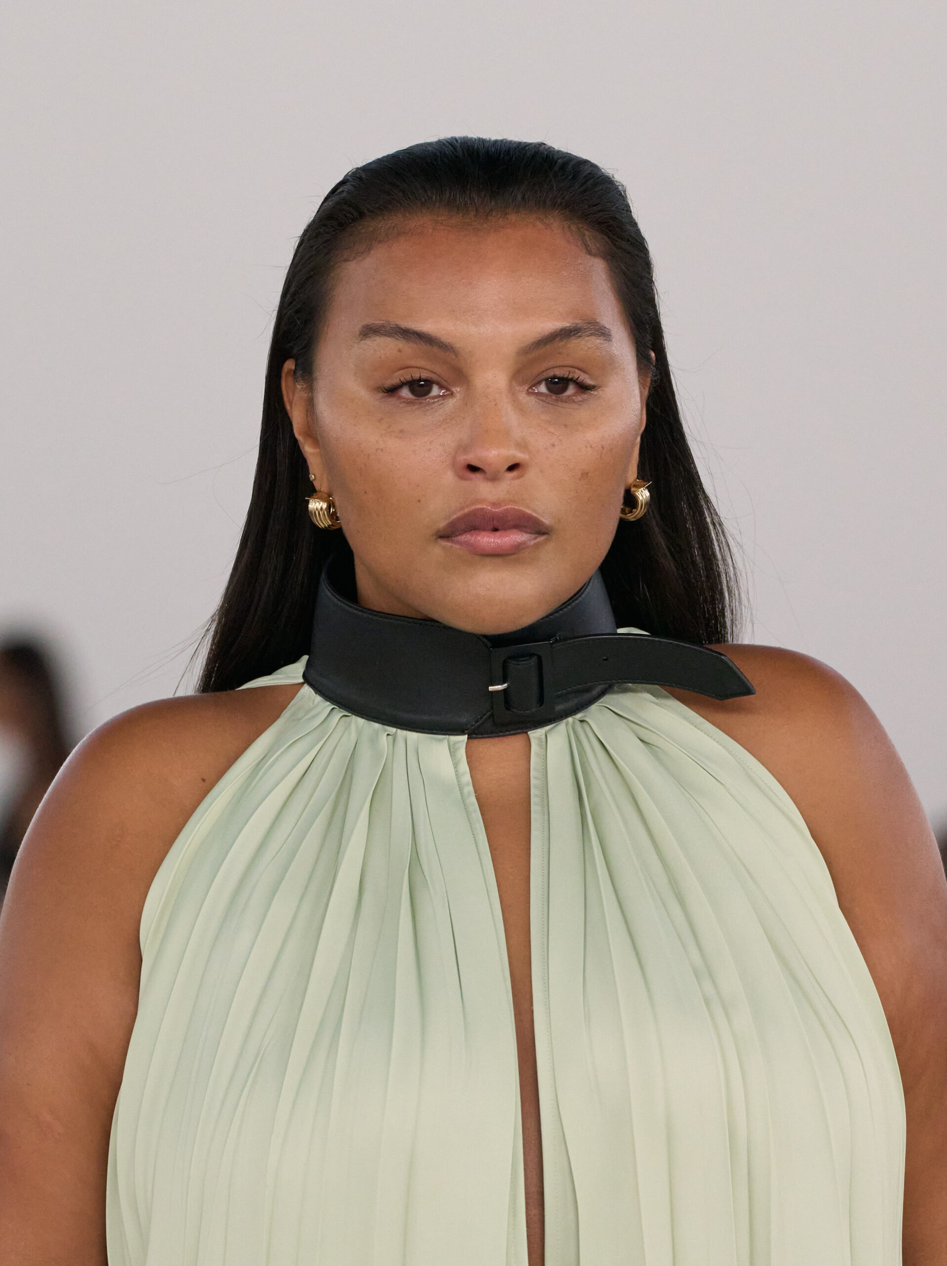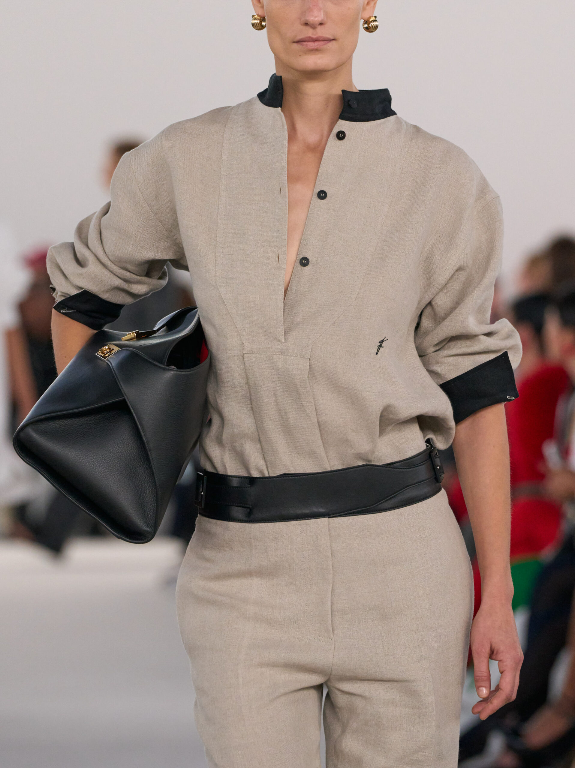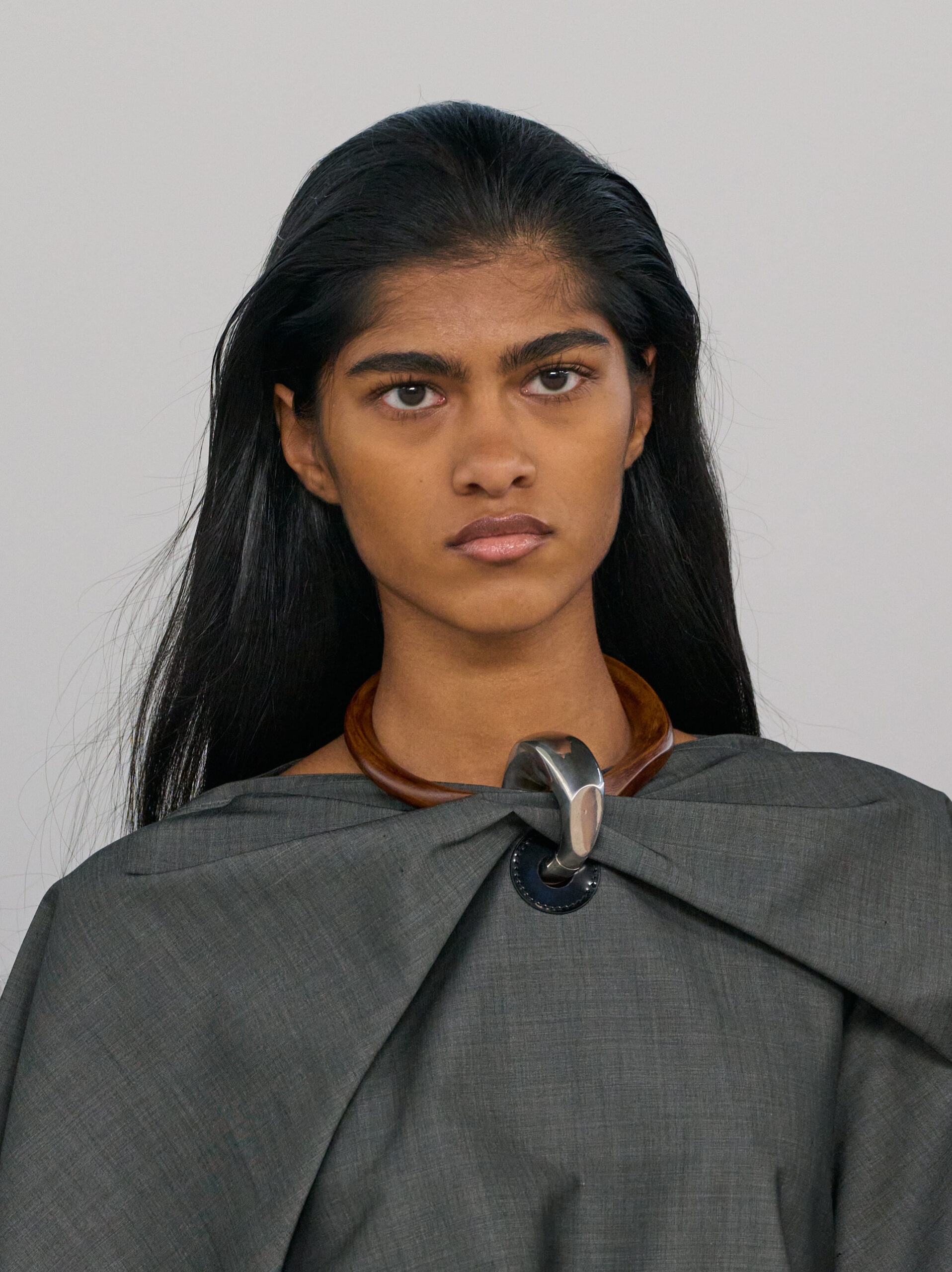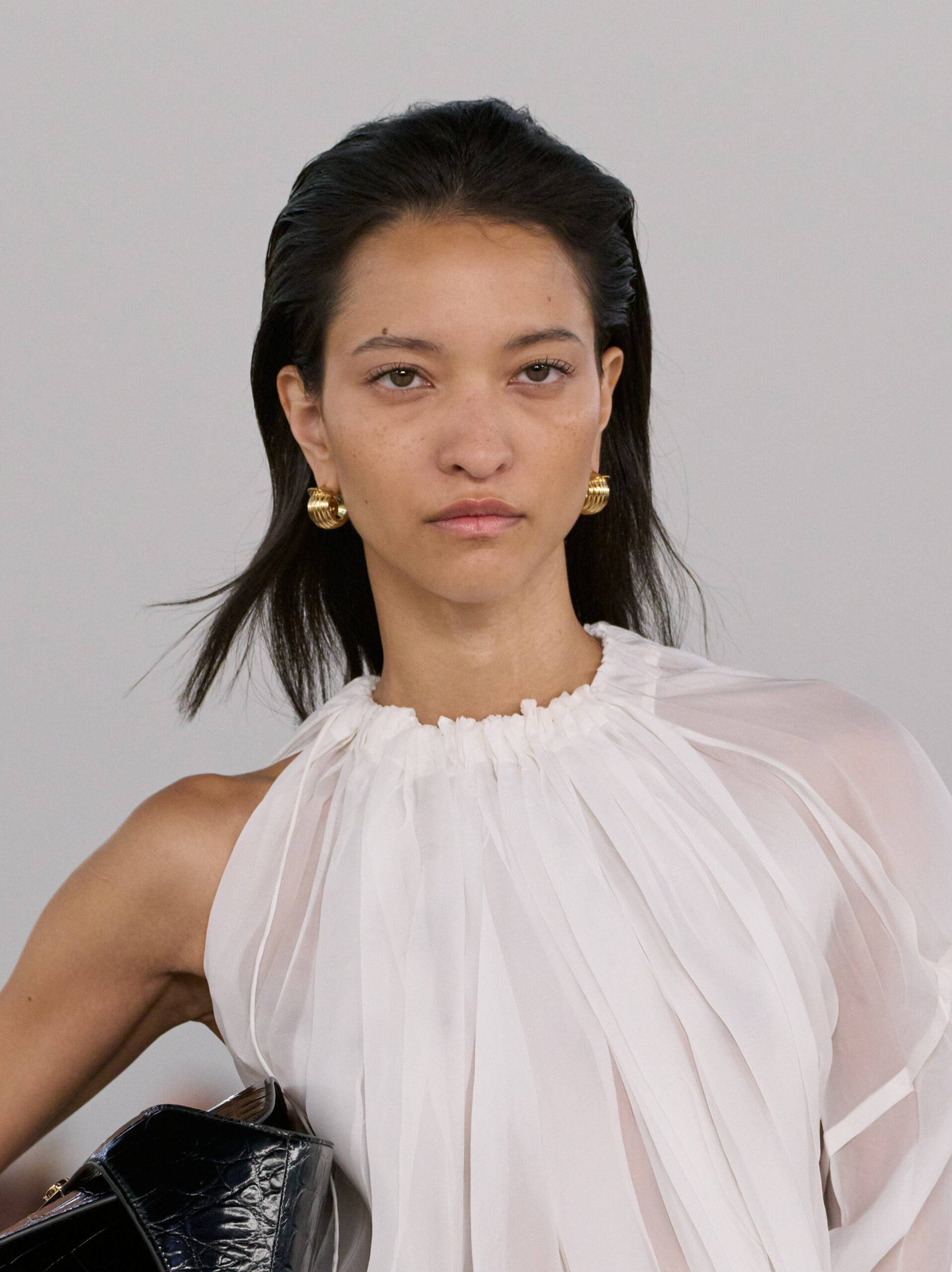 La collection joue sur un équilibre entre retenue et liberté : une insouciance décontractée se manifeste dans la texture usée du cuir, tandis que la taille de haute couture du milieu du siècle est transformée en fluidité. Les drapés en jersey de viscose, ancrés dans l’héritage florentin de Ferragamo et évoquant la robe caribéenne du 18ème siècle, sont maintenant associés à l’esthétique de l’armure de la Renaissance.