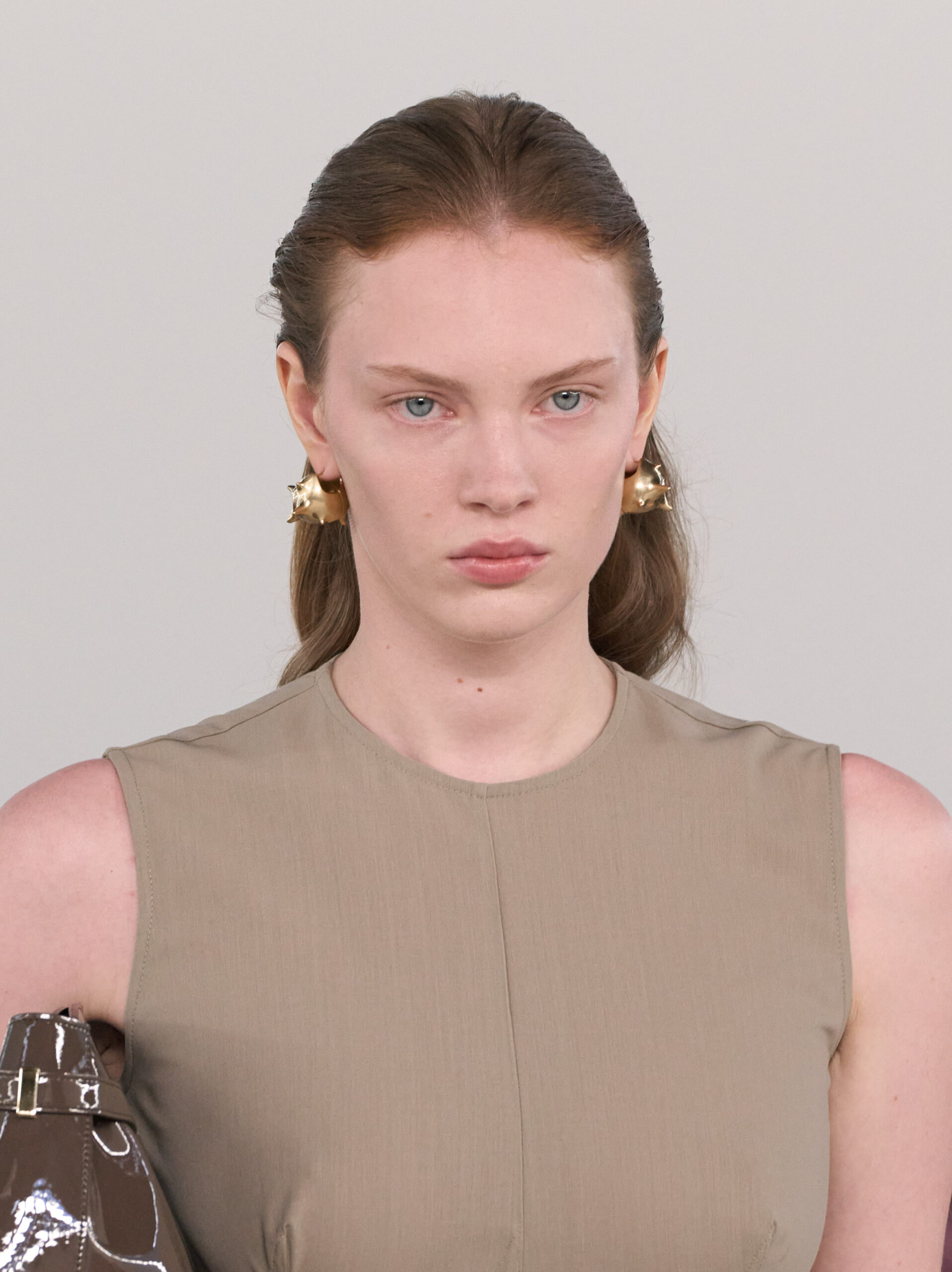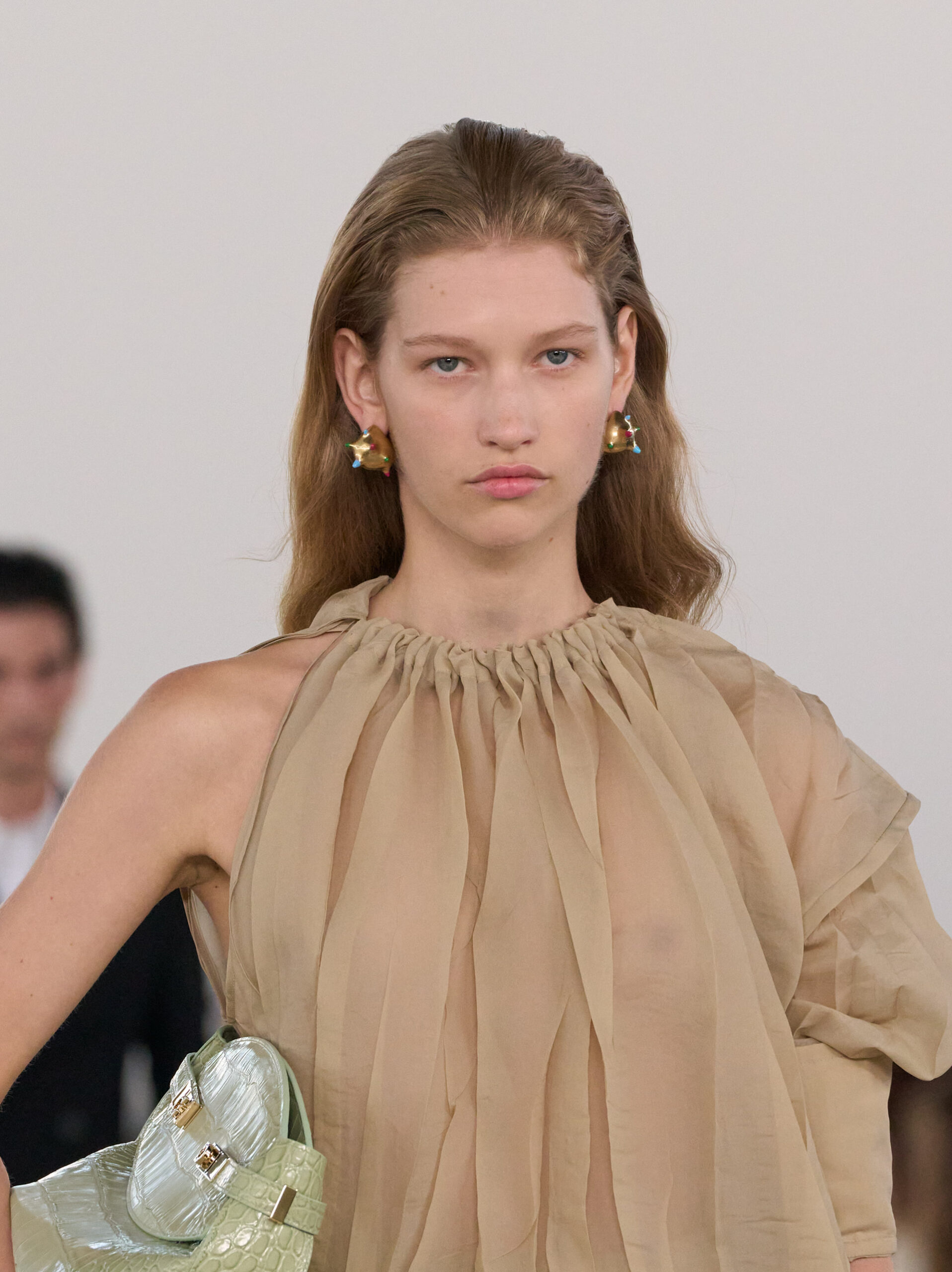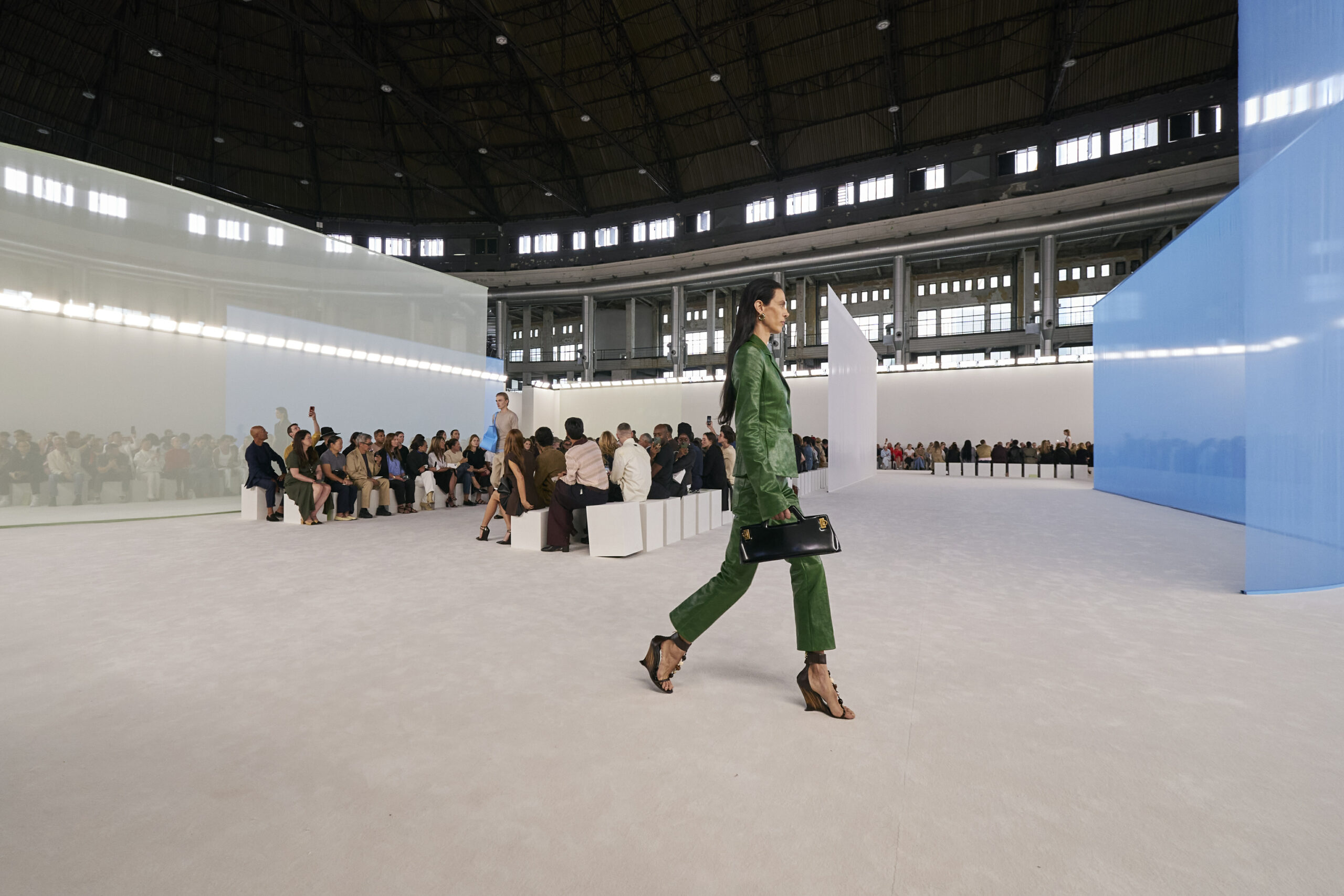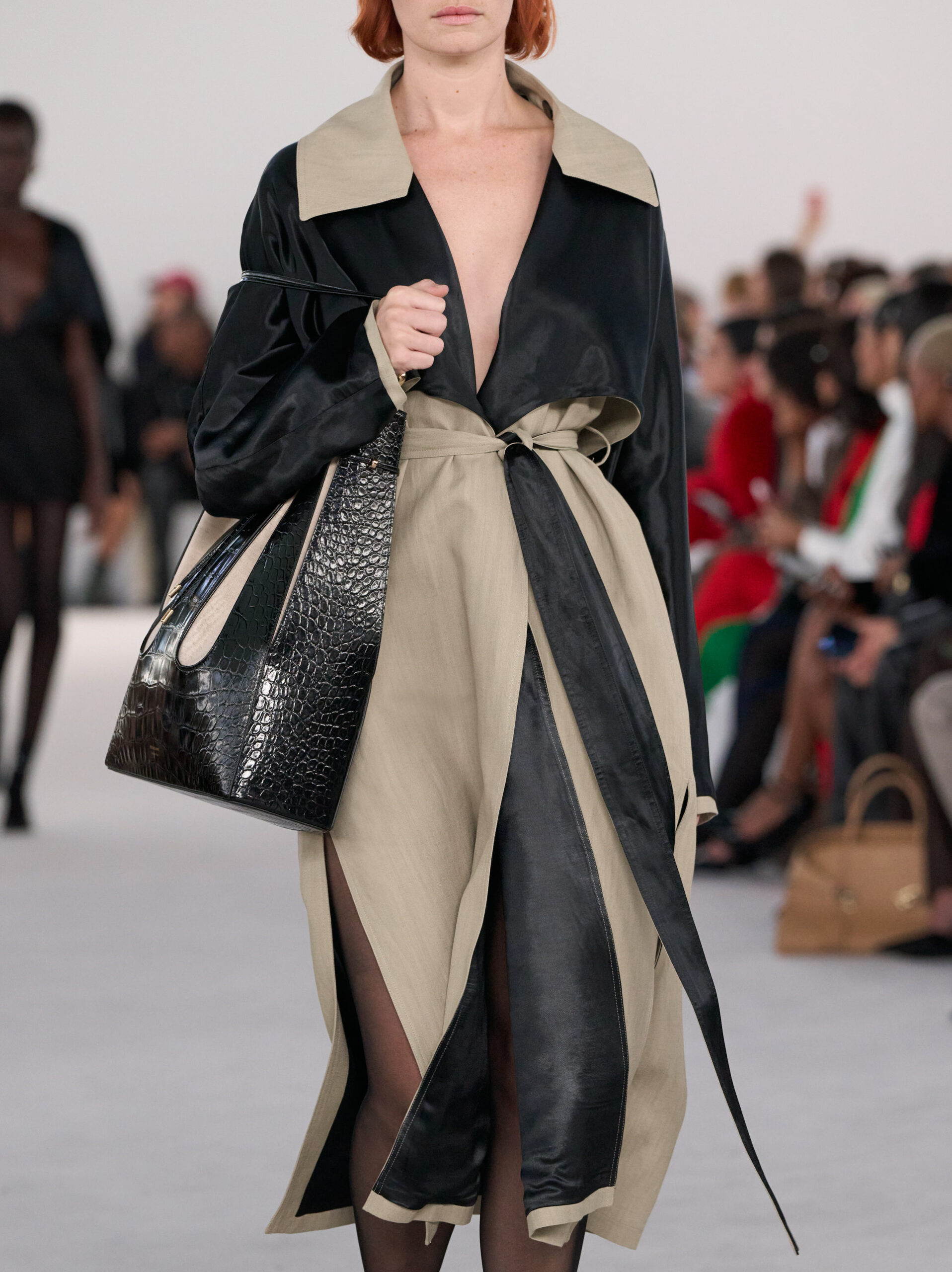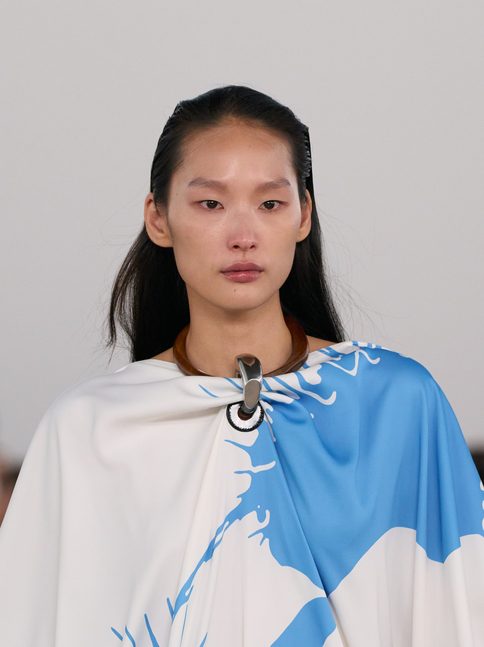 La collection joue sur un équilibre entre retenue et liberté : une insouciance décontractée se manifeste dans la texture usée du cuir, tandis que la taille de haute couture du milieu du siècle est transformée en fluidité. Les drapés en jersey de viscose, ancrés dans l’héritage florentin de Ferragamo et évoquant la robe caribéenne du 18ème siècle, sont maintenant associés à l’esthétique de l’armure de la Renaissance.
