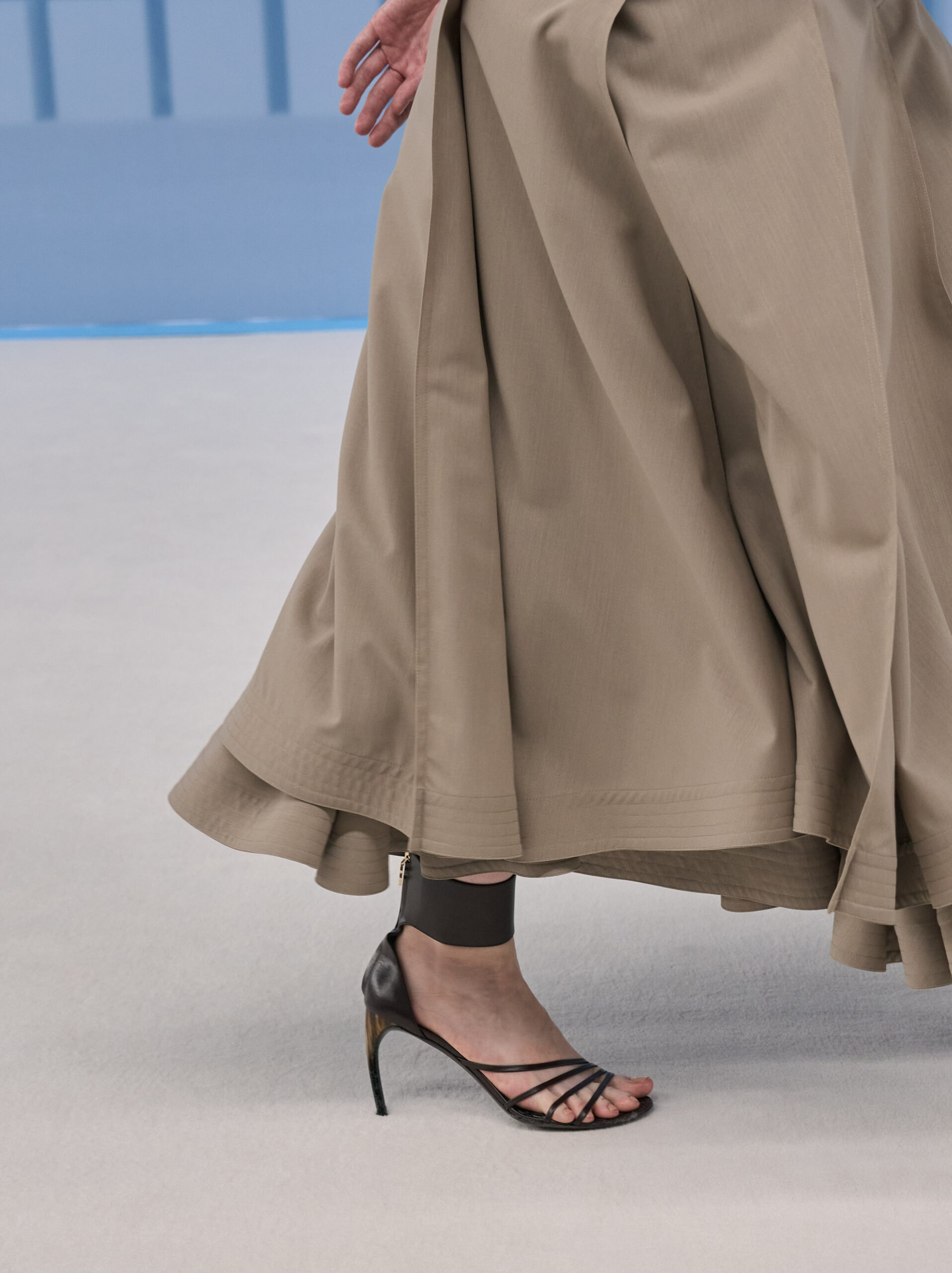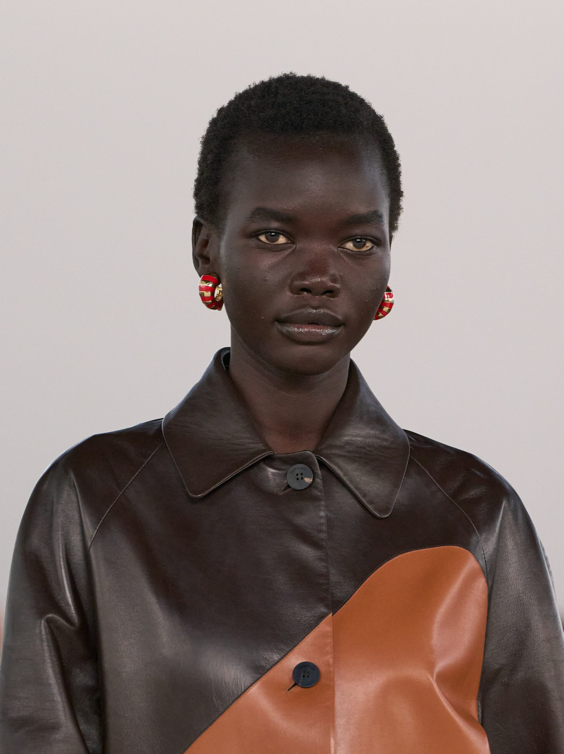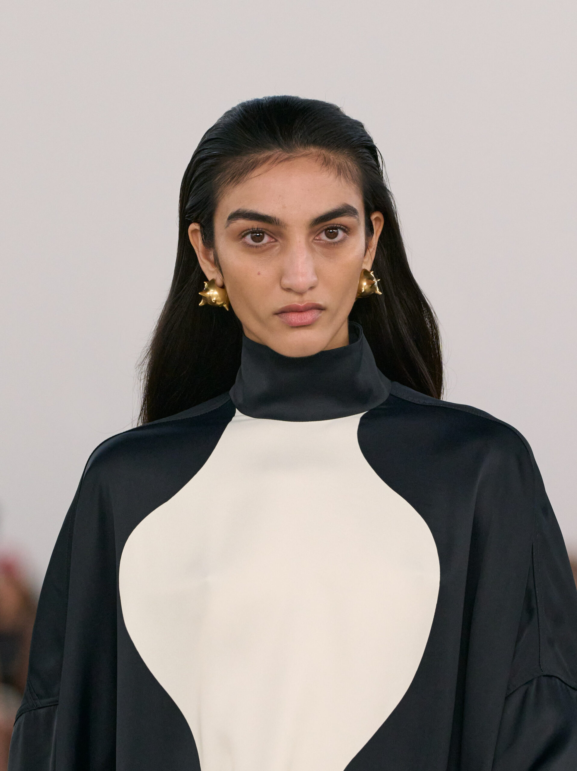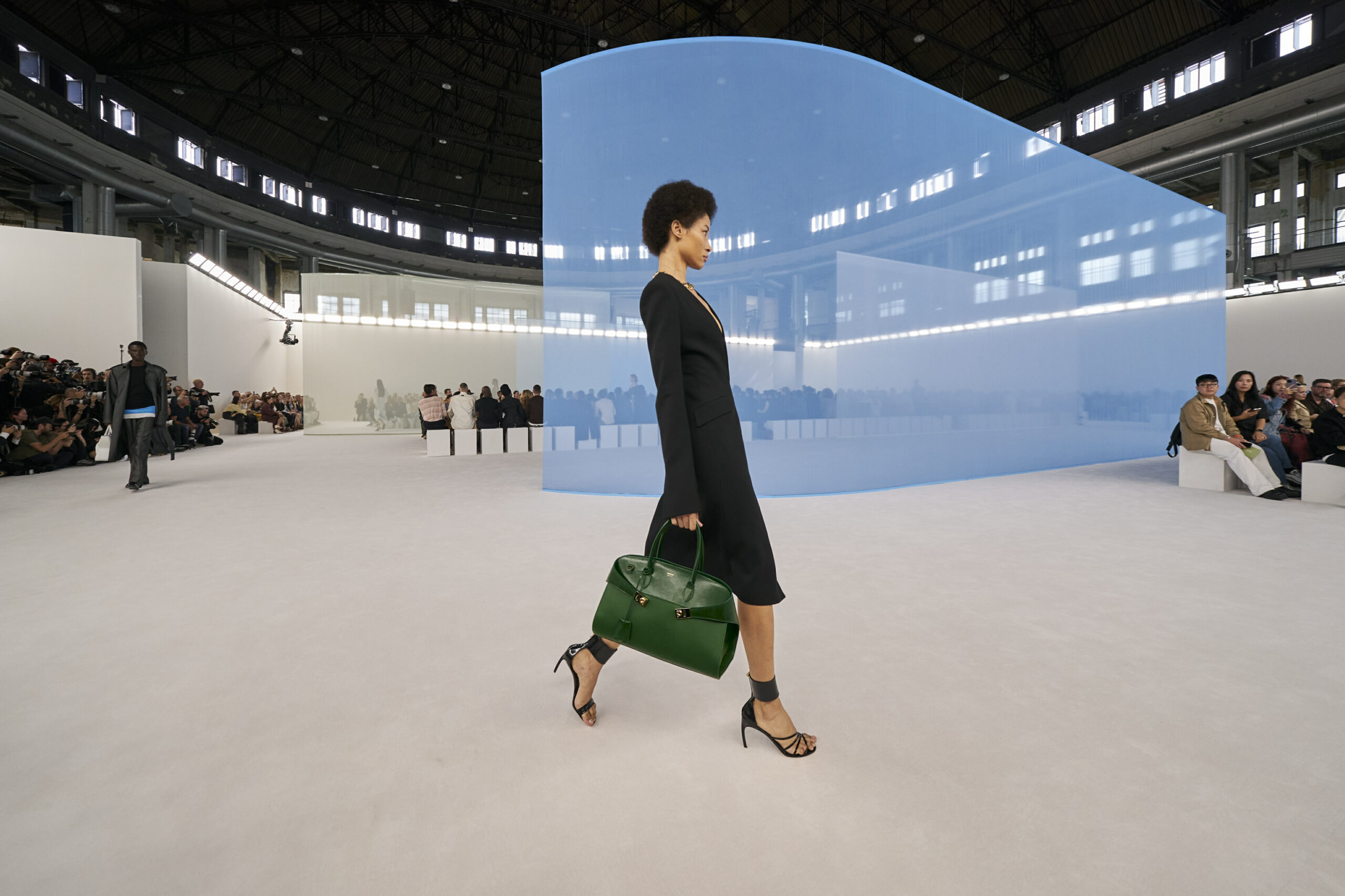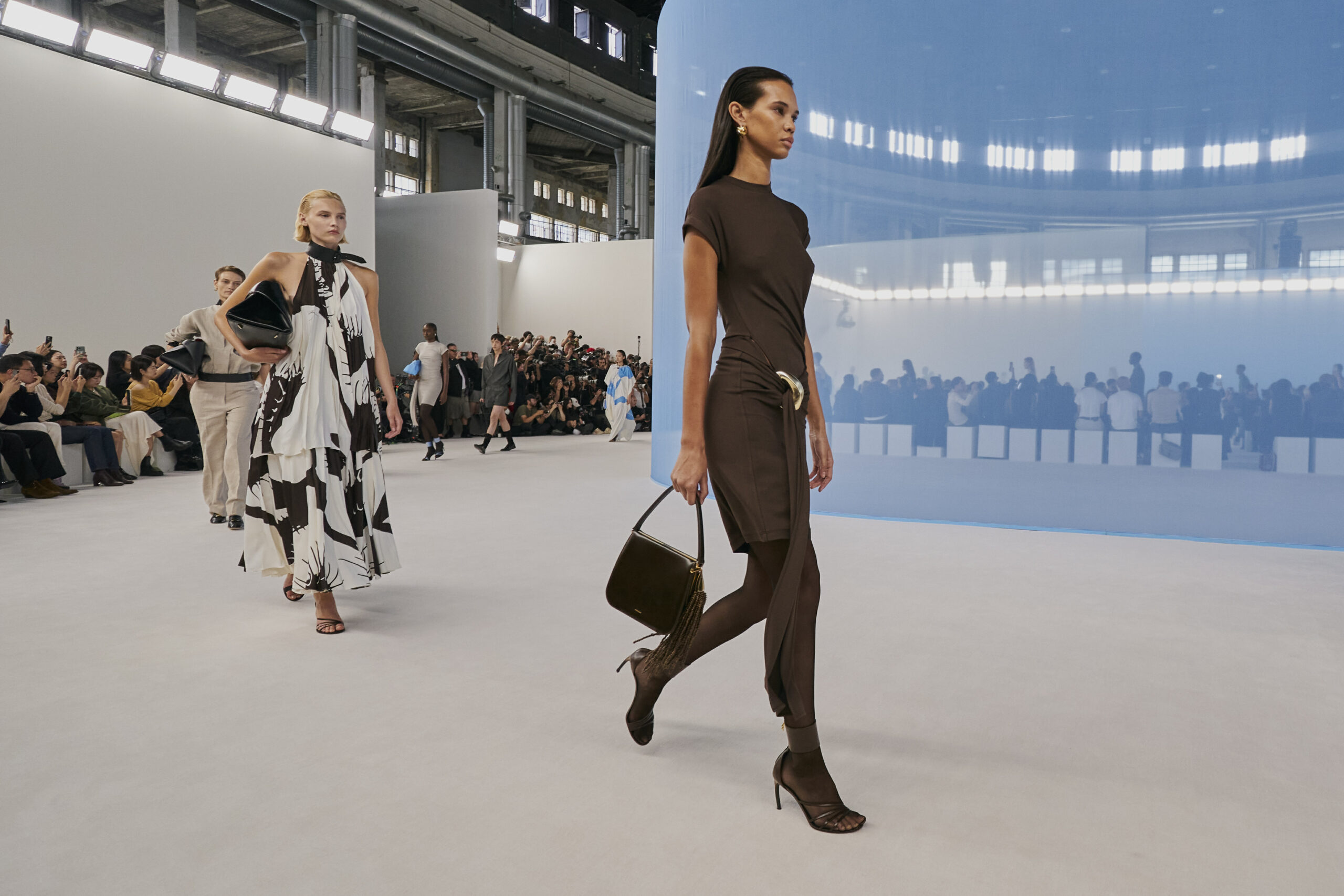 La collection joue sur un équilibre entre retenue et liberté : une insouciance décontractée se manifeste dans la texture usée du cuir, tandis que la taille de haute couture du milieu du siècle est transformée en fluidité. Les drapés en jersey de viscose, ancrés dans l’héritage florentin de Ferragamo et évoquant la robe caribéenne du 18ème siècle, sont maintenant associés à l’esthétique de l’armure de la Renaissance.
