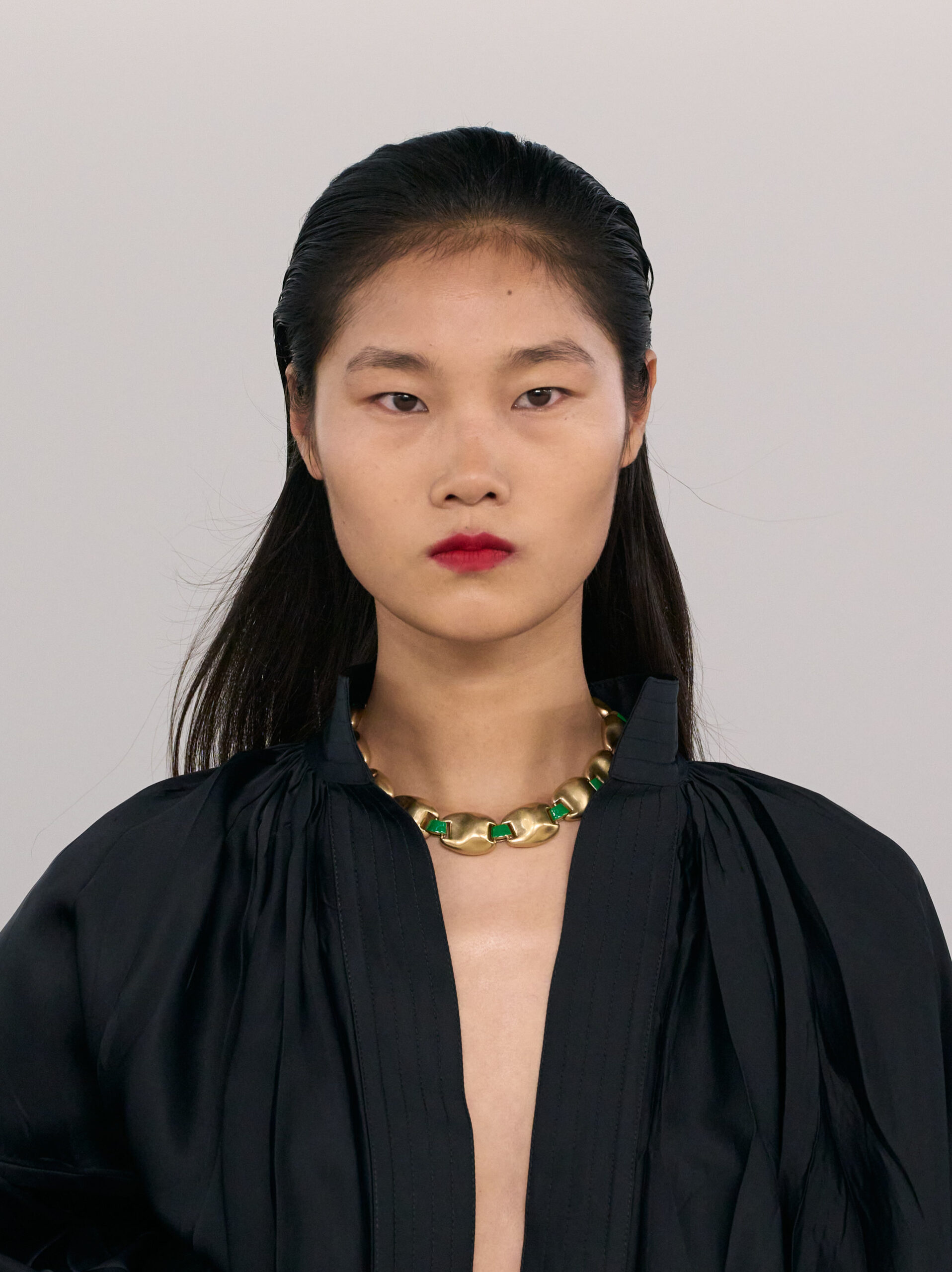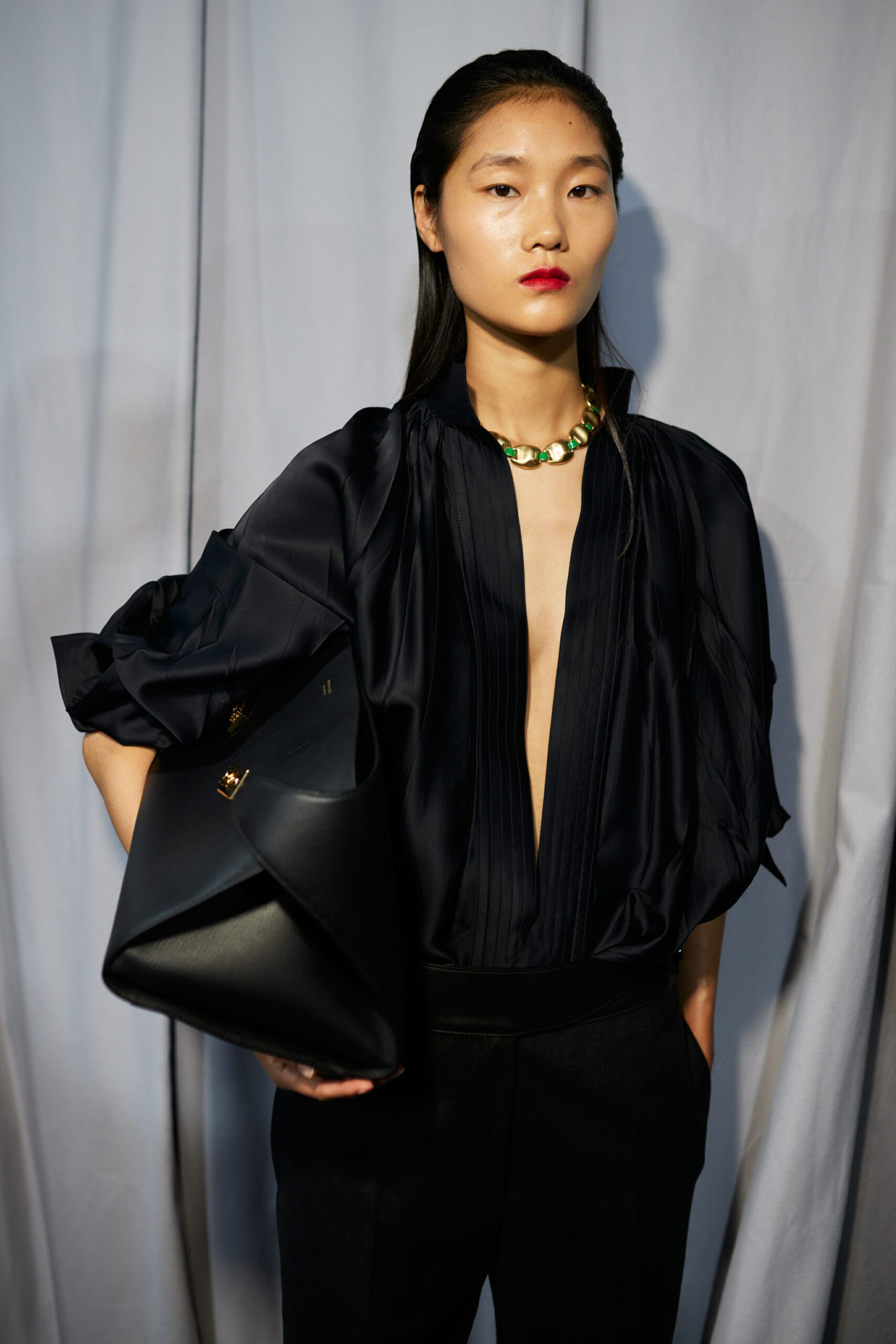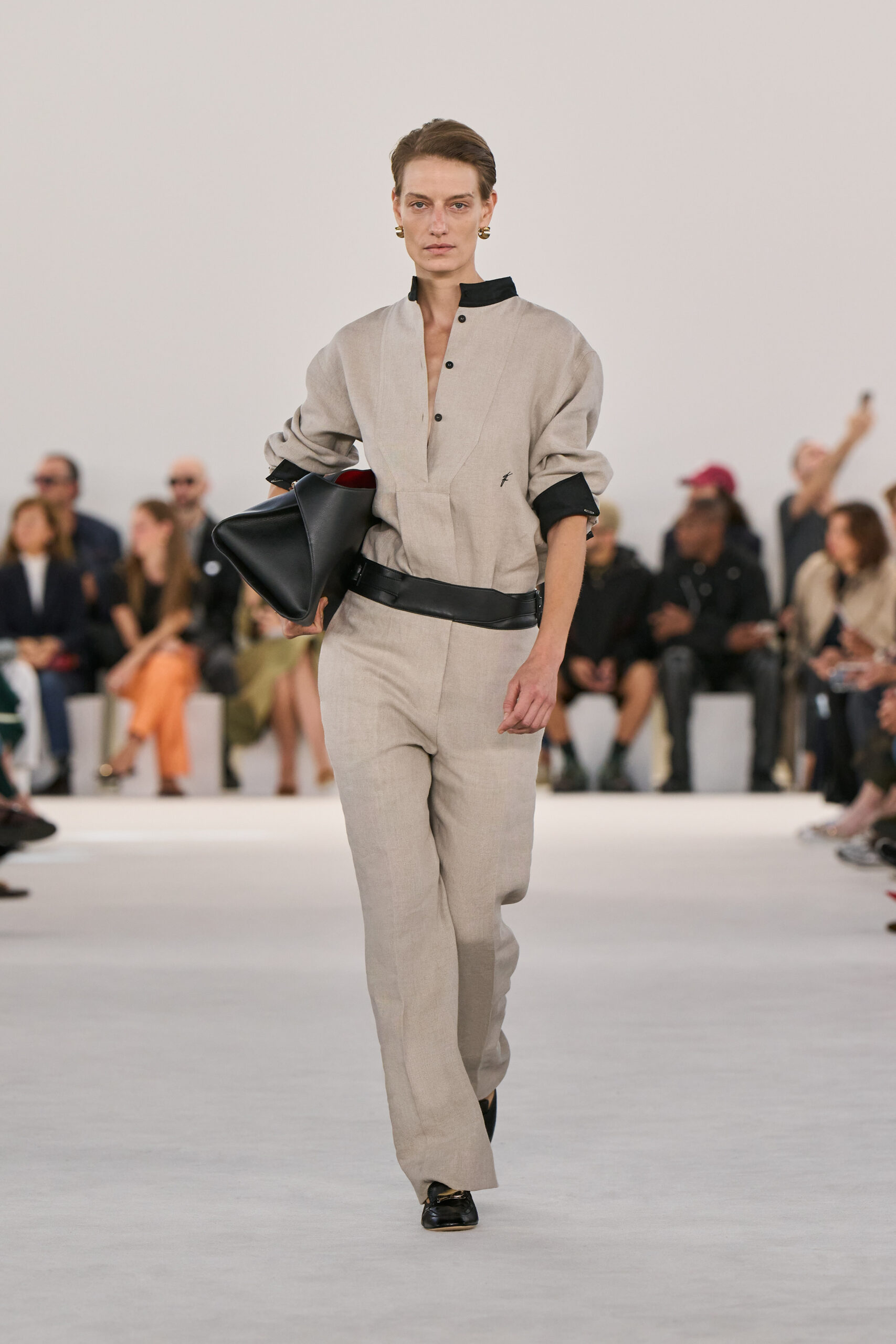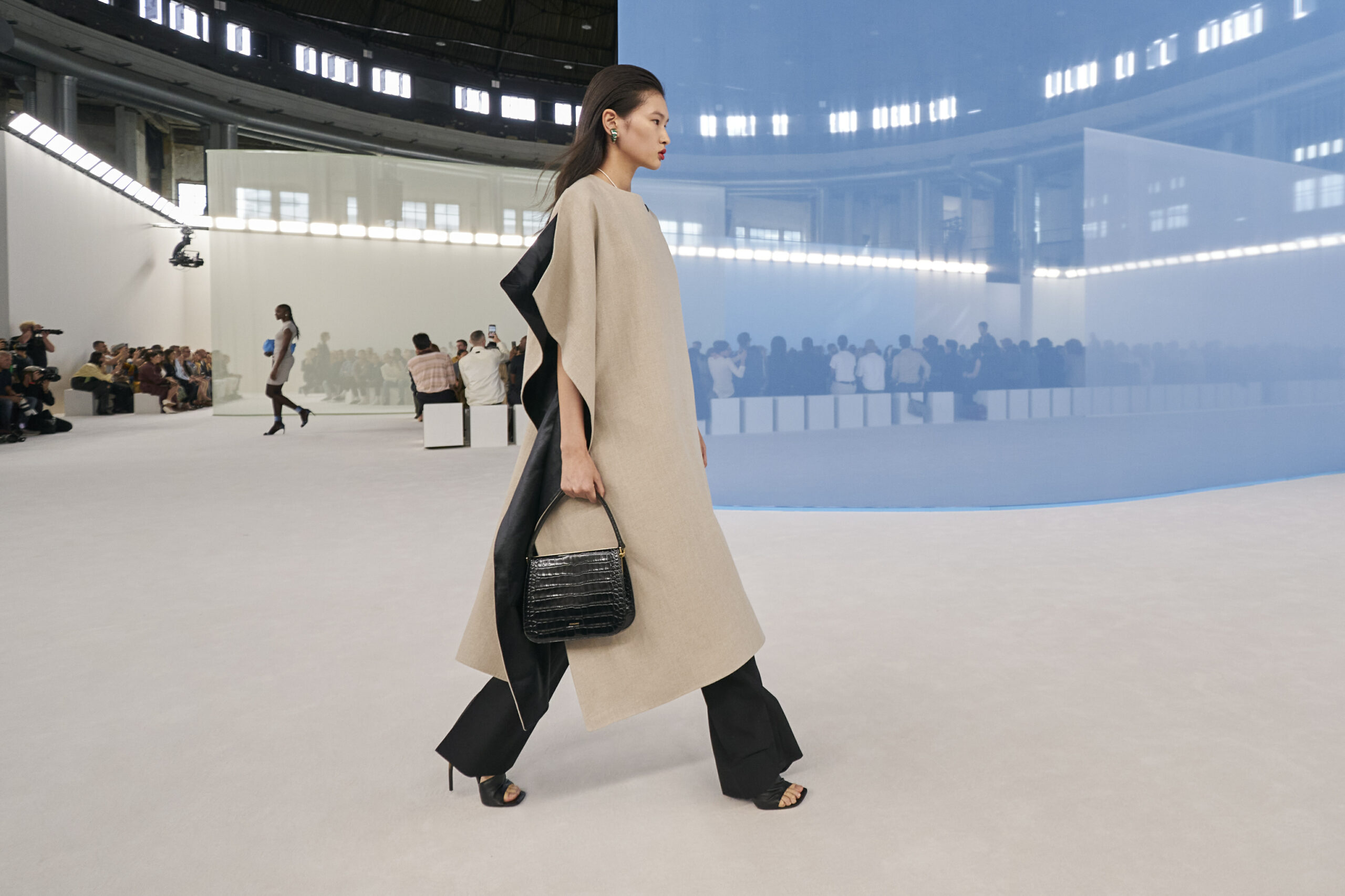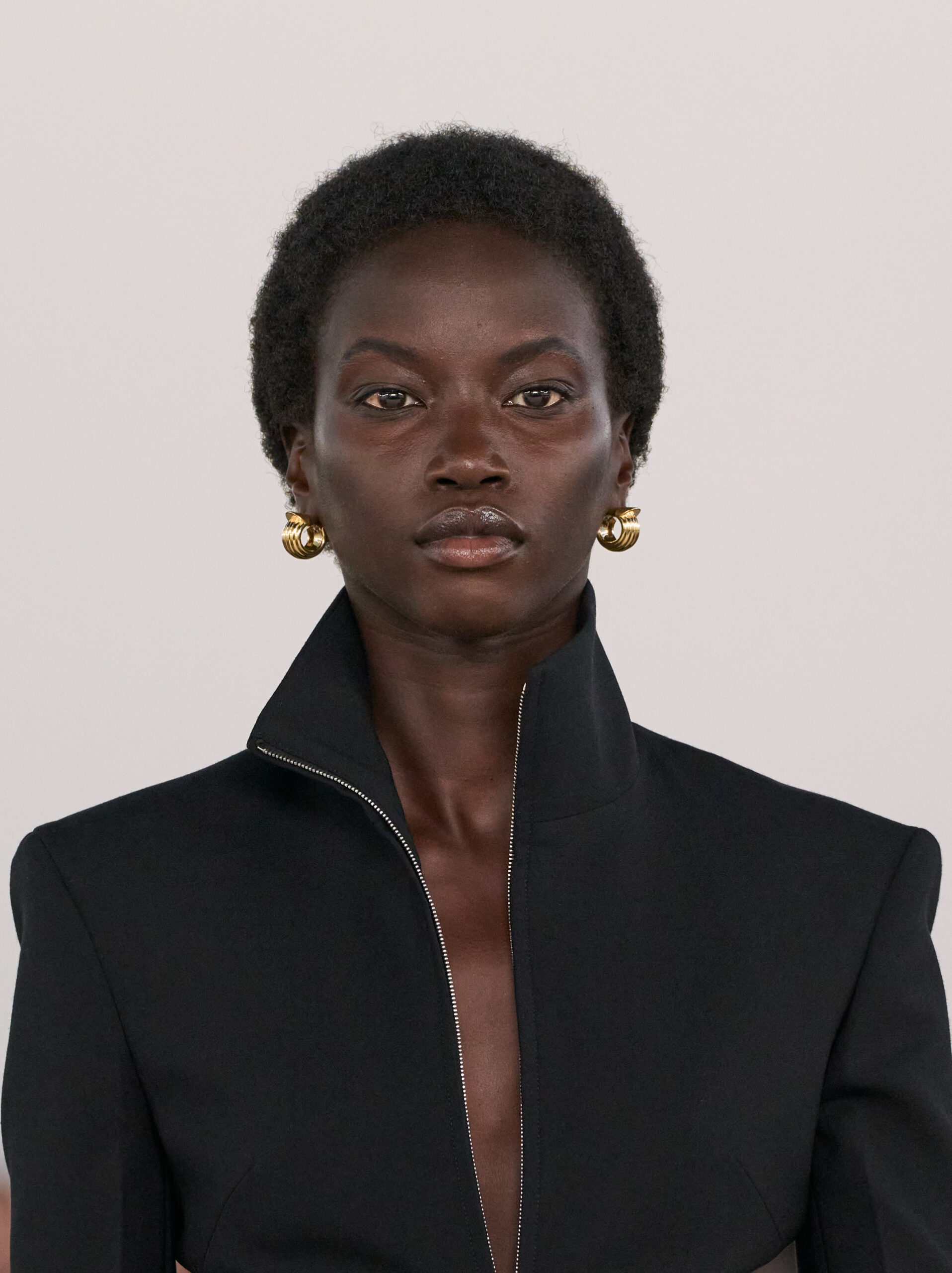 La collection joue sur un équilibre entre retenue et liberté : une insouciance décontractée se manifeste dans la texture usée du cuir, tandis que la taille de haute couture du milieu du siècle est transformée en fluidité. Les drapés en jersey de viscose, ancrés dans l’héritage florentin de Ferragamo et évoquant la robe caribéenne du 18ème siècle, sont maintenant associés à l’esthétique de l’armure de la Renaissance.