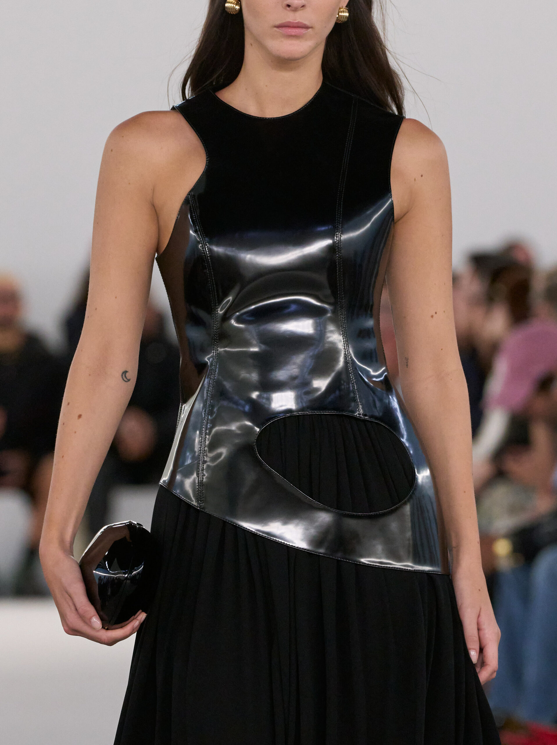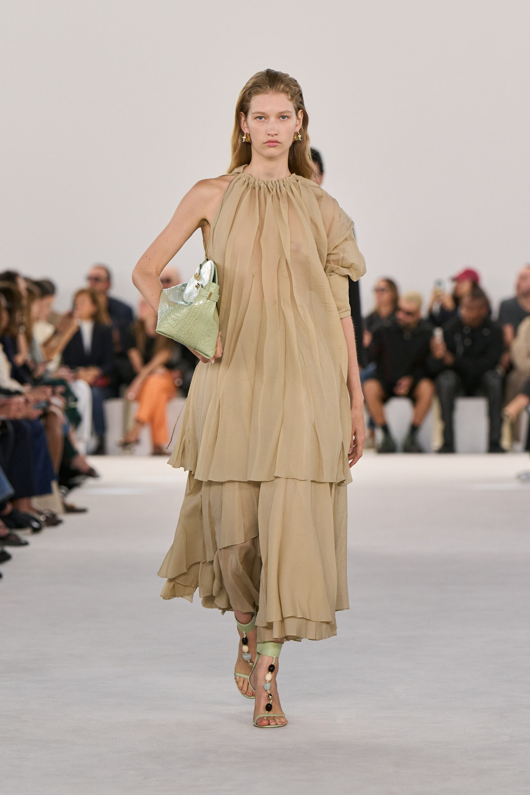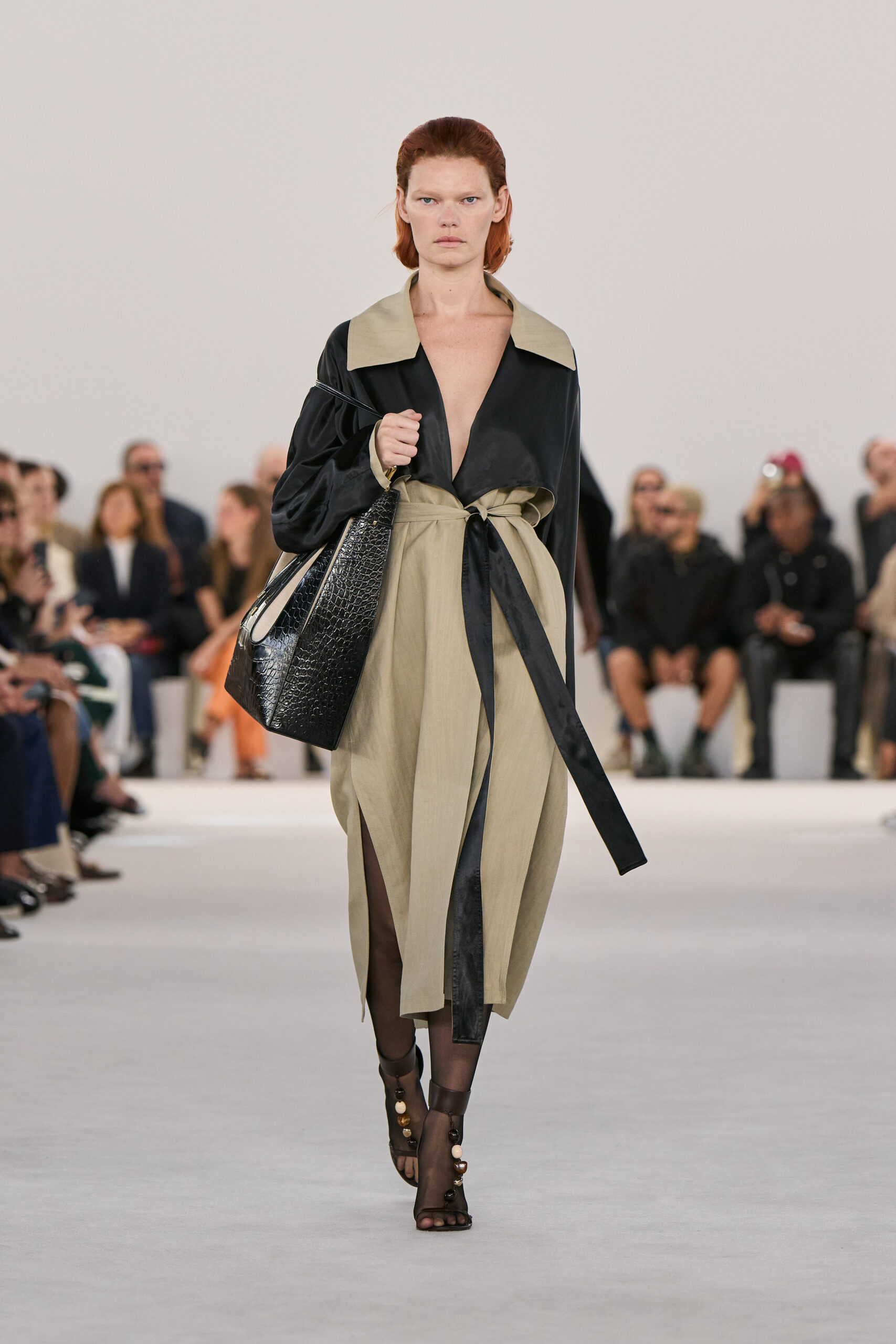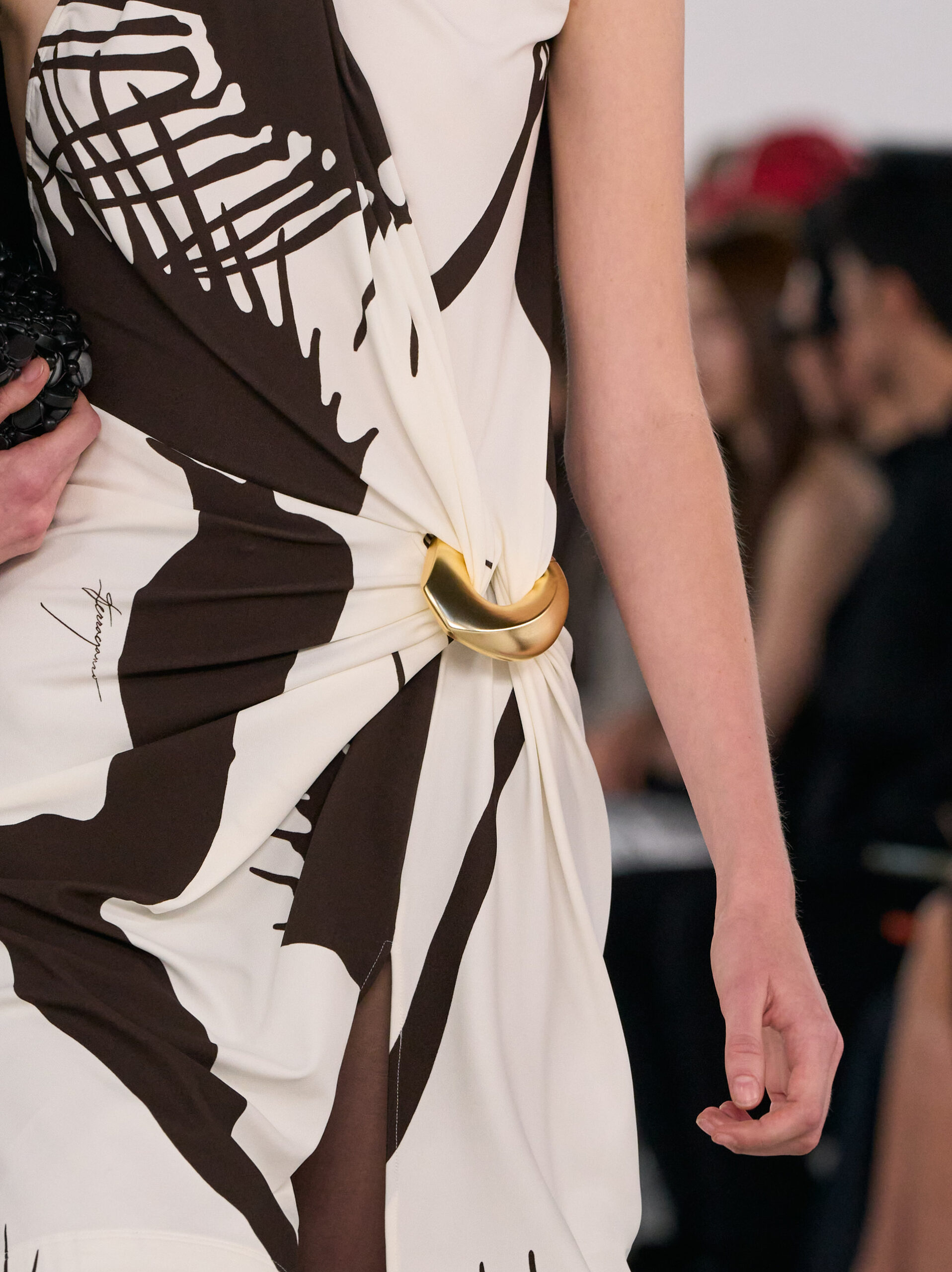 La collection joue sur un équilibre entre retenue et liberté : une insouciance décontractée se manifeste dans la texture usée du cuir, tandis que la taille de haute couture du milieu du siècle est transformée en fluidité. Les drapés en jersey de viscose, ancrés dans l’héritage florentin de Ferragamo et évoquant la robe caribéenne du 18ème siècle, sont maintenant associés à l’esthétique de l’armure de la Renaissance.