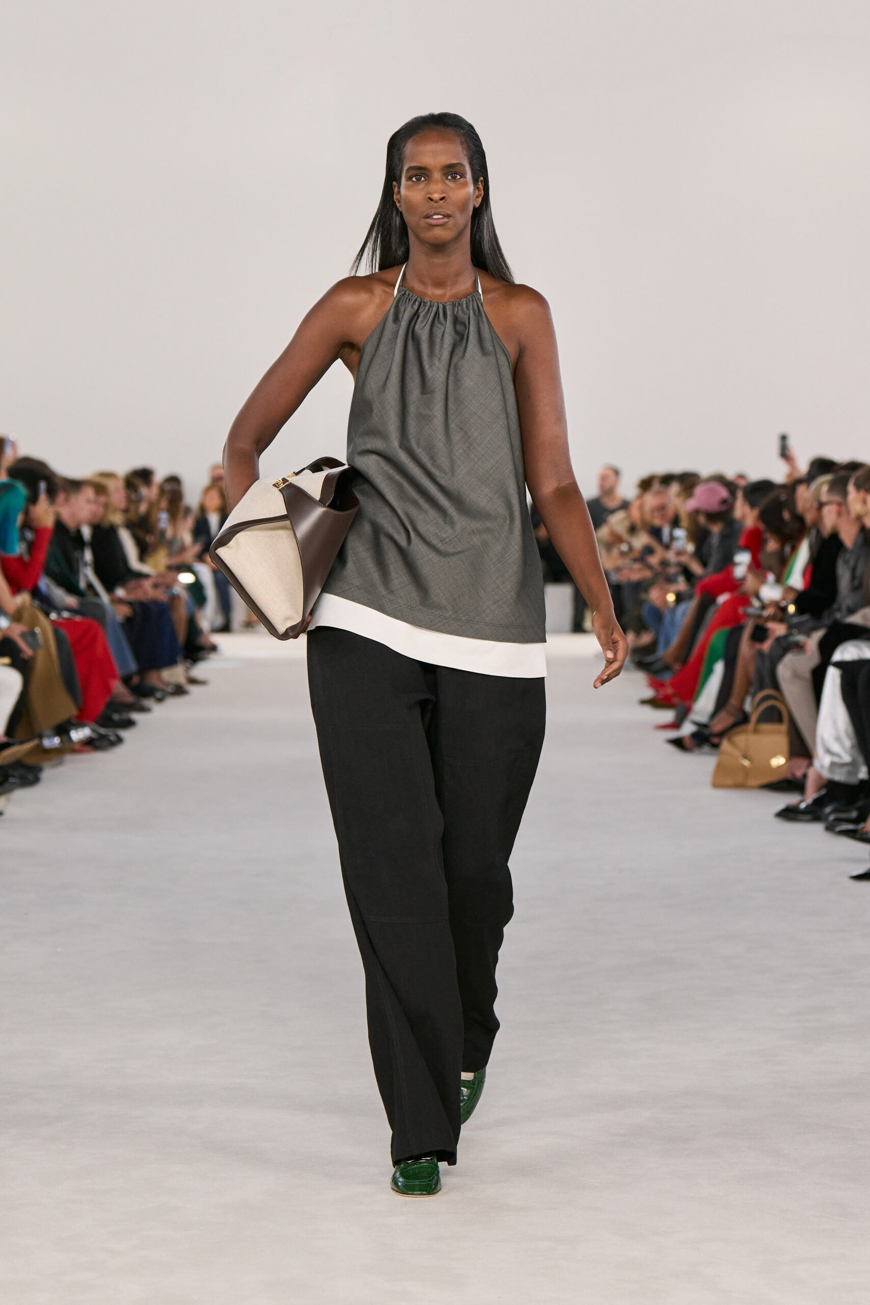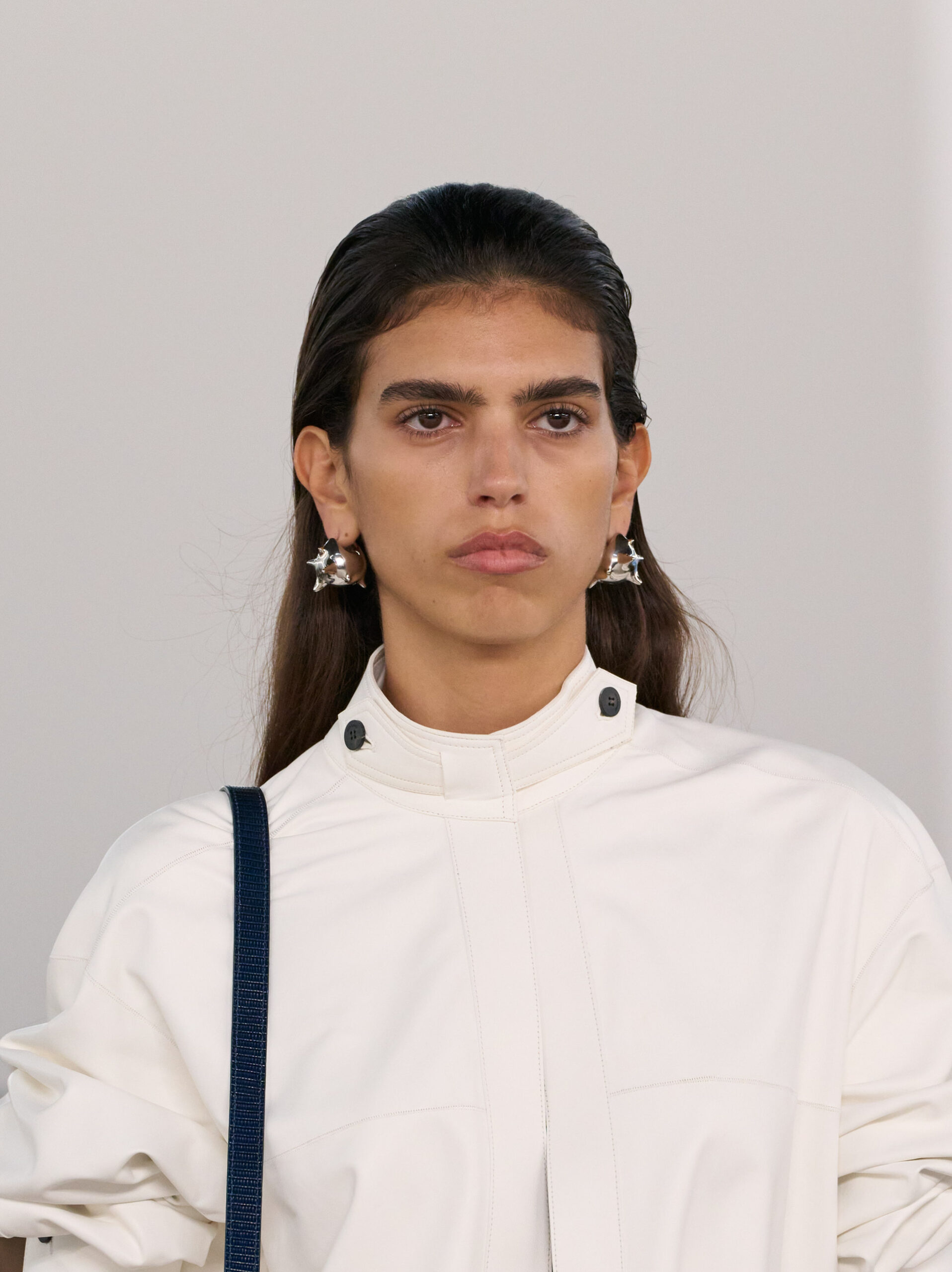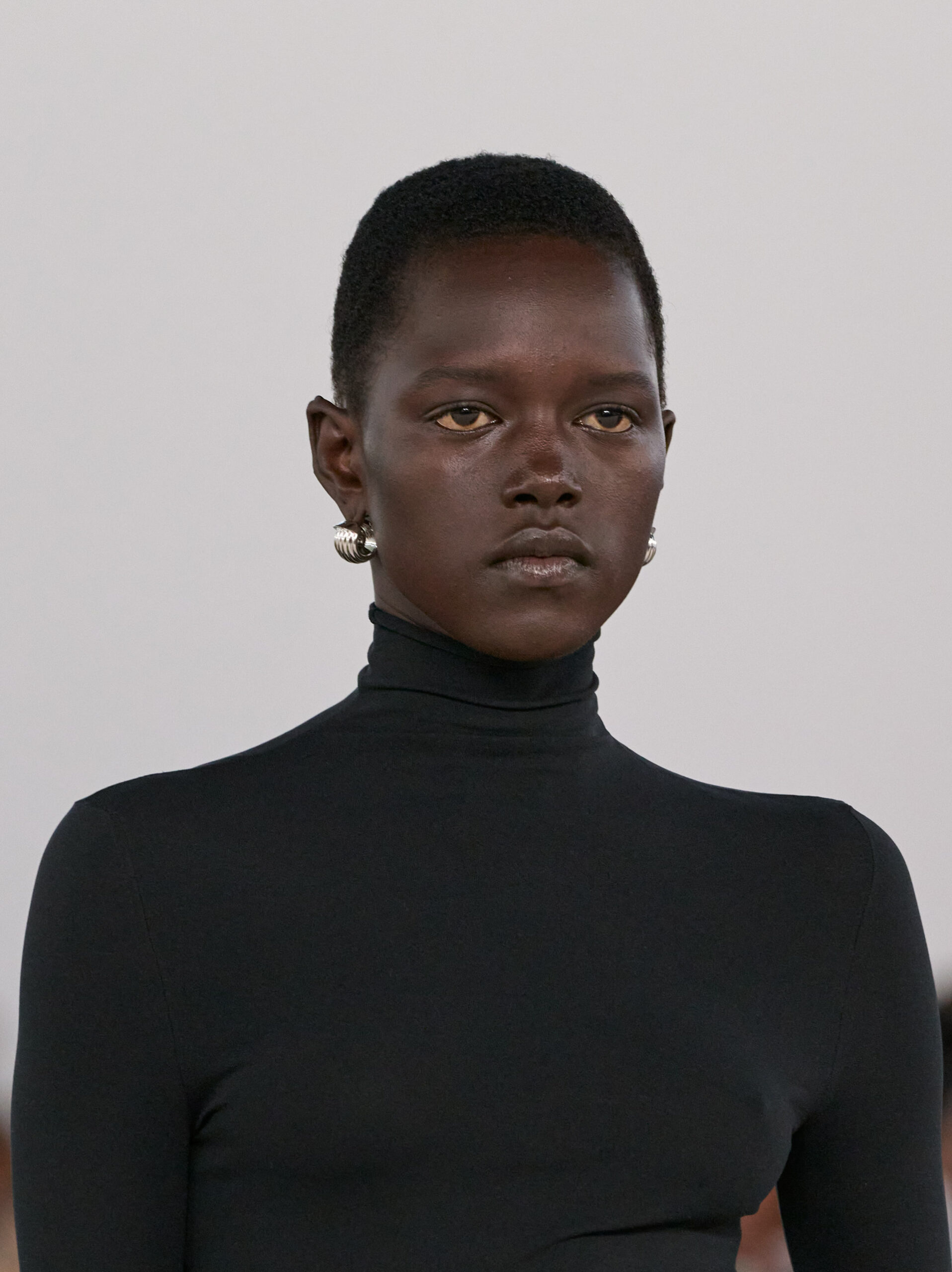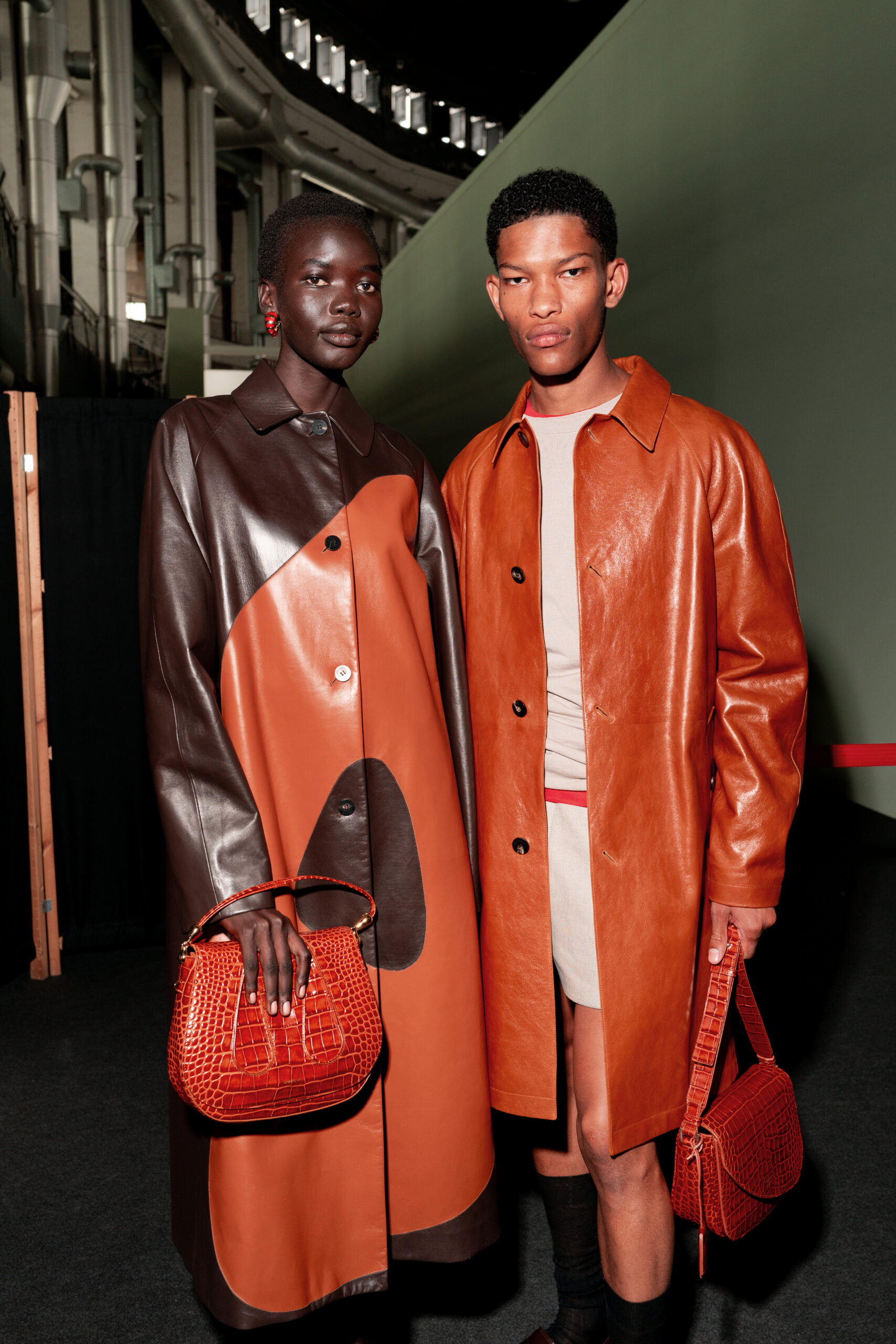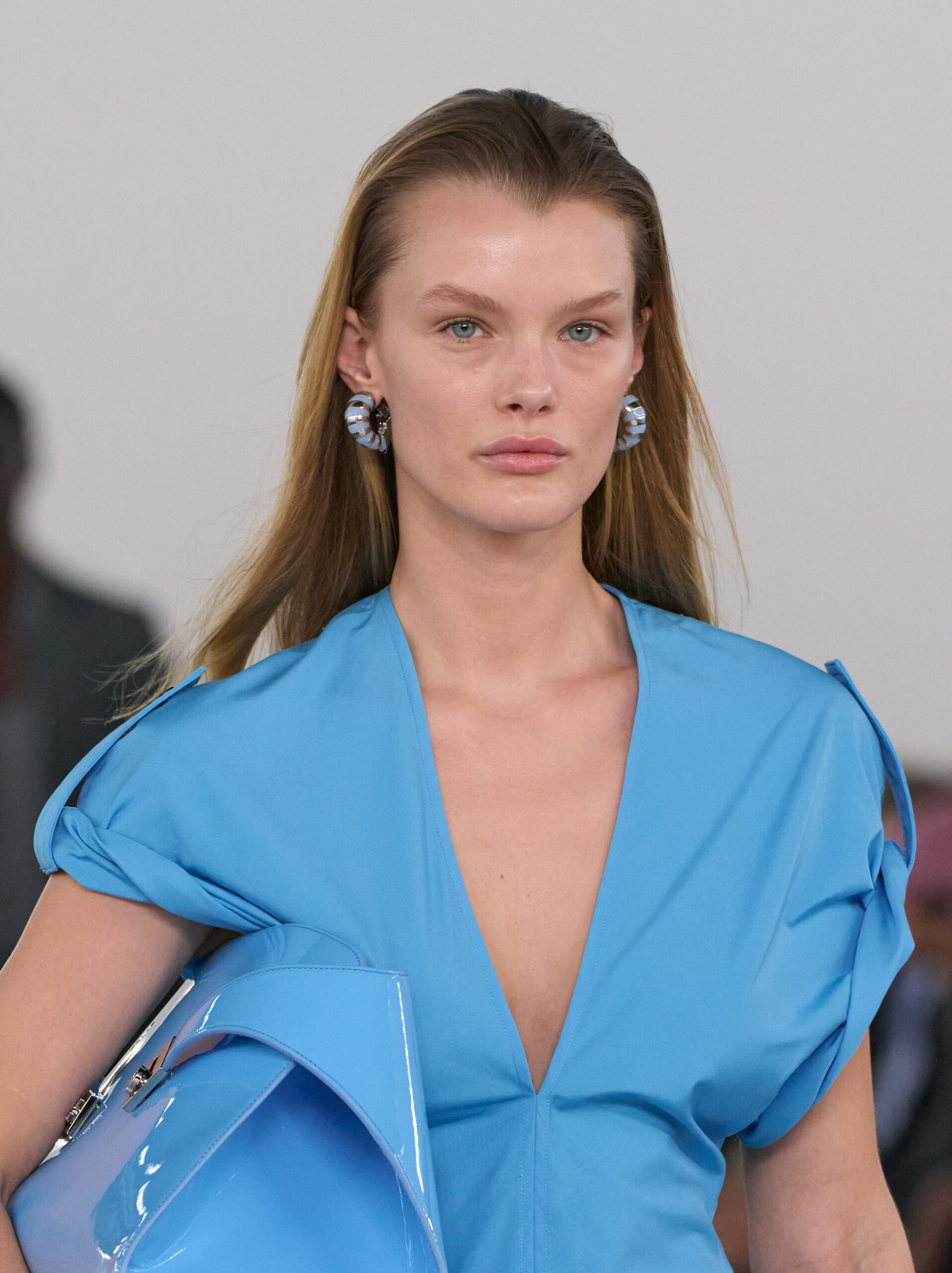 La collection joue sur un équilibre entre retenue et liberté : une insouciance décontractée se manifeste dans la texture usée du cuir, tandis que la taille de haute couture du milieu du siècle est transformée en fluidité. Les drapés en jersey de viscose, ancrés dans l’héritage florentin de Ferragamo et évoquant la robe caribéenne du 18ème siècle, sont maintenant associés à l’esthétique de l’armure de la Renaissance.