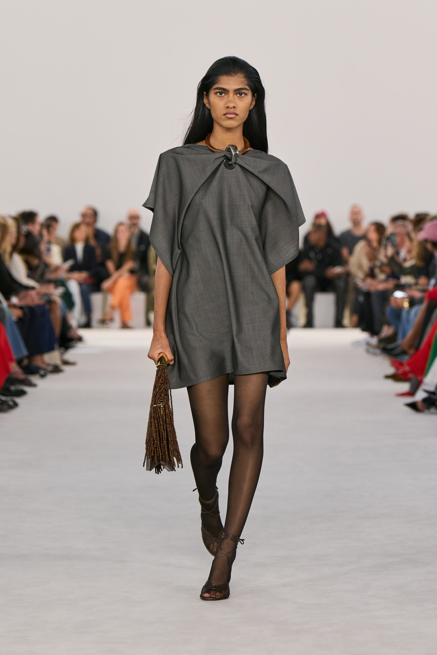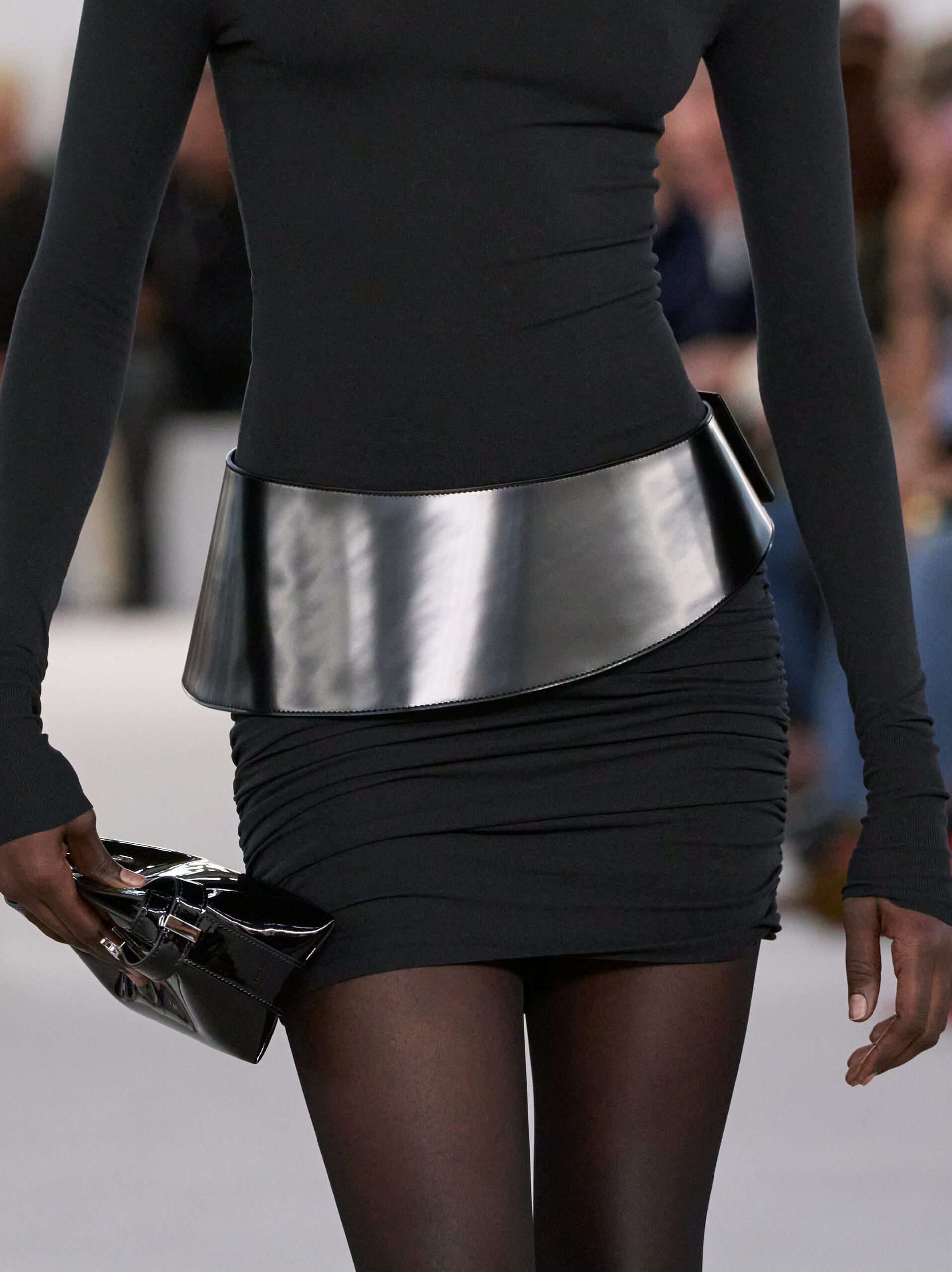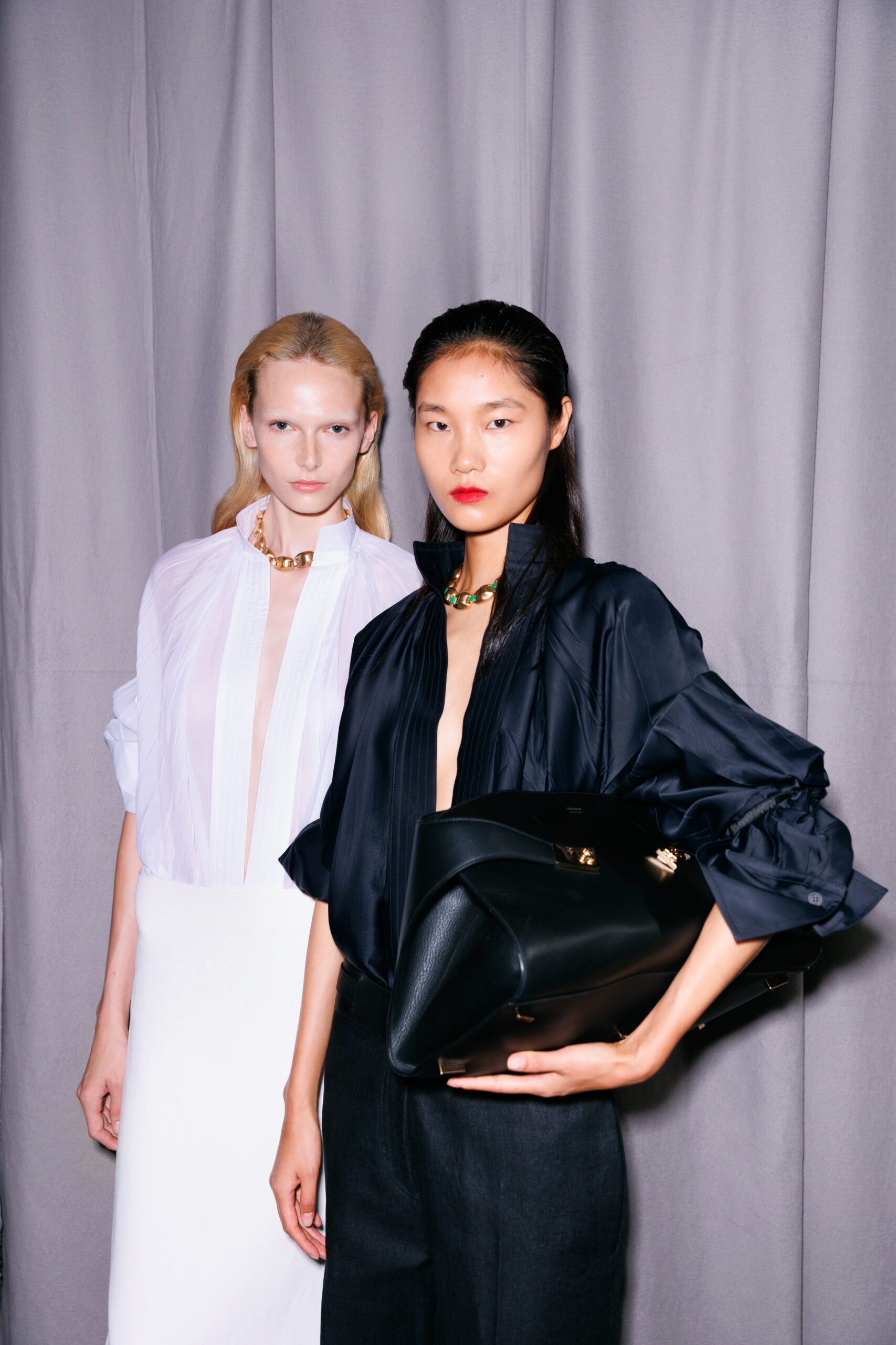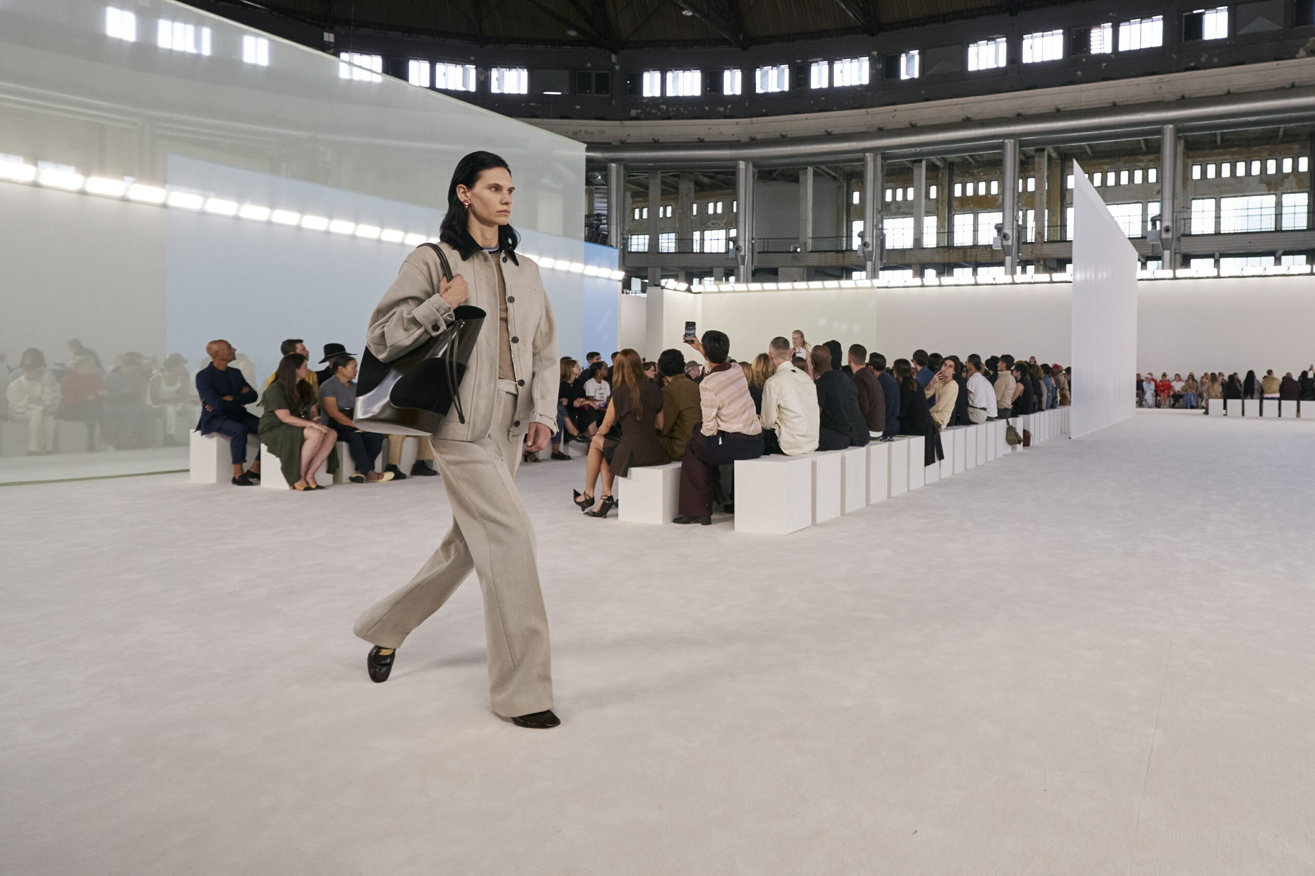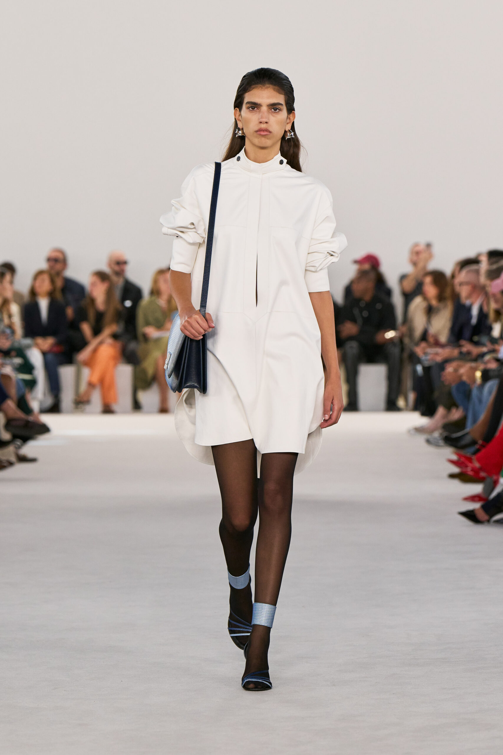 La collection joue sur un équilibre entre retenue et liberté : une insouciance décontractée se manifeste dans la texture usée du cuir, tandis que la taille de haute couture du milieu du siècle est transformée en fluidité. Les drapés en jersey de viscose, ancrés dans l’héritage florentin de Ferragamo et évoquant la robe caribéenne du 18ème siècle, sont maintenant associés à l’esthétique de l’armure de la Renaissance.