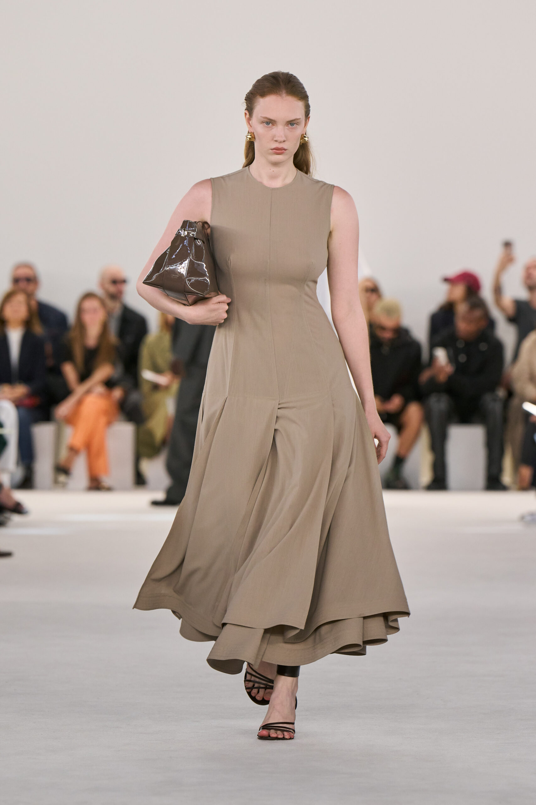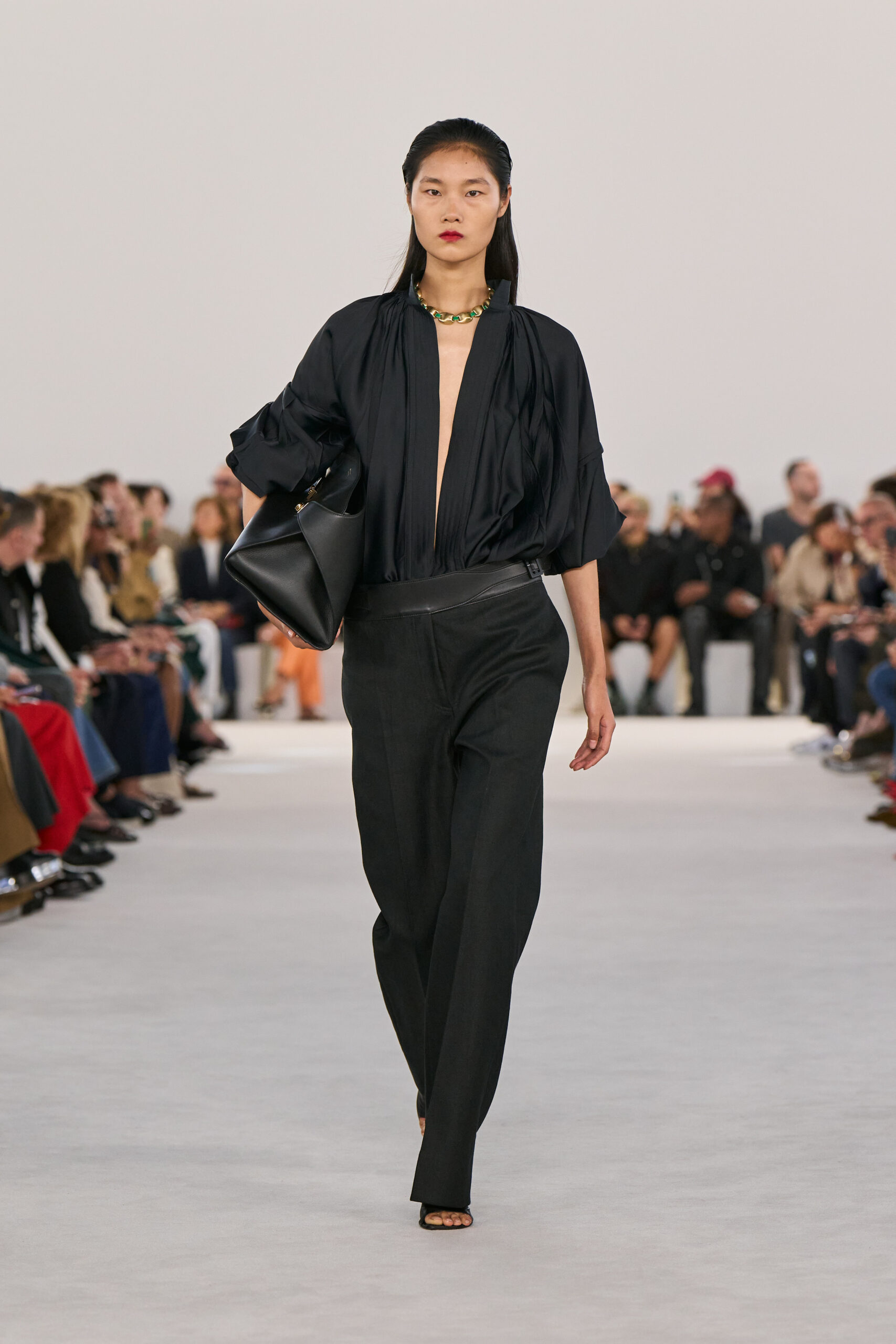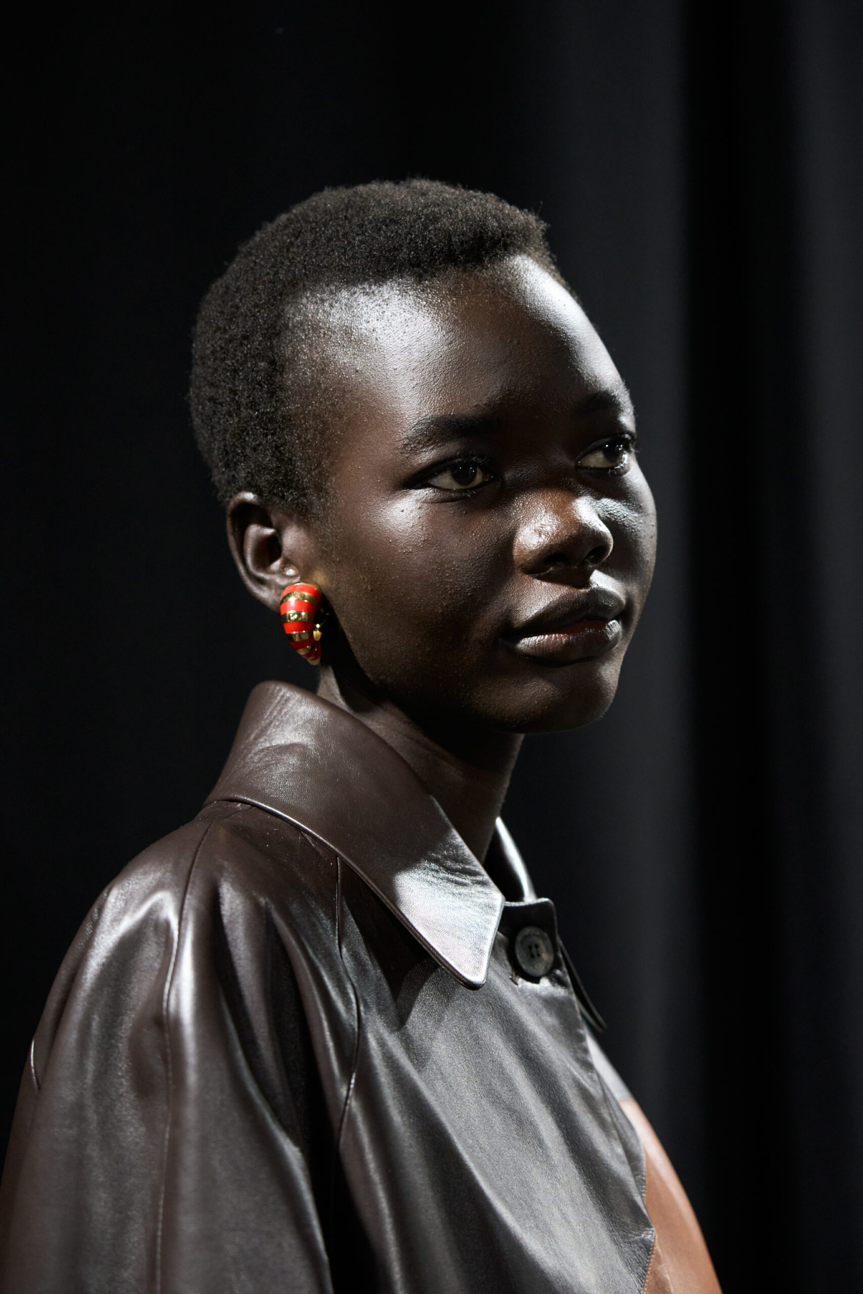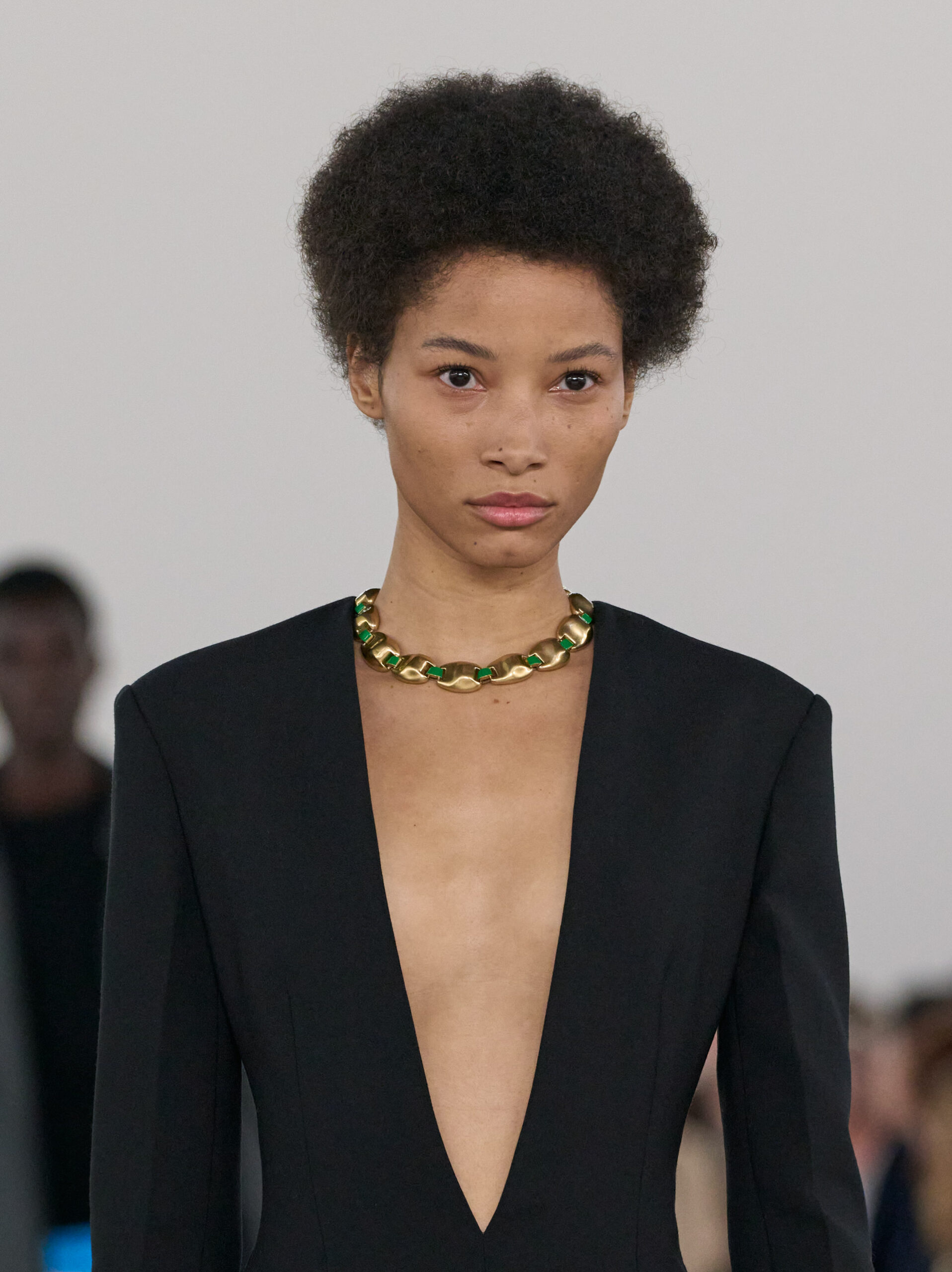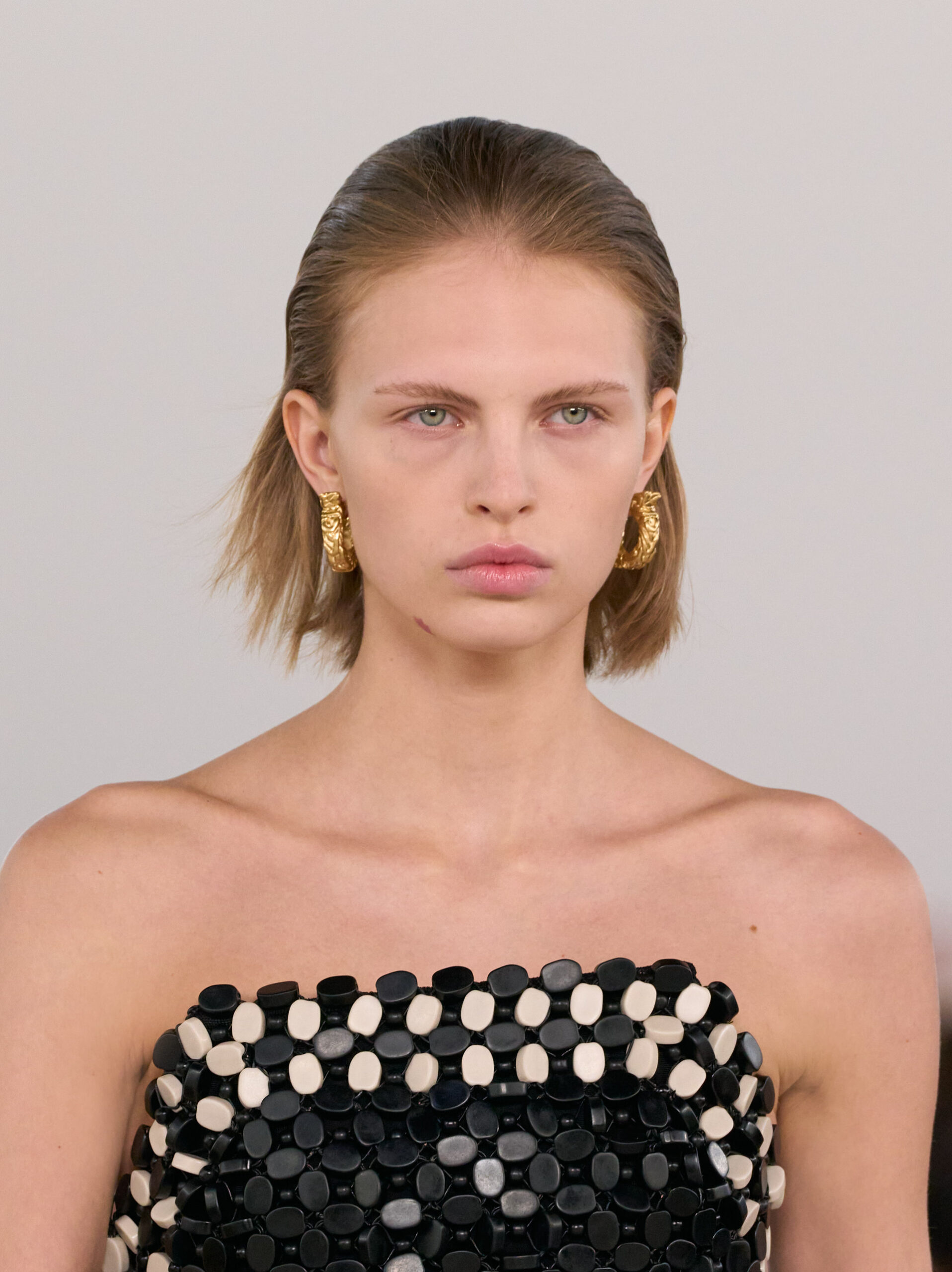 La collection joue sur un équilibre entre retenue et liberté : une insouciance décontractée se manifeste dans la texture usée du cuir, tandis que la taille de haute couture du milieu du siècle est transformée en fluidité. Les drapés en jersey de viscose, ancrés dans l’héritage florentin de Ferragamo et évoquant la robe caribéenne du 18ème siècle, sont maintenant associés à l’esthétique de l’armure de la Renaissance.