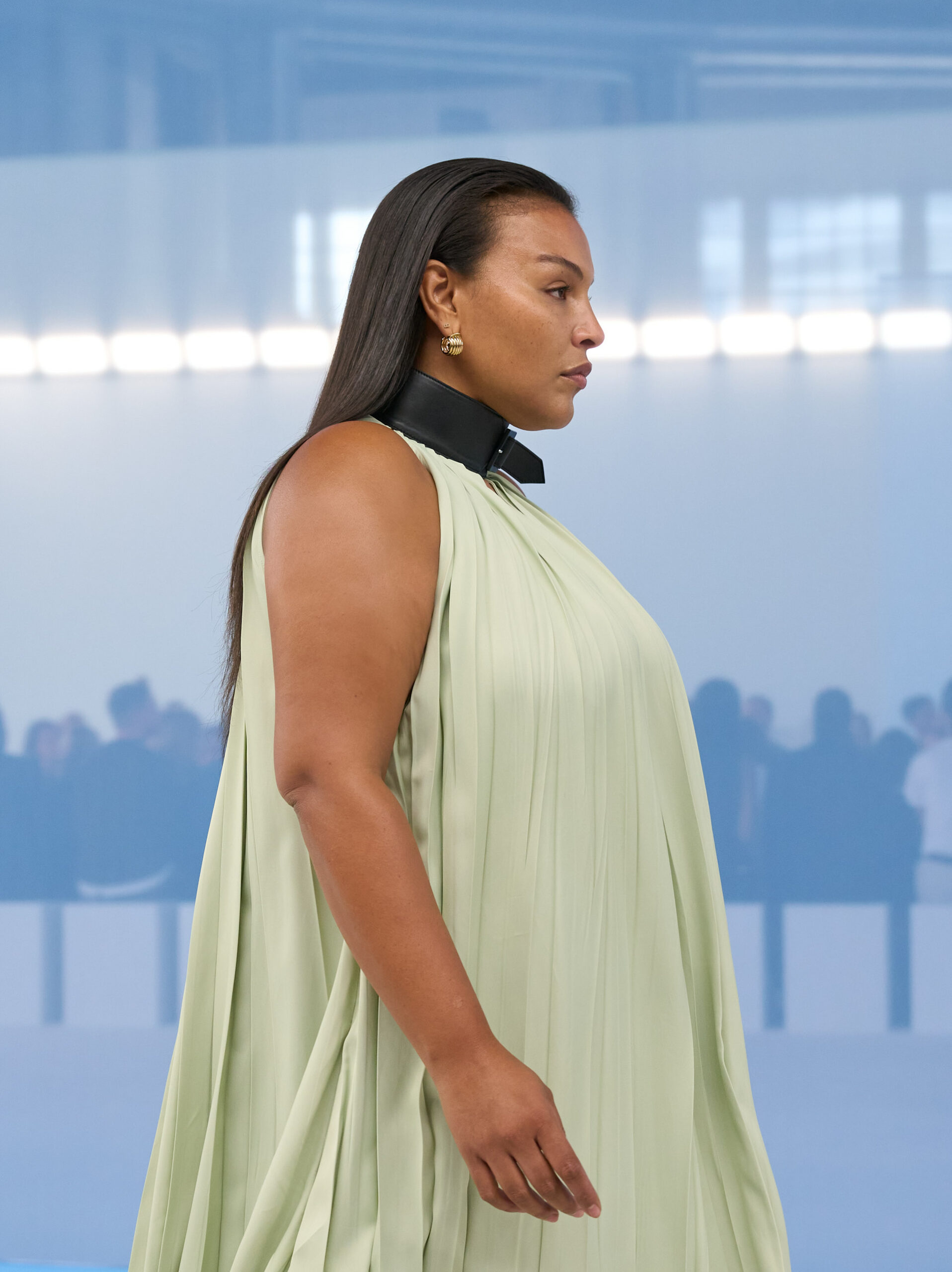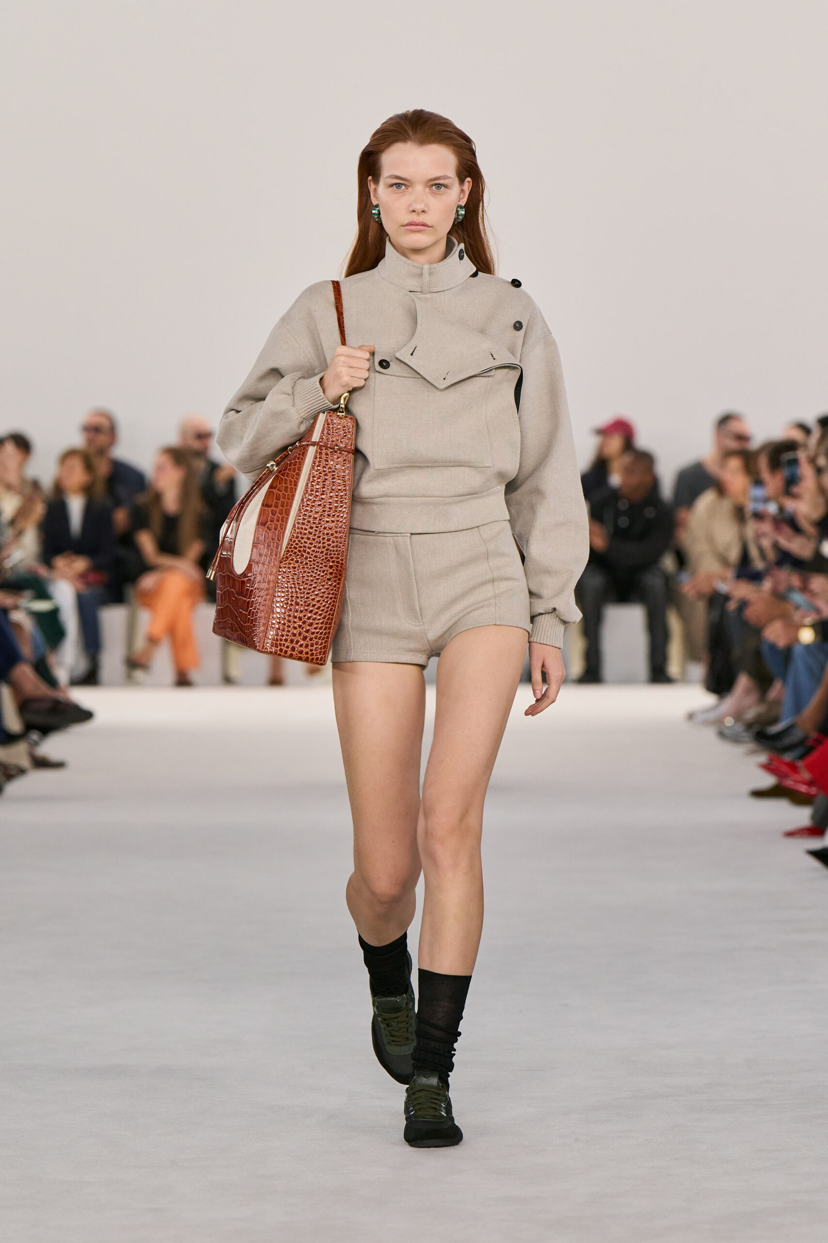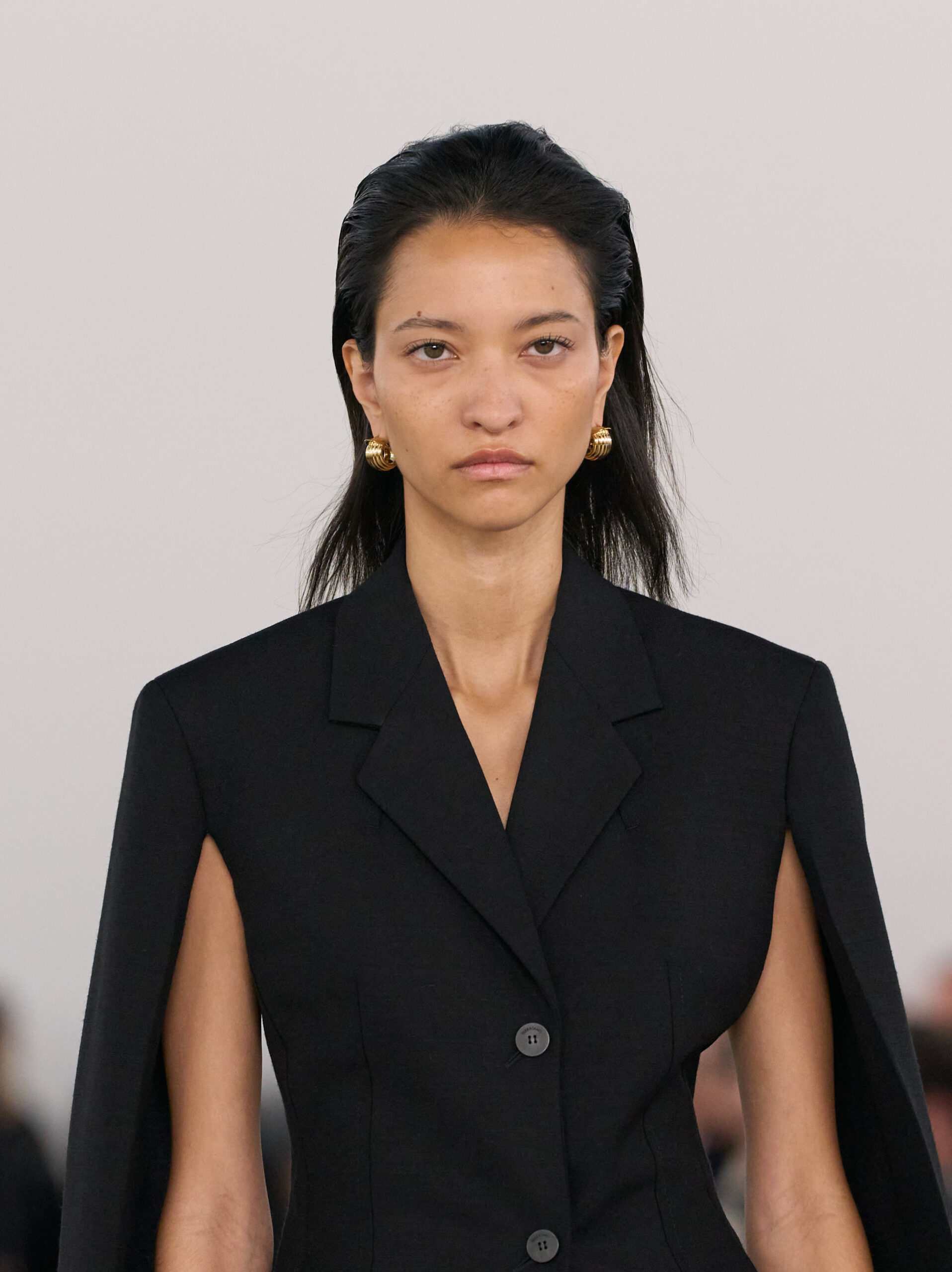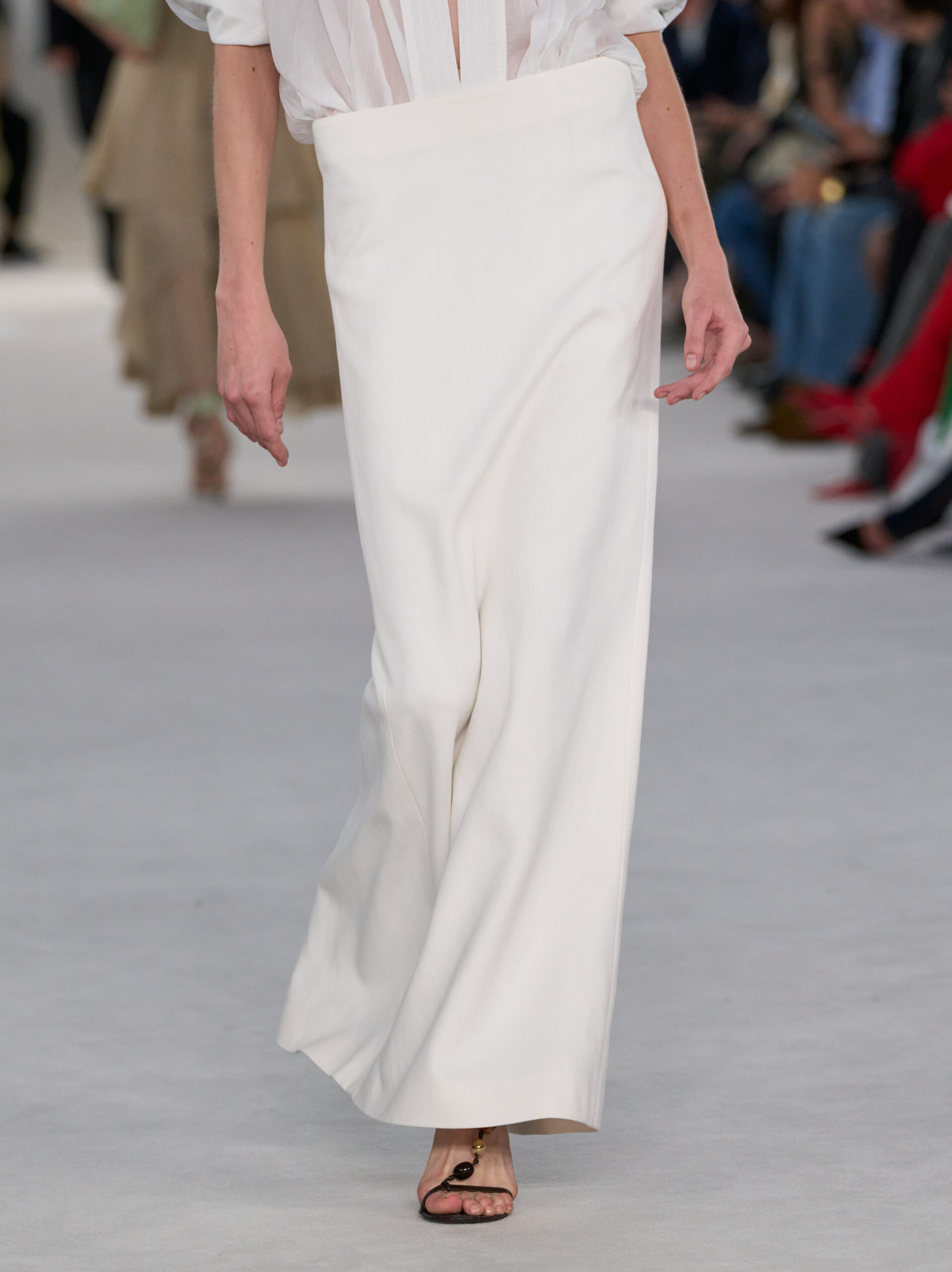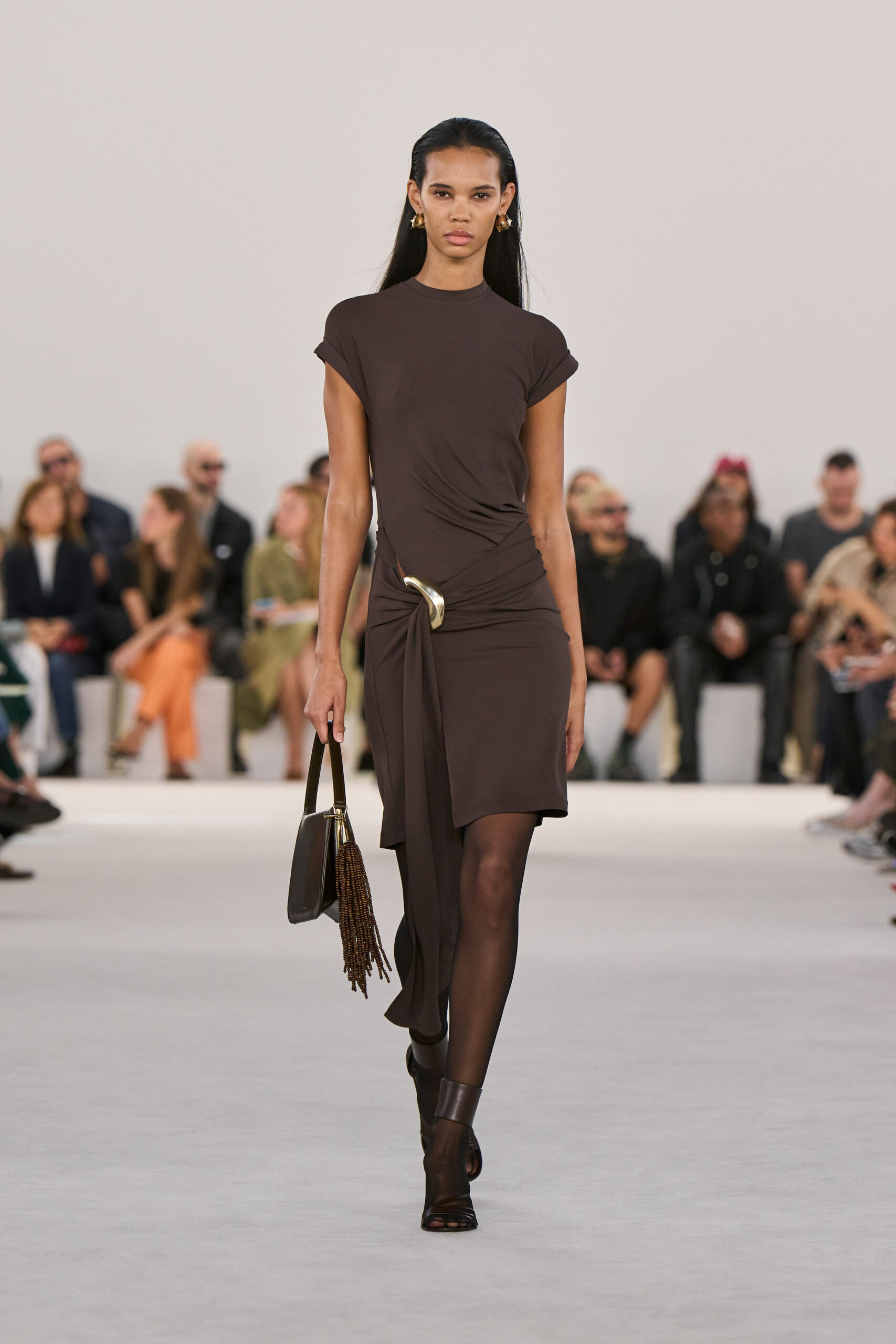 La collection joue sur un équilibre entre retenue et liberté : une insouciance décontractée se manifeste dans la texture usée du cuir, tandis que la taille de haute couture du milieu du siècle est transformée en fluidité. Les drapés en jersey de viscose, ancrés dans l’héritage florentin de Ferragamo et évoquant la robe caribéenne du 18ème siècle, sont maintenant associés à l’esthétique de l’armure de la Renaissance.