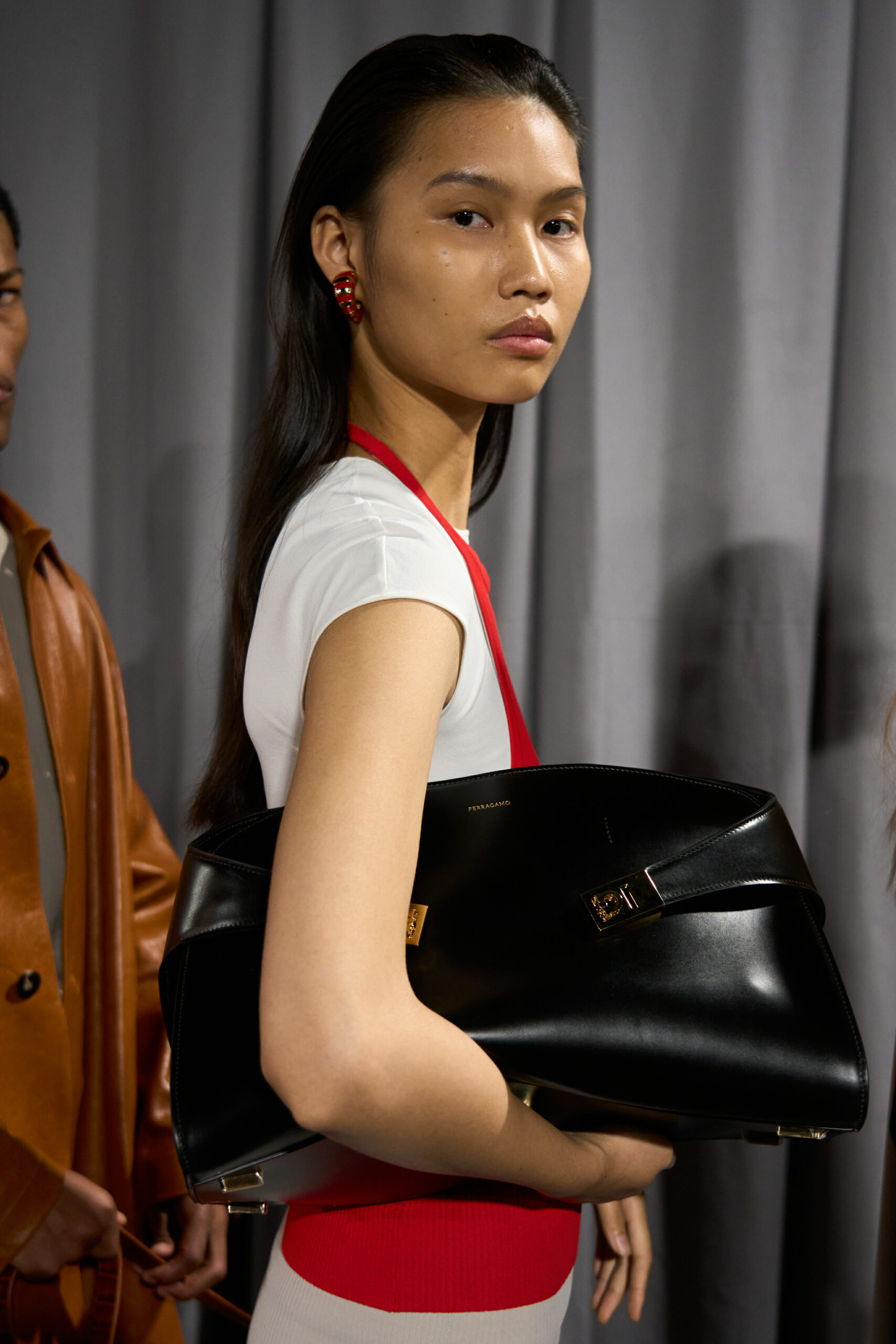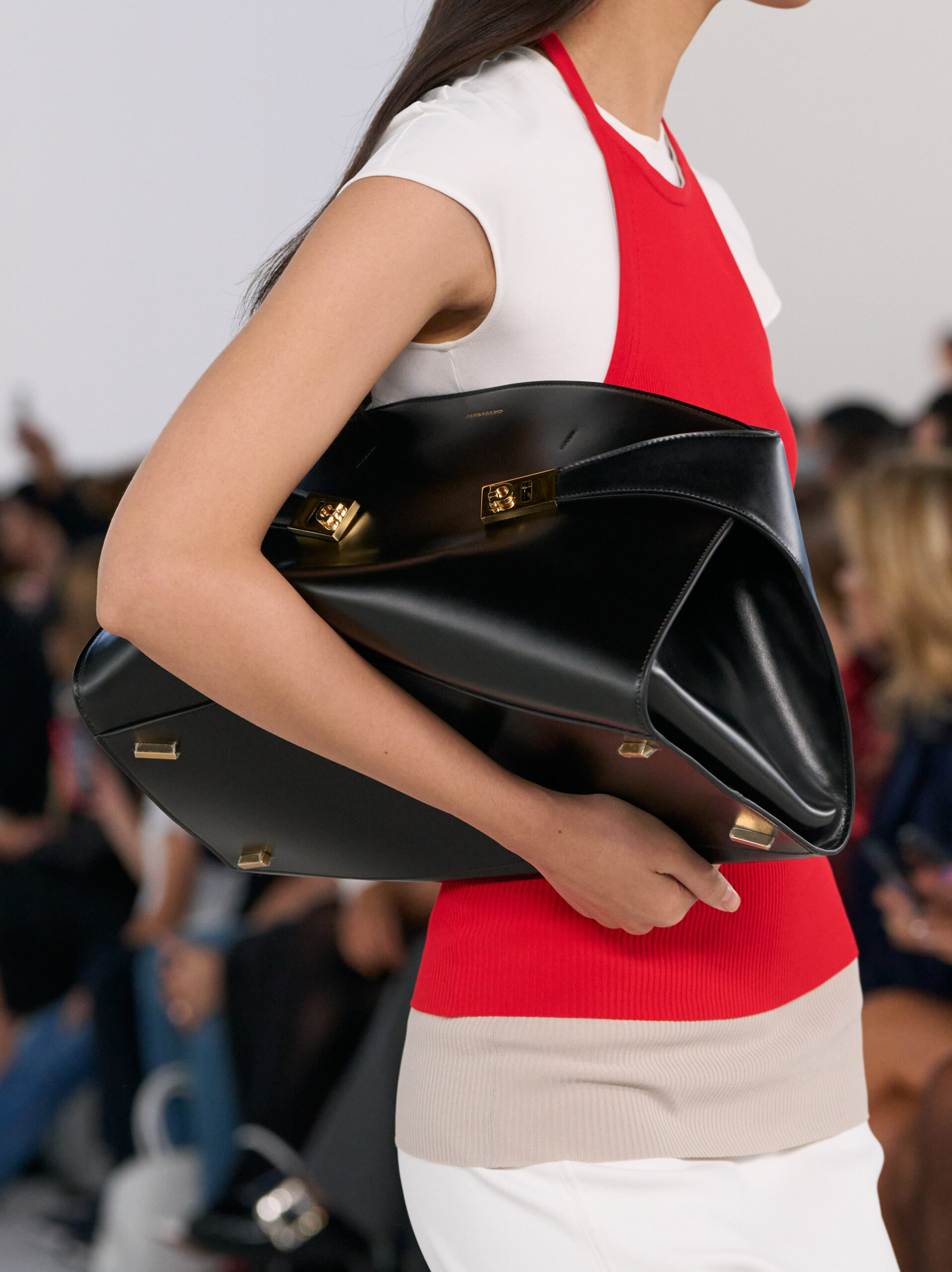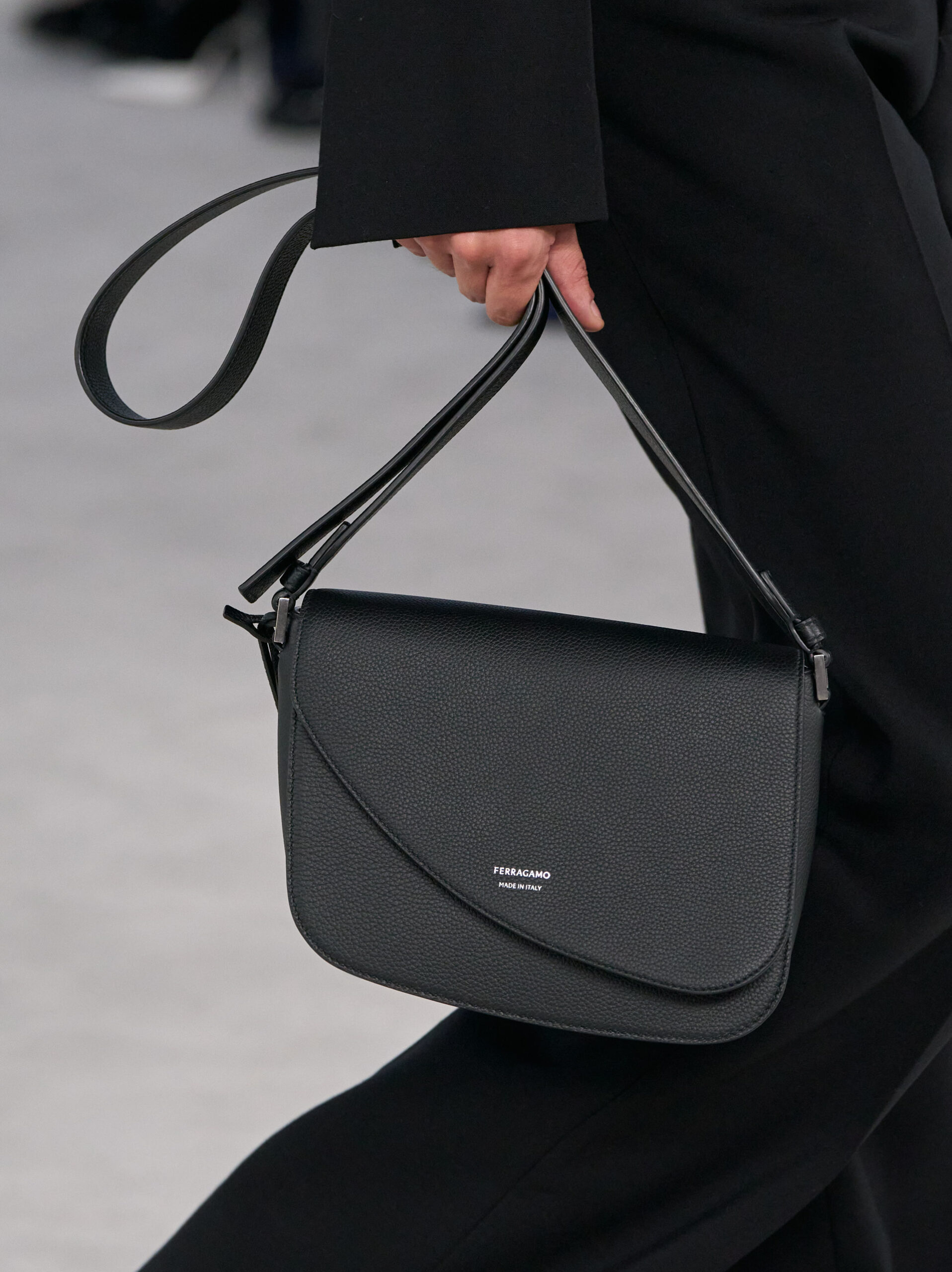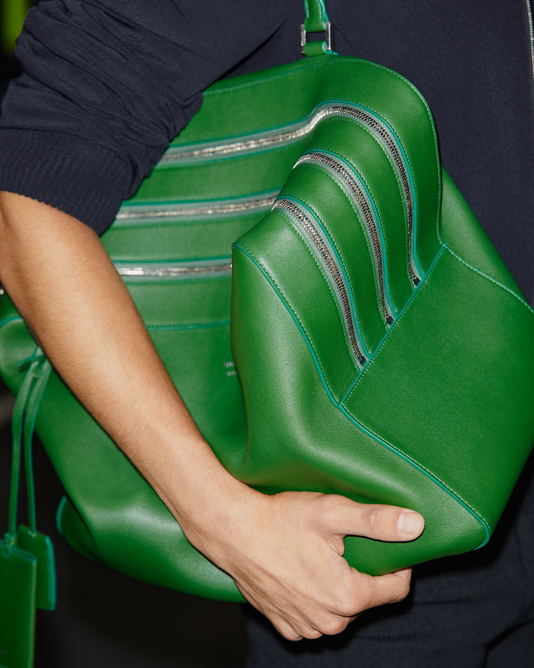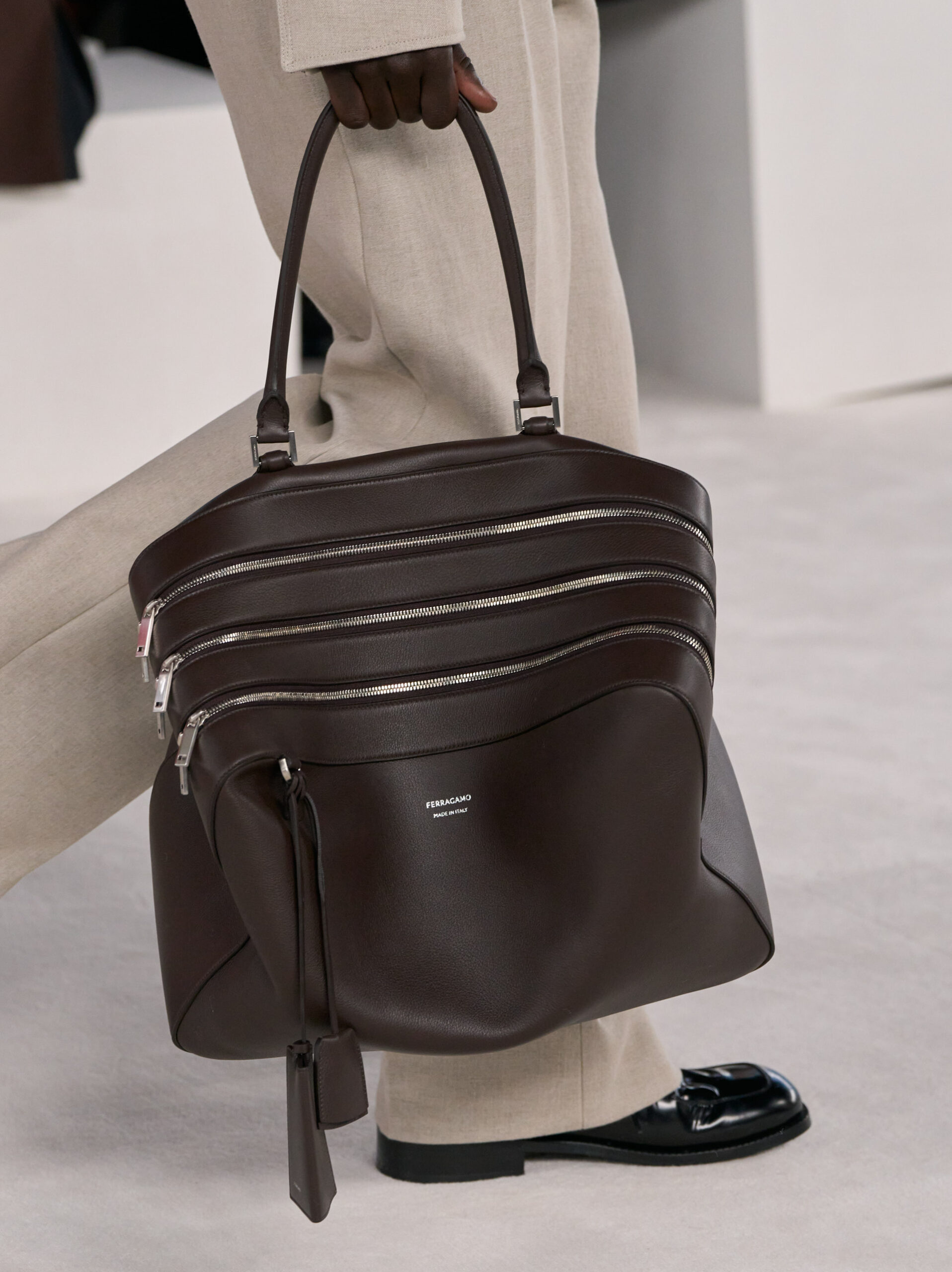 Les sacs à main poursuivent les lignes graphiques et les formes géométriques des collections précédentes : le classique contemporain « Hug » apparaît en version brillante et en cuir, tandis que le sac « Fiamma » joue sur les asymétries. Pour les hommes, le sac « Star » se distingue par sa construction minutieuse et son design épuré.