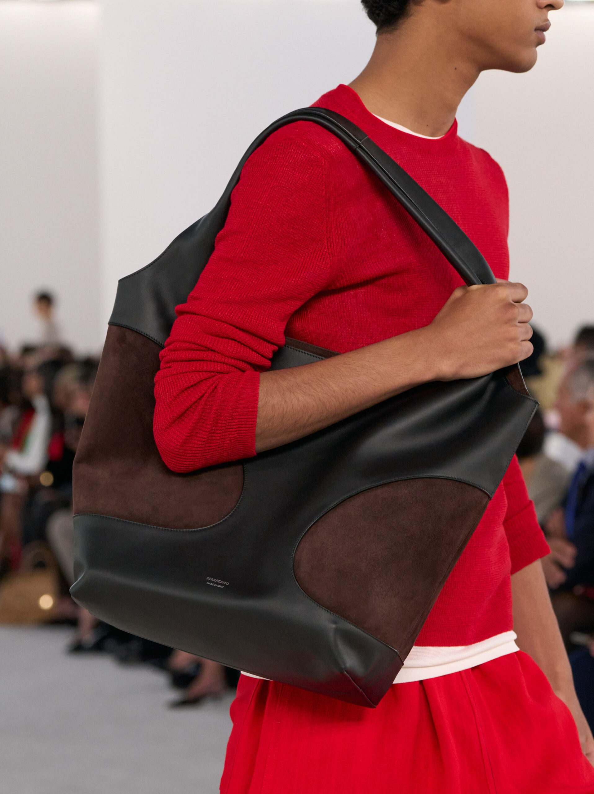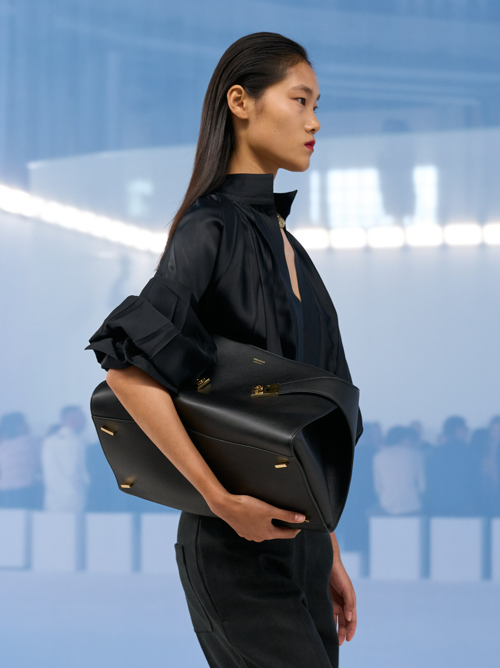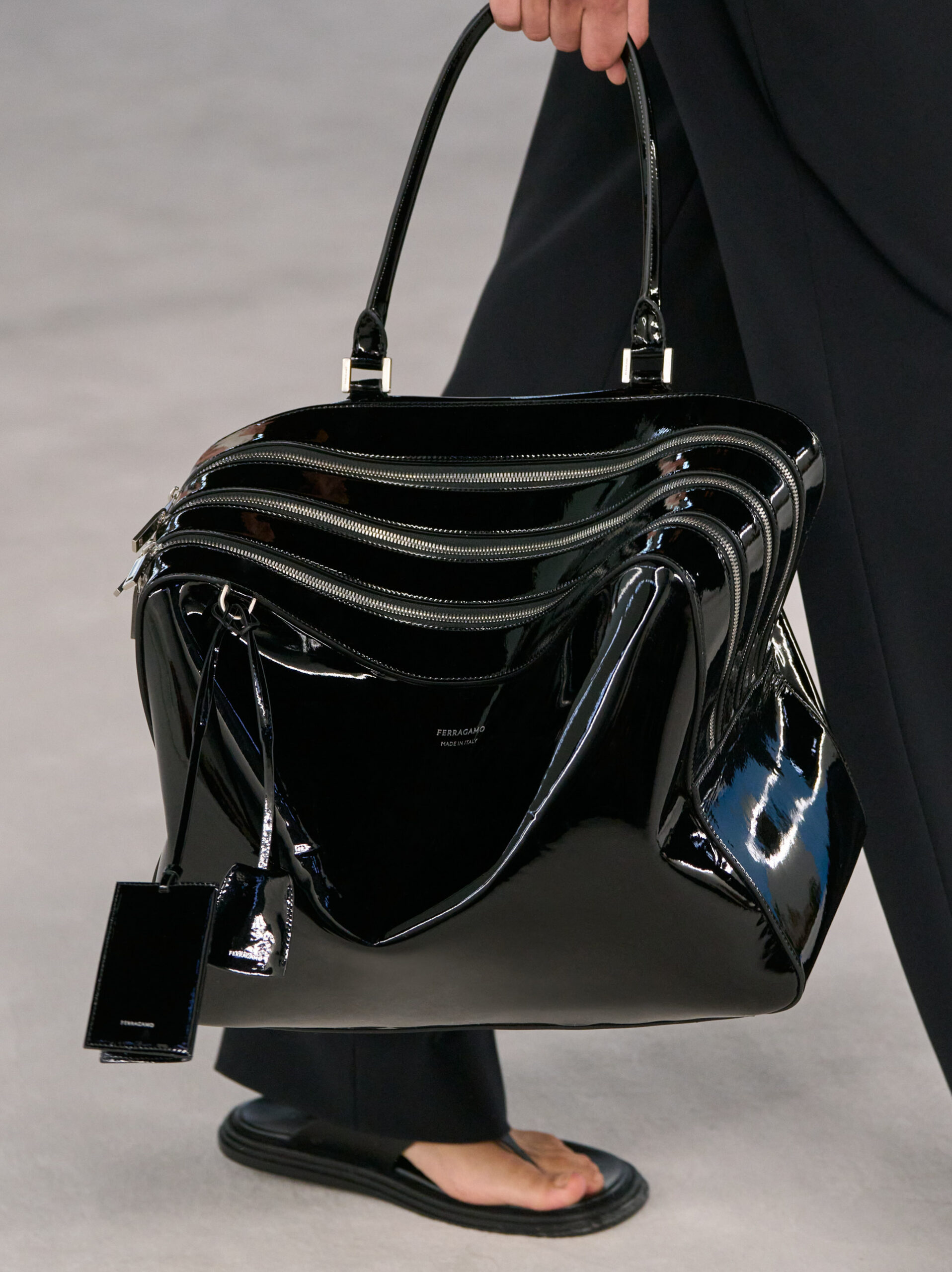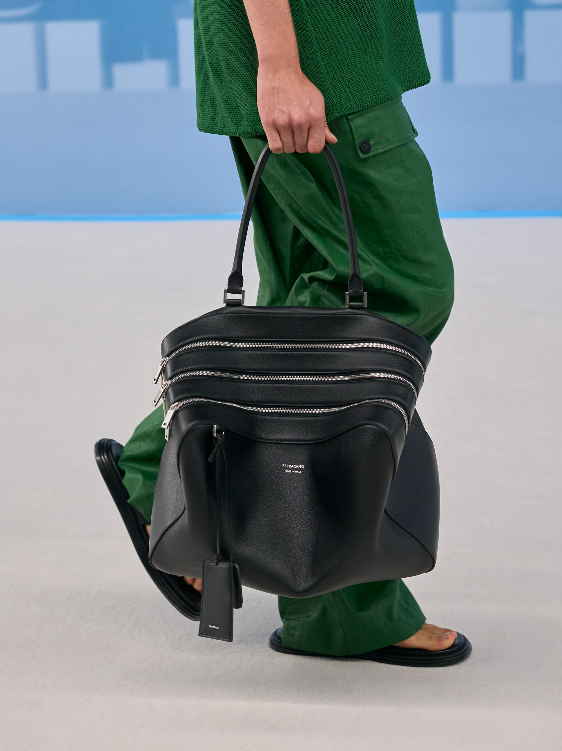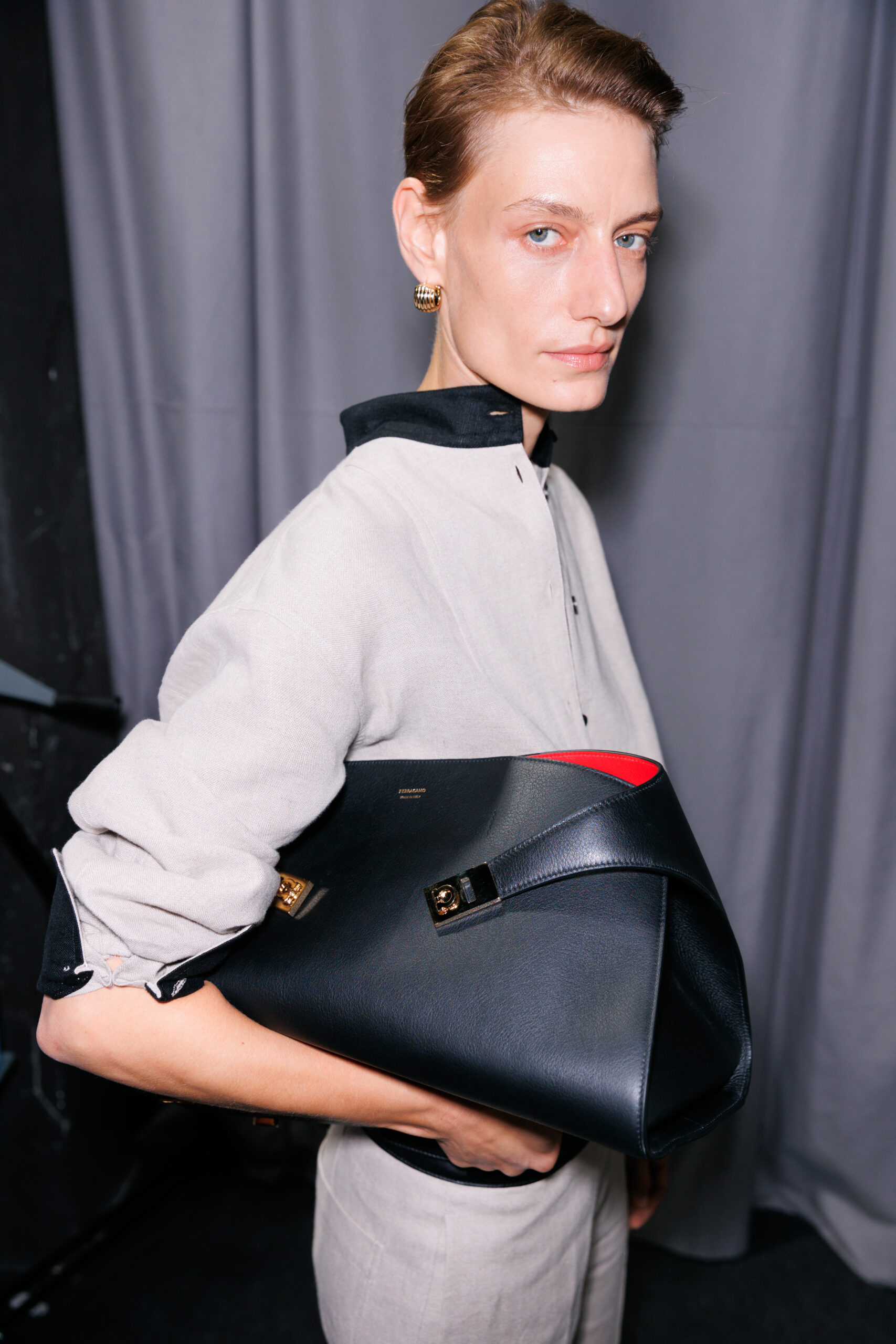 Les sacs à main poursuivent les lignes graphiques et les formes géométriques des collections précédentes : le classique contemporain « Hug » apparaît en version brillante et en cuir, tandis que le sac « Fiamma » joue sur les asymétries. Pour les hommes, le sac « Star » se distingue par sa construction minutieuse et son design épuré.