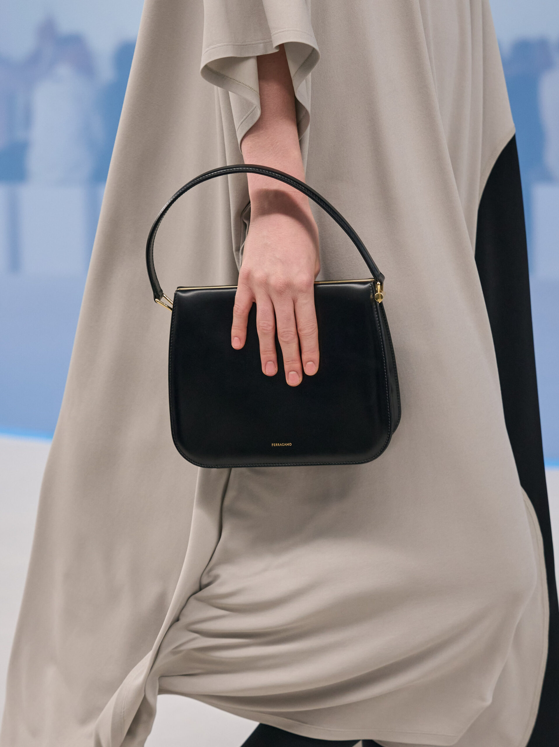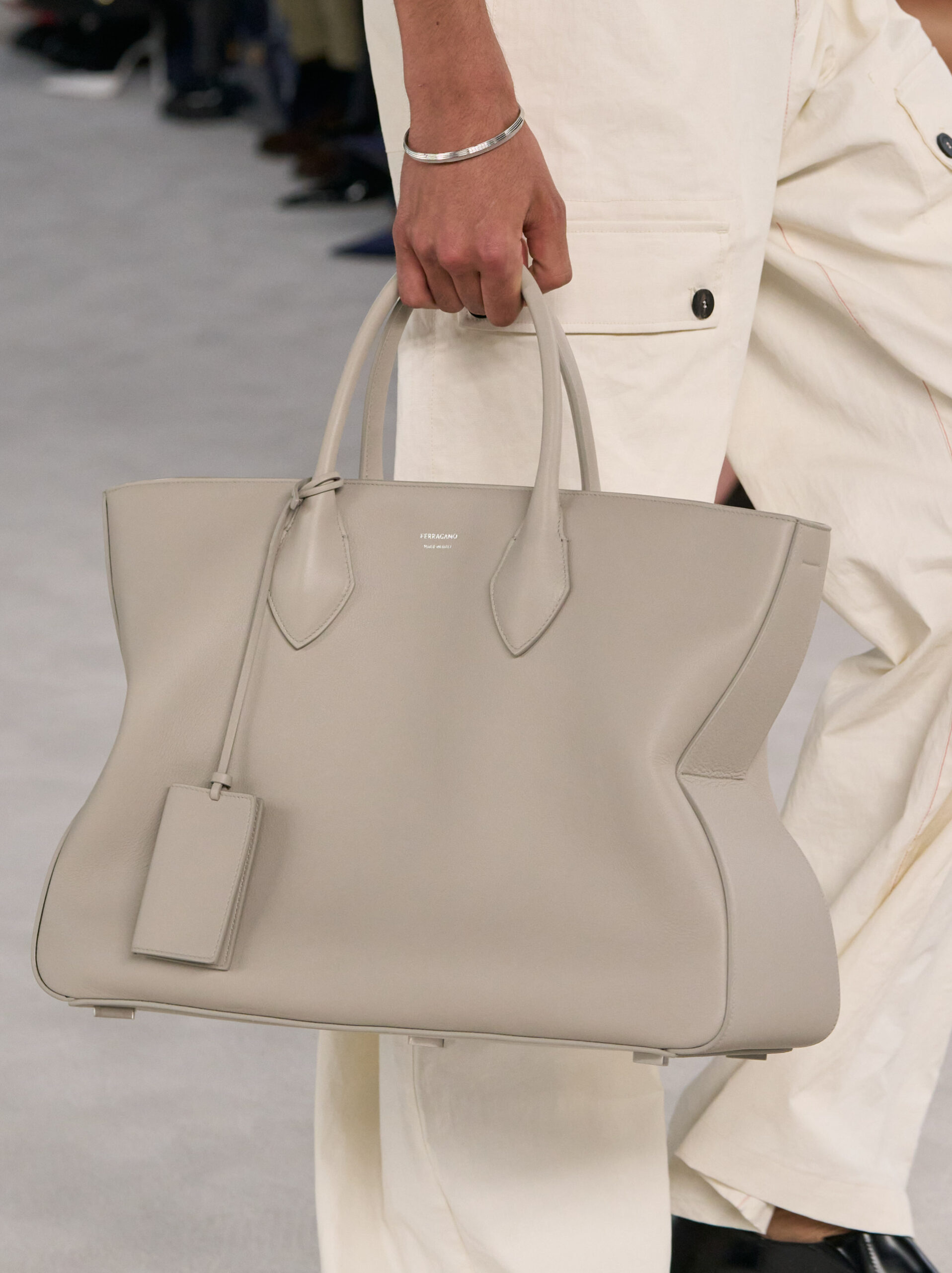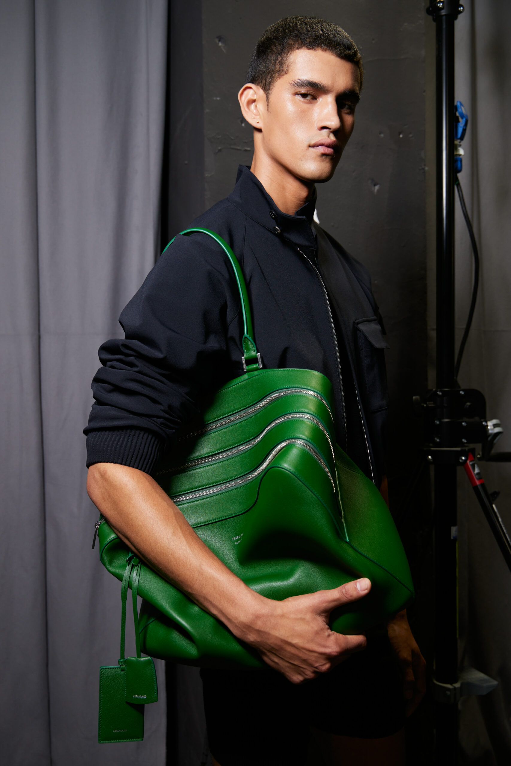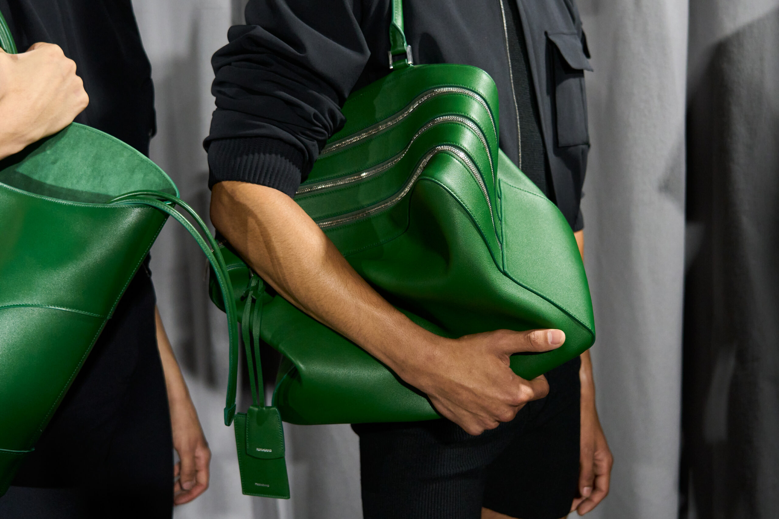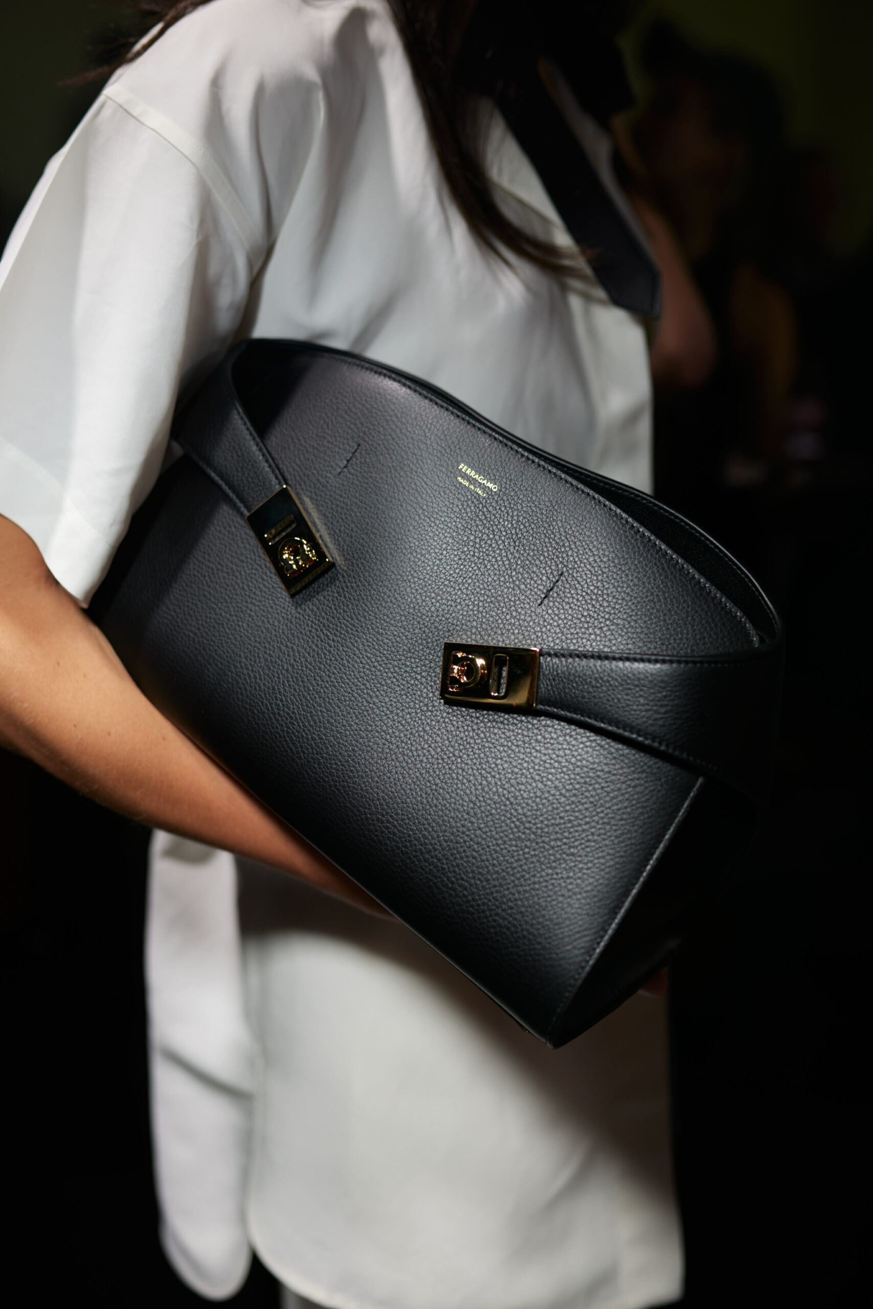 Les sacs à main poursuivent les lignes graphiques et les formes géométriques des collections précédentes : le classique contemporain « Hug » apparaît en version brillante et en cuir, tandis que le sac « Fiamma » joue sur les asymétries. Pour les hommes, le sac « Star » se distingue par sa construction minutieuse et son design épuré.