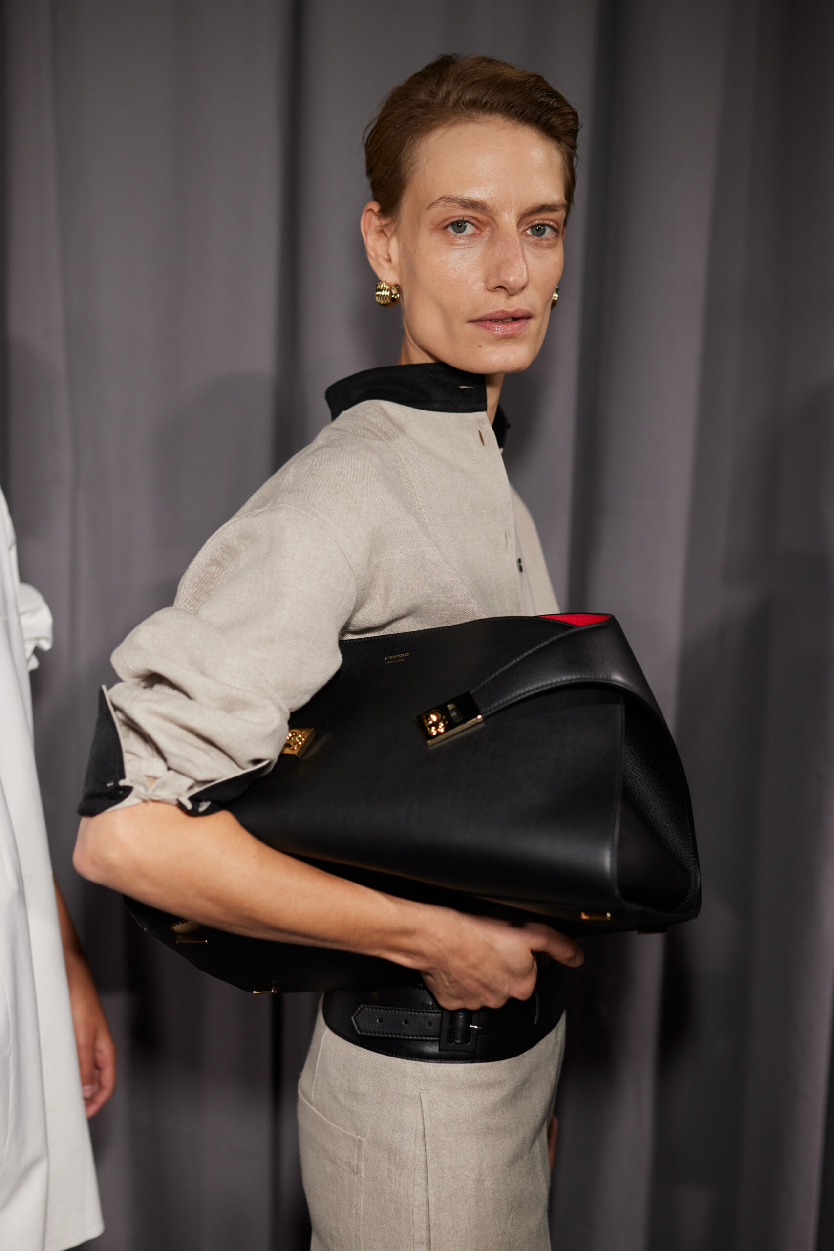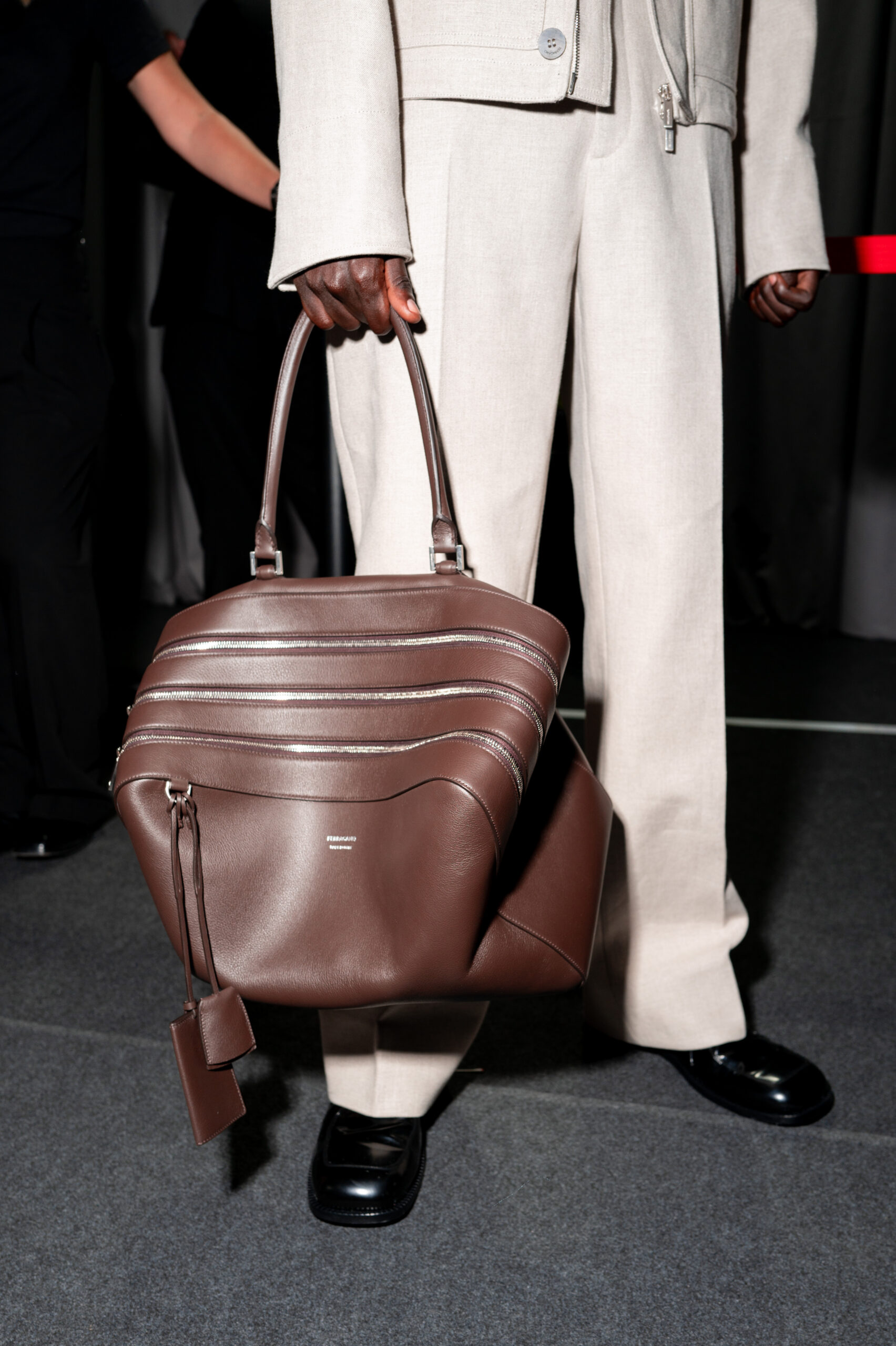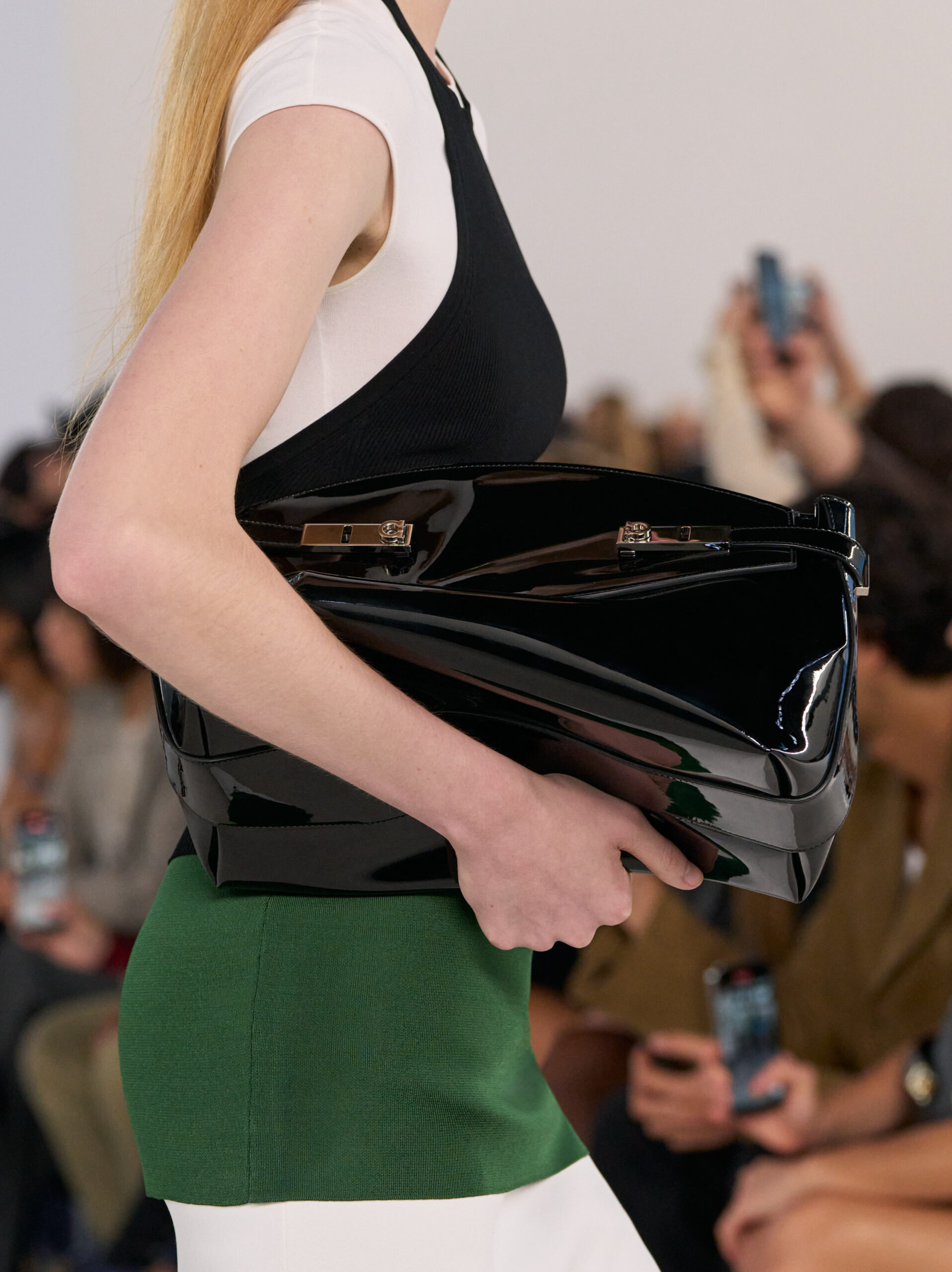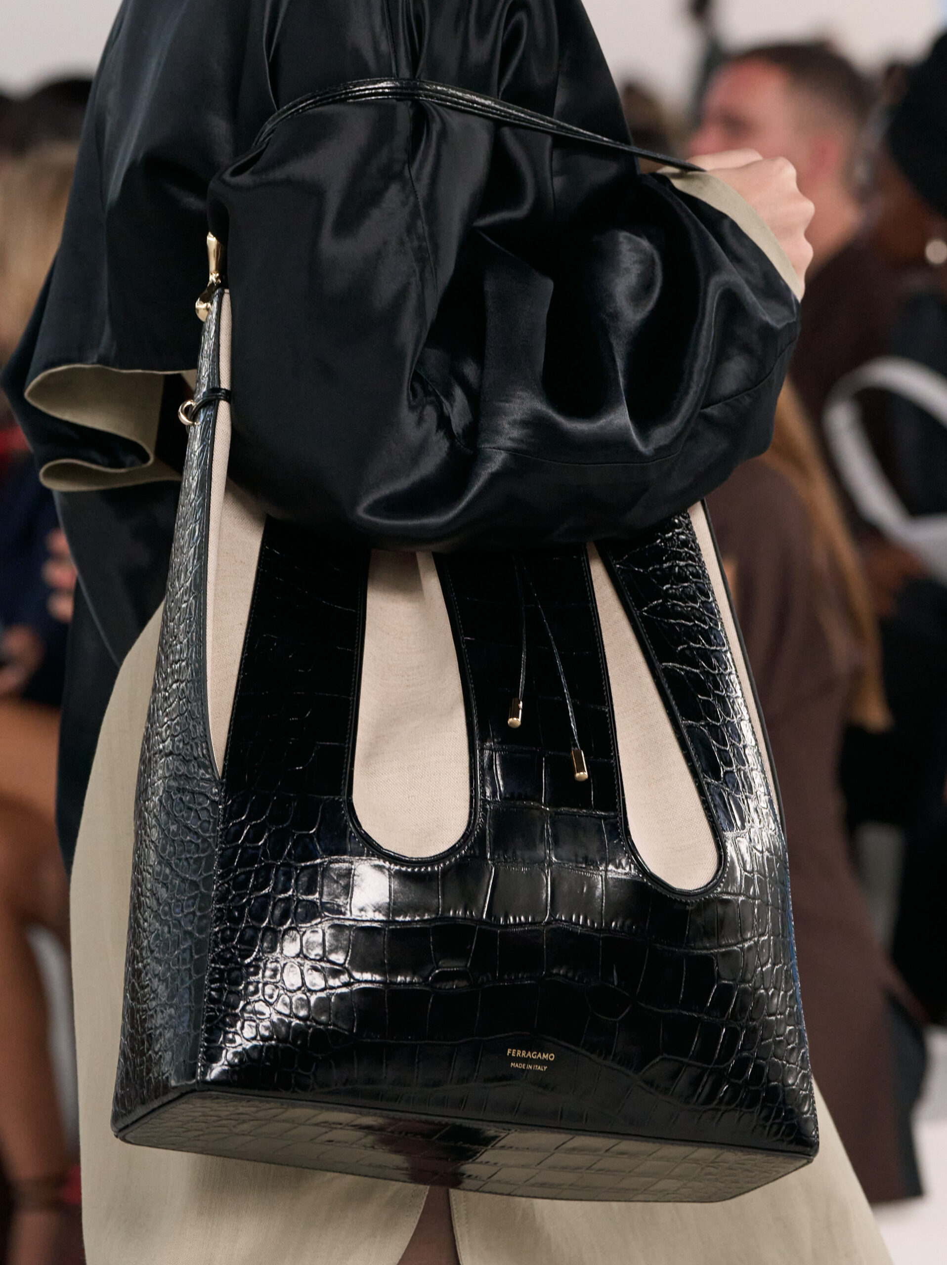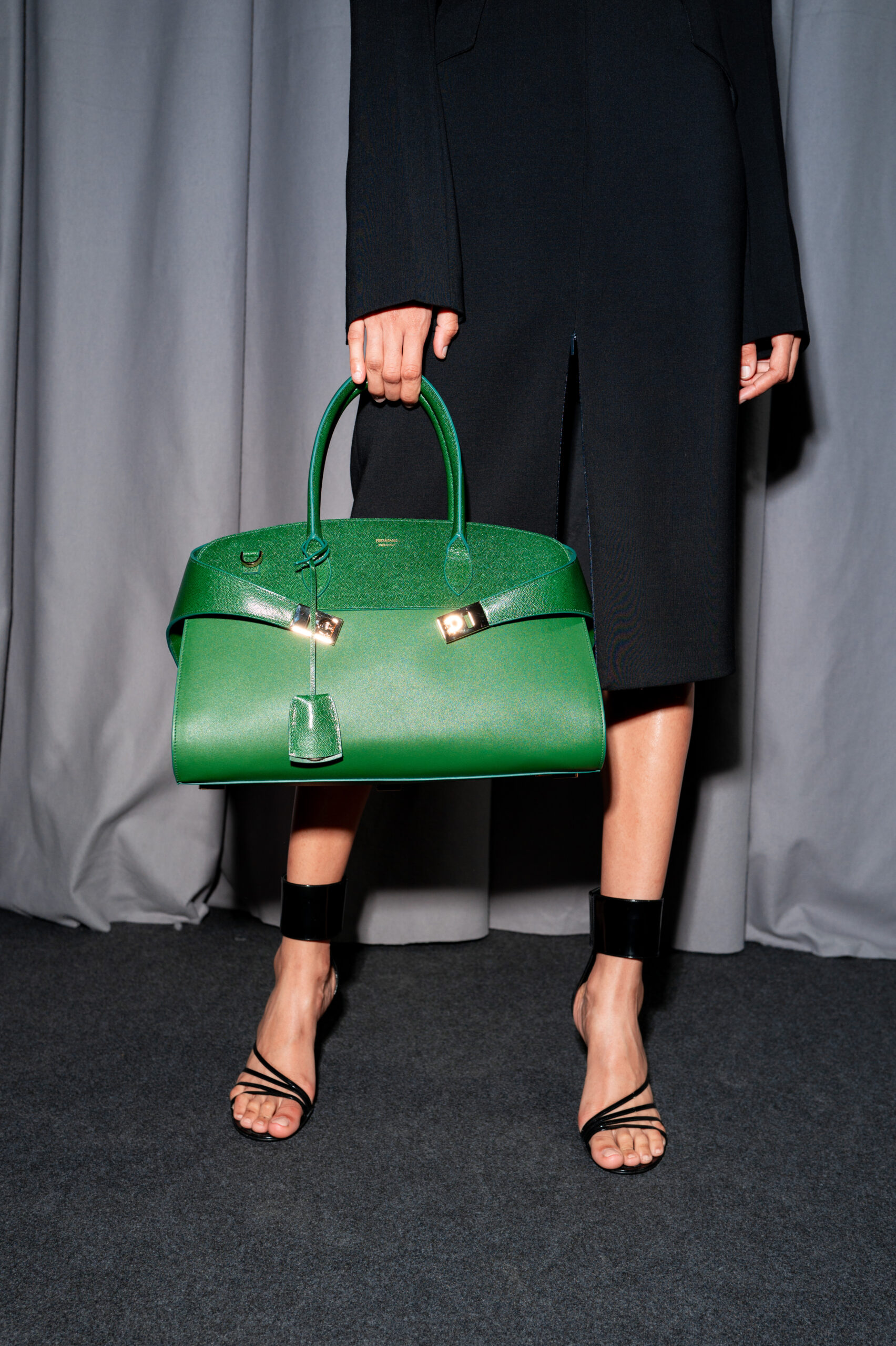 Les sacs à main poursuivent les lignes graphiques et les formes géométriques des collections précédentes : le classique contemporain « Hug » apparaît en version brillante et en cuir, tandis que le sac « Fiamma » joue sur les asymétries. Pour les hommes, le sac « Star » se distingue par sa construction minutieuse et son design épuré.