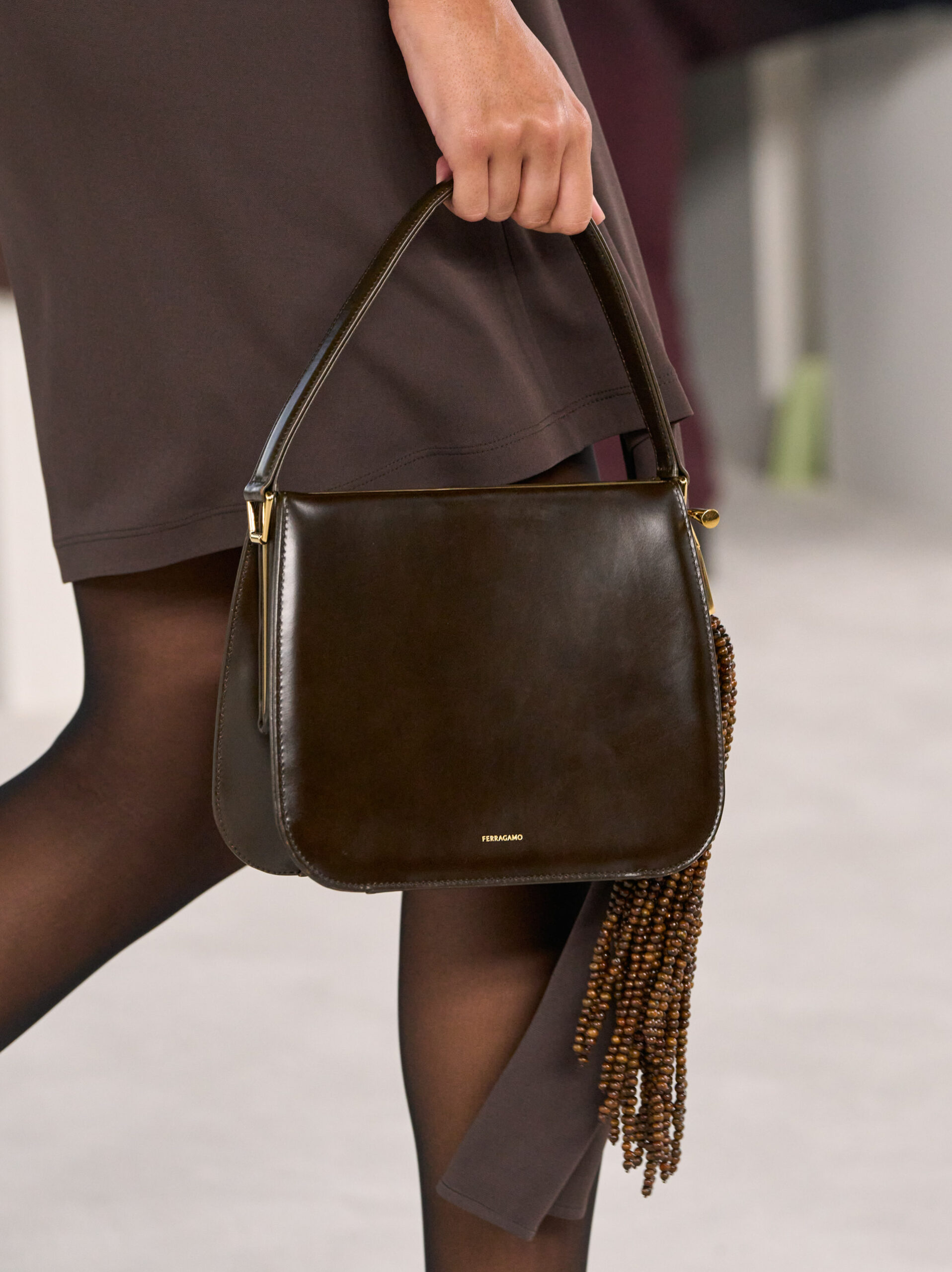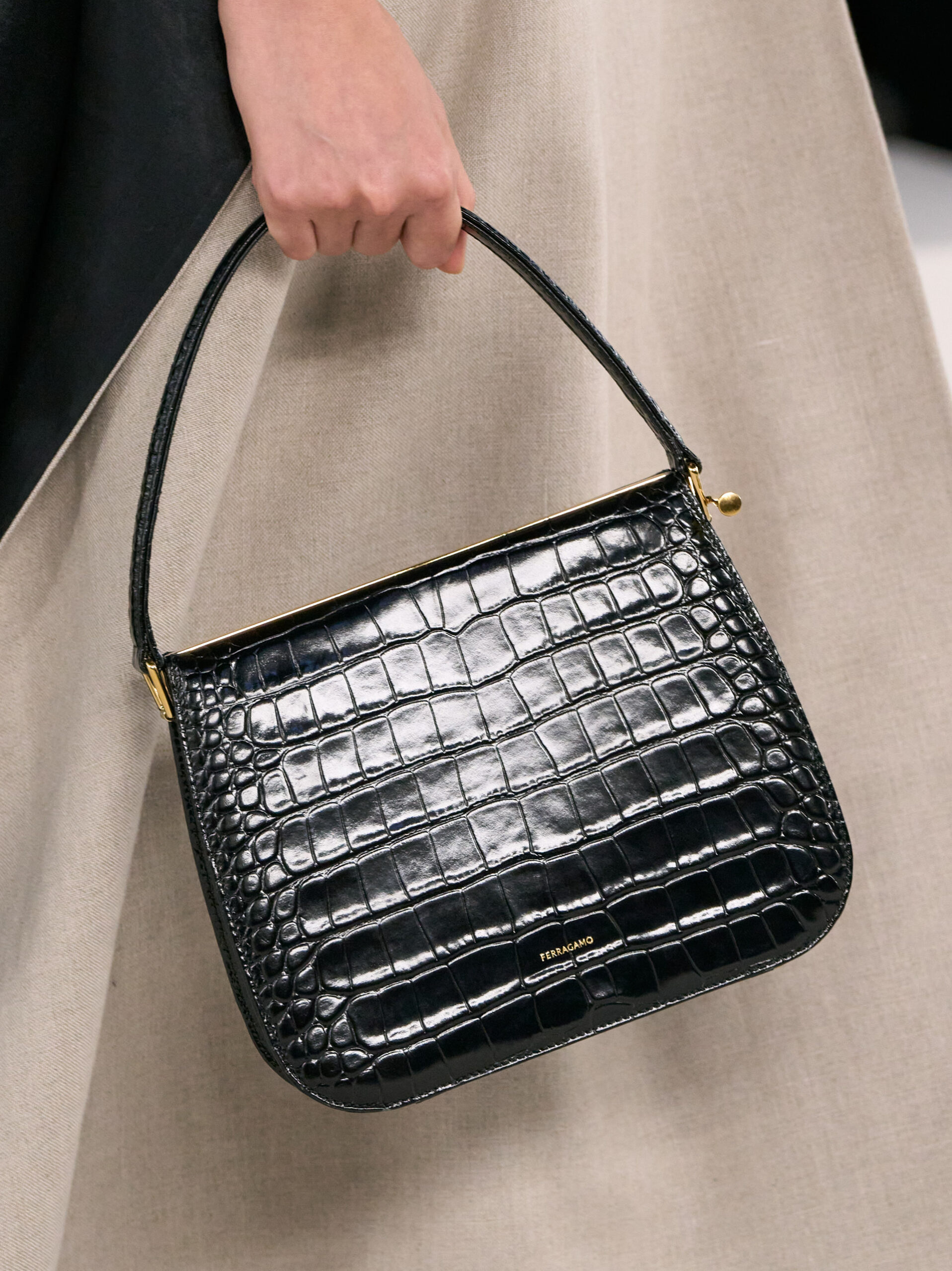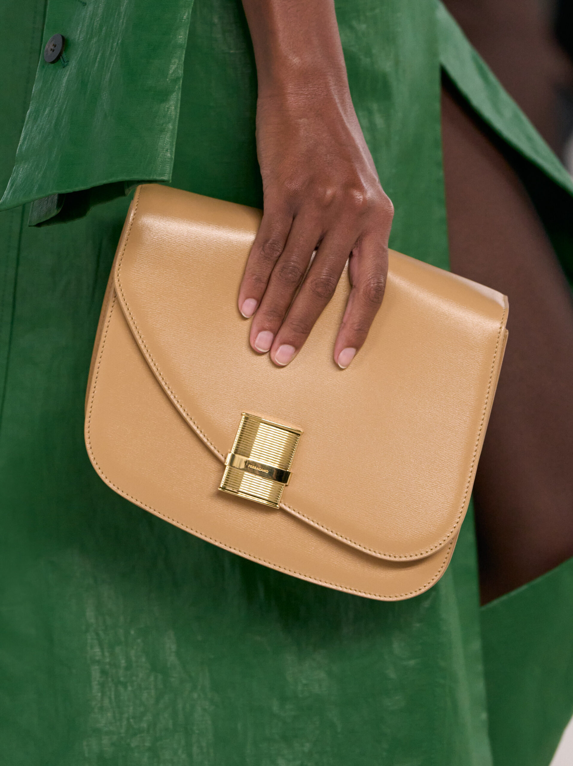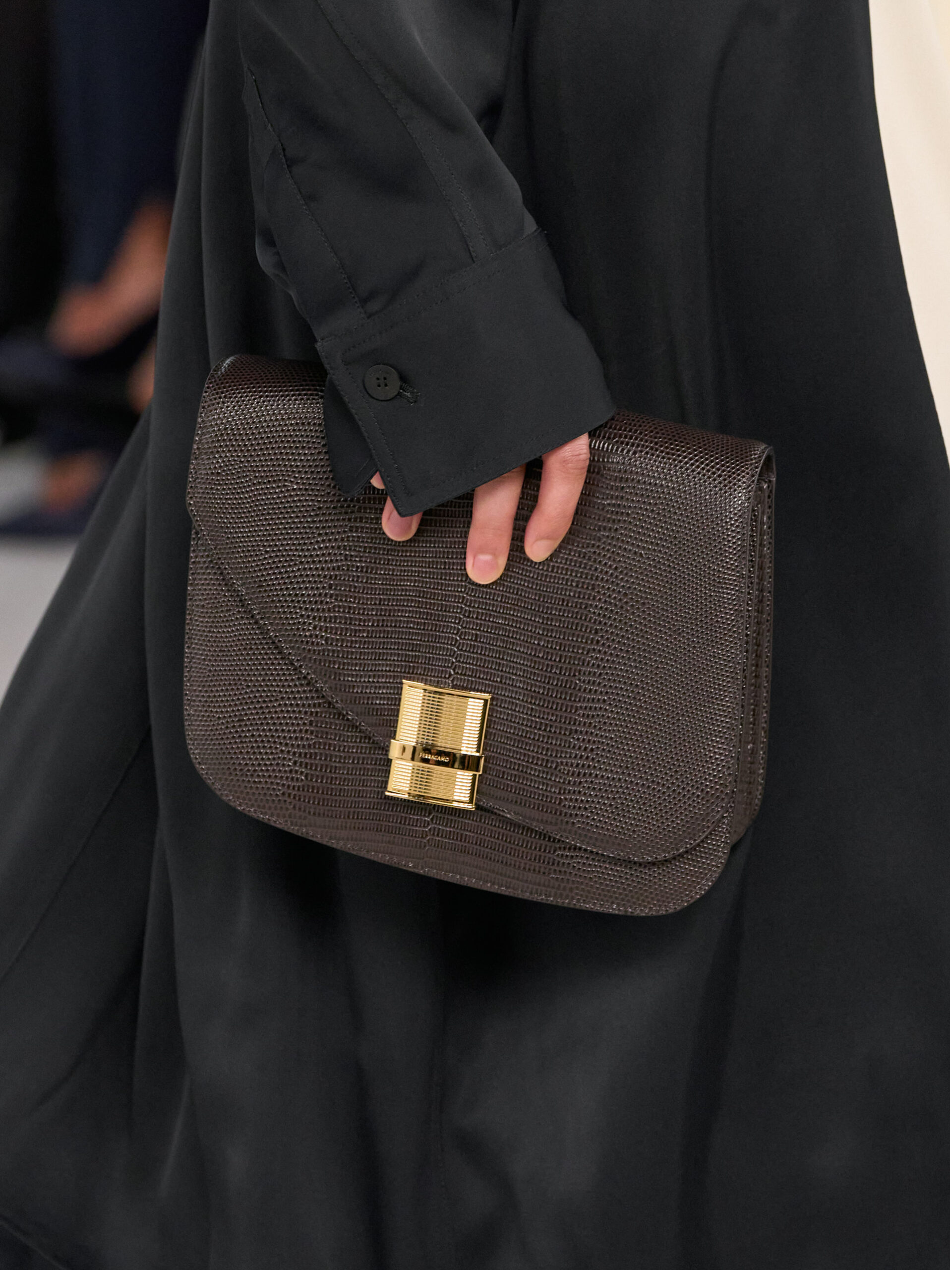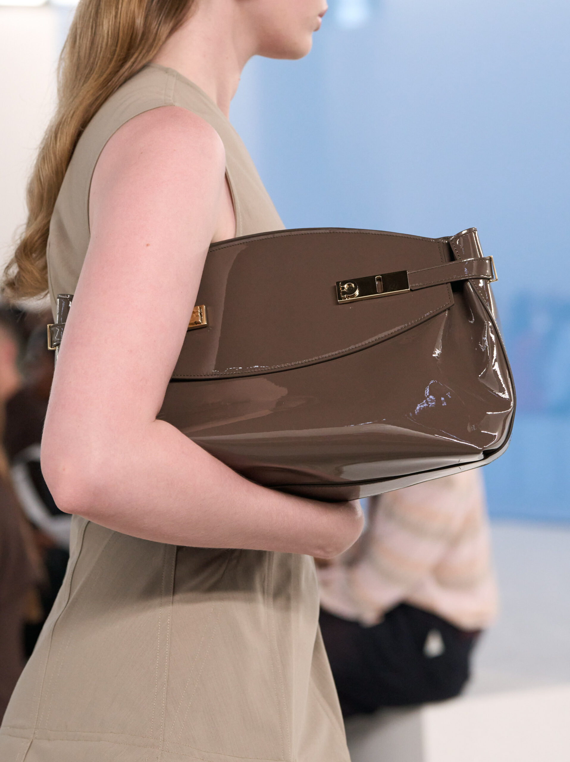 Les sacs à main poursuivent les lignes graphiques et les formes géométriques des collections précédentes : le classique contemporain « Hug » apparaît en version brillante et en cuir, tandis que le sac « Fiamma » joue sur les asymétries. Pour les hommes, le sac « Star » se distingue par sa construction minutieuse et son design épuré.