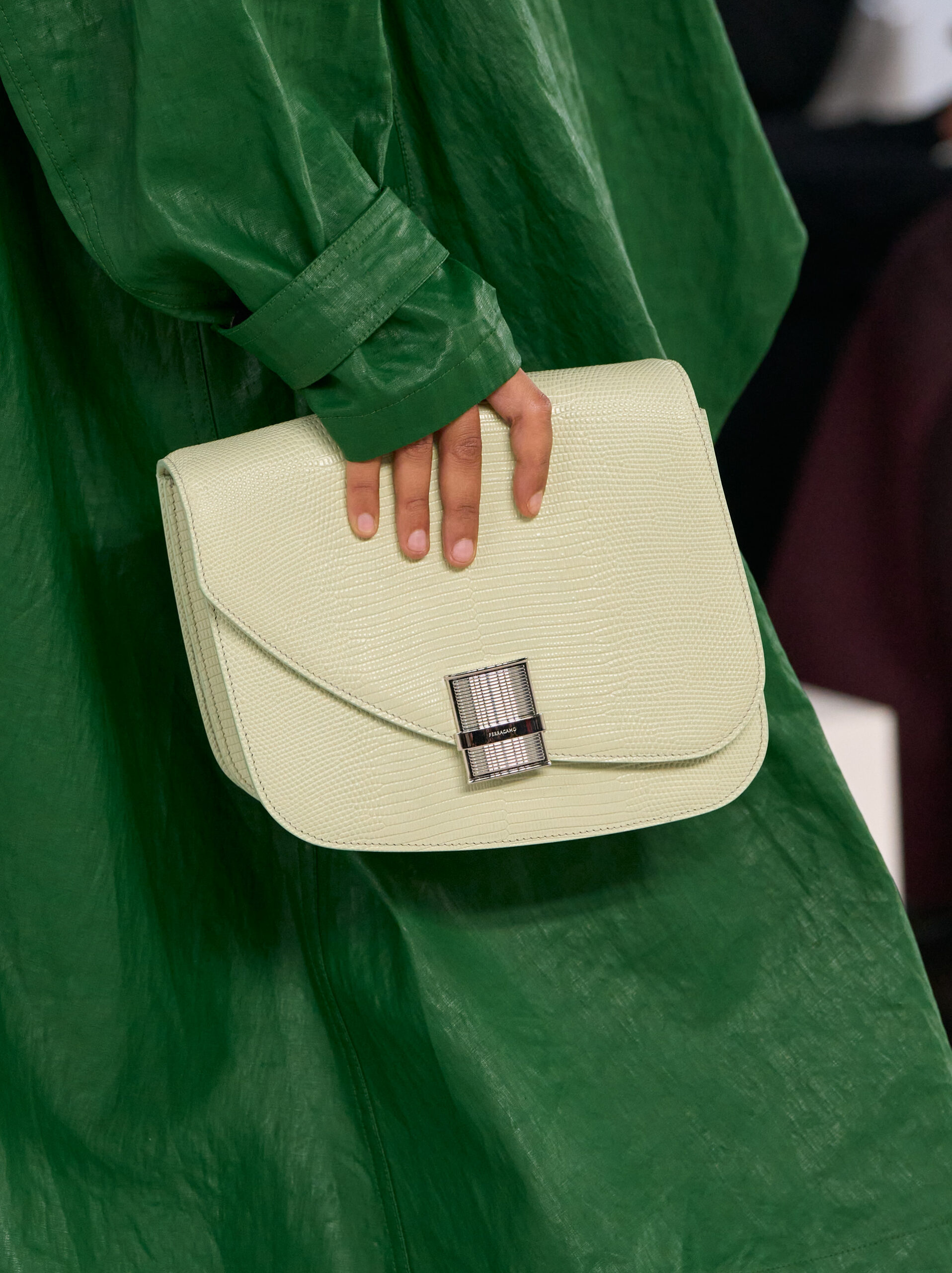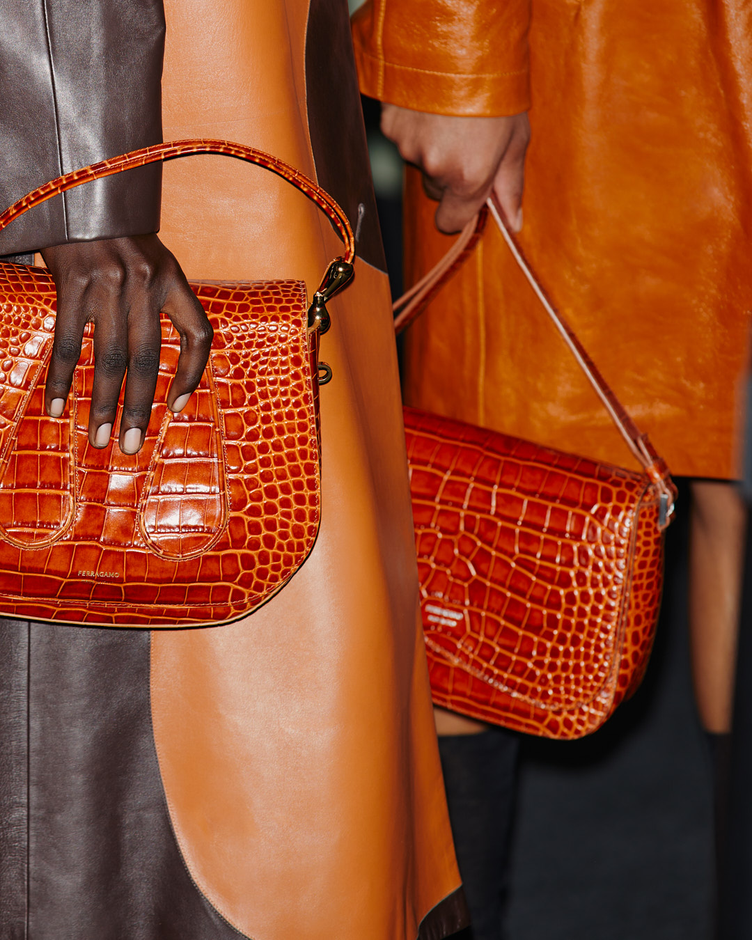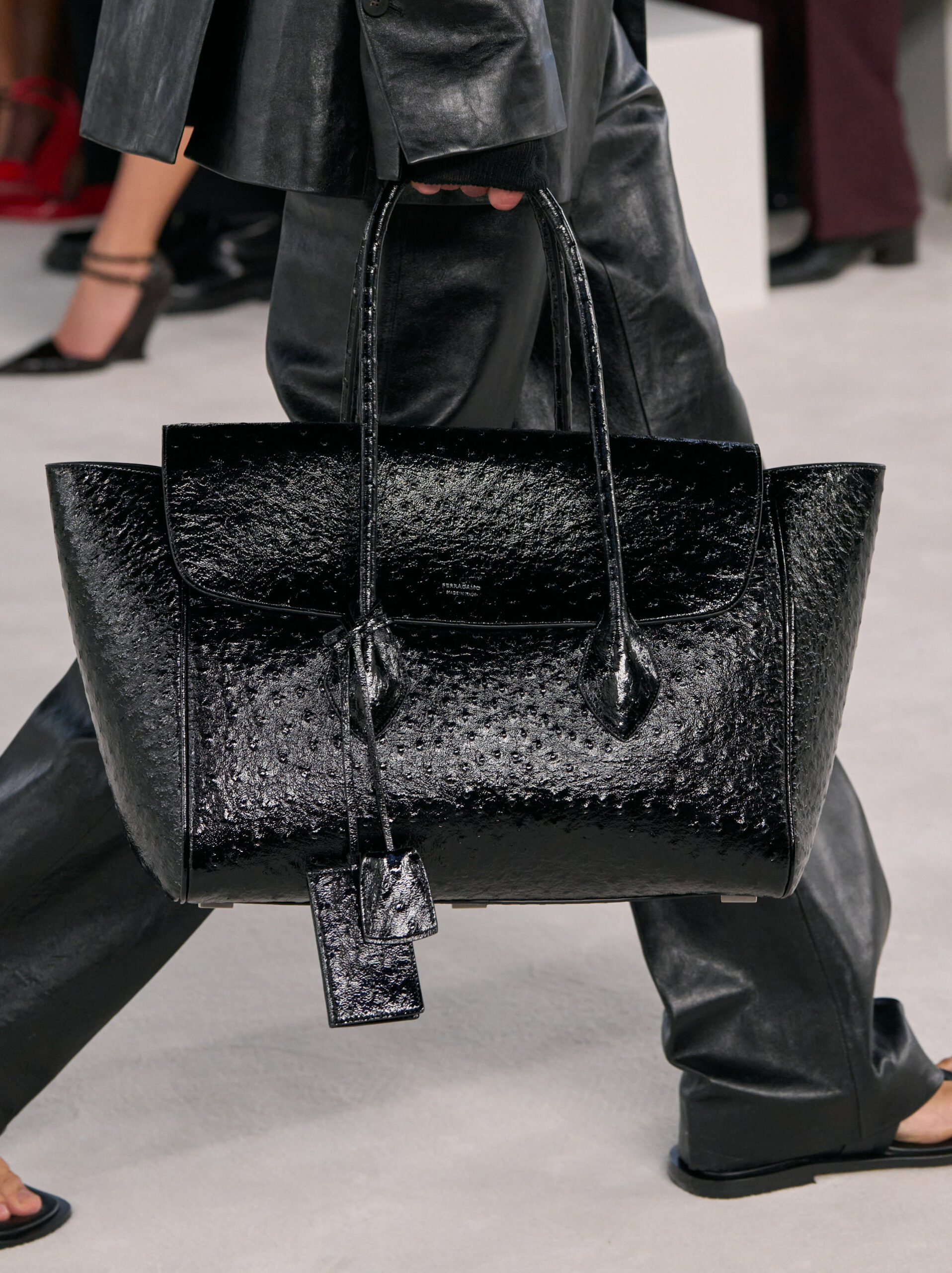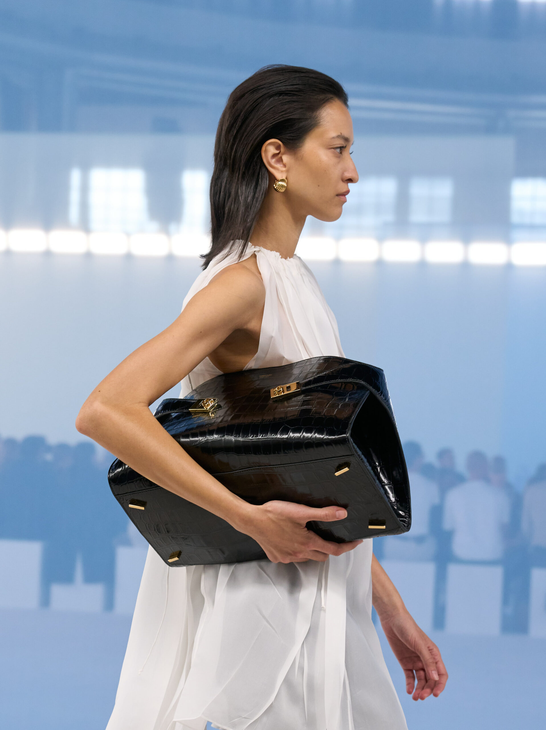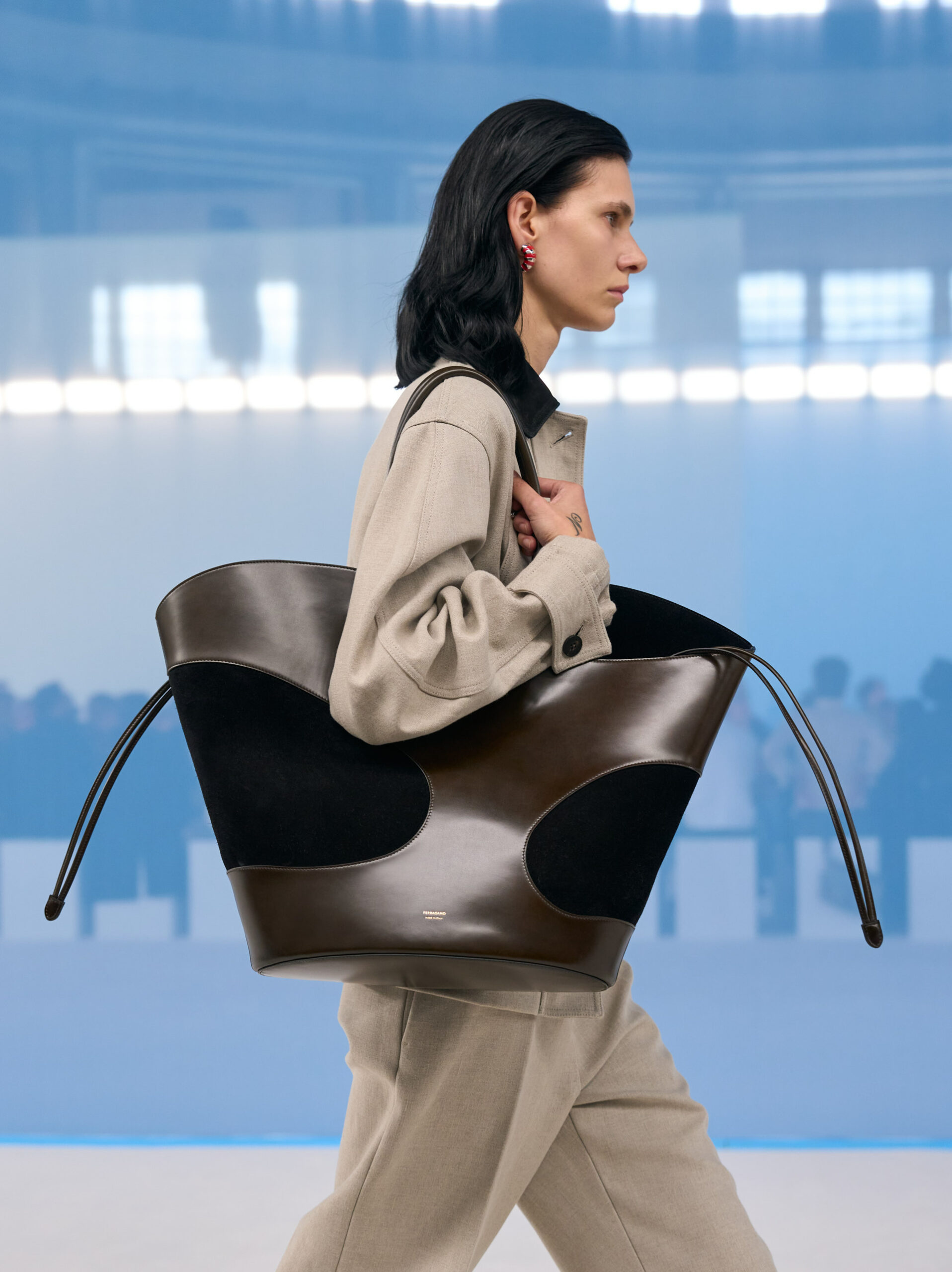 Les sacs à main poursuivent les lignes graphiques et les formes géométriques des collections précédentes : le classique contemporain « Hug » apparaît en version brillante et en cuir, tandis que le sac « Fiamma » joue sur les asymétries. Pour les hommes, le sac « Star » se distingue par sa construction minutieuse et son design épuré.