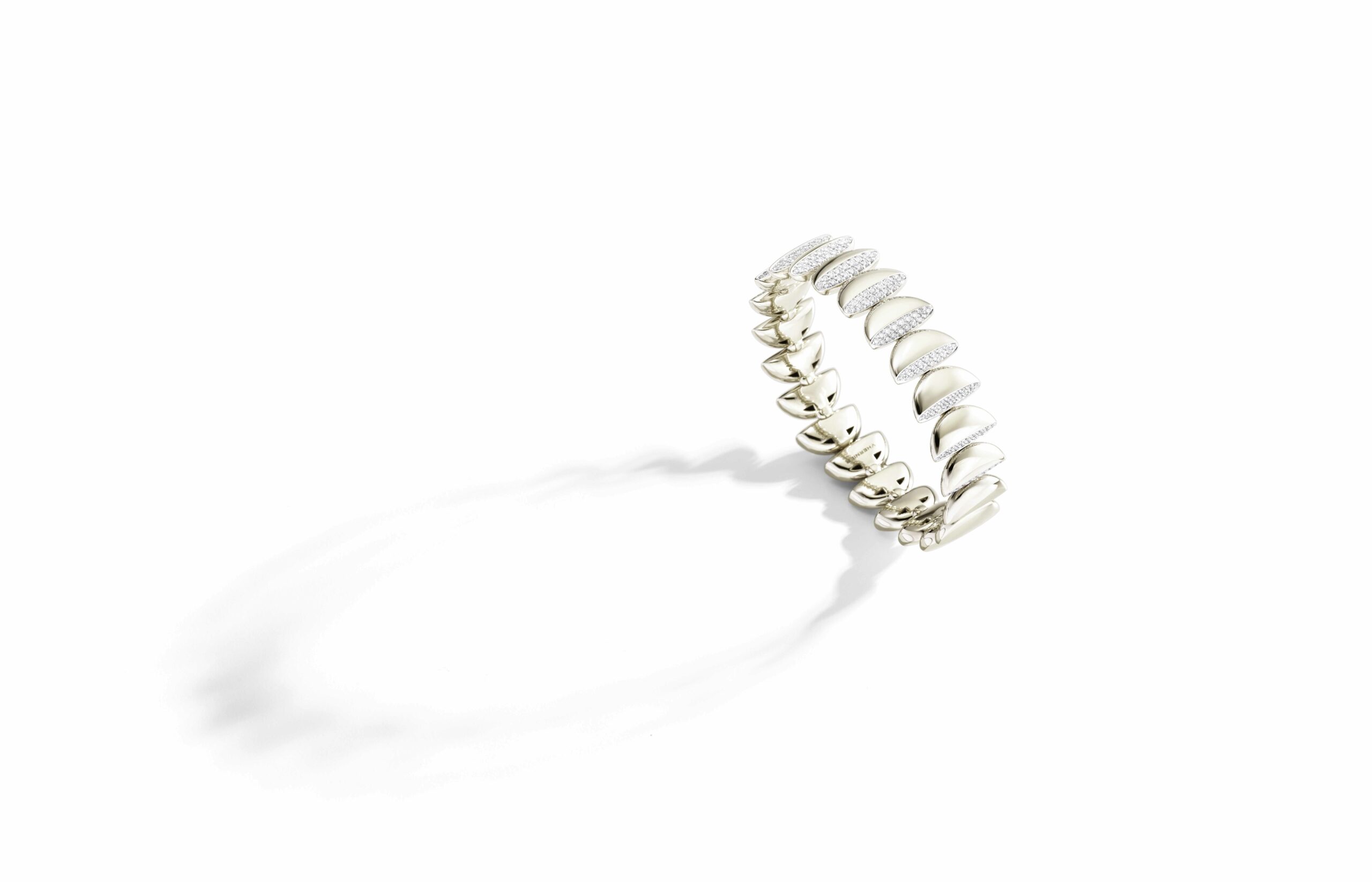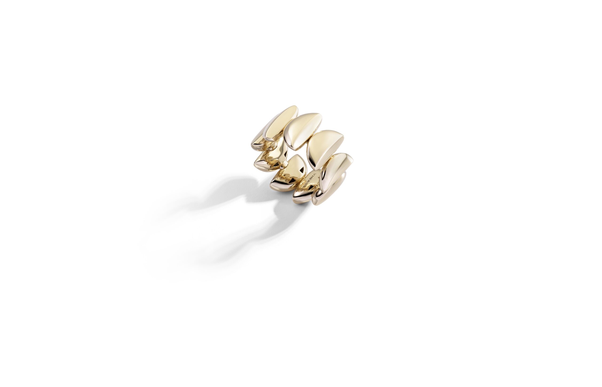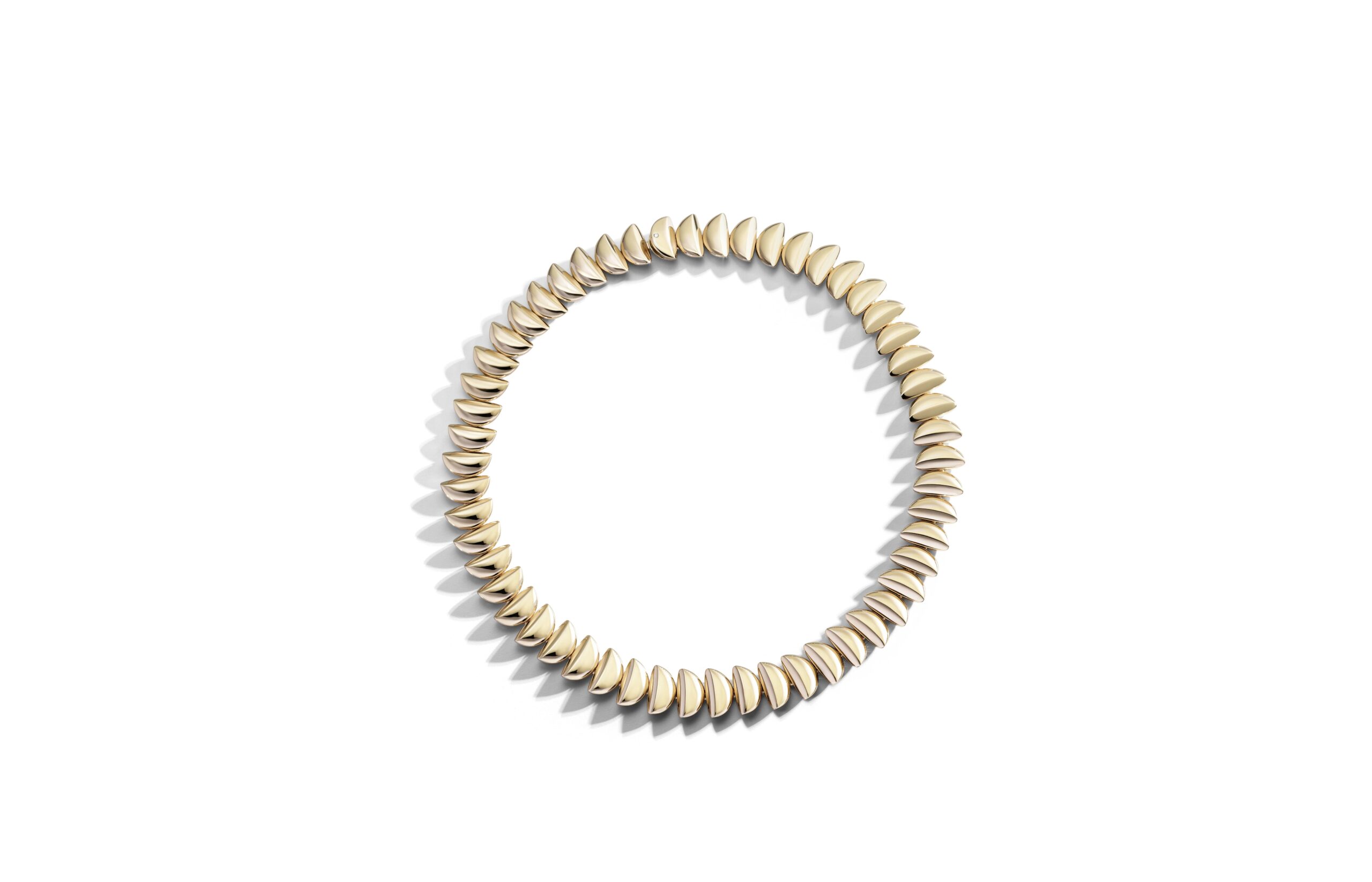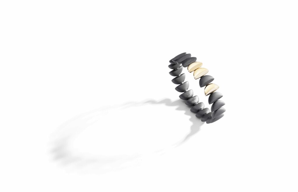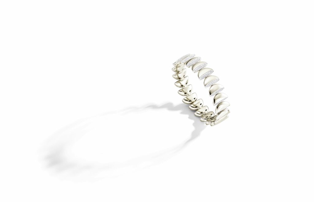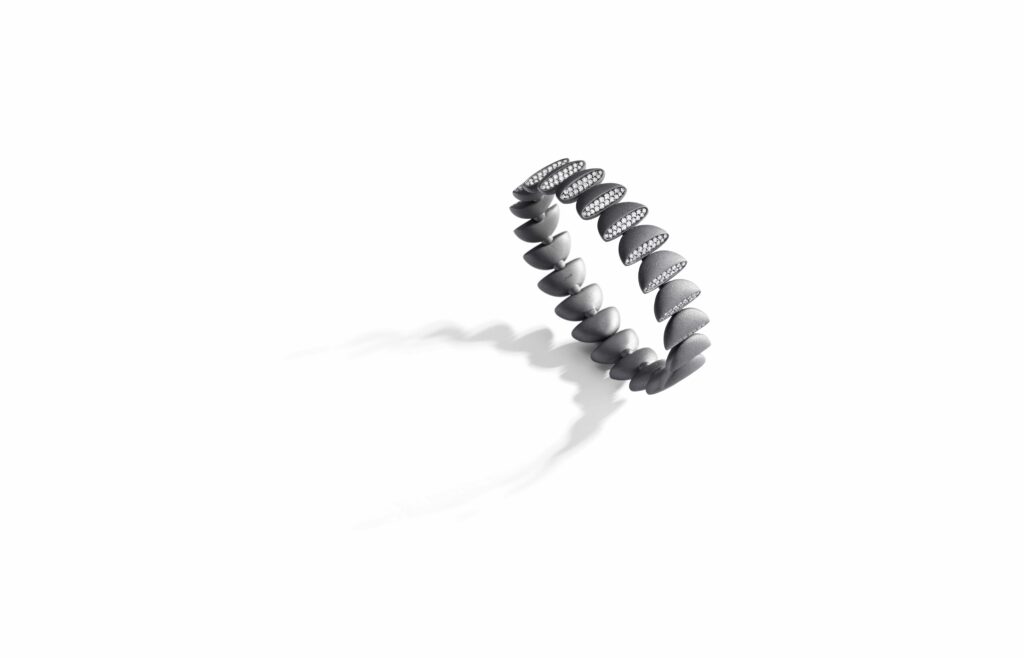L’or rose 18 carats, symbole de douceur et de féminité, se façonne en bagues, bracelets, colliers et boucles d’oreilles. À cela s’ajoute le titane, élément de modernité et de robustesse, et l’or blanc, écrin lumineux pour les diamants éclatants qui viennent parfaire l’ensemble. Vhernier présente ici un dialogue entre la chaleur de l’or et la fraîcheur du métal, entre la douceur des formes et la précision des lignes.